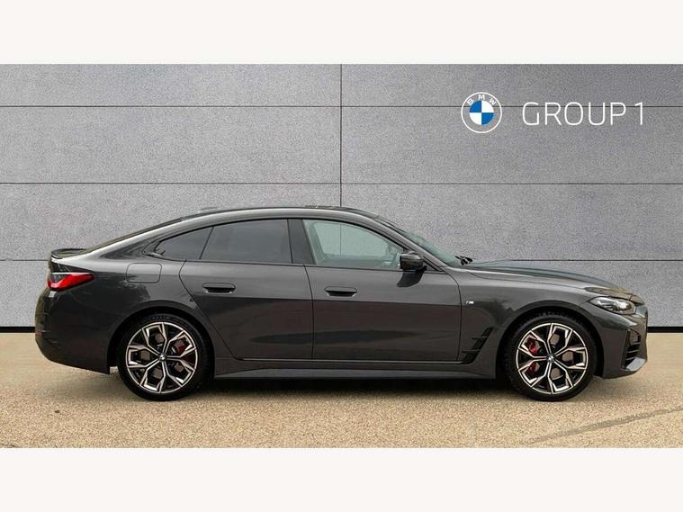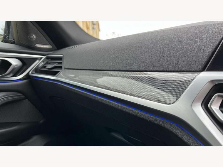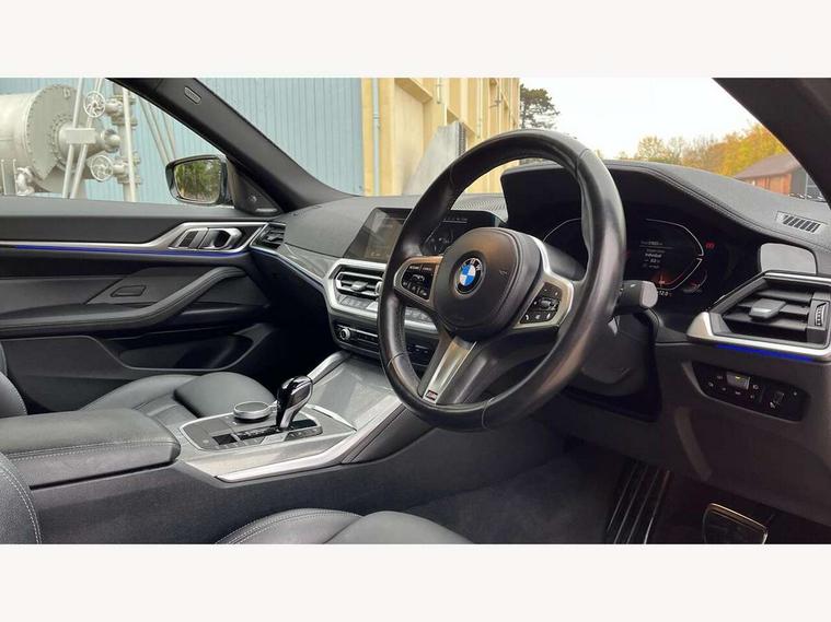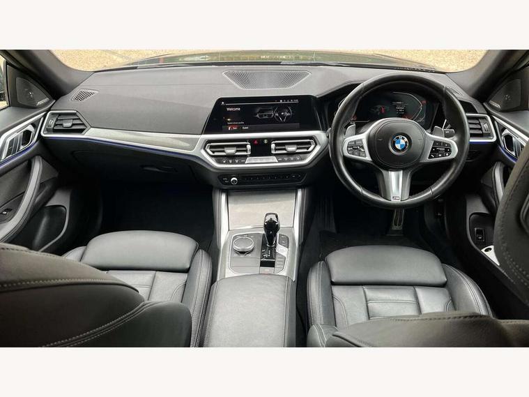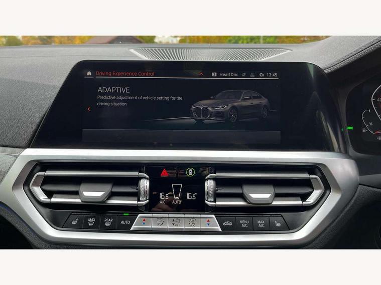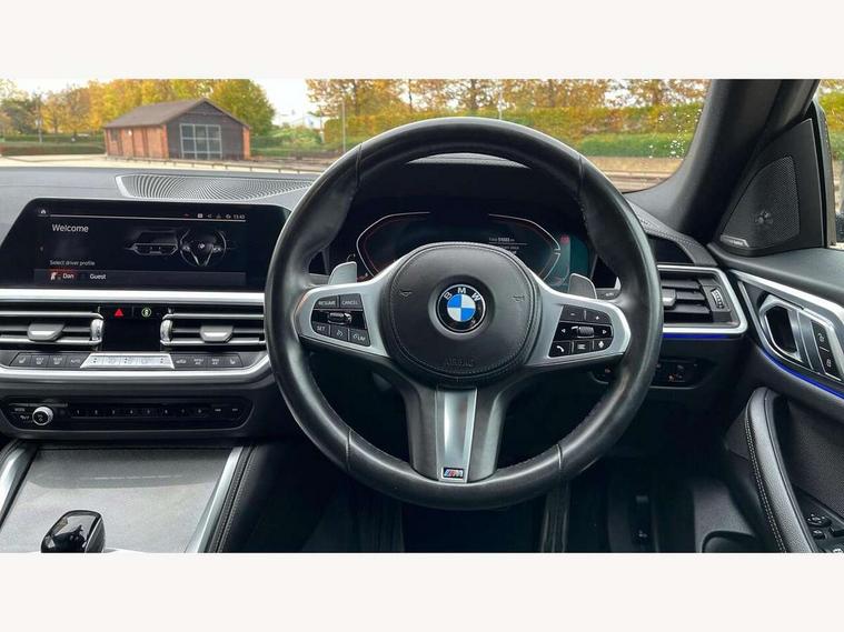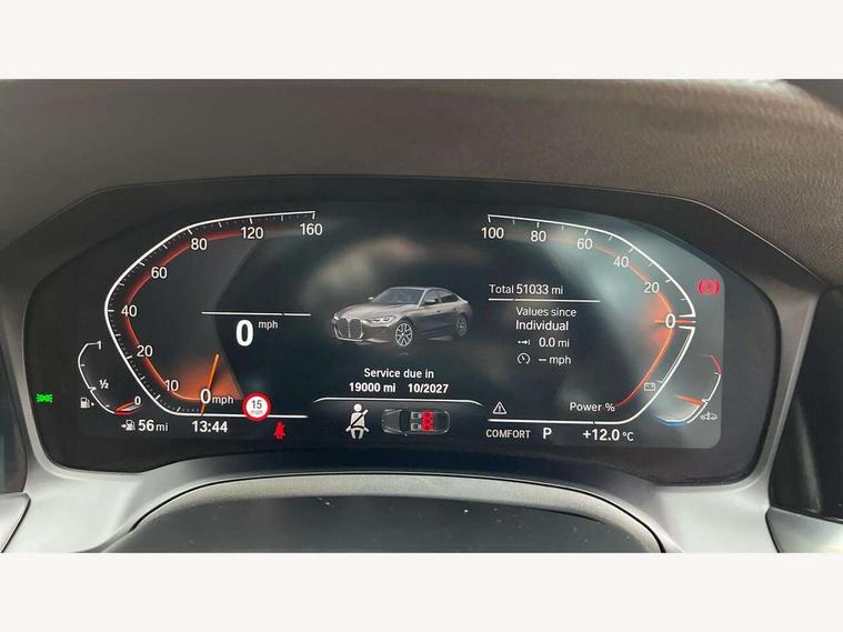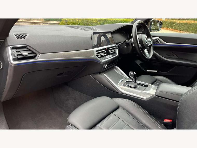 Active guard plus, Attentiveness assist, Auto start-stop, BMW ConnectedDrive online services, BMW iDrive controller on centre console, BMW Live Cockpit Professional Nav with 12.3" instrument display + 10.25" display, Intelligent Voice Assist, BMW OS 7, HDD, 2USB, 4G LTE connect, BMW service history, BMW Teleservices, Brake pad wear indicator in front and rear, Check Control warning system for monitoring of lights and door/luggage compartment open warning, Condition based service, Electric bootlid, Electric power steering with Servotronic steering optimised at all speed ranges, Gearshift time display in manual mode, Instrument cluster with speedometer with mph readout, tachometer, fuel gauge and oil temperature gauge, Integrated owners handbook, Oil sensor for level and grade, warning by check control system, On board computer - average speed, fuel consumption, outside temp display with acoustic warning, clock/date, service interval, odometer/trip meter, Optimum shift indicator, Shifting point display, Variable sport steering, 8 speed automatic steptronic transmission with gearshift paddles, Active sound design, Adaptive M suspension, Double joint spring strut front axle, Double VANOS, Drive performance control - ECO PRO, comfort and sport modes, High precision injection, Low centre of gravity, Petrol Particulate Filter, Sprint mode, Stroke dependent dampers, VALVETRONIC engine management, 2x USB Type C ports in front centre console for charging and data transfer, DAB tuner, Electronic service booklet, 3rd brake light, Acoustic glazing, Automatic headlight beam throw control with load dependent regulating reaction, dynamic compensation of braking dive and acceleration squat, Automatic windscreen wipers and automatic headlight, Automatically dimming electrochromatic rear view mirror, BMW emblem on engine compartment lid and tailgate, BMW Individual high gloss shadow line with extended contents, BMW individual lights shadow line, BMW Individual metallic paint work, Body colour fuel filler flap, Body colour roof fin, Brushed aluminium inserts in the front door sill finishers with BMW designation, Door sill strips, Dynamic brake lights, Electric windows - front and rear, with open/close fingertip control, anti trap facility and comfort closing function all round, Exterior mirrors - electrically folding with anti-dazzle, Fading support, Follow me home headlights, Front and rear bumper system, Front apron plastic in body colour, Green tinted heat protection glazing, High gloss shadow line exterior trim, Illuminated bow type door handles in body colour drivers side with door lock, Interior rear view electrochromatic mirror with automatic anti dazzle function, LED daytime running lights, LED front fog lights, LED front indicators, Licence plate panel integrated into front bumper and tailgate, Lightweight engineering, M designation on front side panels, left and right, M rear boot spoiler with high gloss black gurney, Model designation on right side of tailgate, One piece front bumper cover including towing eye cover in body colour, Preparation for high beam assistant, Rear side wing doors, Rear wiper, Reversing light, Side frame decorative moulding black matt, Sun protection glass, Two part LED tailights in L-shape with components in smoked glass, brake light, LED turn indicator and rear fog light, Visible exhaust tailpipe finisher, Visible VIN plate, Welcome lights in interior and door handle area, Widened track and increased camber values for max transverse dynamics, agility and steering precision, Window recess cover black high gloss, Windscreen wipers with integrated heated washing jets, 12V power socket in front centre console, 2 front cupholder in centre console with clamping elements and matt black inlay, 3 rear headrests, 3 seat bench in 2nd row, 3 spoke M sport leather multifunction steering wheel, 3 zone automatic air conditioning, 4 pieces lashing eyelets in luggage compartment, 40:20:40 split folding rear seat and rear centre armrest with two cupholders, Anthracite headlining, Armrest integrated in front and rear door trim + front centre console armrest, BMW ID, Driver seat backrest width adjustment, Four grab handles integrated in roof lining, Front and rear door pockets, Front and rear reading lights, Front sport seats, Heated driver and front passenger seats, Height adjustable front headrests, Height adjustable mechanically and infinitely variable steering column, Illuminated armrest storage compartment, Illuminated glove compartment with separate small compartment, Make-up mirror lights, Single front passenger seat, Storage compartment in rear centre console, Sunvisors with illuminated vanity mirrors and ticket pocket, Toolkit located in luggage compartment, Velour front floor mats, Ambient lighting pack - 4 Series, Connected professional pack - 4 Series, M sport exterior styling pack - 4 Series, 3 point seatbelts on all seats, Battery safety cut-off, BMW emergency call, Brake energy regeneration, Braking pre-tensioning, Child proof locking system in rear door, Child seat ISOFIX attachment for the two outer rear seats, Coasting in idle in ECO PRO mode, Cornering brake control (CBC), Crash sensor activating of airbags, Unlocking doors, hazard warning lights, interior light, safety battery terminal, Driver and front passenger side airbags, integrated in the door side seat backrest bolsters for all seat variants, Driver/Front Passenger airbags, Dry braking, Dynamic brake control, Dynamic stability control + (DSC+) - Anti-lock Braking System (ABS) with brake assist and cornering brake control + Automatic Stability Control (ASC), Dynamic Traction Control - DTC, Electric parking brake including automatic hold function and automatic release of the parking brake when driving off, Electronic differential lock control (EDLC), Front and rear ventilated brake disc, Front passenger manual airbag deactivation, Head airbags for all 4 outer seats, Hill start assistant, M Sport seatbelts, Seat bel