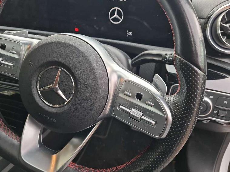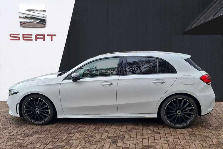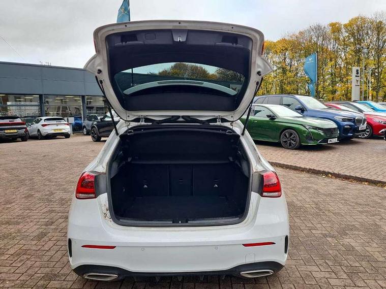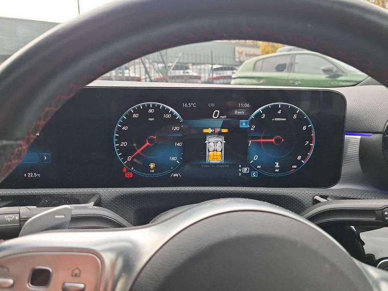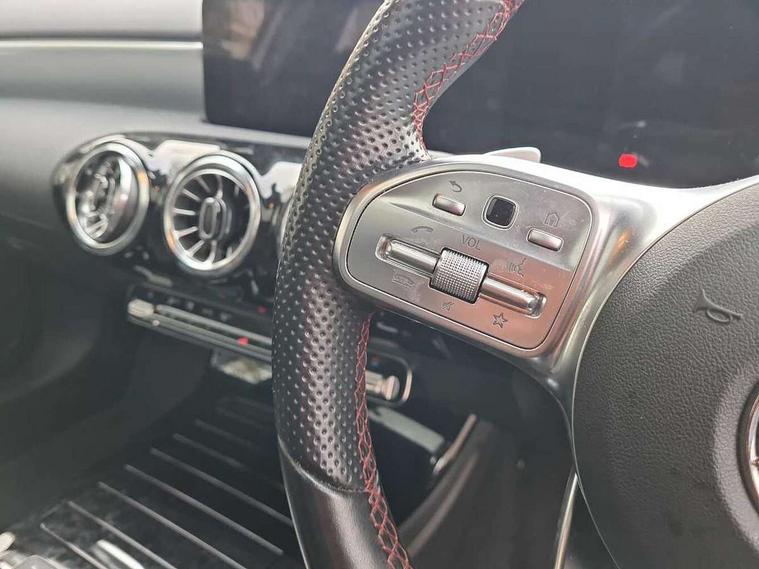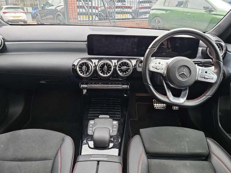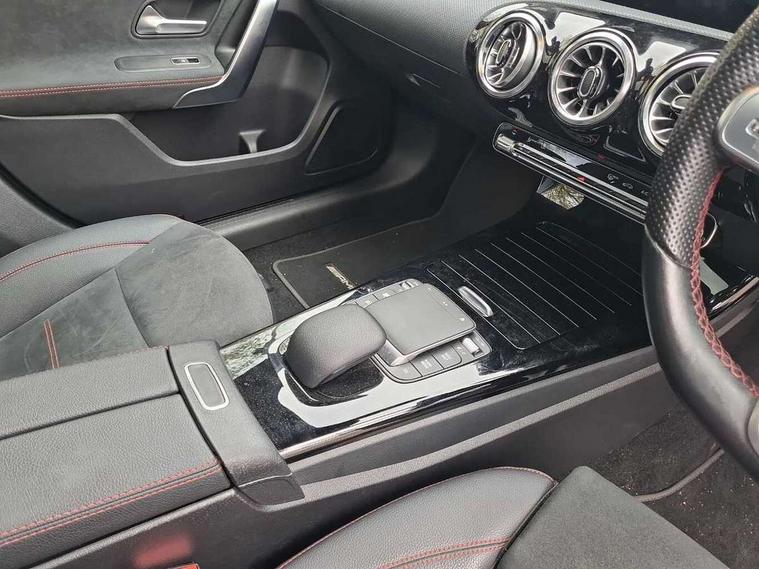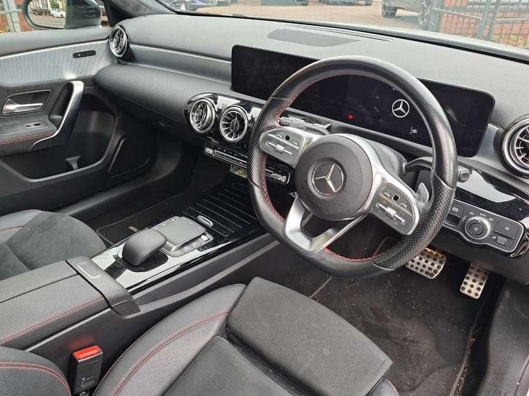 10.25" Digital instrument cluster display screen, 10.25" media display, 180 degree rear view camera with parking guidelines, Active parking assist with visual and audible warning of detected obstacles, Attention assist, Brake pad wear indicator warning light, Car wash mode, Cruise control + speed limiter, Direct steering, Dual bluetooth interfaces, DYNAMIC SELECT with a choice of driving modes (ECO, Comfort, Sport and Individual), ECO start/stop function, Fluid level warning indicator for fuel, oil, coolant and washer fluid, Hard-disk navigation, Hey Mercedes Voice activation, Lamp failure indicator, Lane keeping system, Mercedes me connect including emergency call system, accident recovery, breakdown and maintenance management, Mercedes me remote services, Outside temperature gauge, Owners manual in English, Pre-installation for private car sharing, Preinstallation for Mercedes Benz link, Service indicator (ASSYST), Smartphone integration with Apple CarPlay and Android auto, Speed limit assist, Speed sensitive power steering, Traffic sign assist, Trip computer, Ultrasonic sensors positioned in the front and rear bumpers, Lowered comfort suspension, Rear axle torsion beam, 2 USB ports (type C) in rear stowage compartment and one in front of center console, 6 speakers, DAB Digital radio, MBUX multimedia system with DAB digital radio and touchpad including satellite navigation, Mercedes-Benz sound system - 100W, 4 Electric Front and Rear windows, Adaptive brake lights, AMG bodystyling - Front apron with splitter in chrome, rear apron with chrome trim and chrome visible trim elements in tailpipe, Automatic headlights, Black weather strip, Body colour bumpers, Body colour door handles with chrome inserts, Body colour side skirt, Electric adjustable and heated door mirrors with integrated LED side indicators, Exclusive diamond radiator grille, Exhaust system - Twin visible tailpipes in polished stainless steel, Headlamp assist automatic headlamp activation, Heated glass rear windscreen + timer control, LED daytime running lights, LED High level third brake light, LED tail lamp, Multibeam LED headlights with adaptive highbeam assist plus, Panoramic sliding sunroof, Privacy glass, Radio aerial, Rain sensing windscreen wipers with two sensitivity settings, Rear fog lights, Rear side wing doors, Rear wiper, 3 seat bench in 2nd row, 3 Spoke flat bottom leather multi function steering wheel with perforated leather in grip area, 40:20:40 split folding rear seats, Artico man-made leather/Microfibre Dinamica upholstery with red contrast stitching, Auto Mercedes-Benz child seat recognition sensor, Black air vents with surround in silver chrome, Black roof lining, Brushed stainless steel sports pedals with rubber studs, Controller on centre console with chrome surround, Floor mats with AMG lettering, Front centre armrest with storage compartment, Front seat backs luggage nets, Galvanished gear shift paddles on steering wheel, Heated front seats, Height/reach adjustable steering column, Illuminated Mercedes Benz lettering front door sills with changeable cover, Interior lighting - 64 colour Ambient lighting, Interior mirror with reading lamps in black and frameless, Rear armrest with 2 cupholders, Rear head restraints, Seat occupancy sensor for front passenger seat, Single front passenger seat, Sports seats with integrated headrests, Stowage compartment in centre console with retractable cover, Sunvisors with illuminated vanity mirrors, Touchpad on center console, Twin front cupholders, Two zone thermotronic luxury automatic climate control, Light and sight pack - A Class, Mirror package - A Class, Night pack - A Class Saloon/Hatchback, Seat comfort pack - A Class, 3 rear 3 point seatbelts, ABS with Brake Assist, Active bonnet, Active brake assist includes forward collision warning system with autonomous braking, Adaptive brake assist with hold function and hill start assist, Black seatbelts, Childproof locks manually operated for rear doors and electrically operated for rear power windows, Crash responsive emergency lighting, Driver and passenger head and side airbags, Drivers knee airbag, Dual stage driver/passenger airbags, Electronic parking brake, ESP curve dynamic assist, ESP with ASR, Front and rear seatbelt reminder, Front brake callipers with Mercedes Benz lettering, ISOFIX and top tether child seat fixing points in two outer rear seats, Tyre pressure monitoring system, Warning triangle and first aid kit, Window airbags, Alarm system/interior protection/immobiliser, Keyless entry lock/unlock, Keyless Go, Remote central locking and crash sensor with emergency opening function, Urban guard vehicle protection system with immobiliser and interior protection, Matrix look light longitudinal grain aluminium trim element, 19" multi spoke light alloy wheels painted in black with a high sheen rim flange, Summer tyres, Tirefit sealant kit,