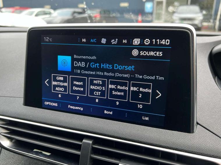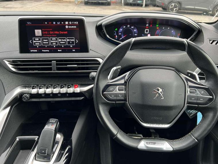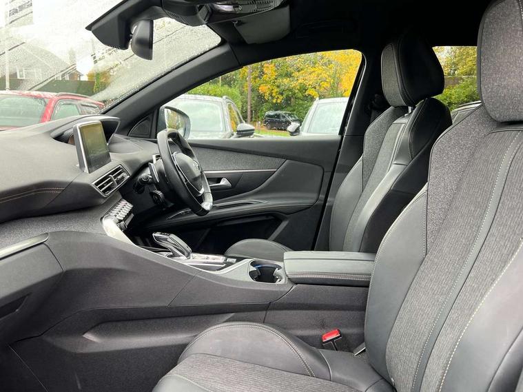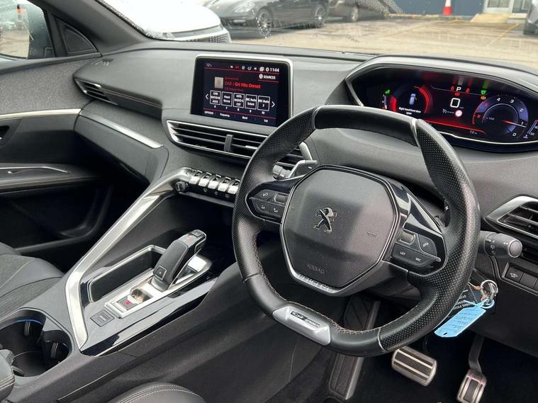 Brumeo fabric Dashboard, front and rear door panel finish, Satin chrome dash trim, Satin chrome instrument dial surrounds, Safety pack - 3008, Safety Plus Pack - 3008, Visibility pack - 3008, Anti theft alarm, Automatic door lock/re-lock after 30 seconds, Automatic hazard light activation upon heavy brake application, Central locking button on dash, Deadlocks, Electronic immobiliser, Locking wheel bolts, Remote control central locking with two plip keys, DAB Digital radio, Steering column mounted multifunction controls, USB socket, 3x Rear three-point retractable seatbelts with force limiters in the outer rear seats, Adaptive driver and front passenger airbags with passenger airbag deactivation function, Anti-lock braking system with electronic braking distribution and emergency braking assistance, Auto city emergency braking, Driver and front passenger side airbags, Driver SMART airbag, Electric child locking functionality on rear windows and doors, Electric parking brake, ESP with ASR, Front and rear curtain airbags, Front optimised safety headrests and 3 x rear retractable headrests with height adjustable, Front passenger SMART airbag with deactivate switch, Front three point retractable seatbelts with pre tensioners and force limiters, Front ventilated disc brakes and rear disc brakes, Height adjustable front seatbelts, Hill start assist, Tyre pressure sensor, 2 X Rear number plate lights, Aluminium longitudinal roof bars, Automatic triggered rear windscreen wiper in reverse gear, Black and chrome front wing trim, Black bumper protection plate, Body colour door handles, Body colour rear spoiler with stainless steel edging trim, Body coloured bumpers, Body protectors (bottom of front and rear bumpers + wheel arches + protection at bottom of doors) in black, Chrome bumper inserts, Chrome front fog light trim, Chrome radiator grille and surround, Chrome rear bumper facia, Chrome side window trim, Dark tinted rear side windows + tailgate window, Door mirror mounted LED Peugeot lion approach lights, Electric operated/heated door mirrors, Front windscreen wiper with magic wash cleaning system, Full LED headlights with LED fog lights with static cornering function, sports front bumper and grille, Gloss black finish B and C pillar, Gloss black rear cluster connecting strip, Gloss black windscreen surround, GT Line emblem in satin copper, Headlights left on audible warning, Heated rear windscreen with integrated antenna, LED daytime running lights, LED sequential scrolling front indicators, LED side indicator lights integrated into door mirrors, Lion grey front bumper scuff plate, Nera black door mirrors, One touch electric front/rear windows with pinch protection, Power folding door mirrors with blind spot detection indicator and auto dipping function in reverse gear, Radiator grille in chrome edge trim with chequered design and black 'PEUGEOT' lettering, Rear LED Peugeot signature 'Claw Effect' lights, Sports front bumper, Stainless steel roof arches, Twin exhaust tailpipe, 1/3 to 2/3 split folding rear seats, 12V Sockets in dashboard, rear cabin and load area, 2 cupholders in front centre console, 2 rear reading spotlights, 2x Rear coat hooks, 3x Isofix child seat fittings in the front passenger and outer rear seats, 4 Grab handles retractable and damped, 4 Lashing eyes in boot, Aikinite stitching in armrest, gear lever and dashboard facia, Automatic gear lever in satin chrome, Blue ambient lighting for connecting zone, Blue ambient lighting to front door panels, central storage and cupholders, Blue ambient lighting to head up instrument panel, Centre front armrest with butterfly wing opening and illuminated storage compartment, Driver and front passenger seat height adjustment, Driver seat manual adjustment, Dual zone automatic climate control, Electric power steering with reach and rake adjustable steering column, Fixing rings 4 in load compartment, Flocked front door pocket interior with blue ambient lighting, Flocked glovebox interior, Fold flat front passenger seat with picnic table, Footwell illumination, Front headrests, Front interior light with 2 reading spotlights and rear interior light with timer, Front seat back map pockets, Gear shift indicator, Height adjustable headrests, Illuminated glovebox, Illuminated vanity mirrors, LED interior lighting in storage spaces and load area, Mistral floor mats with Aikinite contrast stitching, Mistral full grain perforated leather steering wheel with aikinite stitch detail and satin chrome 'GT Line' emblem, Rear armrest with ski flap and two cup holders, Rear centre console ventilation system, Rear headrests, Reclining front seats, Roof LED interior lighting, Roof lining - Mistral black, Satin chrome dashboard trim, Satin chrome digital instrument panel and touchscreen trim, Satin chrome front door panel recess trim, Satin chrome interior door handles, Satin chrome scorpion's tail and toggle switch trim, Seatbelt not fastened audible and visual alert for front seats, Seatbelt unfastened on the move audible and visual alert for front and rear seats, Stainless Steel Scuff Plates, Two position boot floor, 'Lights On' Reminder warning buzzer, 3D connected navigation + voice control + Peugeot connect SOS and assistance, Bluetooth telephone facility, Digital clock, Exterior temperature indicator with ice warning, Front and rear parking sensors, Lane departure warning system, Mirror screen with mirror link, apple carplay and android auto, Multi function trip computer, PEUGEOT i-Cockpit with 8.0" capacitive touchscreen in centre console, PEUGEOT i-Cockpit with amplify (choice of two configurable interior ambiences), PEUGEOT i-Cockpit with compact sports steering wheel, PEUGEOT i-Cockpit with configurable 12.3" Head-up digital instrument panel, Smartphone charging plate, Speed limit recognition and recommendation, Sports button, Diesel particulate filter, Dynamic stability control and electronic anti-skid system,