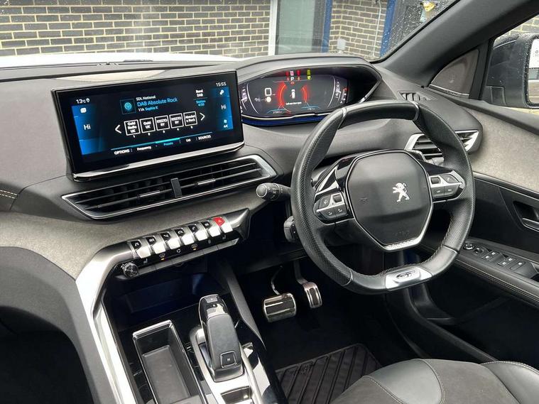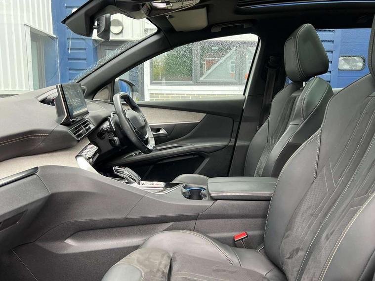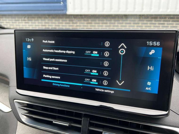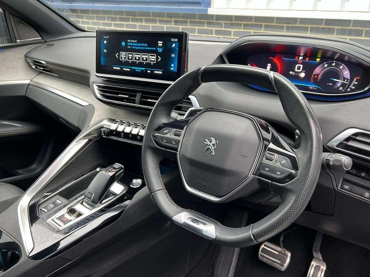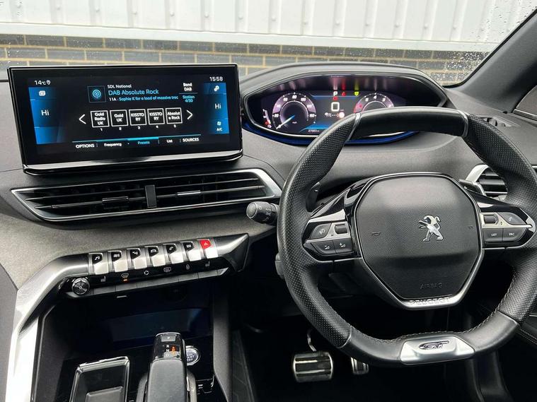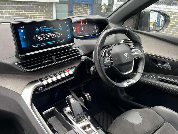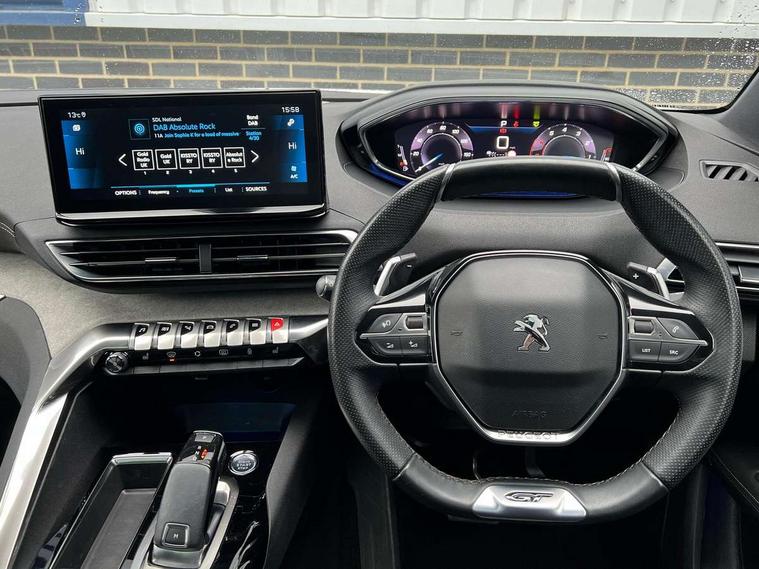 3D connected navigation with 10" HD touchscreen + voice recognition system, Bluetooth telephone facility, Driver attention alert system, Extended traffic sign recognition, Exterior temperature indicator with ice warning, Front parking sensors, Hands free electric tailgate, Lane departure warning system, Mirror screen with mirror link, apple carplay and android auto, Multi function trip computer, Passive blind spot monitoring without Steering correction, PEUGEOT i-Cockpit with 8.0" capacitive touchscreen in centre console, Peugeot i-cockpit with compact multi-function steering wheel, PEUGEOT i-Cockpit with configurable 12.3" Head-up digital instrument panel, PEUGEOT SOS and assistance, Rear parking aid, Rear passenger USB charging sockets (x2) (type A), Speed limit recognition and recommendation, Visio park assist 360 with colour camera system + automatic parking assist, Dynamic stability control and electronic anti-skid system, DAB Digital radio, Focal premium HiFi sound system, USB socket, Automatic hazard light activation upon heavy brake application, Automatic triggered rear windscreen wiper in reverse gear, Body colour door handles, Body colour rear spoiler with stainless steel edging trim, Body protectors (bottom of front and rear bumpers + wheel arches + protection at bottom of doors) in black, Chrome front wing trim, Dark tinted rear side windows + tailgate window, Electric operated/heated door mirrors, Fog Mode, Frameless electrochrome rear view mirror, Front windscreen wiper with magic wash cleaning system, Full LED headlights with LED fog lights with static cornering function, Gloss black B and C pillar and aerodynamic deflector trim, Gloss black front bumper air scoops, Gloss black rear cluster connecting strip, GT emblem in satin copper (front wings and tailgate), Headlights left on audible warning, Heated rear windscreen with integrated antenna, LED daytime running lights, LED rear number plate lighting, LED side indicator lights integrated into door mirrors, Nera black door mirrors, One touch electric front/rear windows with pinch protection, Power folding door mirrors with auto dipping function in reverse gear, Rear LED Peugeot signature 'Claw Effect' lights, Stainless steel roof arches, Twin exhaust tailpipe, 1/3 to 2/3 split folding rear seats, 12V Sockets in dashboard, rear cabin and load area, 2 cupholders in front centre console, 2x Rear coat hooks, 3x Isofix child seat fittings in the front passenger and outer rear seats, 4 Grab handles retractable and damped, Aikinite stitching in armrest, gear lever and dashboard facia, Aluminium pedals, Blue ambient lighting for connecting zone, Blue ambient lighting to front door panels, central storage and cupholders, Centre front armrest with butterfly wing opening and illuminated storage compartment, Dual zone automatic climate control, Electric power steering with reach and rake adjustable steering column, Flocked front door pocket interior with blue ambient lighting, Flocked glovebox interior, Focal tweeter speaker grilles in Belem bronze metal effect finish, Foldable front passenger seat, Footwell illumination, Front interior light with 2 reading spotlights and rear interior light with timer, Front seat back map pockets, Gear shift indicator, Illuminated glovebox, Individual left and right controls in boot for seat folding, LED interior lighting in storage spaces and load area, Mistral floor mats with Aikinite contrast stitching, Mistral full grain perforated leather steering wheel with aikinite stitch detail and satin chrome 'GT' emblem, Rear bench seat with central armrest and ski hatch, Rear centre console ventilation system, Roof lining - Mistral black, Satin chrome dashboard trim, Satin chrome digital instrument panel and touchscreen trim, Satin chrome front door panel recess trim, Satin chrome interior door handles, Satin chrome scorpion's tail and toggle switch trim, Seatbelt not fastened audible and visual alert for front seats, Seatbelt unfastened on the move audible and visual alert for front and rear seats, Sunvisors with illuminated vanity mirrors, Two position boot floor, Drive assist plus pack - 3008, Driver and passenger seat pack - 3008, Driver sport pack - 3008 Auto, Visibility pack - 3008, 3x Rear three-point retractable seatbelts with force limiters in the outer rear seats, ABS (Anti-lock Braking System) with EBD (Electronic Brakeforce Distribution) and EBA (Emergency Braking Assistance), Adaptive driver and front passenger airbags with passenger airbag deactivation function, Driver and front passenger side airbags, Electric child locking functionality on rear windows and doors, Electric parking brake, Front and rear curtain airbags, Front optimised safety headrests and 3 x rear retractable headrests with height adjustable, Front three point retractable seatbelts with pre tensioners and force limiters, Front ventilated disc brakes and rear disc brakes, Hill start assist, Two tone horn, Automatic door locking when moving off, Electronic immobiliser, key operated exterior door lock from the left hand door, Perimetric and volumetric alarm with lift and tilt sensor, Peugeot Open and Go System, Remote control central locking with two plip keys, Grey greval alcantara dashboard and door panel inserts, Puncture repair kit including compressor, sealant cartridge and towing eye,