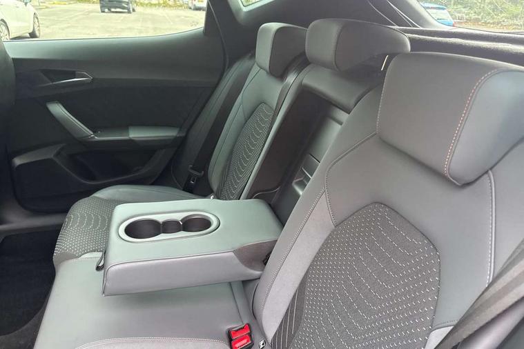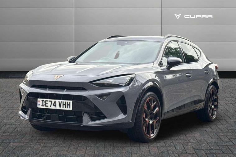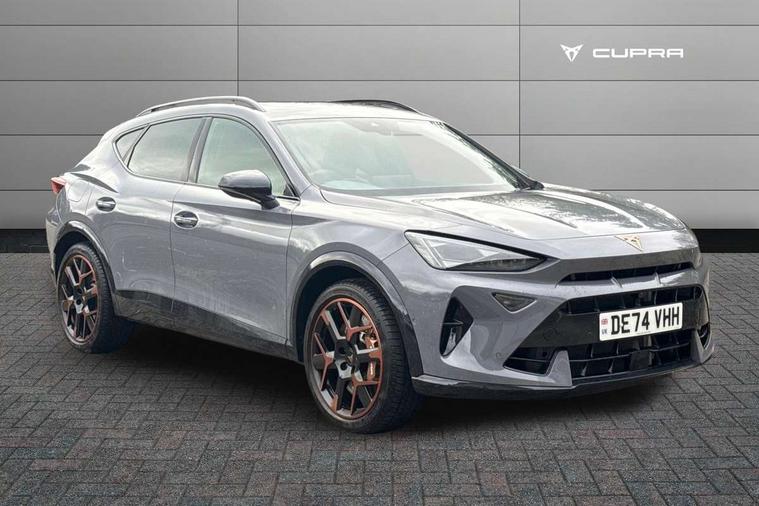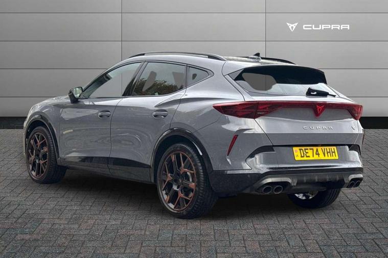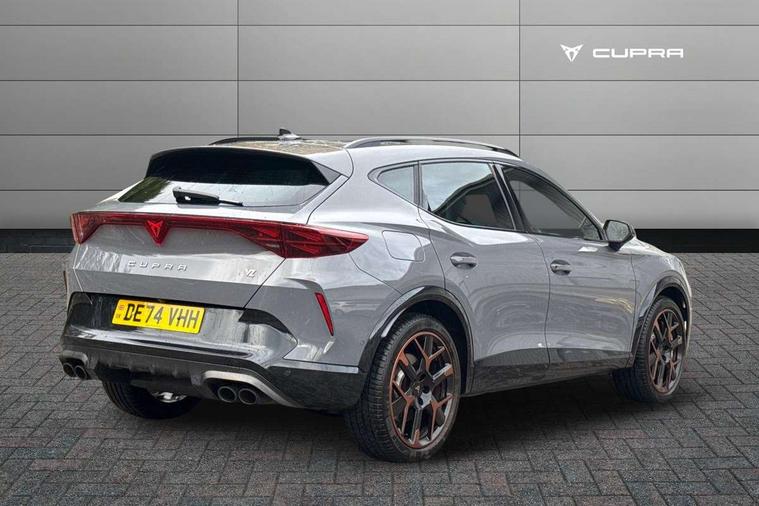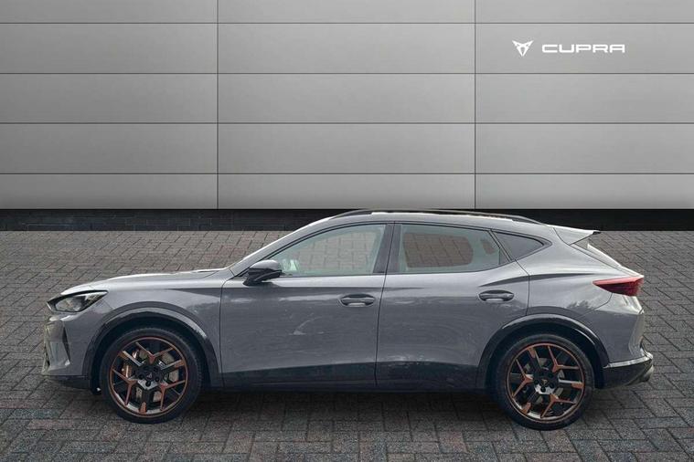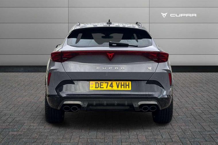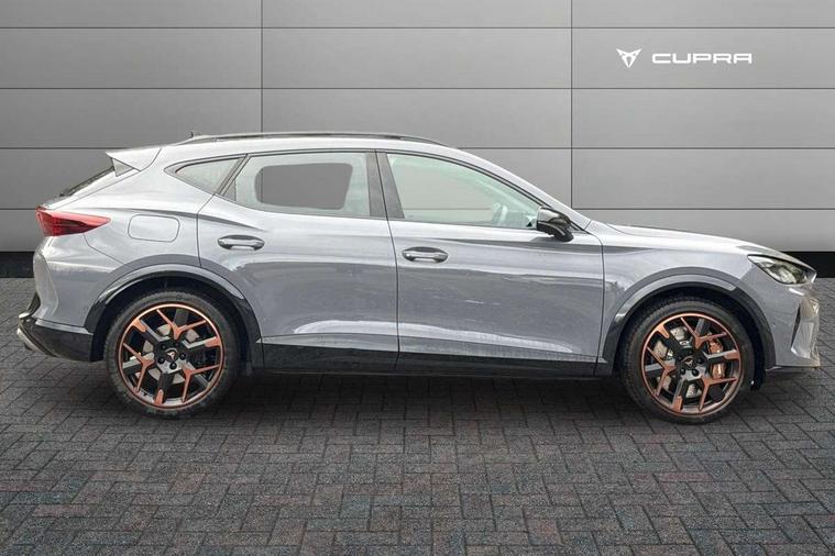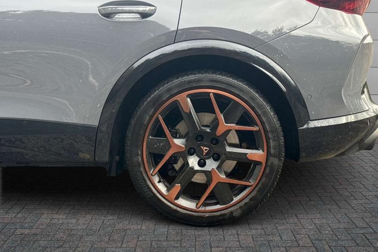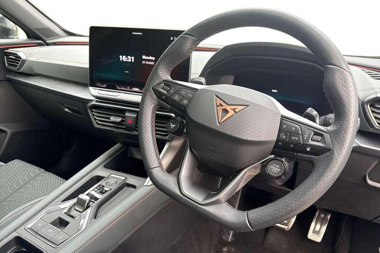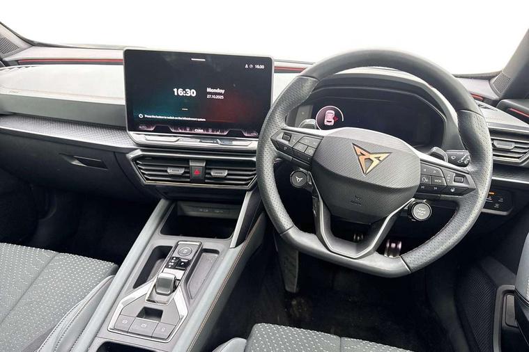 10.25" digital cockpit and configurable dashboard, Adaptive cruise control with follow-to-stop and speed limiter, Advanced driver alert system, Advanced lane assist with semi-automatic vehicle control in a medical emergency and traffic jam assist, Dynamic chassis control with driving profile selection (Comfort, Sport, CUPRA, Individual), Dynamic road sign display, Emergency steering support with turn assist, Forward collision warning with automatic braking, Full link phone integration, Intelligent park assist, RPM, trip computer, outside temp gauge, instrument light brightness, low fuel warning light, lights on reminder, gearshift indicator, Service interval indicator, Side and exit assist, Speed sensitive power steering, Start/stop system with regenerative braking, Top view camera, Virtual pedal and electric tailgate, Voice control system, Wired Android Auto, Wireless apple carplay, Wireless phone charger, Adaptive chassis control with continuous operation, CUPRA sport suspension, Electronic locking differential and dynamic traction support, 2 front and 2 rear USB type C sockets, Immersive by Sennheiser TM - 10 speakers, 1 central speaker, 1 subwoofer, Media system with navigation, 12.9" touchscreen display, voice control, DAB, steering wheel mounted controls, Auto dimming rear view mirror, Black roof spoiler, Body colour door handles, Body coloured bumpers, Dark grey wing mirror, Daytime running light with automatic headlight control and coming home feature, Door panel ambient lighting, Dynamic headlight range control, Electric front/rear windows, Electrically adjustable heated and folding door mirrors with memory function, Gloss black roof rails and window surrounds, High beam assist, LED 3rd brake light, LED front fog lamps with cornering function, LED Taillights with dynamic indicator, Matrix LED headlights with multifunction camera, Rain sensing wipers, Rear diffuser with twin exhaust pipe on each side, Rear fog lights, Rear side wing doors, Rear wash/wipe, Side skirts, Tinted rear windows, Welcome lights (within exterior mirror housing), 12V socket, 2 front and 2 rear reading lights, 3 seat bench in 2nd row, 60/40 split rear bench seat with armrest and mechanical seat release, Black headlining, Black interior roof lining, Cupra sports pedals, Dust/pollen filter, Electrically adjustable front seats with lumbar support and memory function, Front and rear head restraints, Front centre armrest, Heated front seats, Heated supersports multifunction leather steering wheel with satellite buttons and gear shift paddles, Height/reach adjust steering wheel, Illuminated aluminium doorsteps, Illuminated interior front door sills, Illuminated sunvisor with mirror, Isofix, Leather dashboard, door insert and side trim panel, LED smart wraparound lighting, PVC/Textile upholstery + cup bucket seats, Satellite steering wheel, Single front passenger seat, Three zone climate control with control panel in rear, Variable luggage/load compartment floor, 3 point seatbelts on all rear seats, ABS, Akebono brakes, Brake control system - ESC and brake booster, Child proof door locks, Driver and front passenger airbags with front passenger airbag de-activation, Driver and front passenger knee airbag, Electronic parking brake, Hill hold control, Performance brakes with front brembo calipers, Pre-crash front and rear seat belt tensioner, window closure and hazard lights, Public e-call, Seat belt reminder for front and rear seats, Side airbag for front and rear with curtain airbags, Tyre pressure monitoring system, Anti theft alarm system, KESSY Advanced - Keyless start, keyless entry with SAFELOCK, Locking wheel bolts, Copper and aluminium interior detailing, 19" Hailstorm forged machined R black and copper alloy wheels, Breakdown and tool kit,