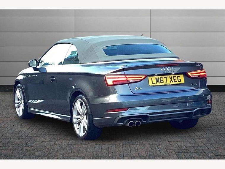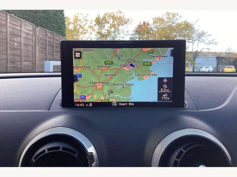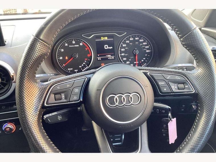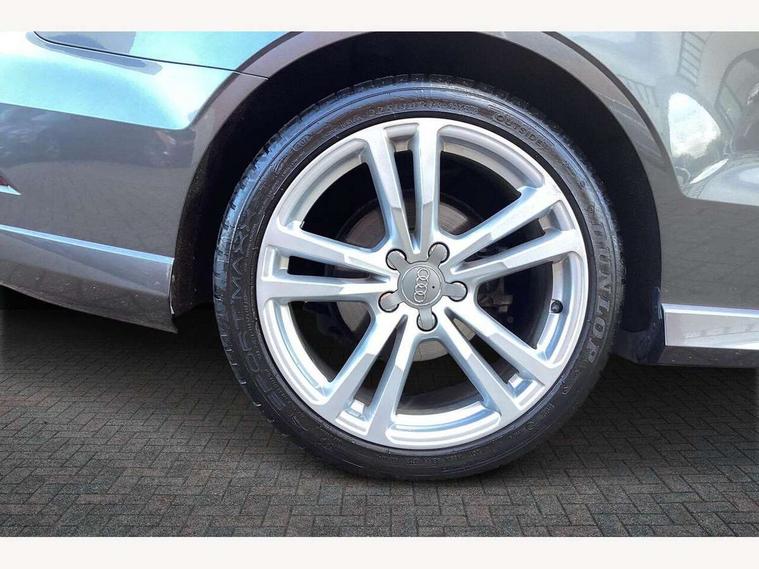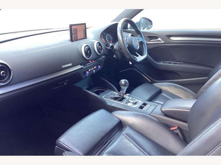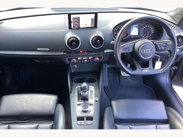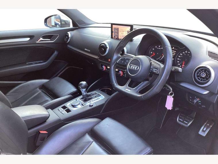 Audi connect, Audi drive select, Audi smartphone interface, Automatic start/stop system, Bluetooth interface, Colour driver's information system display, Electro-mechanical PAS, SD card based MMI navigation, Service interval indicator, 2 USB ports, Audi music interface, CD player, DAB Digital radio, MMI radio plus with 7" colour MMI screen and MMI controller, Aluminium side window trim, Auto dimming rear view mirror with light and rain sensors, Automatic lights and wipers, Body colour bumpers, Body colour door mirrors with integral indicators, Chrome exhaust tailpipes, Dark chrome grille, Electric operated/heated door mirrors, Front and rear electric windows, Fully automatic acoustic hood, Heated front windscreen, Heated rear window, Heated windscreen washer jets, LED daytime running lights, Roof spoiler, S Line body styling, 2 height adjustable rear headrests, 3 spoke flat bottom multi-function leather steering wheel including paddle shift, 4 lashing points to secure luggage, 50/50 split folding rear seat, Adjustable front armrest, Driver/passenger sunvisors, Dual zone electronic climate control, Front/rear floor mats, Height adjustable front seats, Height/reach adjustable steering column, Illuminated glovebox, ISOFIX child seat preparation+airbag deactivation, Jack and tool kit, Perforated leather gearknob, Stainless steel pedals, Storage compartment in centre console, Storage compartments in doors, LED interior light pack - A3/RS3, Light and rain sensor pack - A3 Cabriolet, Non smoking pack - A3, Storage pack - A3 Cabriolet/Saloon, 3 point seatbelts on all seats, ABS/EBD, Active bonnet, Active front headrests, ASR, Automatic roll over protection, Driver and passenger side airbags, Driver/Front Passenger airbags, Drivers knee airbag, EDL, Electromechanical parking brake, ESC - Electronic Stability Control + traction control, Front passenger airbag deactivation, Seatbelt warning, Tyre pressure monitor, Warning triangle and first aid kit, Anti theft alarm, Anti-theft wheel bolts, Immobiliser, Remote control central locking, Aluminium air vent surrounds, Aluminium trim elements, Matt brushed aluminium inlays, Space saver spare wheel,