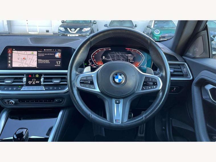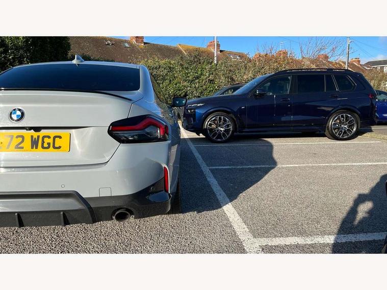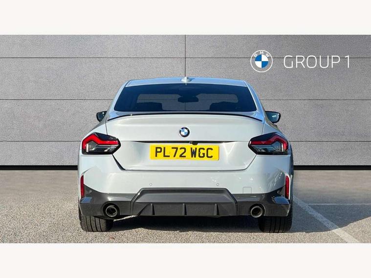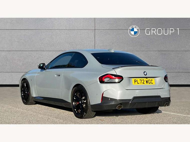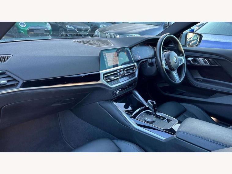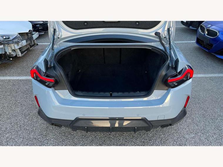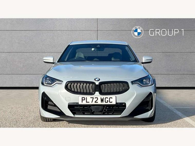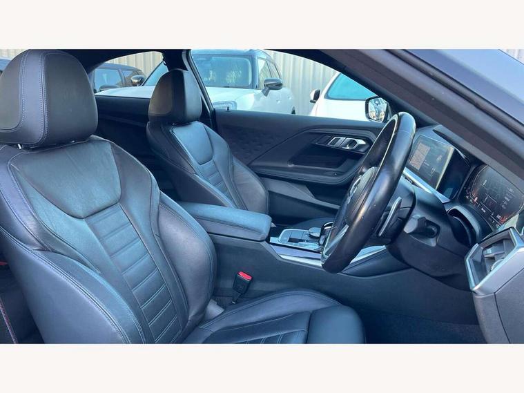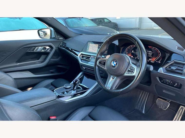 Attentiveness assist, Auto start-stop, Bluetooth, BMW ConnectedDrive online services, BMW Teleservices, Check Control warning system for monitoring of lights and door/luggage compartment open warning, Direct selection buttons, Drive off assistant, Eco pro mode, Electric power steering, Front and rear parking sensors, Front/rear Parking distance control, iDrive controller with turn and press function, Integrated owners handbook, Intelligent functions, Live cockpit plus with nav function 12.3" instrument cluster and 14.9" centre display, Oil sensor for level and grade, Optimum shift indicator, Personal Profile, Touch operation on control display, Variable sport steering, Widescreen multi-media display, Aluminium lightweight construction, Balancer shaft, BMW TwinPower Turbo four-cylinder petrol engine, Double VANOS, Drive performance control with ECO PRO comfort + sport mode, Electronic differential lock, High precision injection, M sport suspension, Petrol Particulate Filter, Sport automatic steptronic transmission with gearshift paddles, manual gearshift time display, launch control, coasting idle ECO PRO/COMFORT modes, Twin scroll turbocharger with Valvetronic, DAB tuner, Acoustic windscreen wipers for reduced driving noise, Adaptive LED Headlights, Automatic windscreen wipers and automatic headlight, Automatically dimming rear view mirror, Body colour door handles flush with door surface, Body colour door mirrors, Body colour front and rear bumpers, Daytime running lights, Electric windows - front and rear, with open/close fingertip control and trap release, Exhaust tailpipes x2 - 90mm in left and right, Fading support, Front and rear bumper system with replaceable deformation elements, Front door sill finishers in black plastic with BMW designation, Front windscreen wipers with integrated washer jets, Green tinted heat protection glazing, High beam assistant, High gloss shadowline exterior trim in mirror triangle cover, mirror cover panel, mirror bezel and window border, High level third brake light, Indicators integrated int mirror housing, LED registration plate light, LED technology rear tail lights, brake lights and turn indicators, Lightweight engineering, Model designation on right side of tailgate, One piece kidney grille with hight gloss chrome surround, Rear boot, Rear fog lights, Reversing light in rear light cluster, Shark fin antenna, Single part LED rear lights with smoked glass components, Trailer stabilisation logic, Visible VIN plate, 12V power socket in front centre console with blanking plug, 2 cupholders in front centre console, 3 zone automatic air conditioning, Ambient lighting, Compartment in front of cupholder, Conditioned based service, Driver seat backrest width adjustment, Front and rear side armrests integrated into door trim, Front armrest, Front door pockets, Front head restraints, Front sport seats, Heated front seats, Illuminated glove compartment with separate small compartment, M headliner Anthracite, M sport leather steering wheel, Manually adjustment steering wheel column, Rear seat backrest with manual 40:20:40 split folding, Rear seat centre foldable armrest with integrated cup holder, Single front passenger seat, Storage compartment between rear seats, Storage tray and compartment with cover in centre console, Sun visors with vanity mirrors and insert tab, Through loading system with 40/20/40 split folding 2 rear seat in 2nd row, Two folding rear seat headrests, Velour floor mats, Additional storage compartment pack without USB - 2 Series Coupe, Connected pack professional - 2 Series Coupe, Interior and exterior mirror pack - 2 Series Coupe, M Sport exterior styling aerodynamics pack - 2 Series Coupe, 2 tone horn, Anti lock braking system (ABS) with cornering brake control, Automatic Stability Control (ASC), BMW emergency call, Brake drying, Child seat ISOFIX attachment for the two outer rear seats, Crash sensor activating of airbags, Unlocking doors, hazard warning lights, interior light, safety battery terminal, Deactivation of fuel pump in the event of a crash, Driver and front passenger airbags, Driver and front passenger side airbags, integrated in the door side seat backrest bolsters for all seat variants, Dynamic brake control, Dynamic stability control + (DSC+), Dynamic Traction Control - DTC, Electrically operated hand brake including automatic hold function and automatic release when driving off, Front and rear disc brakes, Front passenger airbag deactivation, Head airbags for all 4 outer seats, Manual deactivation of front passenger airbag, Seat belt security check for driver and front passenger, Seatbelt warning, Side impact protection, Three point seat belts on 4 seats including front belt stopper, pyrotechnic belt tensioners and belt force limiters, Tyre pressure sensor, Warning triangle and first aid kit, Alarm system (Thatcham 1) with remote control and electronic engine immobiliser, Central locking switch for all doors, fuel filler cap and luggage compartment, Deadlocking function system to all doors, Drive away locking system on all doors and luggage compartment, Locking wheel bolts, Start/Stop button (illuminated) in centre console with keyless engine start and Auto Start-Stop deactivation button, Two remote control key with integrated key - one button for open and close doors/fuel flap/tailgate and separate button for unlock luggage compartment, BMW mobility tyre sealing system, Electrically powered 12V compressor, Reduced rolling resistance tyres,