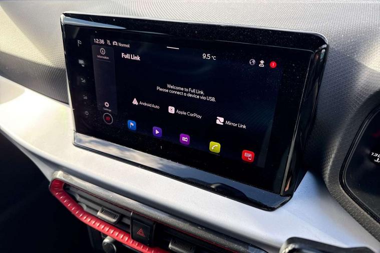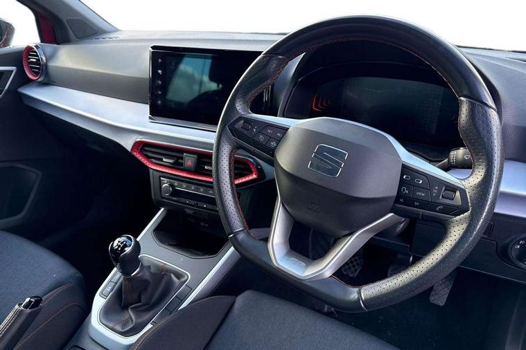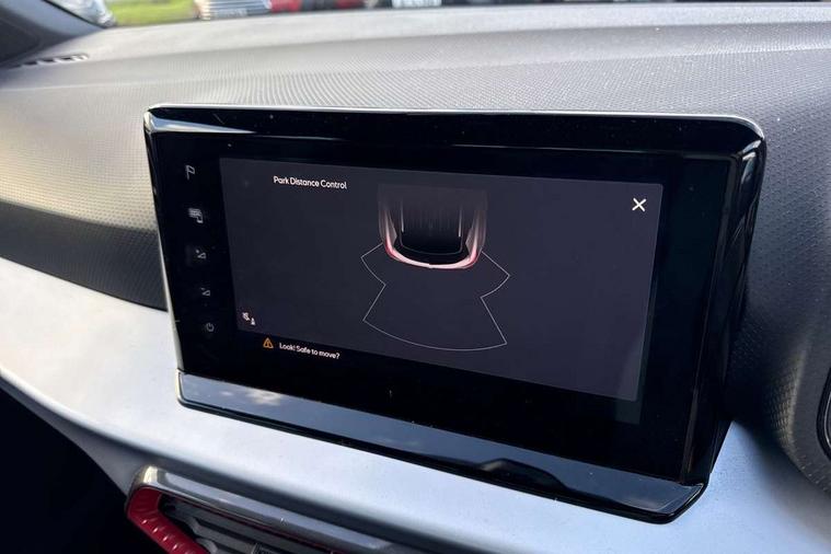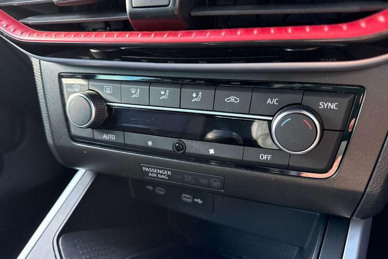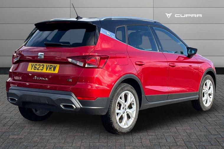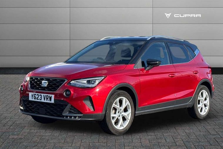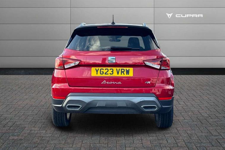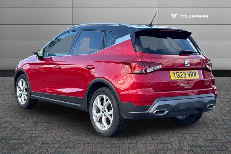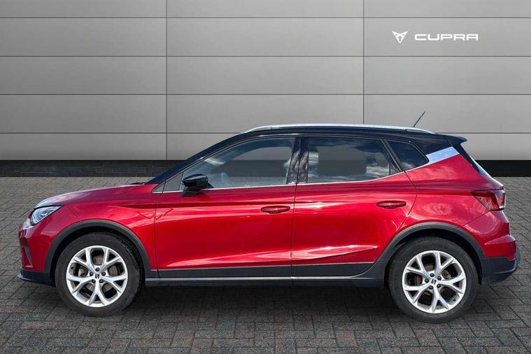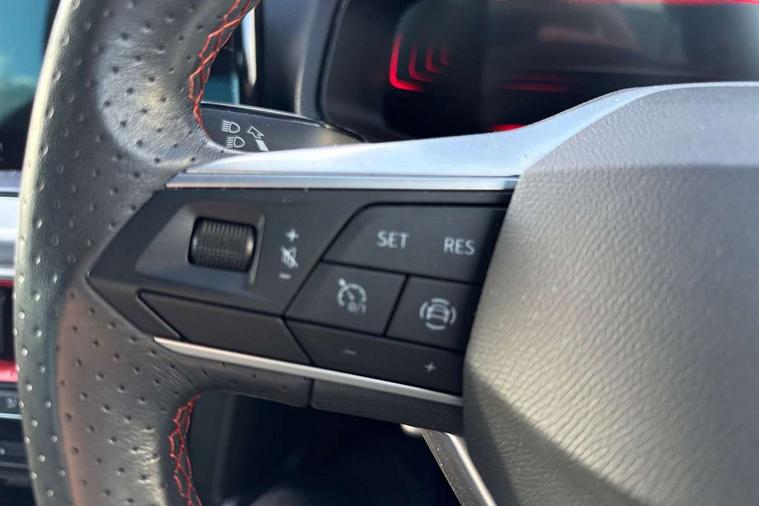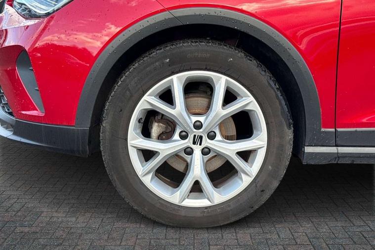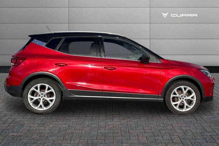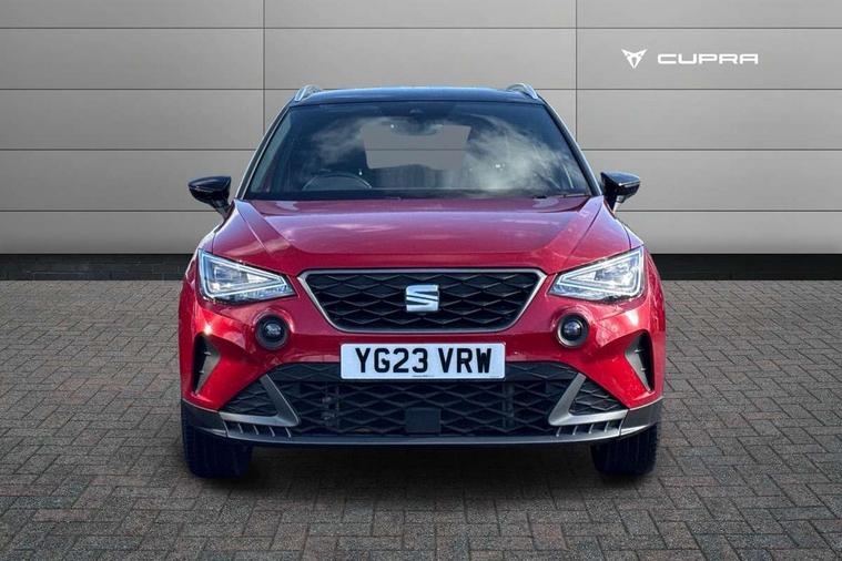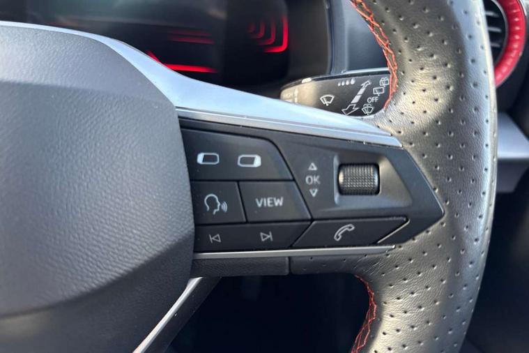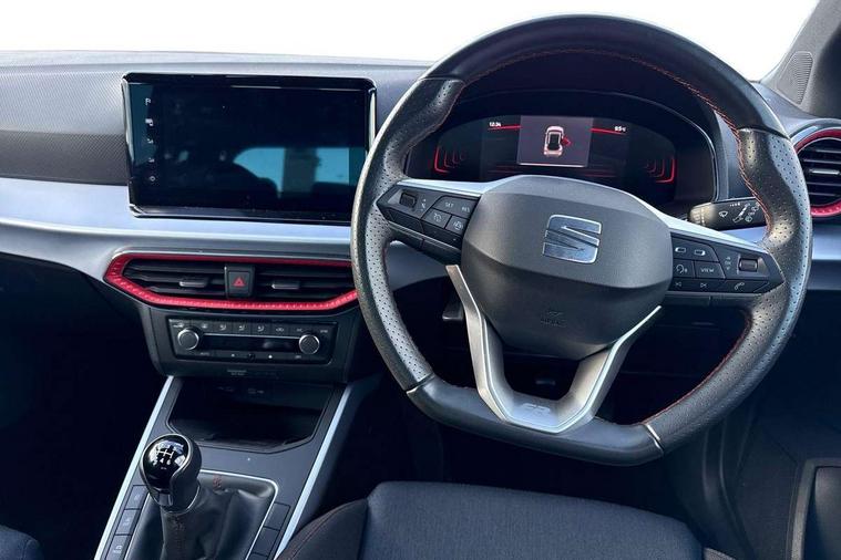 'Lights On' Reminder warning buzzer, 8" Digital cockpit, Digital clock, E-call, Electric speed sensitive power steering, Full Link Smartphone Integration with Mirror Link, Apple Car Play, Google Android Auto with USB Type C cable for Apple and Android compatibility, Lane keeping system, Low fuel warning light, Outside temperature display, Rear parking sensor, RPM counter, Seat connect with safety, service, remote and online, SEAT Drive profile - Four different models normal-sport-eco-individual, steering response, throttle response, Trip computer, Wireless phone charger, 9.2" colour touchscreen with navigation system, voice control and USB port (type c), Bluetooth interface for hands free and audio streaming, DAB digital radio and AM/FM radio, Steering wheel mounted audio controls, Anti theft roof antenna, Auto dimming interior rear view mirror, Automatic activation of hazard warning lights, Body coloured bumpers, Body coloured door handle inserts, Chrome roof rails and window surrounds, Dark tinted rear windows, Electric front/rear windows, Electrically adjustable, heated and folding door mirrors, Front fog lights with cornering function and rear fog light, FULL LED automatic headlights with dynamic headlight range control, coming and leaving home, LED daytime running lights, LED rear tail lights and licence plate lights, Protective side mouldings, Rain sensing wipers, Rear side wing doors, Rear spoiler, Rear window wash/wipe, Roof colour door mirrors, Third brake light, Twin exhaust pipe styling hidden exhaust pipe, Visible VIN plate, Windshield wiper with intermittent control and potentiometer, 2 cupholders, 3 seat bench in 2nd row, 60/40 split folding rear seat, Aircare filter, Black interior roof, Cloth upholstery, Double boot floor, Driver sunvisor with covered mirror + card holder, Dual zone climate control, Front courtesy light with 2x front and 2x rear reading lights, Front sport seats, Gear shift indicator, Height adjustable front seats, Height/reach adjustable steering column, Illuminated boot, Instrument lighting with brightness control, Interior ambient lighting, Interior light in footwell, central console and door panel, ISOFIX points in outer rear seats with top tether anchorage points, Passenger sunvisor with vanity mirror, Perforated flat bottomed leather steering wheel/gear knob/handbrake with red stitching and FR logo, Single front passenger seat, Two front and three rear height adjustable headrests, Interior chrome pack - Arona, 3 point seatbelts on all rear seats, ABS, Active front headrests, Child locks on rear doors, Driver and front passenger airbags with front passenger airbag de activation, front side and curtain airbags, Electronic stability control, Emergency Brake Assist (EBA) and front assist, Front and rear seatbelt reminder, Hill hold control, Multi-Collision braking, Tiredness recognition system, Traction control, Tyre pressure monitoring system, Alarm with back-up horn, Electronic engine immobiliser, Locking wheel bolts, Remote central locking + deadlocks, Tow away protection, Titan black dashboard, 17" Dynamic alloy wheels,