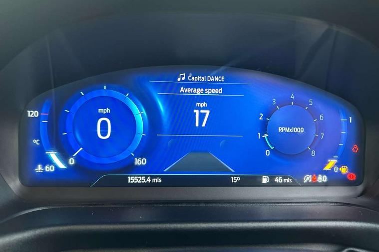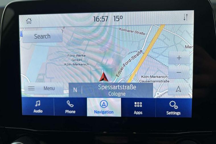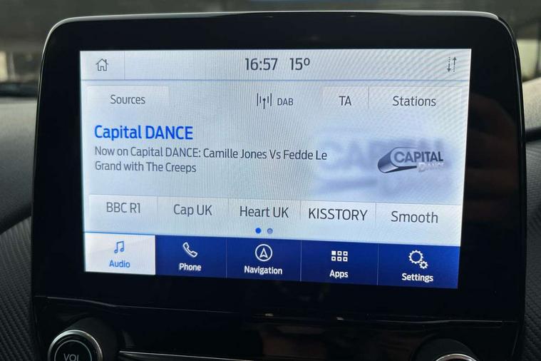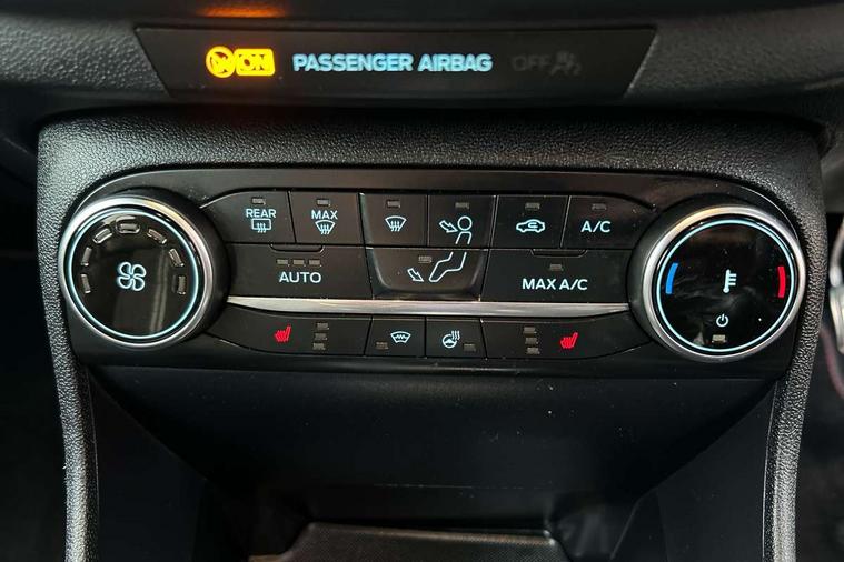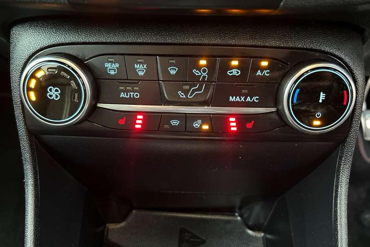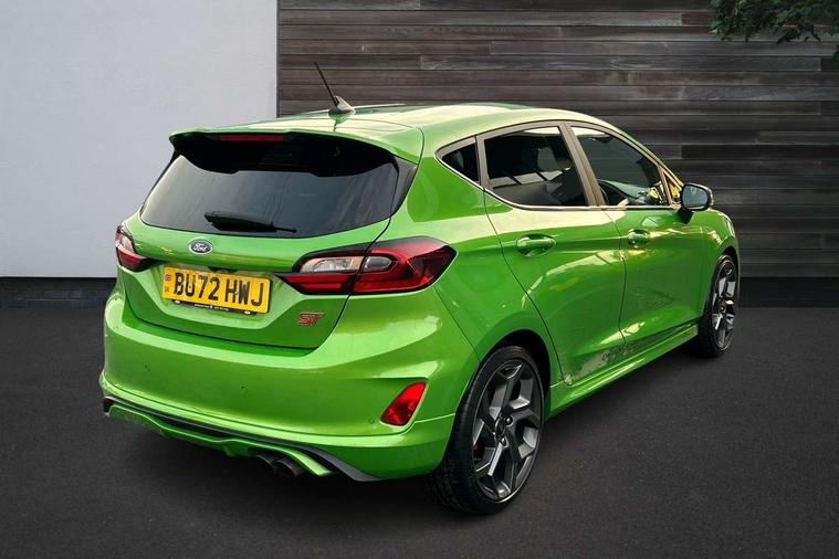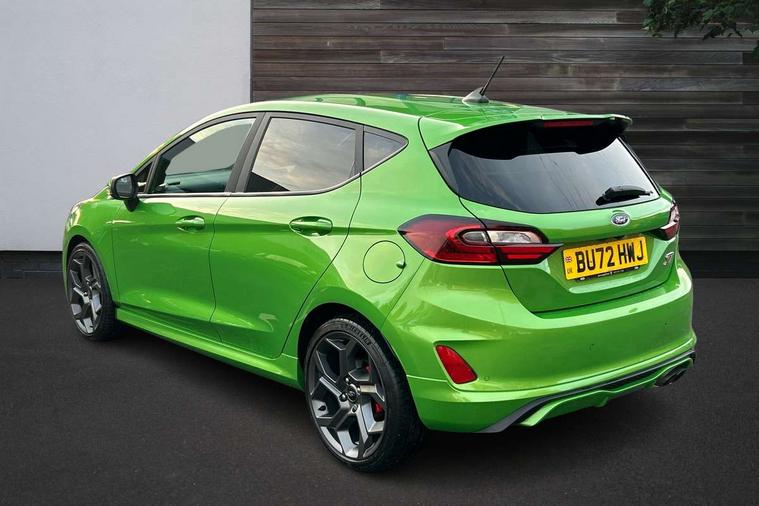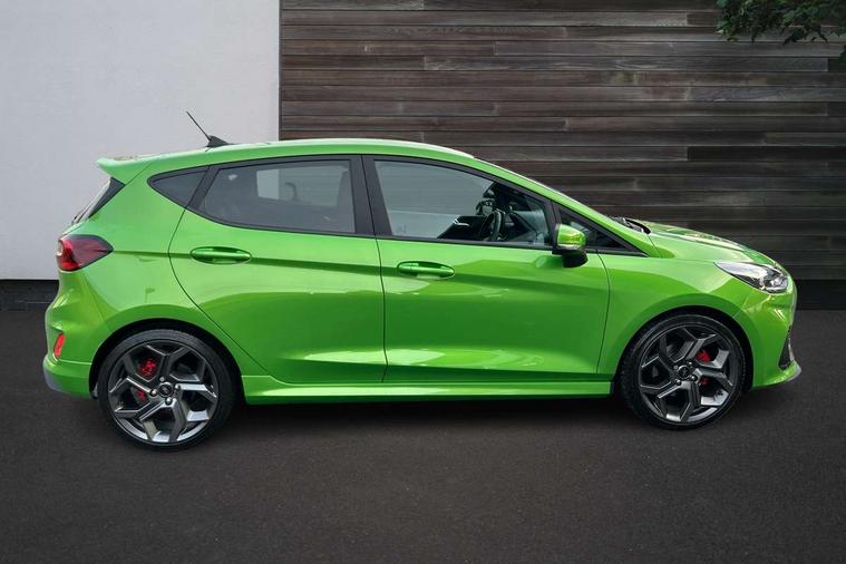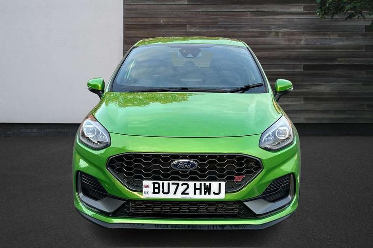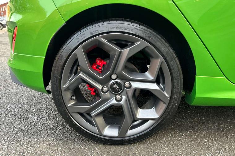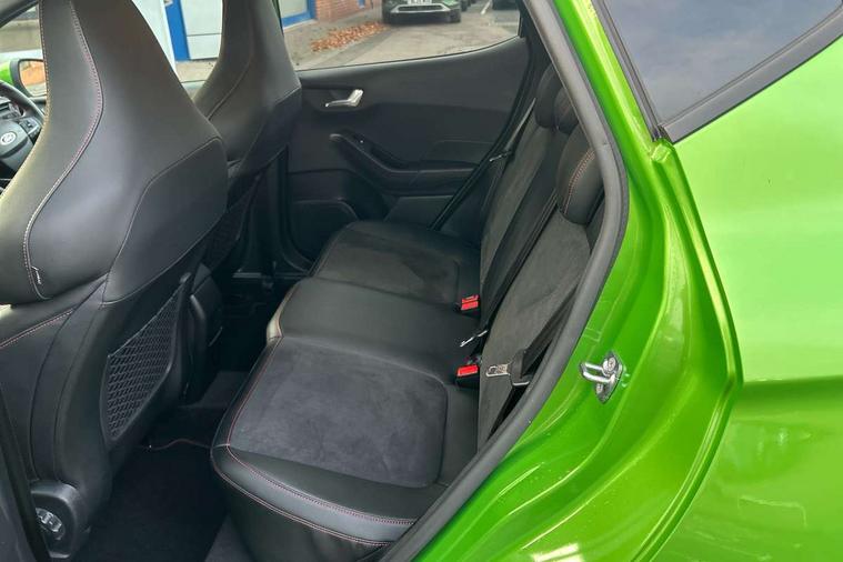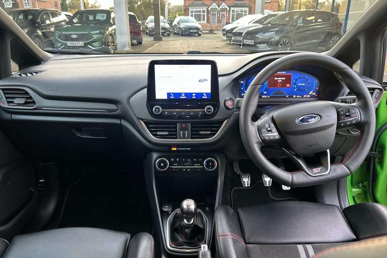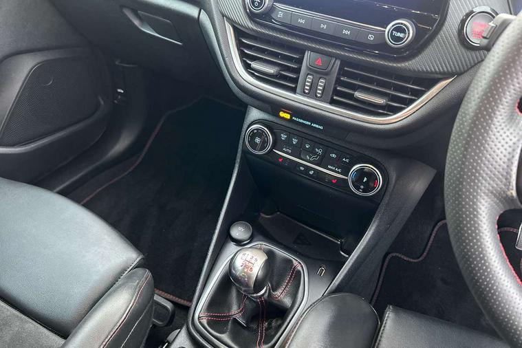Cruise control with adjustable speed limiter and intelligent speed assist, Driver alert system, Electric power steering, Ford easy fuel, Lane keep assist, Lane keeping aid, Rear parking distance sensors, Rear view camera, Selectable drive modes (Normal, Sport, Track), Traffic sign recognition, Trip computer, Unique ST suspension, 3rd brake light, Auto high beam, Automatic headlights, Body colour bumpers, Body coloured electrically operated with side indicators, Dual chrome exhaust tailpipe, Electric front windows/one touch facility, Electric rear windows, LED rear lights, Matrix LED headlights with signature LED daytime running lights and integrated sequential indicator, Quickclear heated windscreen, Rain sensing wipers and auto dimming rear view mirror, Rear privacy glass, Rear side wing doors, Rear wiper, Unique ST front grille and bumper, ST rear bumper with diffusor, Unique ST scuff plates, 3 rear headrests, 3 seat bench in 2nd row, 6 way manual driver seat adjust, with lumbar adjust, 6 way manual passenger seat adjust, with lumbar adjust, Adjustable head restraints, Centre console with opening armrest, 2x cupholders, 12v and USB, EATC - Electronic Auto Temperature control, Floor mats with red stitching, Ford Performance sensico partial premium leather upholstery with red stitching, Ford performance sports seats, Leather gear knob with red stitching, Leather steering wheel with red stitching, Seat belts with red detailing, Single front passenger seat, Unique ST soft feel gearknob, Performance pack - Fiesta, 3 point seatbelts on all rear seats, Electronic stability control with hill start assist, Front and rear seat belt warning, Manual child lock in rear doors, Red brake calipers, Tyre pressure monitoring system, Ford keyfree system with Keyless entry and keyless start, Remote central locking, Thatcham alarm with power door dead locks, 18" 5 spoke alloys with magnetite finish,