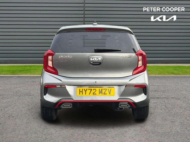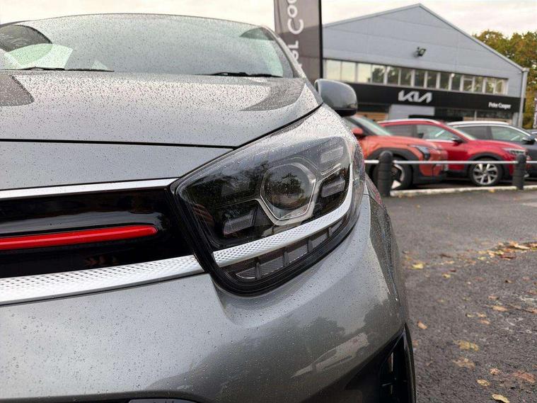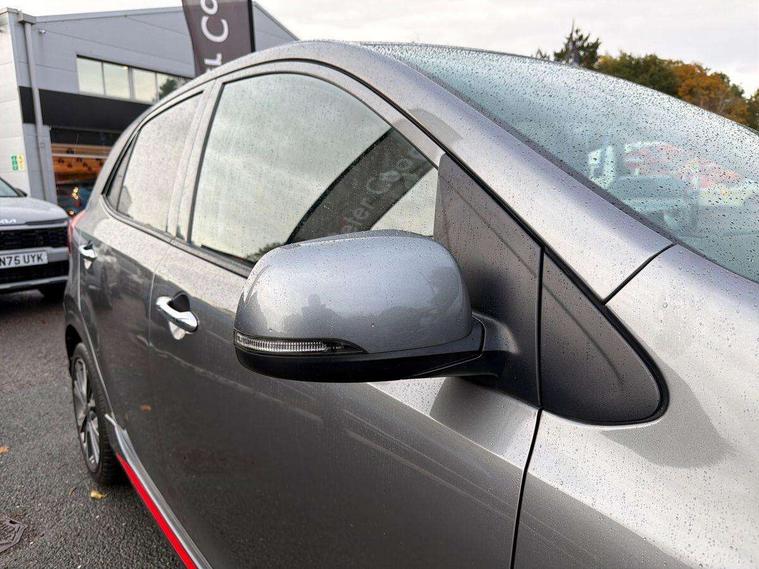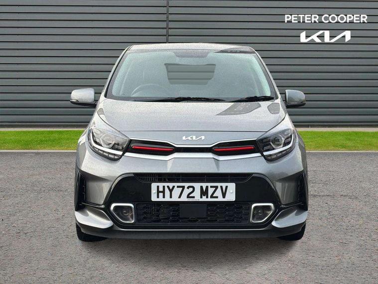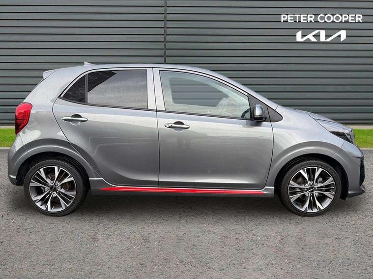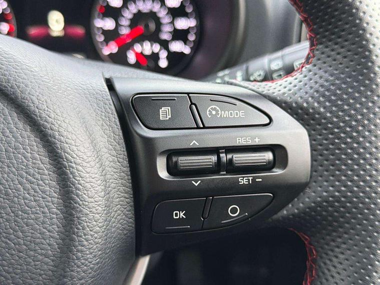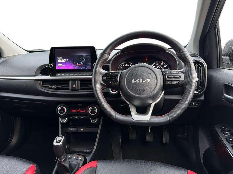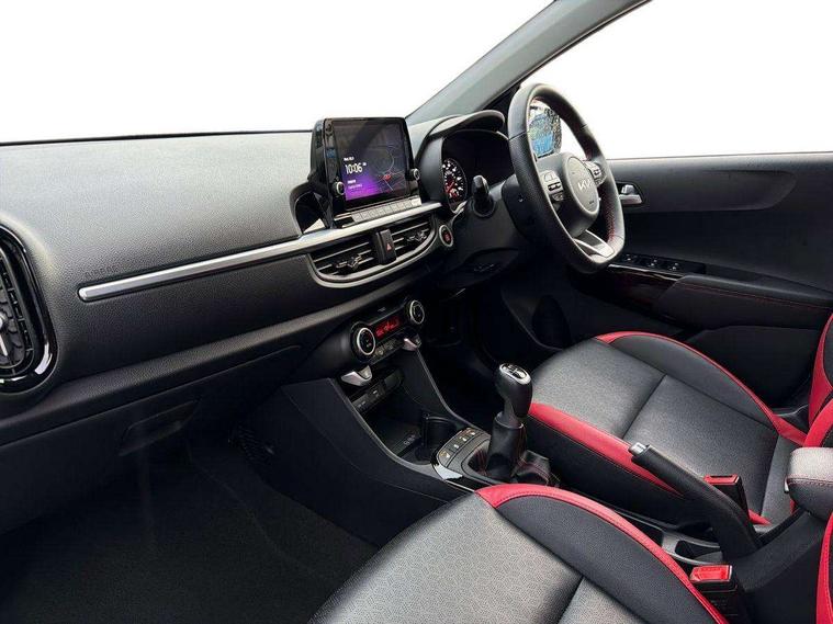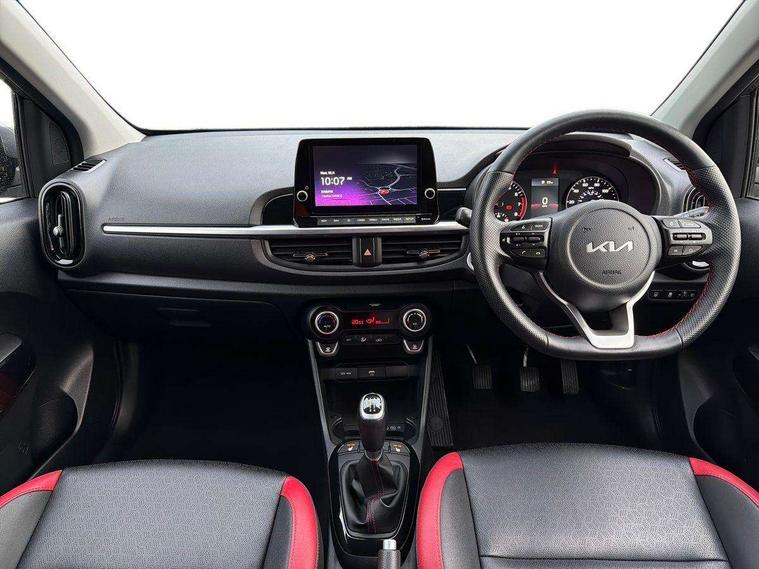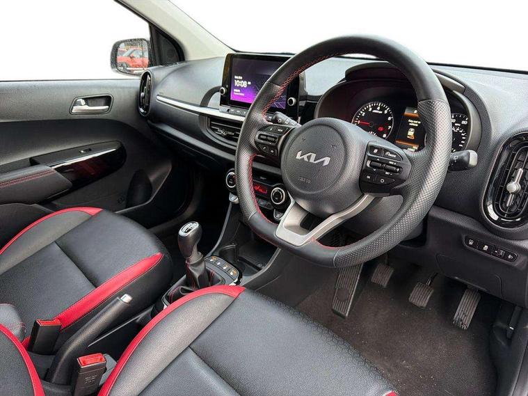 8" touch screen satellite naviagtion with RDS and DAB with telematics, Apple car play/Android Auto with voice control, Cruise control + speed limiter, Emergency call service, Emergency stop signalling system, External temperature gauge, Kia Connect (UVO), Motor driven power steering, Rear parking sensors, Reversing camera system with dynamic guidelines (Integrated into centre fascia screen), Tachometer, Trip computer, Wireless Smartphone charger, 6 speaker audio system, Bluetooth with music streaming, Steering wheel mounted controls, USB ports for connection of a media device, Automatic headlight control system, Bi-function projection headlights, Black beltline mouldings, Black grille with silver surround, Body colour B pillars, Body colour bumpers, Body colour side sill mouldings, Body coloured mirrors and chrome exterior handles, Day/night rear view mirror, Electric adjustable/heated/folding door mirrors with LED indicators lights, Front and rear electric windows with drivers's auto up/down function, Front fog lights, Headlamp levelling, Heated rear window, High mount brake light, LED daytime running lights, LED rear fog lights, Privacy glass - Rear windows and tailgate, Rain sensor, Rear side wing doors, Rear wash/wipe, Speed variable front wipers, Sports front and rear bumpers with gloss black skid plates twin exhaust, Tinted glass, Visible VIN plate, Welcome and follow-me home light functionality, 1 x rear coat hook, 12V power point front, 2 seat bench in 2nd row, 3 x passenger assist grips, 60/40 split/folding 2nd row of seats, All round height adjustable headrests, Automatic air conditioning, Black and red accents front door armrest, Centre Console with Storage Box and Sliding Armrest, Cupholders in centre console, D-cut steering wheel with red stitching, Driver and front passenger sunvisors with driver's side illuminated vanity mirrors, Driver seat height adjust, Faux leather upholstery, Front cabin lights, Glovebox, Heated front seats, Heated steering wheel, High gloss lower centre fascia trim, door armrest and air vents, ISOFIX Child seat top tethers and anchor fixings, Leather trimmed steering wheel and gearshift, Luggage area light, Luggage area parcel shelf, Passenger front seatback pockets, Satin chrome interior door handles, Single front passenger seat, Slide/reclining front seats, Tilt adjustable steering wheel, Advanced Driver Assistance Pack - Picanto, 2 x 3-point rear seatbelts, ABS/EBD, Automatic unlocking of doors in case of impact, Dual front airbags, ESC + BAS + VSM + HAC, Front passenger airbag cut-off switch, Front seatbelt height adjusters, Front seatbelt pretensioners + load limiters, Hill hold control, Knee airbags, Rear child proof door locks, Seatbelt warning, Side impact protection, Torque vectoring brake based and straight line stability (SLS), Traction control, Twin curtain airbags, Twin front side airbags, Tyre pressure monitoring system, Anti theft alarm, Engine immobiliser, Locking wheel nuts, Smart key with engine start/stop button, 16" alloy GT-Line wheels, Tyre mobility kit,