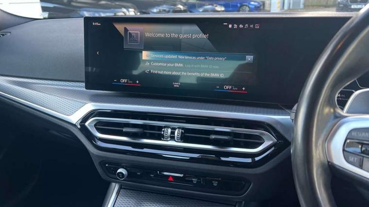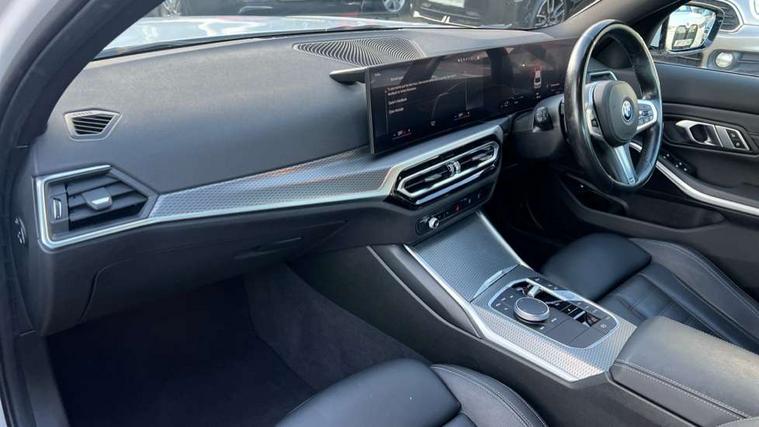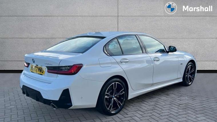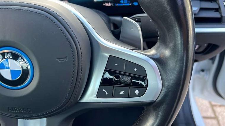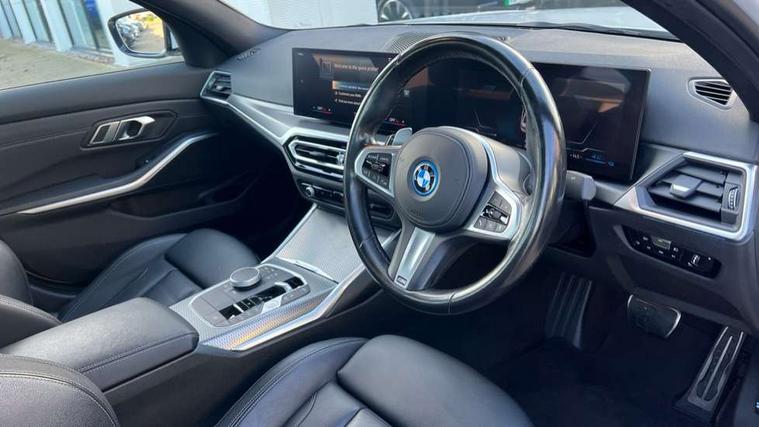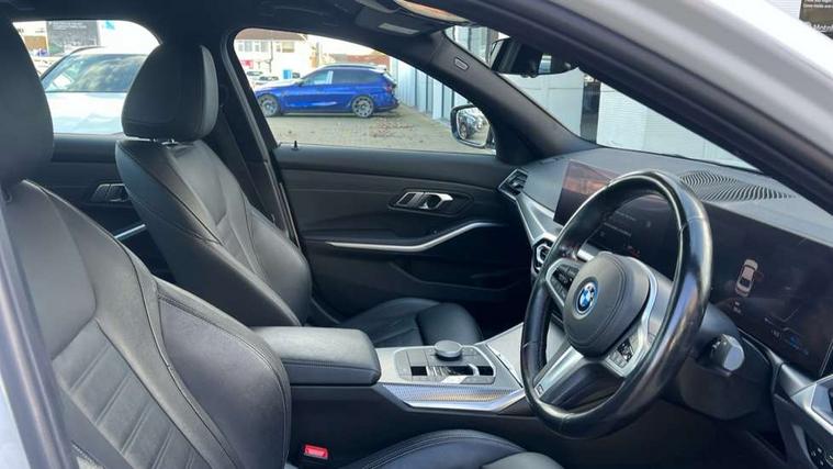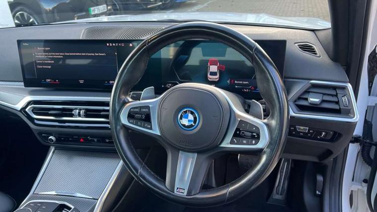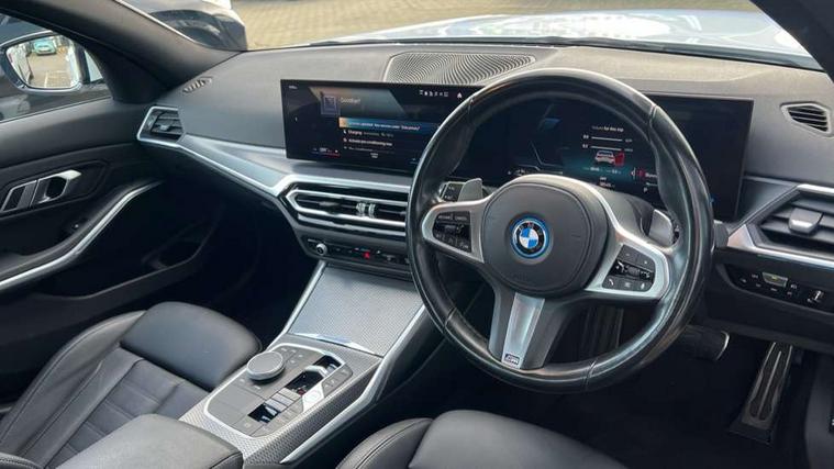 Active guard plus, Attentiveness assist, Automatic Start/stop button, BMW iDrive, BMW Teleservices, Condition based service, ConnectedDrive Services, Driving experience switch, Live cockpit plus with Navigation + 12.3" instrument display + 14.9" display, Intelligent voice assist, 2 USB, 4G LTE connect, Oil sensor for level and grade, PAS, Preparation for driver assistance, Shifting point display, Smartphone integration, Charging cable - Mode 2, Double joint spring strut front axle, Fuel tank breather system, Sport automatic transmission with steering-wheel mounted gearshift paddles and launch control, Standard suspension, DAB tuner, "Electrified by i" exterior badging on charging flap, 3rd brake light, Acoustic glazing, Auto dimming rear view mirror, Automatic headlight beam throw control with load dependent regulating reaction, dynamic compensation of braking dive and acceleration squat, BMW emblem, engine compartment lid and tailgate, Body colour roof fin, Door sill strips, Electric windows - front and rear, with open/close fingertip control, anti-trap facility and comfort closing, Follow me home headlight function, Front and rear bumper system with replaceable deformation elements, Front apron plastic in body colour, Fuel filler flap - right rear in body colour, Heated washer jets, Illuminated bow type door handles in body colour drivers side with door lock, Interior rear view electrochromatic mirror with automatic anti dazzle function, LED headlights with LED daytime running lights and LED turn indicator, LED rear lights, Licence plate panel integrated into front bumper and tailgate, Matt black B-pillar finsher, Matt black window recess cover, Model designation on right side of tailgate, One piece front bumper cover including towing eye cover in body colour, Rain sensor with automatic headlight activation, Rear boot, Rear side wing doors, Reversing lights, Side frame decorative moulding black matt, Visible exhaust tailpipe finisher, Welcome lights in interior and door handle area, 12V power socket in front storage compartment, 2 front cupholder in centre console with clamping elements and matt black inlay, 3 seat bench in 2nd row, 3 zone automatic air conditioning, 40:20:40 split folding rear seat with loading system, Anthracite headlining, Armrest integrated in front and rear door trim + front centre console armrest, Battery in luggage compartment, BMW ID, Cruise control operation in steering wheel, Driver backrest width adjustment, Folding rear centre armrest with 2 cupholders, Front and rear door exit lighting (left / right), Front and rear footwell lighting, Front and rear headrests, Front and rear reading lights, Front and rear velour floor mats, Front sport seats, Heated front seats, Height adjustable mechanically and infinitely variable steering column, Illuminated armrest storage compartment, Illuminated glove compartment, Illuminated luggage compartment, Lashing eyelets in luggage compartment, LED ambient lighting with welcome carpet light, M Sport multifunction leather steering wheel, Make-up mirror lights, Single front passenger seat, Standard seat for driver and passenger with manual adjustment, Sunvisors with vanity mirrors and ticket pocket, Toolkit located in luggage compartment, Connected pack professional - 3 Series Saloon/Touring, Interior and exterior mirror pack - 3 Series Touring/Saloon, M Aerodynamics package - 3 Series Saloon/Touring, M sport exterior styling pack - 3 Series Saloon/Touring, Storage compartment pack - 3 Series Saloon/Touring, 3x3 point rear seatbelts, BMW emergency call, Child locks on rear doors, Crash sensor activating of airbags, Unlocking doors, hazard warning lights, interior light, safety battery terminal, Driver and front passenger with seat occupancy detection for driver's and passenger side, Driver and passenger side airbags, body protection at side and airbags deploy from seat backrests, Dynamic brake control, Dynamic stability control + (DSC+) - Anti-lock Braking System (ABS) with brake assist and cornering brake control + Automatic Stability Control (ASC), Dynamic Traction Control - DTC, Electric parking brake including automatic hold function and automatic release of the parking brake when driving off, Electronic differential lock control (EDLC), Head airbags in 1st and 2nd row, head protection at side, curtain airbags open from headliner above 1st and 2nd row, Side impact protection, Tyre pressure monitoring with three level warning strategy, Ventilated front and rear disc brakes, Warning triangle and first aid kit, Alarm system, Centre lock switch, Closing system with central locking, Electronic vehicle immobiliser,