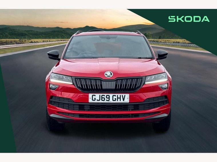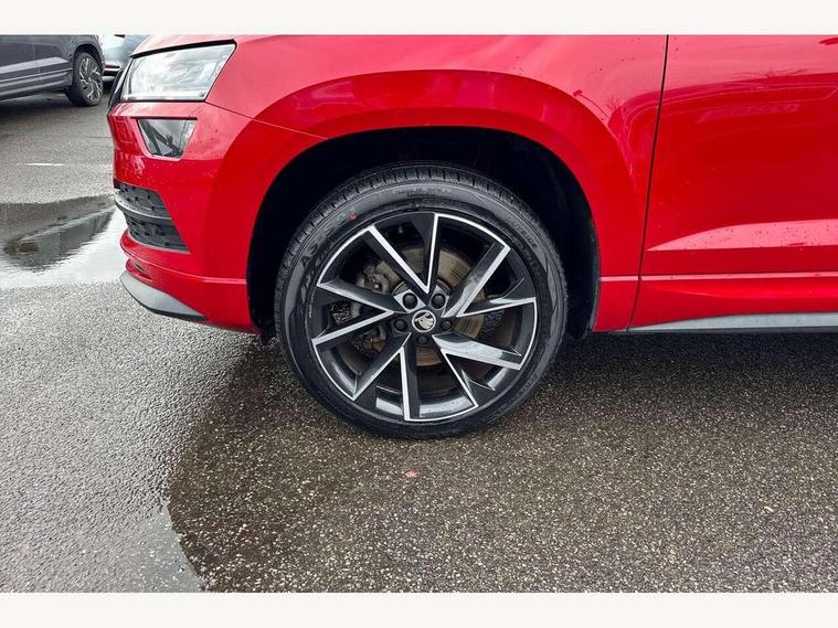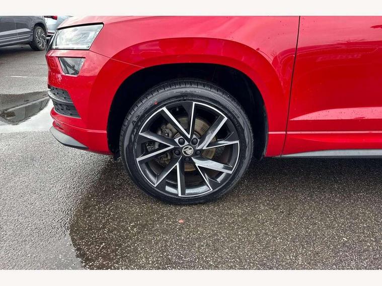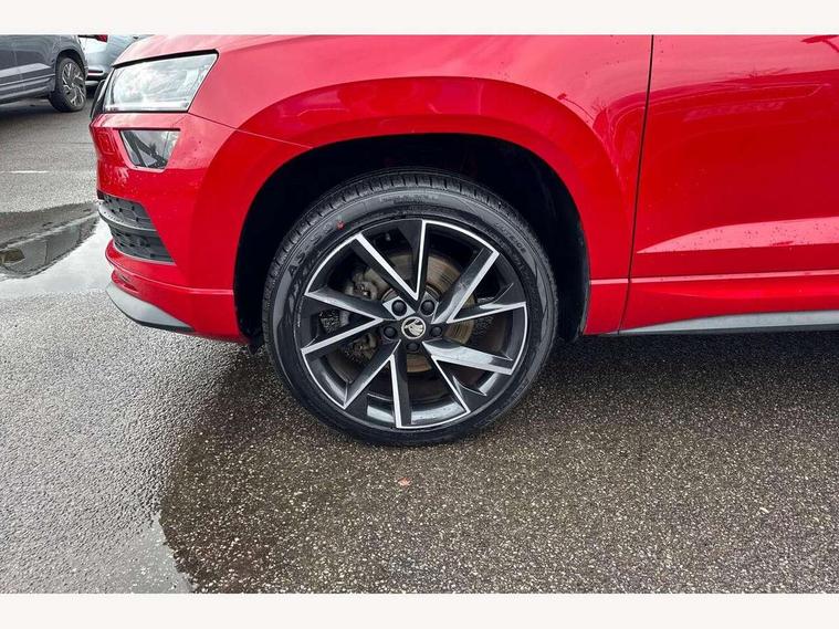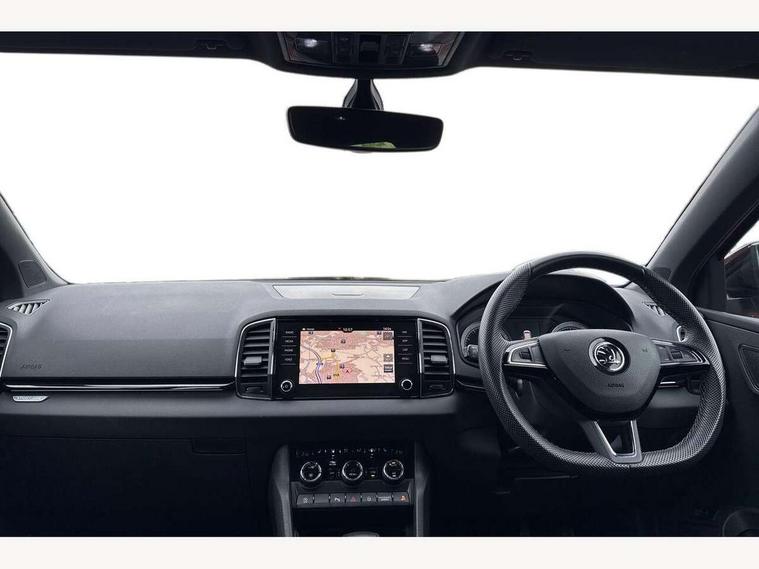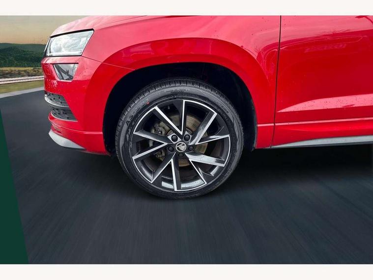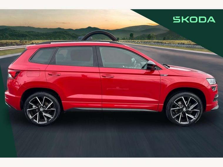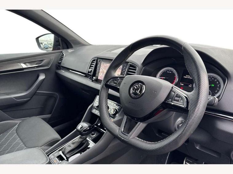 Drive mode selection with off road, Driver alert system, Driver fatigue sensor, Driver profile selection, Multifunction colour trip computer, Outside temperature gauge, Rear view camera, Service interval indicator, Start/stop system with regenerative braking, DAB radio with Bluetooth, SD card slot, USB connection, Acoustic glass, Aero front windscreen wipers with intermittent function, Automatic headlight control system, Black roof rails and door mirrors with radiator grille, Body colour door mirrors and handles, Chrome outside aluminium bar around the window, Electric front and rear windows with child proof lock, Electrically adjustable heated folding and auto dimming door mirrors with boarding spots, Front door steps with SportLine logo, Full LED headlights + adaptive front light system + LED daytime running lights and front cornering fog lights, Headlight washers, Heated rear windscreen, LED rear lights with high functionality, Light assistant (coming/leaving home/tunnel light), Panoramic sliding sunroof, Privacy glass, Protective door side sills in body colour, Rear diffuser, Safety reflectors on front doors, Sportline badge on front fender, Sportline decorative inserts with badging, Sports front and rear bumpers, Third brake light, 1.5 litre bottle holders in driver and front passenger door panels, 12V socket in boot, 12v socket in front centre armrest with storage compartment and rear air vents, 2 Folding hooks and nets in boot, 2 Front readings lights for driver and passenger, 3 rear height adjustable headrests, 4 foldable roof handles with rear coat hooks, 4 lashing points on luggage floor, Aluminium pedals, Backrest release, Black roof headlining, Cargo elements in boot, Chrome inner door handles, Driver and passenger seats height adjust, Dual zone climate control, Front seat and rear pockets, Height adjustable front three point seats belts with tensioners, Height/reach adjust steering wheel, Ice scraper, Illuminated and cooled glovebox, Illuminated luggage compartment, Isofix child seat preparation outer rear, Manual lumbar support for front seats, Net programme in boot, Pen holder, Pollen filter, Rear boot cover, Rear reading lights, Rear seats fixed folding and divided 60:40, Removable LED torch in the boot, Retractable parcel shelf attachable to tailgate, Safety vest holder, Storage box in upper central dashboard closed, Storage compartment below the passenger seat, Storage net on centre console passenger side, Sunvisors with illuminated vanity mirrors, Textile floor mats, Umbrella under passenger seat, Welcome animation with sportline logo, LED Interior lighting pack with Skoda welcome logo - Karoq, Airbags - Front side, head, knee and curtain, Automatic door unlocking in case of crash, Automatic fuel cut off in case of crash, Driver airbag, Electronic parking brake with auto hold function, Emergency rear braking signal, ESC including ABS, MSR, ASR, EDS, HBA, DSR, RBS, MKB and traction control, Front assist radar scanning of the space in front of the car with automatic braking, Hill hold control, Passenger airbag with switch-off function, Pedestrian monitor, Seatbelt reminder signalisation and pretensioner for all seats, Three point seatbelts rear, Two tone horn, Tyre pressure display, Tyre pressure monitor, Alarm with interior monitoring, back up horn and tilt sensor with safe function, Electronic engine immobiliser, Keyless entry and keyless start with safe system, Remote central locking with 2 remote folding keys, Chrome framed air vents, 19" Vega anthracite alloy wheels, Anti-theft wheel bolts protection, Storage on wheel cover,