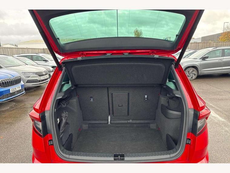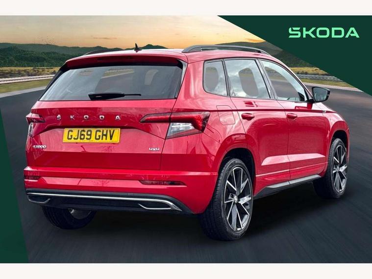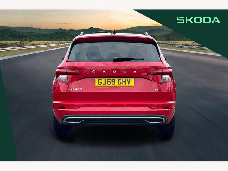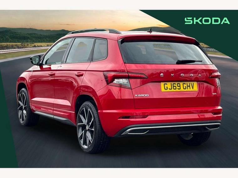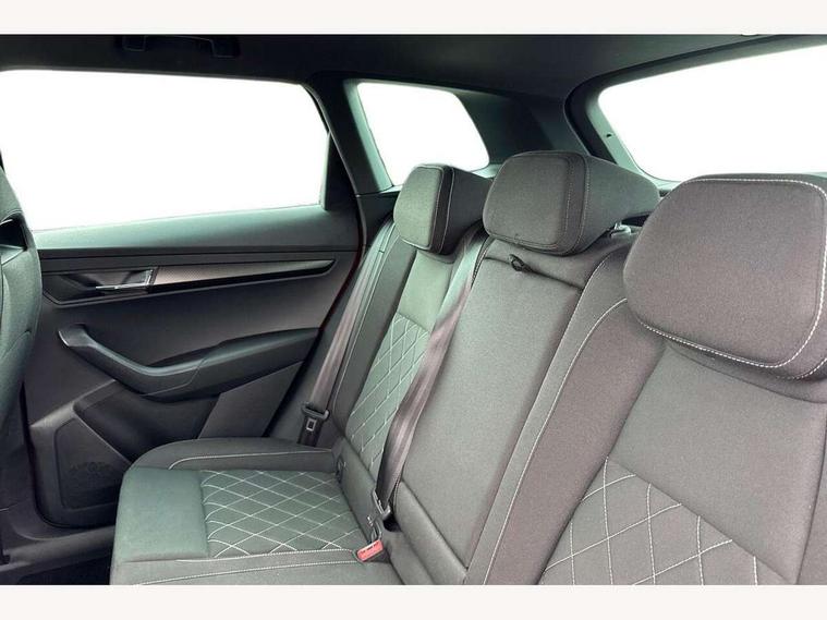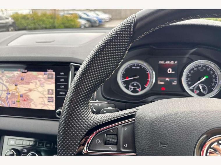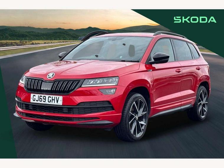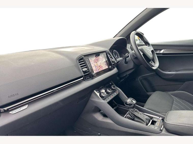 Drive mode selection with off road, Driver alert system, Driver fatigue sensor, Driver profile selection, Multifunction colour trip computer, Outside temperature gauge, Rear view camera, Service interval indicator, Start/stop system with regenerative braking, DAB radio with Bluetooth, SD card slot, USB connection, Acoustic glass, Aero front windscreen wipers with intermittent function, Automatic headlight control system, Black roof rails and door mirrors with radiator grille, Body colour door mirrors and handles, Chrome outside aluminium bar around the window, Electric front and rear windows with child proof lock, Electrically adjustable heated folding and auto dimming door mirrors with boarding spots, Front door steps with SportLine logo, Full LED headlights + adaptive front light system + LED daytime running lights and front cornering fog lights, Headlight washers, Heated rear windscreen, LED rear lights with high functionality, Light assistant (coming/leaving home/tunnel light), Panoramic sliding sunroof, Privacy glass, Protective door side sills in body colour, Rear diffuser, Safety reflectors on front doors, Sportline badge on front fender, Sportline decorative inserts with badging, Sports front and rear bumpers, Third brake light, 1.5 litre bottle holders in driver and front passenger door panels, 12V socket in boot, 12v socket in front centre armrest with storage compartment and rear air vents, 2 Folding hooks and nets in boot, 2 Front readings lights for driver and passenger, 3 rear height adjustable headrests, 4 foldable roof handles with rear coat hooks, 4 lashing points on luggage floor, Aluminium pedals, Backrest release, Black roof headlining, Cargo elements in boot, Chrome inner door handles, Driver and passenger seats height adjust, Dual zone climate control, Front seat and rear pockets, Height adjustable front three point seats belts with tensioners, Height/reach adjust steering wheel, Ice scraper, Illuminated and cooled glovebox, Illuminated luggage compartment, Isofix child seat preparation outer rear, Manual lumbar support for front seats, Net programme in boot, Pen holder, Pollen filter, Rear boot cover, Rear reading lights, Rear seats fixed folding and divided 60:40, Removable LED torch in the boot, Retractable parcel shelf attachable to tailgate, Safety vest holder, Storage box in upper central dashboard closed, Storage compartment below the passenger seat, Storage net on centre console passenger side, Sunvisors with illuminated vanity mirrors, Textile floor mats, Umbrella under passenger seat, Welcome animation with sportline logo, LED Interior lighting pack with Skoda welcome logo - Karoq, Airbags - Front side, head, knee and curtain, Automatic door unlocking in case of crash, Automatic fuel cut off in case of crash, Driver airbag, Electronic parking brake with auto hold function, Emergency rear braking signal, ESC including ABS, MSR, ASR, EDS, HBA, DSR, RBS, MKB and traction control, Front assist radar scanning of the space in front of the car with automatic braking, Hill hold control, Passenger airbag with switch-off function, Pedestrian monitor, Seatbelt reminder signalisation and pretensioner for all seats, Three point seatbelts rear, Two tone horn, Tyre pressure display, Tyre pressure monitor, Alarm with interior monitoring, back up horn and tilt sensor with safe function, Electronic engine immobiliser, Keyless entry and keyless start with safe system, Remote central locking with 2 remote folding keys, Chrome framed air vents, 19" Vega anthracite alloy wheels, Anti-theft wheel bolts protection, Storage on wheel cover,
