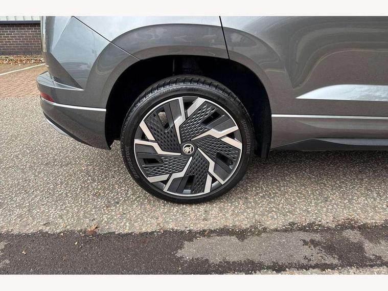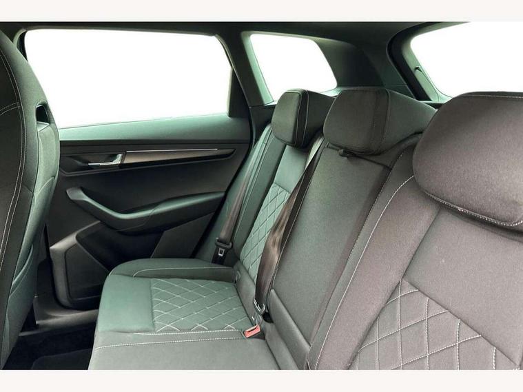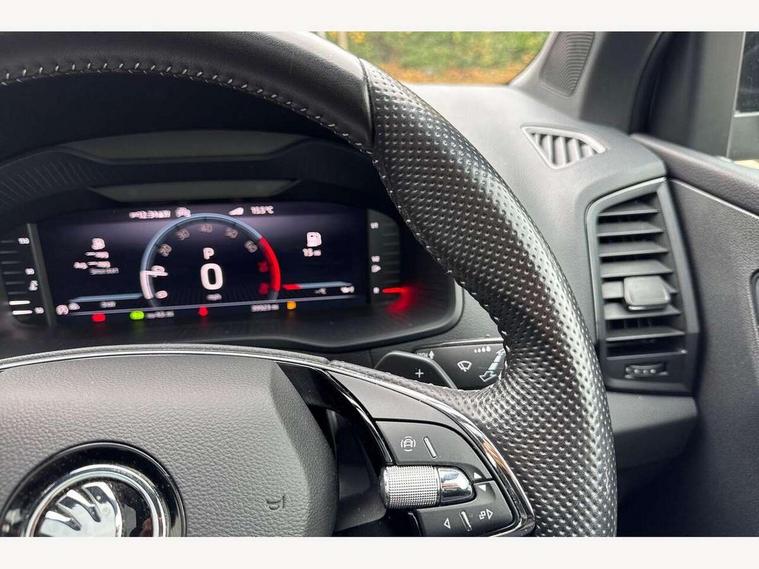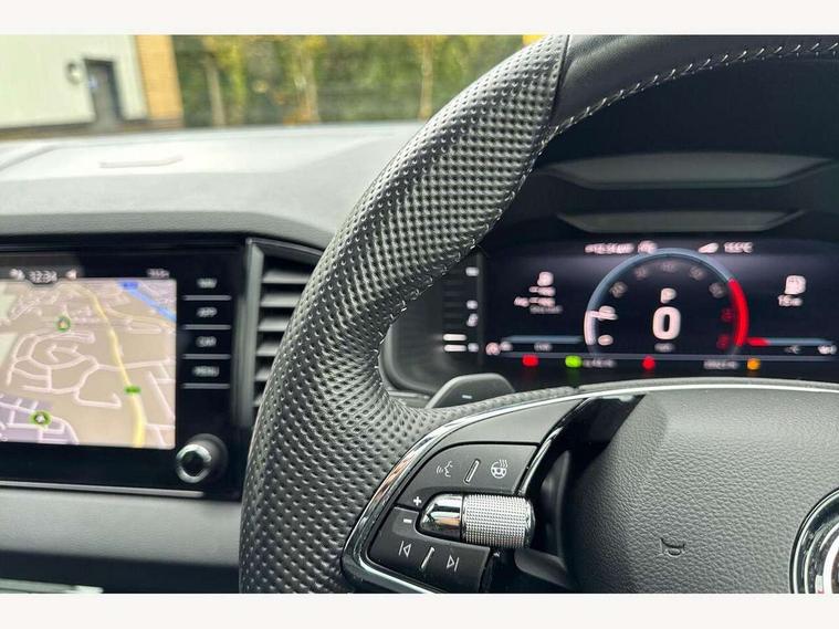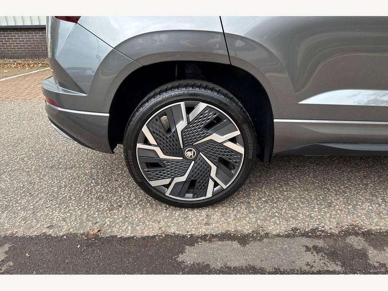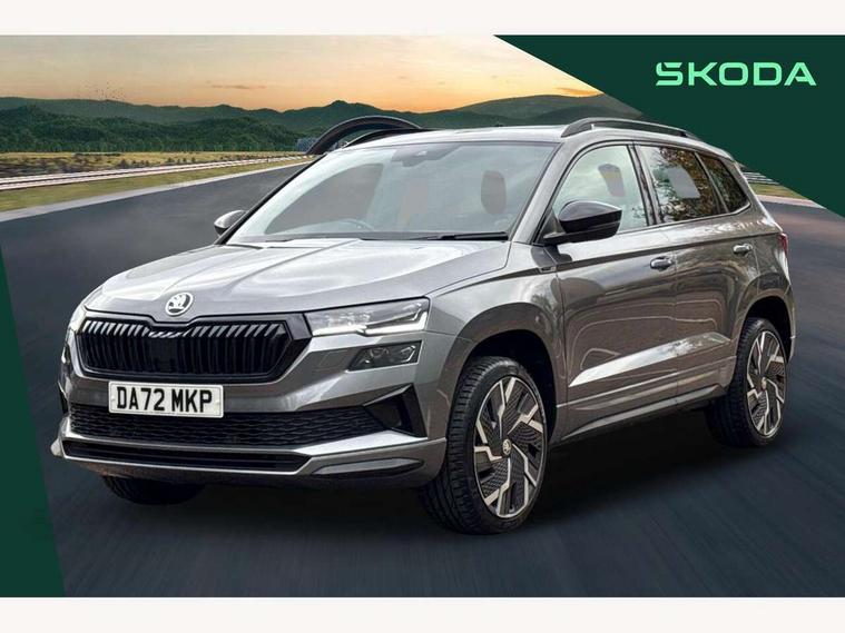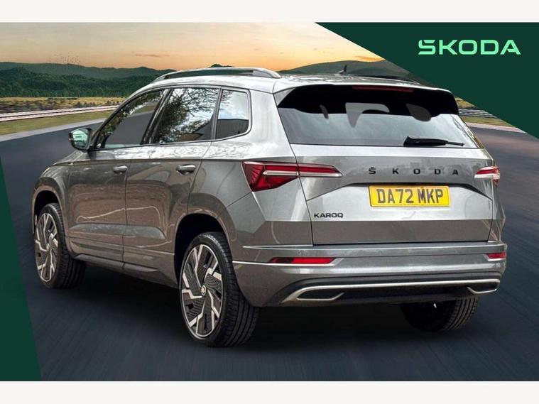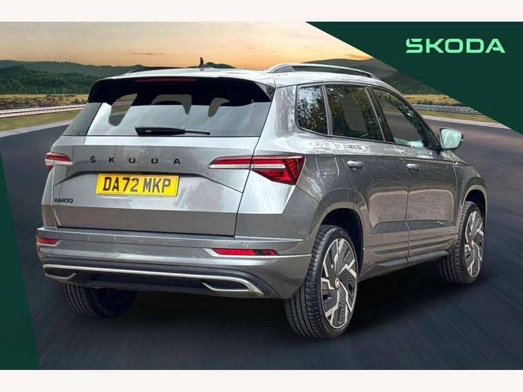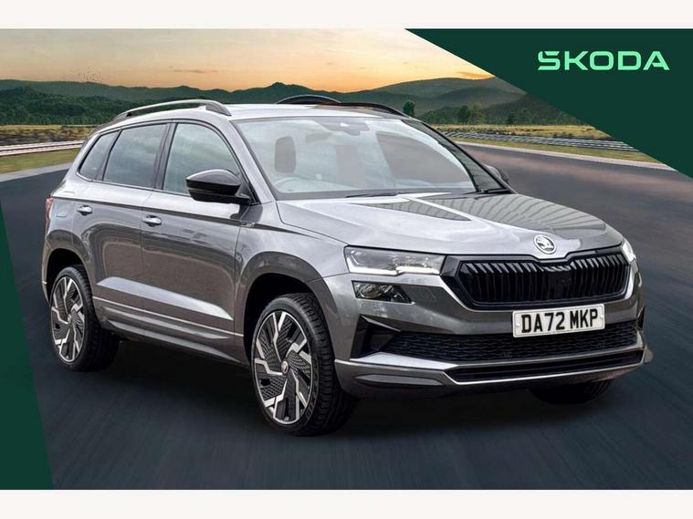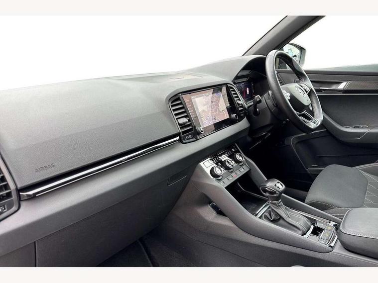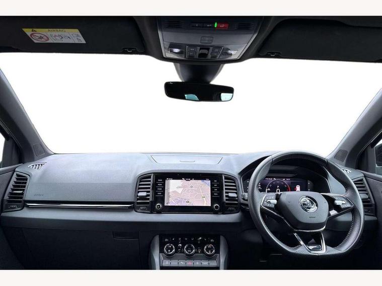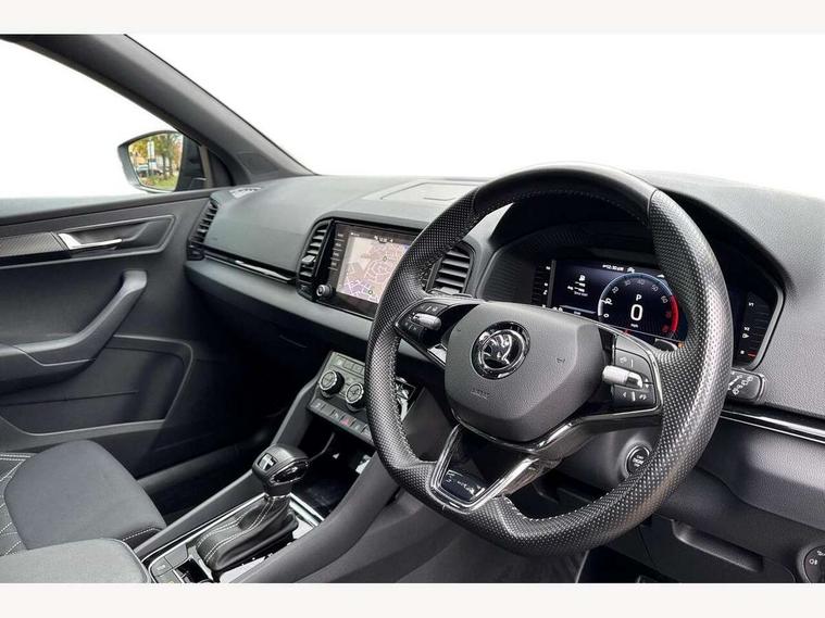 8" Digital display, Care connect, Driver fatigue sensor, Emergency services call system, Outside temperature gauge, Service interval indicator, SmartLink wireless for Apple and wired for Android, Start/stop system with regenerative braking, USB C Port x 2 in front centre console, Virtual pedal with electrically operated boot door, 8 Speakers, DAB radio with Bluetooth, USB connection, Acoustic glass, Aero front windscreen wipers with intermittent function, Auto dimming rear view mirror with light and rain sensors, Black door mirrors, Black electric window control buttons, Black radiator grille, Black roof rails, Body colour door handles, Dynamic headlight range control with cornering light function, Electric front and rear windows with child proof lock, Front door steps with SportLine logo, Heated rear windscreen, LED daytime running lights, LED rear lights with high functionality welcome effect and dynamic indicators, Light assistant (coming/leaving home/tunnel light), Panoramic sliding sunroof, Plastic scuff plates, Privacy glass, Protective door side sills in body colour, Rear diffuser, Rear side wing doors, Rear spoiler, Rear window wiper with washer system and intermittent control, Safety reflectors on front doors, Skoda lettering on tailgate in black, Sportline badge on front fender, Sportline decorative inserts with badging, Sports front and rear bumpers, 1.5 litre bottle holders in driver and front passenger door panels, 12V socket in boot, 12v socket in front centre armrest with storage compartment and rear air vents, 2 Folding hooks and nets in boot, 3 rear height adjustable headrests, 3 seat bench in 2nd row, 3 spoke leather sports multifunction steering wheel and silver stitching with gear shift paddles, 4 foldable roof handles with rear coat hooks, Black floor carpet, Black roof headlining, Chrome inner door handles, Double sided boot floor, Foldable hooks in the boot, Front head restraints, Height adjustable front three point seats belts with tensioners, Height/reach adjust steering wheel, Ice scraper, Illuminated glovebox, Illuminated luggage compartment, Isofix child seat preparation outer rear, Manual lumbar support for front seats, Pen holder, Pollen filter, Rear boot cover, Rear reading lights, Rear seats fixed folding and divided 60:40, Rubbish bin door, Safety vest holder, Single front passenger seat, Storage box in upper central dashboard closed, Sunvisors with illuminated vanity mirrors, Textile floor mats, Ticket holder, Titan black interior ceiling, Welcome animation with sportline logo, Light Pack - Karoq, Parking pack - Karoq, Automatic door unlocking in case of crash, Automatic fuel cut off in case of crash, Child locks on rear doors, Driver airbag, Electronic parking brake with auto hold function, Emergency rear braking signal, ESC including ABS, MSR, ASR, EDS, HBA, DSR, RBS, MKB and traction control, Front side airbags, Hill hold control, Knee airbags, Passenger airbag with switch-off function, Pedestrian monitor, Seatbelt reminder signalisation and pretensioner for all seats, Three point seatbelts rear, Two tone horn, Tyre pressure display, Tyre pressure monitor, Alarm with interior monitoring, back up horn and tilt sensor with safe function, Electronic engine immobiliser, Keyless entry and start/stop, Remote central locking with 2 remote folding keys, Black air vent surround, Black centre console, Satin black dashboard, Satin black door trim, 19" Sagitarius anthracite alloy wheels with matt black aero inserts, Anti-theft wheel bolts protection, Matt black aero hub caps, Storage on wheel cover, Tool kit,