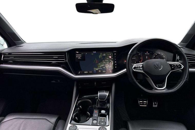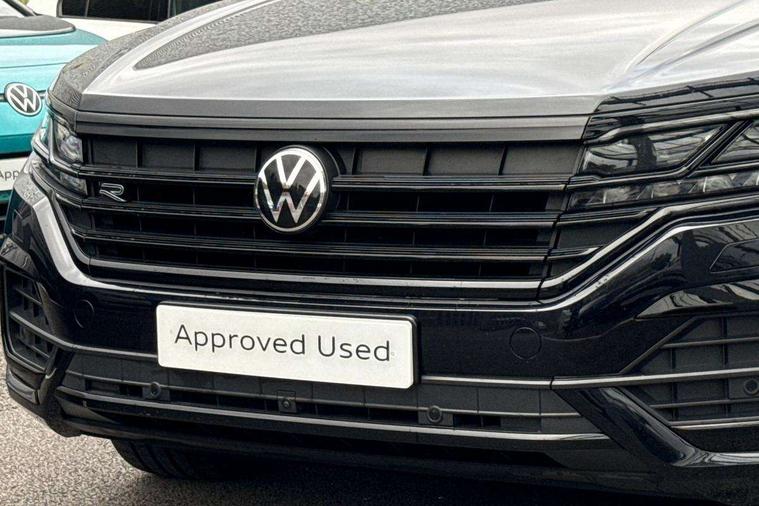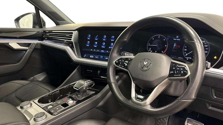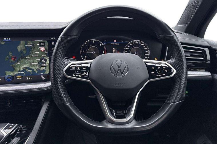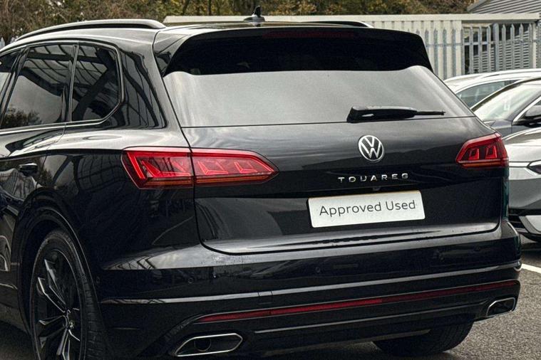 2D/3D map view, ACC - Adaptive cruise control with front assist, forward collision warning, distance monitoring, city emergency brake and speed limiter, Apple car play/Android Auto, Audible and visual fatigue detection system, Bluetooth hands free telephone connection, Car information display, Drive select with Damper control, Driver alert system, Dynamic road sign display camera controlled system with visual warning for traffic and road signs, eCall emergency system, Fully electric tailgate + keyless entry and start, Instrument cluster, MirrorLink, Multifunction camera with lane assist, Multifunction computer premium with 7" colour display, One touch indicators with repeat function, Service interval indicator, Speed sensitive power steering, Start/stop system with regenerative braking, Tailgate power latch, Think blue trainer driver tips and journey analysis, Traffic sign recognition, Voice control system, Wireless Smartphone charger, Torsen limited slip differential, DAB Digital radio, Dynamic navigation based on TMC+, Gesture control for infotainment system, Multi device interface (MDI) with illuminated USB-C connection, Music playback - MP3, WMA and AAC files, SD card slot, Simultaneous pairing of 2 compatible mobile devices, SMS functionality - read, compose and send SMS messages using touch-screen display, Title and cover art display, Volkswagen media control, Adaptive low beam for urban and motorway use, Auto dimming rear view mirror, Automatic coming/leaving home lighting function, Automatic headlights, Black anodised roof rails, Black door mirrors, Black rear diffuser, Black side window surrounds, Black upper and lower grille louvres extending into headlights and radiator grille, Body colour door handles, Body coloured wheel arches, C signature gloss black front air intake, Chromed tailpipe on the left and right integrated in the bumper with trapezoid design, Dusk sensor, Dynamic headlight range control, Electric front tilt/slide panoramic sunroof and fixed rear sunroof, Electrically power adjustable, heated, folding, auto dimming, front passenger exterior door mirror lowering function, Front and rear electric windows, Galvanised body, Gloss black finish B pillar, Gloss black rear diffuser, Headlight washers, Heat insulating darkened glass in side and rear windows, Heated windscreen washer jets, IQ.Light-LED matrix headlight, daytime running light with dynamic cornering light and indicator, LED rear fog light, LED rear number plate lights, Plastic scuff plates in door apertures, Poor weather light, Puddle lights, Rain sensor, Rear wiper, 12V socket in front and rear centre console and boot, 2 Coat hooks on B pillar, 3 rear head restraints, 3 spoke sport heated leather multi-function sports steering wheel with gear shift paddles - generation 2, 4 way adjustable front head restraints, 4 way electric lumbar support for driver and front passenger, 4 zone climate control, 40:20:40 split folding slide/recline rear seat, B pillar vents, Black lower edge of door extending sills, Branded points of interest, Double sun visor for drivier and passenger with LED illuminated vanity mirrors, Electric luggage compartment cover, Folding rear centre armrest with 2 cupholders, Front + rear carpet mats, Front centre armrest with storage box, Gear shift indicator, Height/reach adjust steering wheel, Illuminated air conditioned glovebox, Isofix preparation for 2 rear child seats, Jack and tool kit, Leather trimmed gear knob with gloss black inlay/aluminum trim, Leatherette door trim, LED luggage compartment lighting, Load through provision, Luggage compartment with load lashing rings, Plastic loading edge protection, Rear seat remote release levers, Soul black headlining, Stainless steel pedals, Innovision cockpit pack - Touareg, 3 point front seatbelts with pre-tensioners, ABS, Active bonnet, Automatic post collision braking system, Curtain airbags, Driver/Front Passenger airbags, EBD + Brake Assist, EDL, Electronic parking brake with auto hold, ESC with ASR, Front seat side impact airbags, Hill descent control, Hill start assist, Passenger airbag deactivate switch, Seatbelt warning lamp and buzzer, Three 3 point rear seatbelts, Two tone horn, Volkswagen roadside assistance, Warning triangle and first aid kit, Alarm with interior monitoring in cab, backup horn and towing protection, Child security locks for front and rear doors, Electronic engine immobiliser, Remote central locking, Black decorative trims on the side windows, High gloss black centre console,