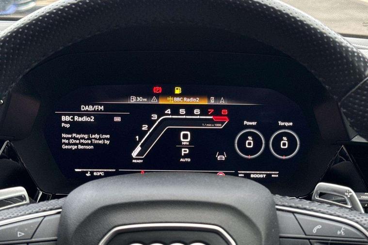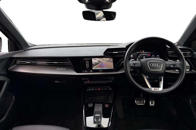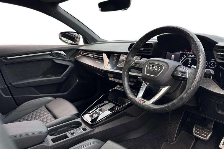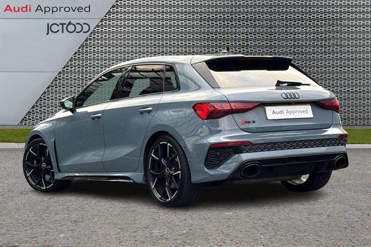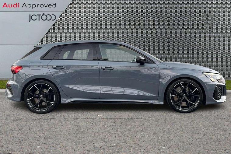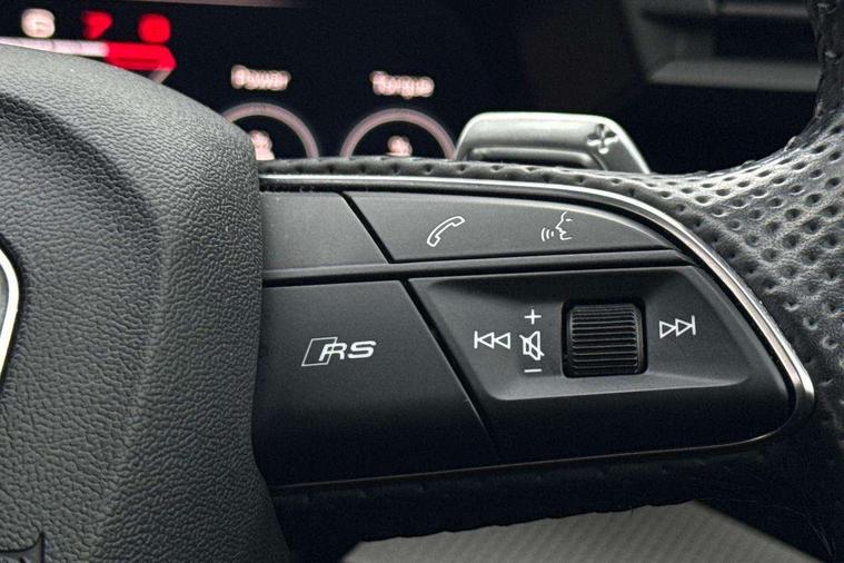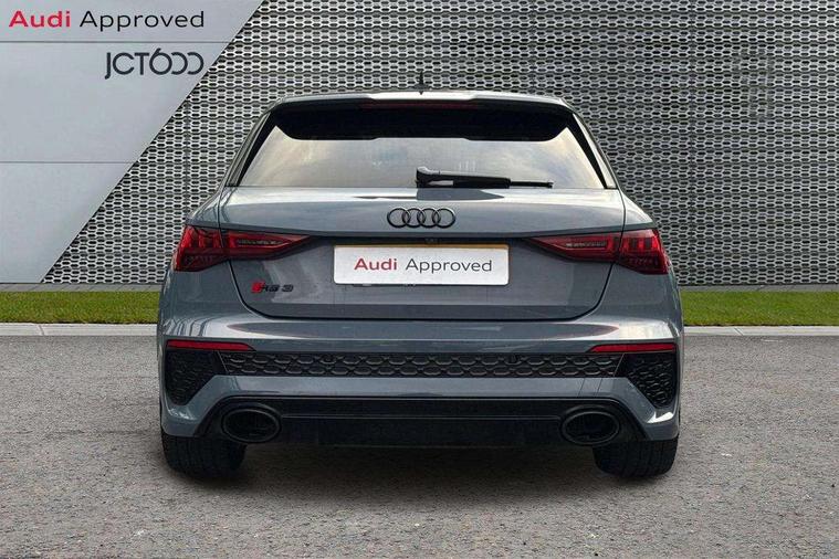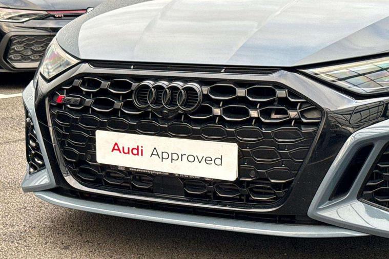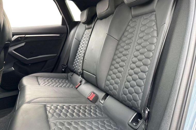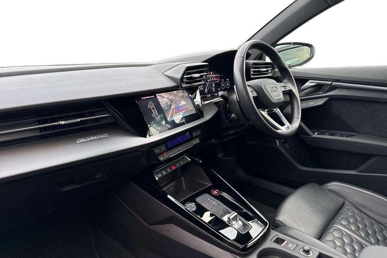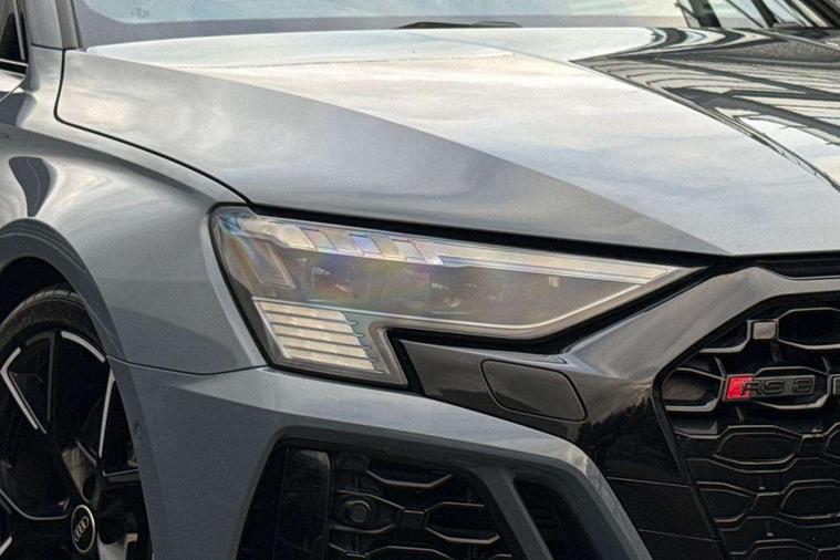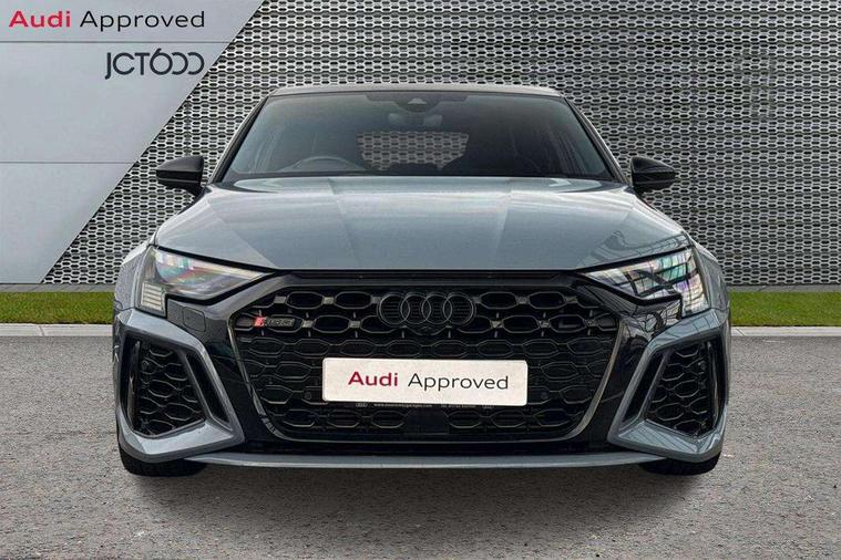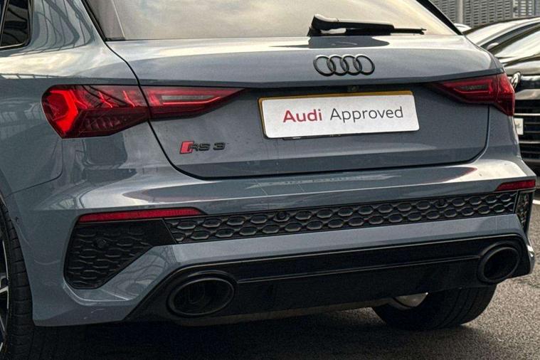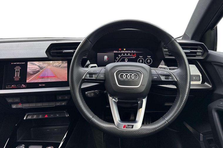 Adaptive cruise assist, Adaptive cruise control, Audi connect emergency call and service, Audi smartphone interface, Audi virtual cockpit with RS specific display 12.3" full colour digital instrument cluster, Automatic start/stop system with recuperation, Bluetooth interface, Camera based traffic sign recognition, Collision avoidance assistant, Head up Display, Lane departure warning system, Legal emergency call, Parking assist with parking system plus, Power operated tailgate - Luggage compartment lid opens electrically, Progressive power assisted steering, Reversing camera, Quattro permanent four wheel drive, Rear suspension, DAB Digital radio, 3rd brake light, Acoustic glass windscreen, Audi beam uses LEDs to project the Audi sport logo onto the ground as you exit your RS 3, Audi matrix LED headlights, LED rear lights, dynamic front and rear indicators and headlight cleaning system, Auto dimming rear view mirror, Black side skirts, Body colour roof, Carbon exterior door mirror, Carbon fibre engine cover, Electric adj heated/folding + auto dimming exterior mirrors with memory + LED indicator + auto kerb side function for passenger side exterior mirror, Front spoiler in high gloss black, Heat insulating glass windscreen, Light and rain sensors, Panoramic glass sunroof, Privacy glass - dark tinted rear and rear side windows from B-pillar backwards, Rear window wiper and washer system, RS exterior features in gloss black, RS sports exhaust system, 3 spoke leather multifunction steering wheel with gear shift paddles, 4 way lumbar support for front seats, 40/20/40 split folding rear seat bench, Black cloth headlining, Dual zone electronic climate control, Electrically adjustable front seats with memory function for driver's side, Front and rear headrests, Front centre armrest, Front sports seats RS embossed logo, Front/rear floor mats, Heated front seats, Honeycomb stitching and RS embossing, Illuminated door sill trims inlays in aluminium with RS 3 logo, RS emblems, Stainless steel pedals and front footrest in black, Tool kit, Aluminium interior elements pack - RS3, Ambient lighting pack - RS3, Comfort and sound pack - RS3, Driver assistance pack with 3 spoke leather multi function steering wheel - RS3, MMI navigation plus with MMI touch - RS3, RS bodystyling - RS3, Storage Pack - RS3, 3x3 point rear seat belts, ABS/EBD, ASR, Audi pre sense front, Driver/Front Passenger airbags, EDL, ESC - Electronic Stability Control + traction control, Front passenger airbag deactivation, Front side airbags with head airbags and interaction airbag, Hill hold assist, Seat belt reminder with passenger presence detection in rear, Tyre pressure loss indicator, Warning triangle and first aid kit, Anti theft alarm, Anti-theft wheel bolts, Electronically operated child lock, Remote control central locking, Full decorative carbon trim, 19" 5 Y spoke black with graphic print alloy wheels, Tyre repair kit,