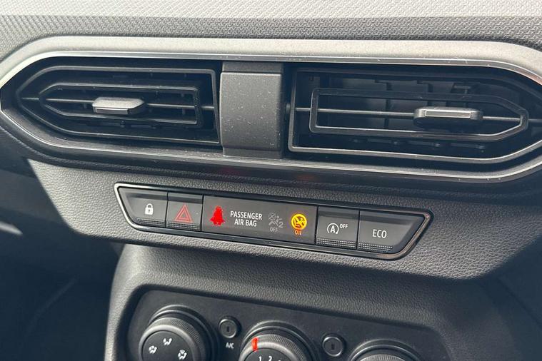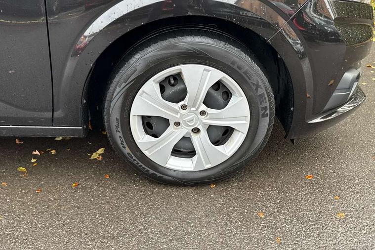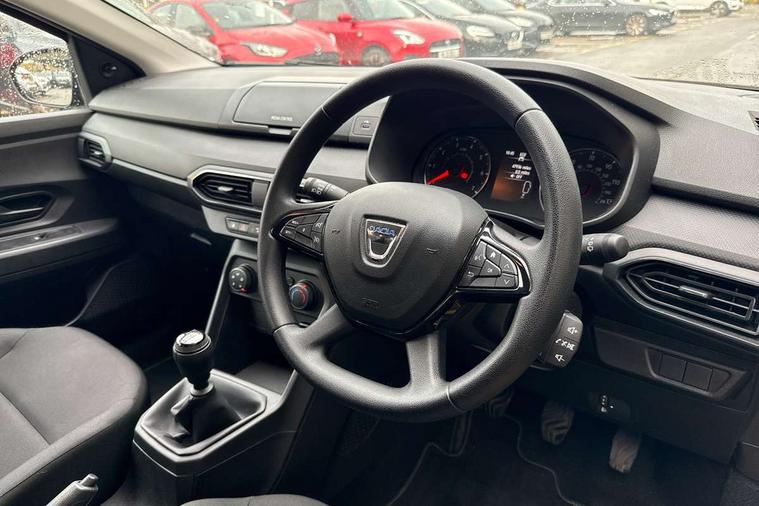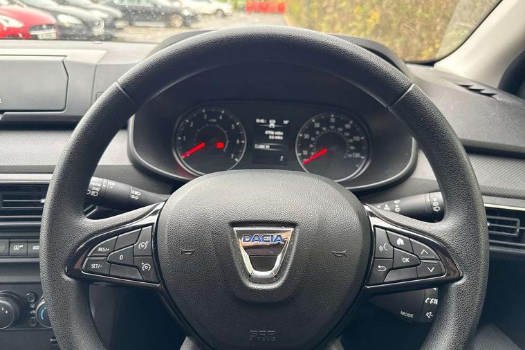 3.5" TFT instrument panel with on-board computer, Cruise control with speed limiter, eCall emergency call system, Eco mode, Electric power assisted steering, Rev counter, Stop/start system, Media Control - DAB Radio with display on instrument panel, Bluetooth, 2 Speakers, USB connection for data transfer and charging, USB socket, 3 speed windscreen wipers, Auto lighting, Black door handles, Black door mirrors, Black radiator grille, Body coloured bumpers, Front electric windows, Heated rear window, High level third brake light, LED automatic daytime running lights, LED Y-shape Dacia signature lighting, Manually adjustable door mirrors, Rear manual windows, Rear wash/wipe, Tinted windows, 1/3 to 2/3 split folding rear seats, 12 volt front socket, 3 height adjustable rear headrests, Black interior door handles, Fabric upholstery, Fixed smartphone holder on dashboard, Front armrest, Gear shift indicator, Height adjustable driver seat, Height adjustable front headrests, Height/depth adjustable steering wheel, Isofix points for child seats in both outer rear seats, Manual air conditioning, Satin chrome air vents, Steering wheel controls, 3x3 point rear seatbelts, ABS and Emergency brake assist, Automatic emergency braking system, Child locks on rear doors, Door open warning, Driver airbag, ESC (Electronic Stability Control), ESP (Electronic Stability Program) + Hill Start Assist, Front curtain airbags, Front seatbelt pretensioners, Front side airbags, Height adjustable front seatbelts, Passenger airbag, Seatbelt reminder for driver and front passenger, Tyre pressure monitor, Automatic central locking, Immobiliser, Remote central locking, 15" Steel wheels with full wheel cap,