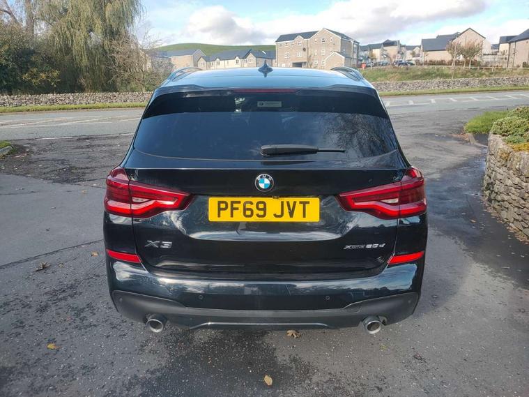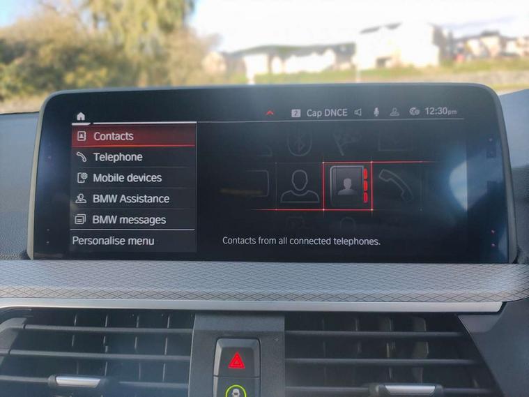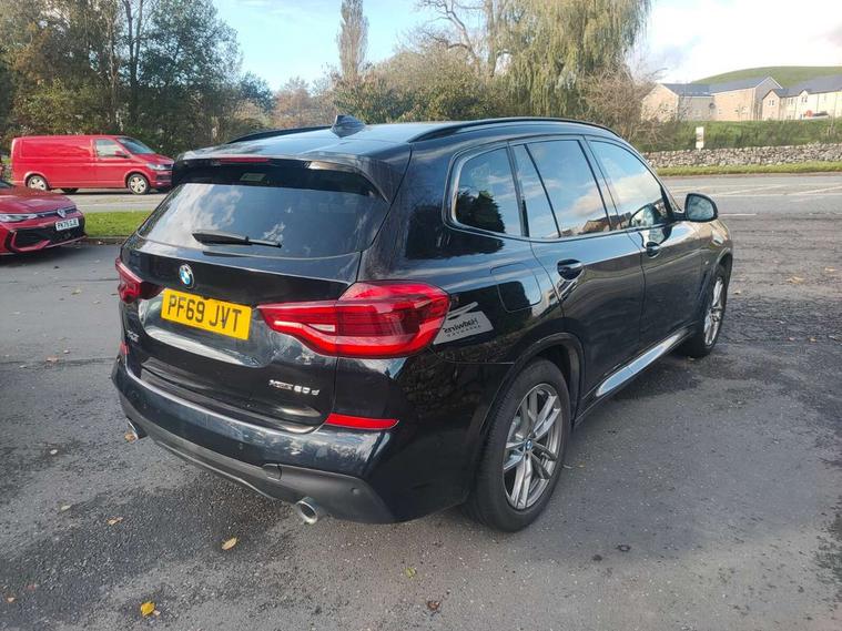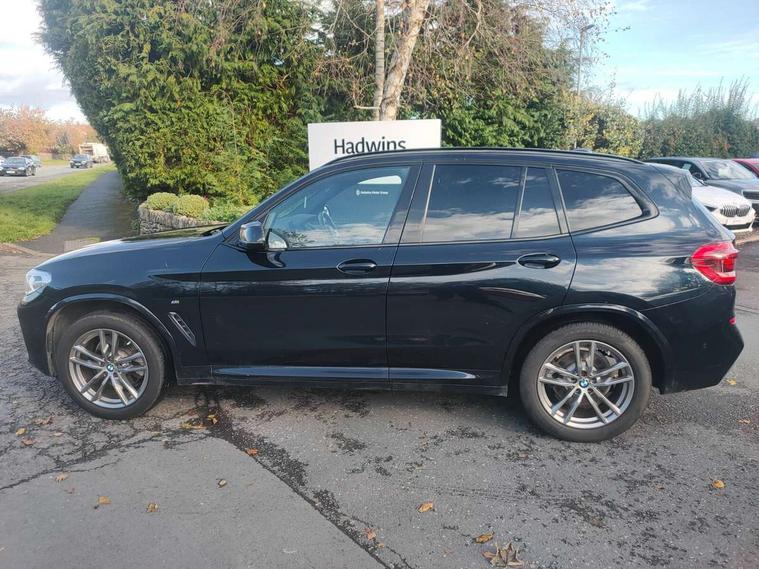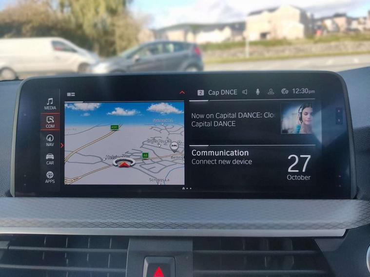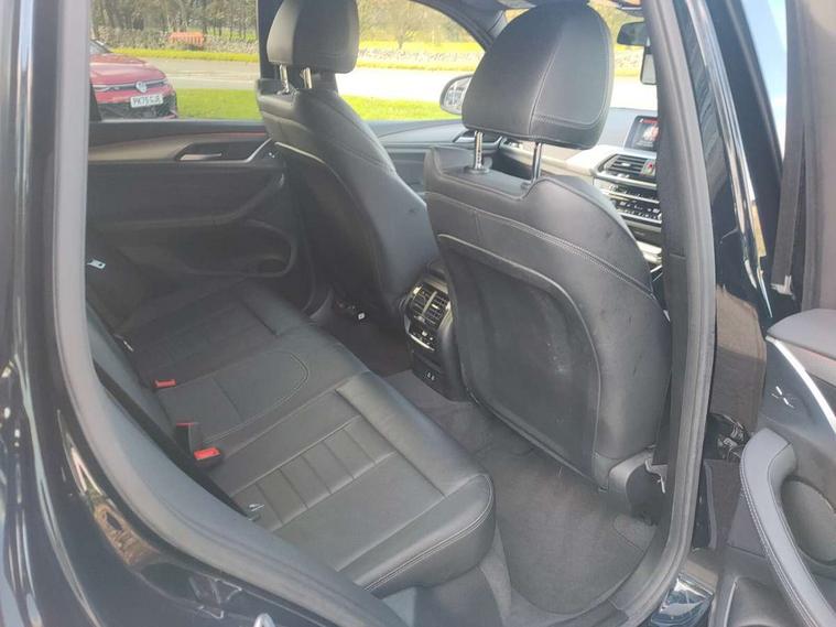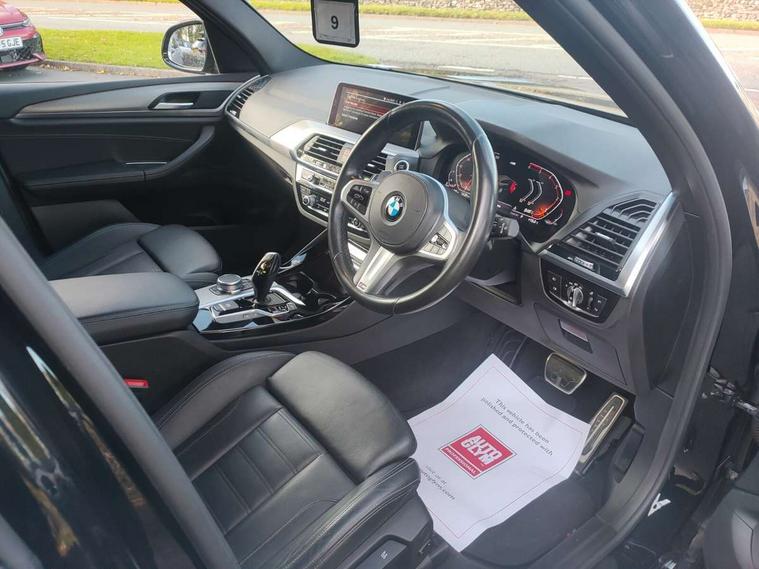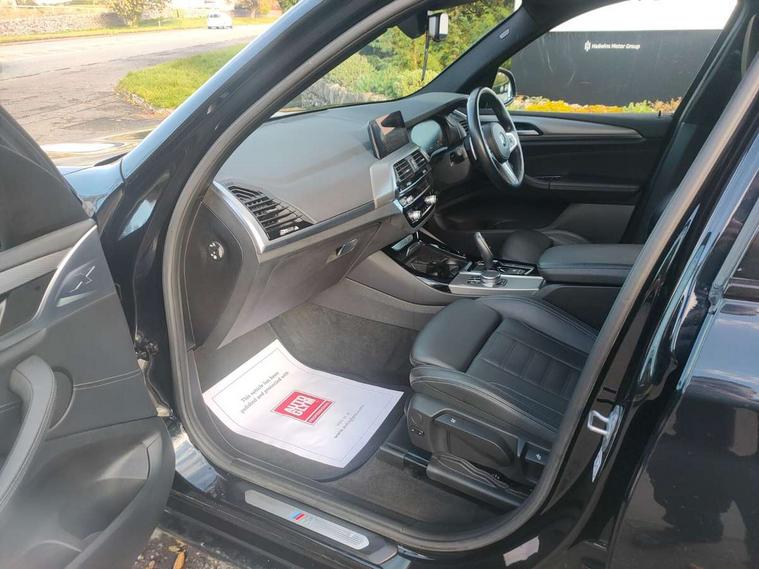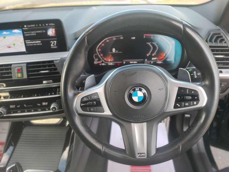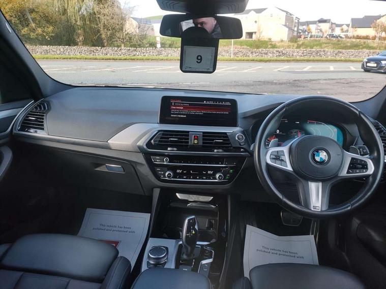 Active Guard incl speed limiting and lane departure functions with auto steering, and front collision warning with brake intervention, Attentiveness assist, Automatic tailgate operation, BMW Live Cockpit Professional sat nav system including 10.25" high resolution display and Intelligent Voice Assistant, BMW Online services, BMW Teleservices, Brake pad wear indicator in front and rear, Check Control warning system for monitoring of lights and door/luggage compartment open warning, Control display - 6.5" colour display screen, Electric Power Steering (EPS) with Servotronic, Front/rear Parking distance control, iDrive Controller with 8 favourite buttons, Lights on warning by audio warning signal when ignition is switched off, Navigation system - BMW Professional multimedia with Hard disc drive (HDD) and 10.25" touch display, Oil sensor for level and grade, warning by check control system, On board computer - average speed+fuel consumption, service interval, clock/date, odometer/trip meter, outside temperature display and ice warning, Optimum shift indicator, Personal Profile - automatic lock when driving away selectable, Real time traffic information, Semi digital instrument cluster, Stop/start system, Automatic transmission with gearshift paddles, Diesel particulate filter, Incorrect fuelling protection, Larger capacity fuel tank, Multi-link rear suspension, Performance Control, Auxiliary socket for external MP3 player, BMW professional radio/CD/MP3, DAB Digital radio, Acoustic glazing, Black finish on B pillars, Body colour door handles, Body colour electric adjust heated aspherical door mirrors, Body colour roof mouldings, Body coloured bumpers, Chrome kidney grille with high gloss black vertical slats, Direction indicator, side repeaters, integrated in exterior mirrors, Dual chrome exhaust, Dynamic brake lights, Exterior mirrors - electrically folding with anti-dazzle, Fingertip control / anti-trap function on electric window, Follow me home headlights, Front and rear bumper system with replaceable deformation elements, Front and rear electric windows, Green tinted heat insulating glass, Heated windscreen washer jets, Height adjustable headlamps, High gloss black door sill finishers, High gloss black shadow line roof rails, High gloss shadowline exterior trim in decorative moulding side frame/recess cover/guide rail/B, C pillars/mirror frame and triangle with mirror base, High level 3rd brake light incorporating LED Technology, Interior rear view electrochromatic mirror with automatic anti dazzle function, LED front fog lights, LED tail lights, Lightweight engineering, M aerodynamic bodystyling, Model designation, Rain sensor including auto headlights activation, Rear wiper, Shark fin antenna, Visible VIN plate, Welcome lighting, Windscreen wipers with adjustable interval, 12V socket in centre console and luggage area, 3 rear headrests, 3 zone automatic air conditioning, 4 lashing points to secure luggage, Ambient lighting, Anthracite headlining, Anthracite Velour floor mats, Driver/passenger sunvisors with ticket holders + illuminated vanity mirrors, Foldable boot floor with storage compartment, Four grab handles integrated in roof lining, Front and rear bottle holders integrated into door trim storage compartments, Front and rear side armrests integrated into door trim, Front centre armrest with storage compartment, Front footwell lights, Front sports seats, Front/rear courtesy lights with soft on/off dimming, Front/rear reading lights, Height adjustable front/rear head restraints, Isofix rear child seat preparation, Leather gear knob, Luggage area underfloor compartment, Luggage compartment lighting, M Sport multifunction leather steering wheel, Parcel shelf removeable and storable under boot floor, Reach and rake adjustable steering column, Rear centre armrest with 2 cupholders, Rear seat centre armrest with two cupholders, Removable / retractable luggage cover, Slope adjustable rear seats, Storage compartment in rear centre console and front/rear door trims, Through loading system with 40/20/40 split folding rear seat, Toolkit located in luggage compartment, Two front cupholders with removable oddments tray/lid, Vernasca leather upholstery, Connected pack professional - X3, ABS/EBD, ADB - Automatic Differential Brake, Automatic Stability Control (ASC), Battery safety cut-off, BMW emergency call, Brake assist, Brake assist function, Brake drying, Brake energy regeneration, Braking pre-tensioning, Child locks on rear doors, Cornering brake control (CBC), Crash Sensor - activation of central locking release, hazard warning light and interior lighting, Deactivation of fuel pump in the event of a crash, Driver and front passenger front and side airbags with passenger deactivation and ITS front and rear head airbags, DSC+, Dynamic brake control, Dynamic Traction Control - DTC, Electromechanical parking brake, Front seat belts warning, Hill descent control, Hill start assist, Seatbelt security check for front seats, Side impact protection, Three point seatbelts to all seats with front and outer rear pyrotechnic belt tensioners and seat belt force limiters, Two tone horn, Tyre pressure monitoring system, Ventilated front and rear disc brakes, Warning triangle and first aid kit, Central locking switch for all doors, fuel filler cap and luggage compartment, Electronic engine immobiliser, Locking wheel nuts, Remote control including two integrated key - one button for open/close all lockable content, windows and separate button for open luggage compartment, Remote control Thatcham category 1 alarm, Start/stop button with Comfort Go keyless engine start and auto Start/stop deactivation button, Low rolling resistance tyres,