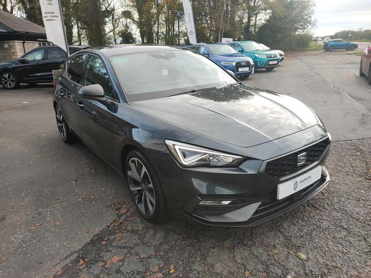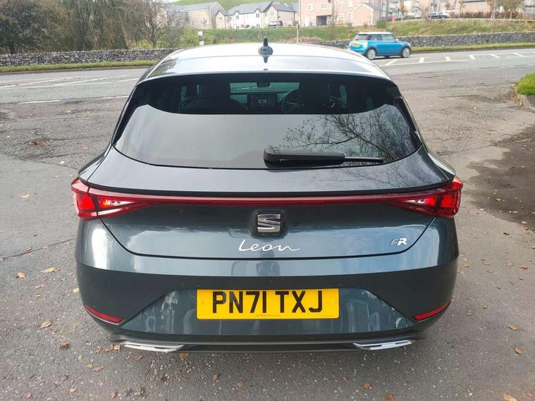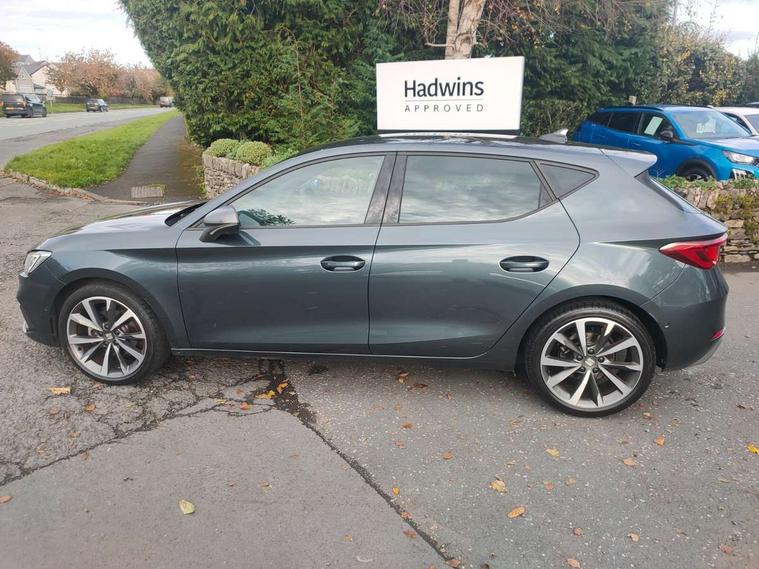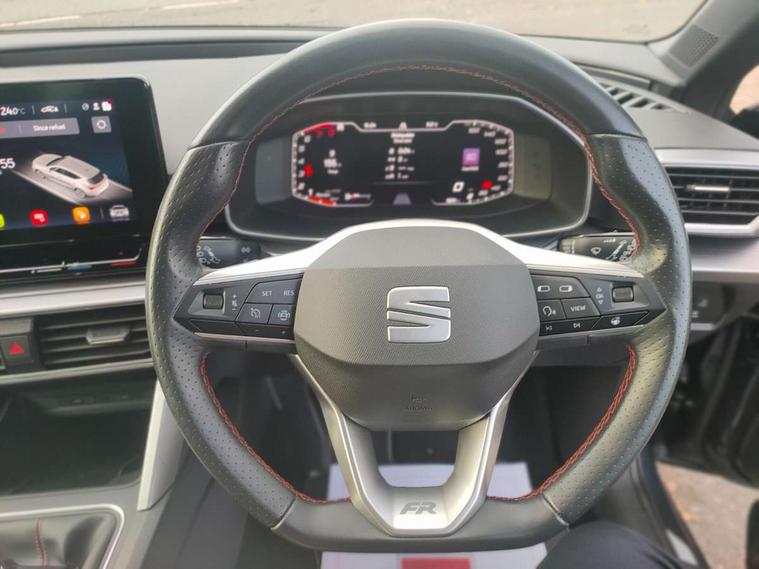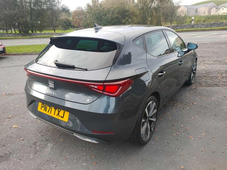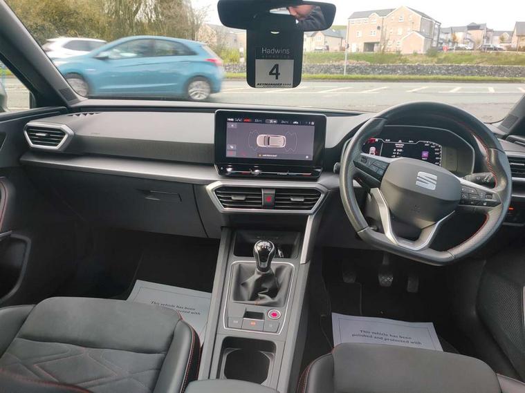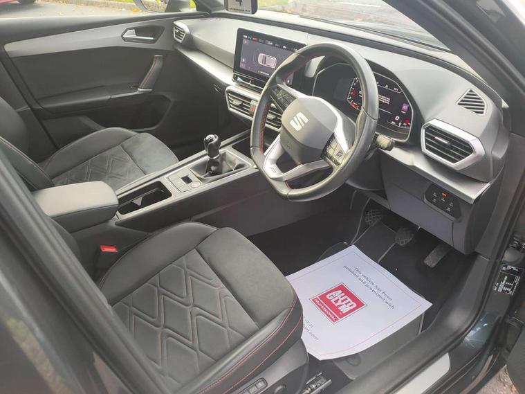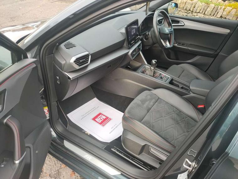Digital cockpit, Four x USB Type C ports, Front assist with forward collision warning braking reaction to vehicles, pedestrians and cyclists, Full link smartphone integration with Mirror Link, wireless Apple CarPlay and wired Google Android Auto, Lane assist, Lockable tailgate, Park assist (inc front/rear parking sensors), Power assisted speed sensitive electro-mechanical steering, RPM, trip computer, outside temp gauge, instrument light brightness, low fuel warning light, lights on reminder, gearshift indicator, SEAT drive profile with 4 modes (Eco/Normal/Sport/Individual), throttle response, Service interval indicator, Start/stop system with regenerative braking, Sports suspension, XDS electronic differential lock and dynamic traction support, 7 speakers, Auxiliary input socket, Auto dimming rear view mirror, Body colour door handles, Body coloured bumpers, Dark tinted rear windows, Door mirror LED indicator lights, Electric adjustable/heated/folding door mirrors with memory, Electric front/rear windows, FR sports bumper, Illuminated front door sill, LED front fog lamps with cornering function, LED headlights and tail lights with dynamic turn signals, welcome light silhouette from exterior mirrors and dynamic headlight range control, LED rear fog lamp, Rain sensing wipers, Rear wash/wipe, Separate daytime running light with automatic headlight control and coming home feature, 12v power point in centre console, 60/40 split rear bench seat with armrest, Ambient lighting with glovebox, footwell and single monocolour, Black headlining, Dust/pollen filter, Electric driver lumbar support + passenger manual lumbar support, Folding boot cover, Front and rear height adjustable headrests, Front and rear reading lights X 4, Front centre armrest, Front seatback storage pockets, Heated front seats, Heated leather steering wheel with leather gearstick, Height/reach adjust steering wheel, ISOFIX points in outer rear seats with top tether anchorage points, Luggage tie-down hooks, Microsuede cloth upholstery, Power driver seat with memory and manual height adjustable passenger seat, Sunvisors with covered illuminated mirror, Three zone climate control, Wraparound lighting, Media system plus with navigation - Leon, 3 point seatbelts on all rear seats, ABS, Brake control system - ESC and brake booster, Child proof door locks, Driver and front passenger airbags with front passenger airbag de-activation, front side and curtain airbags, Electronic parking brake, Extended safety system - seat belt tensioner, window closure and hazard lights, Hill hold control, Rear disc brakes, Seat belt reminder for front and rear seats, Tiredness recognition system, driver alert system, Tyre pressure monitoring system, Anti theft alarm system with interior monitoring in cab, backup horn and towing protection, KESSY Go (Keyless start), Locking wheel bolts, Wireless phone charging, Chrome interior detailing, 18" Performance machined alloy wheels with 92Y tyres, Tool kit,
