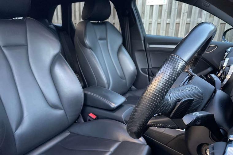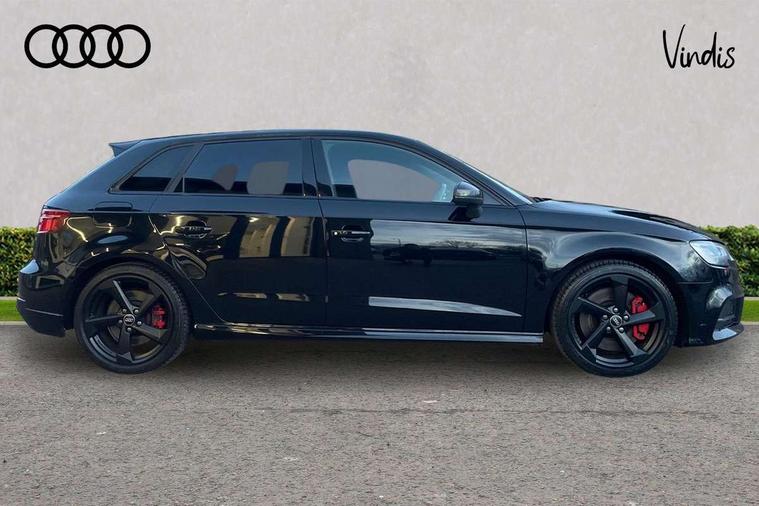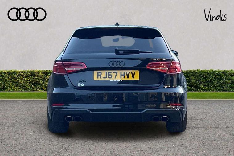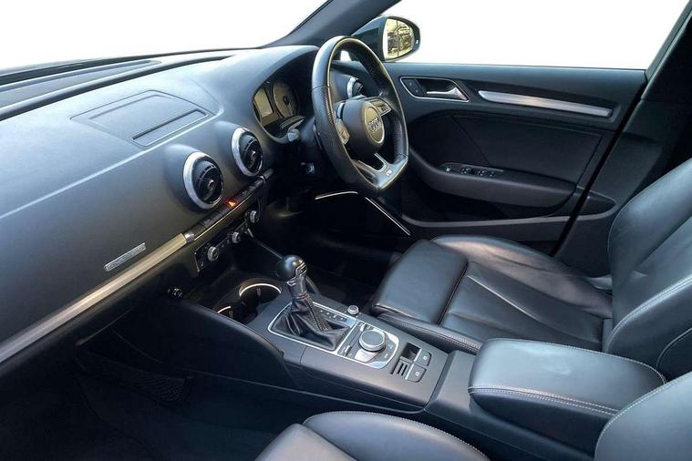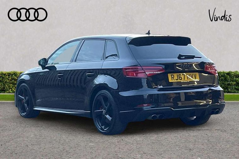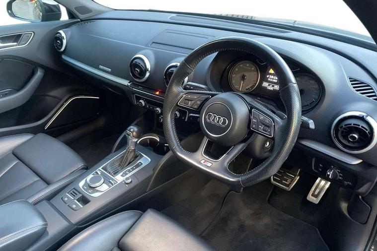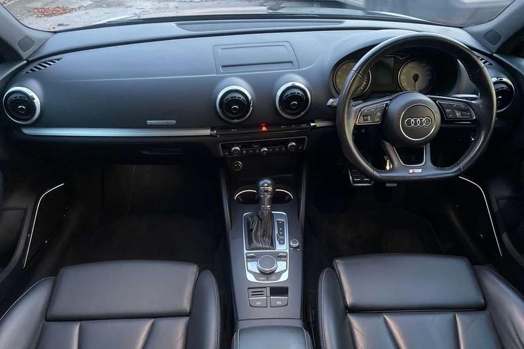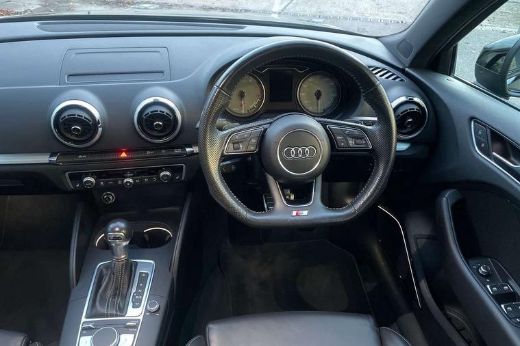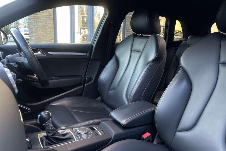 Audi connect, Audi drive select, Audi smartphone interface, Colour driver's information system display, HDD satellite navigation system radio single CD/DVD player MMI control system, Mobile telephone preparation - bluetooth interface, Progressive power assisted steering, Service interval indicator, Speed limit display, Voice control system, S sports suspension, 2 USB ports, Audi music interface, Auxiliary input socket, Bang + Olufsen advanced sound system, CD player, DAB Digital radio, MMI radio plus with 7" colour MMI screen and MMI controller, Auto dimming rear view mirror with light and rain sensors, Black door mirrors, Black window surrounds, Body colour bumpers with black insert, Body colour roof spoiler, Electric front windows, Electric operated/heated door mirrors, Electric rear windows, Headlight washers, Heated windscreen washer jets, LED daytime running lights, Matt black radiator grille, Platinum grey radiator grille with double chrome bars, Privacy glass, Rear wiper, S body styling, Twin oval chrome trimmed exhaust tailpipes, 3 adjustable rear headrests, 3 spoke flat bottomed multi-function leather steering wheel, 4 lashing points to secure luggage, Adjustable front armrest, Dual zone electronic climate control, Front and rear interior lights with delay, Front passenger seat isofix location point, Front/rear floor mats, Heated front seats, Height/depth adjustable steering column, Illuminated glovebox, ISOFIX child seat preparation+airbag deactivation, Jack and tool kit, Rock grey headlining, Stainless steel pedals, Steering wheel gearshift paddles, Storage compartment in centre console, Storage compartment under front seats, Storage compartments in doors, Black styling pack - A3/S3, LED interior light pack - A3/RS3, Non smoking pack - A3, Storage and luggage pack - A3/RS3, 3 point seatbelts on all seats, ABS/EBD, Active bonnet, Active front headrests, ASR, Curtain airbags, Driver and passenger side airbags, Driver/Front Passenger airbags, Drivers knee airbag, EDL, Electromechanical parking brake, ESC - Electronic Stability Control + traction control, Front passenger airbag deactivation, Hill hold assist, Manual rear child locks, Multi-Collision braking, Seatbelt warning, Tyre pressure warning, Warning triangle and first aid kit, Anti theft alarm, Anti-theft wheel bolts, Remote control central locking, Thatcham category 1 alarm + immobiliser, Aluminium air vent surrounds, Aluminium trim elements, Matt brushed aluminium inlays, Space saver spare wheel,