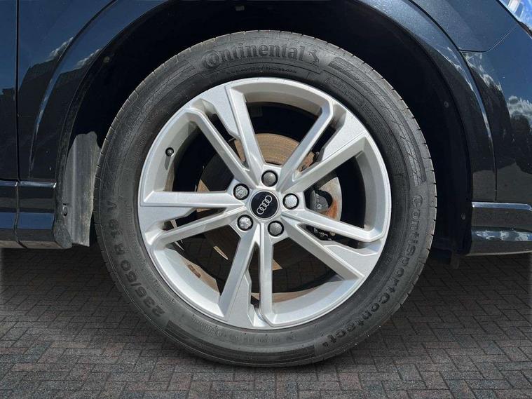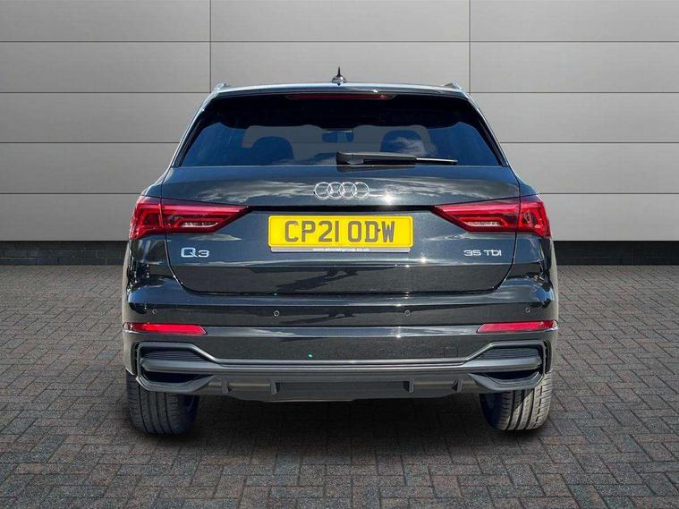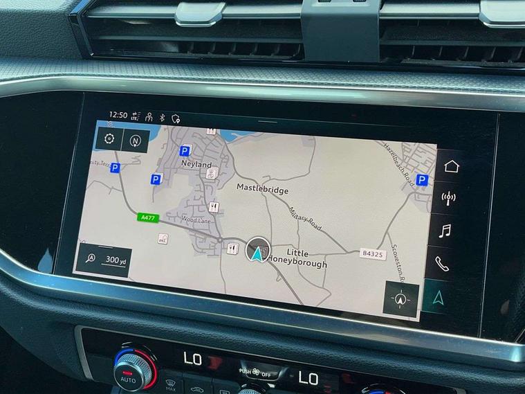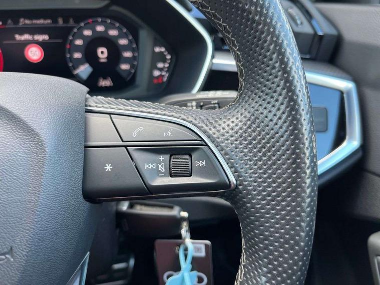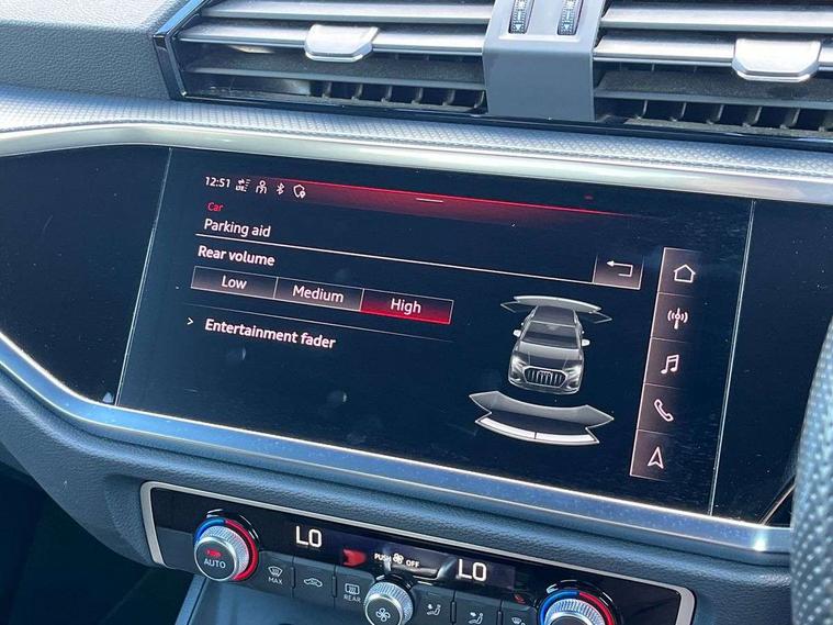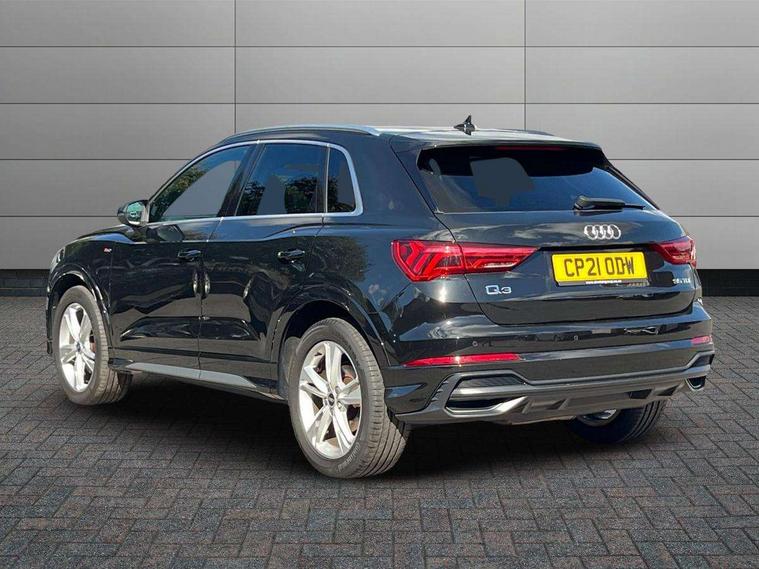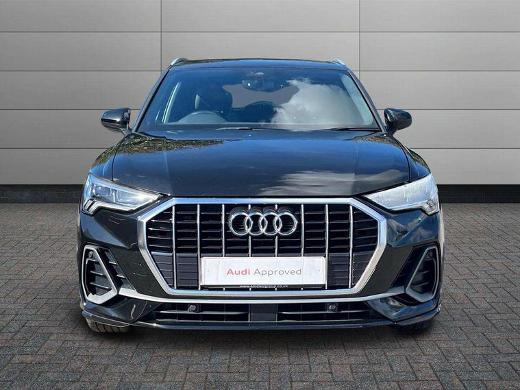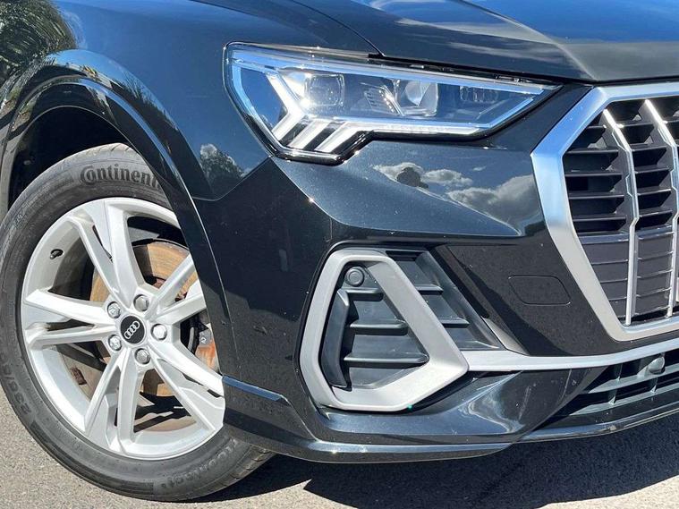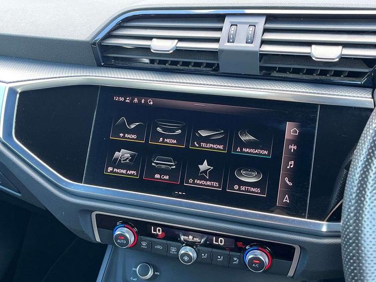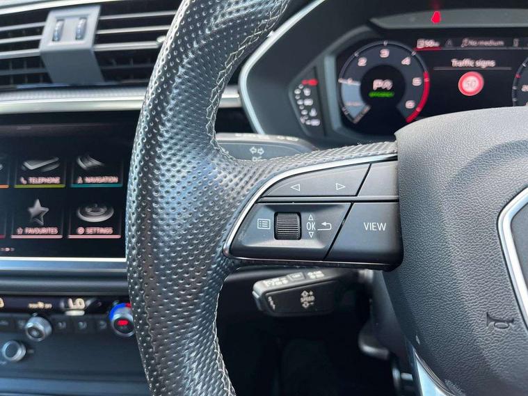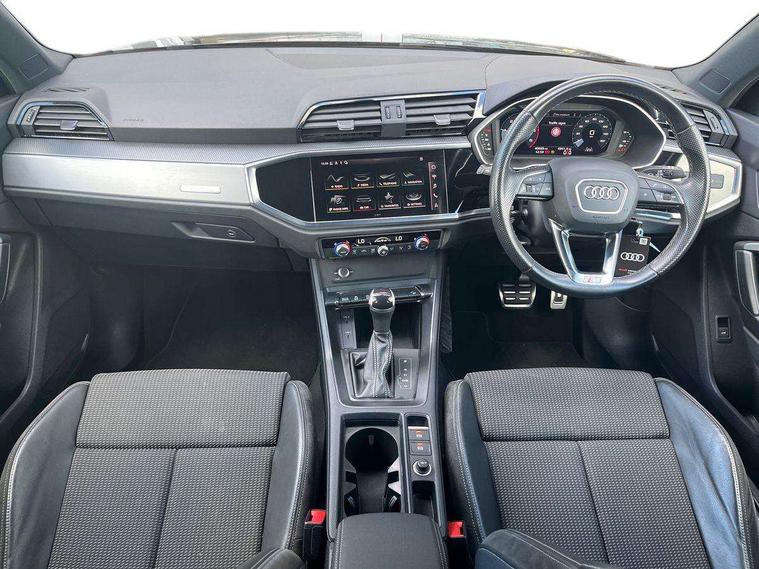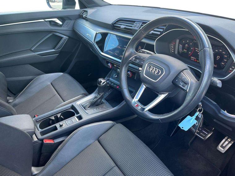 Amazon alexa Integration, Audi connect safety and service (e-call), Audi drive select, Audi lane departure warning, Audi Virtual Cockpit - 10.25" display, Bluetooth interface, Camera based traffic sign recognition, MMI Navigation Plus with high resolution 10.1 inch touchscreen colour display, Power operated tailgate, Progressive steering, Service interval indicator, Smartphone interface includes wireless Apple carplay/Android Auto, Start stop system with recuperation, Voice control system with natural language interaction, Diesel particulate filter, Sports suspension, 2 USB-C ports with charge and data functions, 6 passive loudspeakers, DAB digital radio module, Acoustic windscreen, Aluminium roof rails, Aluminium window trim, Auto dimming frameless rear view mirror, Body coloured bumpers, Electrically folding, adjustable and heated door mirrors with integrated LED side indicators and kerb view function for passenger side, Front and rear electric windows, Front fog lights, Front side air inlets in matt platinum grey, Front spoiler blade in matt platinum grey, Grille vertical bars in aluminium silver/Matt, High gloss black finish B and C pillars, LED headlights with LED daytime running lights and dynamic rear indicator, LED rear lights, Privacy glass dark tinted rear and rear-side windows (from B-pillar backwards), Rain and light sensors, Rear diffuser strip in matt titanium black, S line badges on front wings, S Line front and rear bumpers, Side skirt insert in matt Platinium grey, Silver chrome grille surround, Titanium black radiator grille, 12V socket in rear centre console, 40:20:40 folding with manual adjustment for 60:40 forwards/backwards position and backrest angle, Adjustable rear seat bench/backrest with centre armrest and cupholder, Black cloth headlining, Dual zone electronic climate control, Front and rear black floor mats with contrast stitching in rock grey, Front and rear headrests, Front and rear roof module including reading lights, Front centre armrest, Glove compartment lighting, Height and reach adjustable steering wheel, Illuminated door sill trims with S logo, ISOFIX child seat mounting for front passenger with airbag deactivation and outer rear seat including top tether attachment point for outer rear seats, Luggage compartment light, Manual front seats with height adjustment, Perforated leather gearknob, Stainless steel luggage compartment sill finisher, Stainless steel pedals, Non smoking pack - Q3, 3x3 point rear seatbelts, 6 airbags - Driver, front passenger, curtain and side windows, Audi pre-sense front with pedestrain and cyclist recognition, Electrically operated child locks on rear doors, Electromechanical parking brake, Electronic stabilisation control including ABS, ASR and EDL, Hill descent control, Hill hold assist, Pre sense basic, Seatbelt monitoring, Tyre pressure warning, Warning triangle and first aid kit, Anti theft alarm, Anti theft wheel bolts, Remote central locking, Dark matt brushed aluminium inlay, Detail dashboard around MMI touch colour display in glass look, black with surround in aluminium look, Leatherette door armrest,