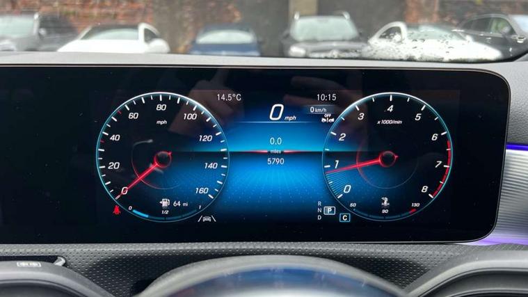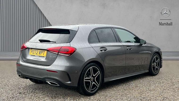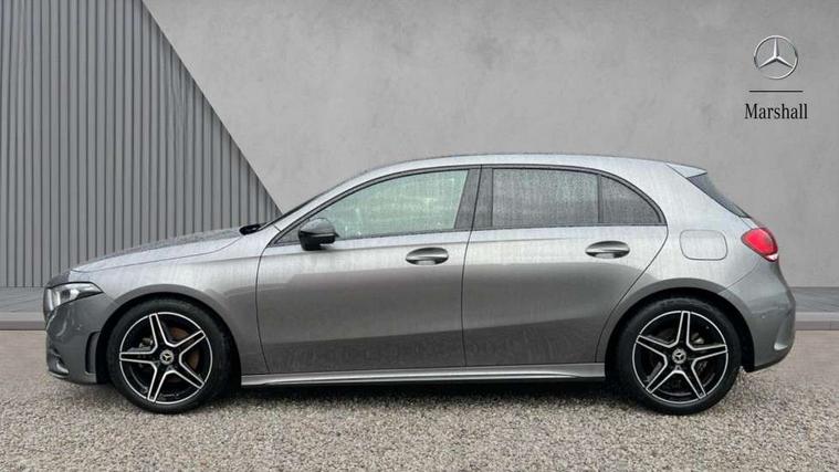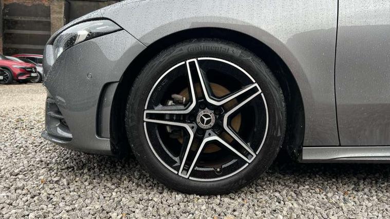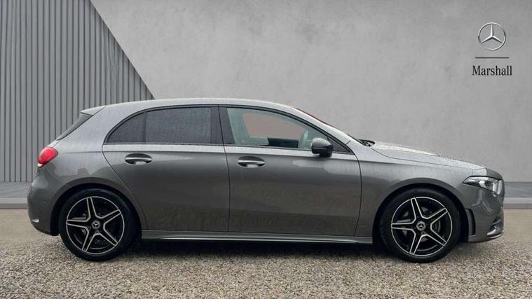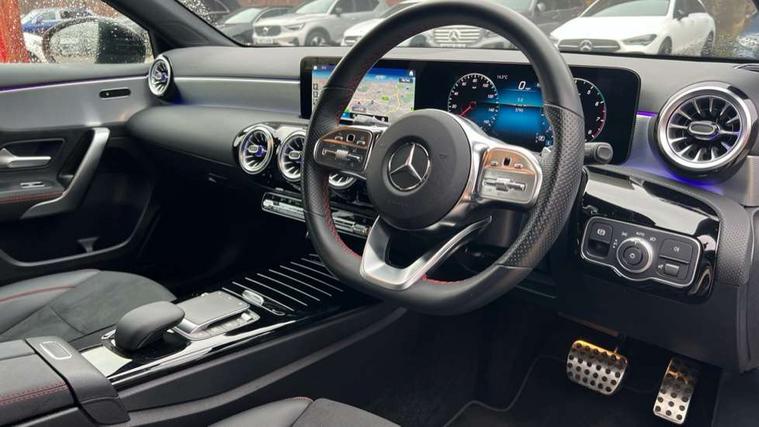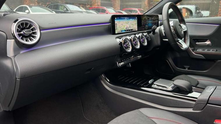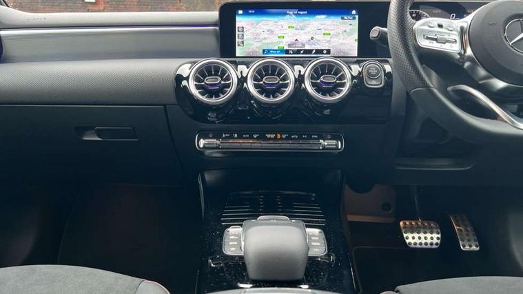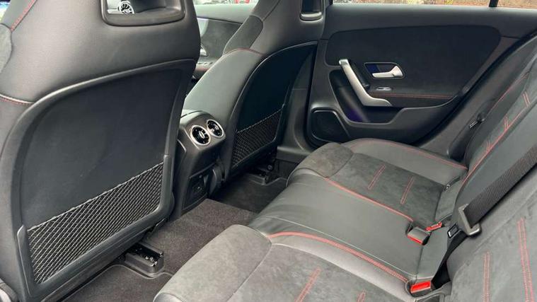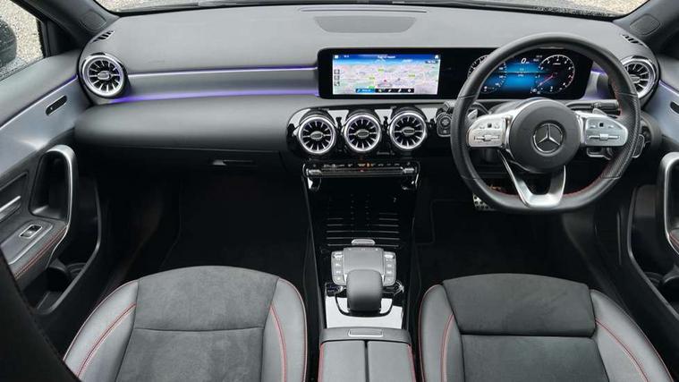 10.25" Digital instrument cluster display screen, 10.25" media display, 180 degree rear view camera with parking guidelines, Active parking assist with visual and audible warning of detected obstacles, Attention assist, Brake pad wear indicator warning light, Car wash mode, Cruise control + speed limiter, Direct steering, Dual bluetooth interfaces, DYNAMIC SELECT with a choice of driving modes (ECO, Comfort, Sport and Individual), ECO start/stop function, Fluid level warning indicator for fuel, oil, coolant and washer fluid, Hard-disk navigation, Hey Mercedes Voice activation, Lamp failure indicator, Lane keeping system, Mercedes me connect including emergency call system, accident recovery, breakdown and maintenance management, Mercedes me remote services, Outside temperature gauge, Owners manual in English, Pre-installation for private car sharing, Preinstallation for Mercedes Benz link, Service indicator (ASSYST), Smartphone integration with Apple CarPlay and Android auto, Speed limit assist, Speed sensitive power steering, Trip computer, Ultrasonic sensors positioned in the front and rear bumpers, Lowered comfort suspension, Rear axle torsion beam, 2 USB ports (type C) in rear stowage compartment and one in front of center console, 6 speakers, DAB Digital radio, MBUX multimedia system with DAB digital radio and touchpad including satellite navigation, Mercedes-Benz sound system - 100W, 4 Electric Front and Rear windows, Adaptive brake lights, AMG bodystyling - Front apron with splitter in chrome, rear apron with chrome trim and chrome visible trim elements in tailpipe, Automatic headlights, Black weather strip, Body colour bumpers, Body colour door handles with chrome inserts, Body colour side skirt, Electric adjustable and heated door mirrors with integrated LED side indicators, Exclusive diamond radiator grille, Exhaust system - Twin visible tailpipes in polished stainless steel, Headlamp assist automatic headlamp activation, Heated glass rear windscreen + timer control, LED High level third brake light, LED high performance headlamps with integrated LED daytime running lights, LED tail lamp, Privacy glass, Radio aerial, Rain sensing windscreen wipers with two sensitivity settings, Rear fog lights, Rear side wing doors, Rear wiper, 3 seat bench in 2nd row, 3 Spoke flat bottom leather multi function steering wheel with perforated leather in grip area, 40:20:40 split folding rear seats, Artico man-made leather/Microfibre Dinamica upholstery with red contrast stitching, Auto Mercedes-Benz child seat recognition sensor, Black air vents with surround in silver chrome, Black roof lining, Brushed stainless steel sports pedals with rubber studs, Controller on centre console with chrome surround, Floor mats with AMG lettering, Front centre armrest with storage compartment, Front seat backs luggage nets, Galvanished gear shift paddles on steering wheel, Heated front seats, Height/reach adjustable steering column, Illuminated Mercedes Benz lettering front door sills with changeable cover, Interior lighting - 64 colour Ambient lighting, Interior mirror with reading lamps in black and frameless, Manual height adjustable front seats, Rear head restraints, Seat occupancy sensor for front passenger seat, Single front passenger seat, Sports seats with integrated headrests, Stowage compartment in centre console with retractable cover, Sunvisors with illuminated vanity mirrors, Touchpad on center console, Twin front cupholders, Two zone thermotronic luxury automatic climate control, Light and sight pack - A Class, Mirror package - A Class, Night pack - A Class Saloon/Hatchback, Seat comfort pack - A Class, 3 rear 3 point seatbelts, ABS with Brake Assist, Active bonnet, Active brake assist includes forward collision warning system with autonomous braking, Adaptive brake assist with hold function and hill start assist, Black seatbelts, Childproof locks manually operated for rear doors and electrically operated for rear power windows, Crash responsive emergency lighting, Driver and passenger head and side airbags, Drivers knee airbag, Dual stage driver/passenger airbags, Electronic parking brake, ESP curve dynamic assist, ESP with ASR, Front and rear seatbelt reminder, Front brake callipers with Mercedes Benz lettering, ISOFIX and top tether child seat fixing points in two outer rear seats, Tyre pressure monitoring system, Warning triangle and first aid kit, Window airbags, Alarm system/interior protection/immobiliser, Keyless Go, Remote central locking and crash sensor with emergency opening function, Urban guard vehicle protection system with immobiliser and interior protection, Matrix look light longitudinal grain aluminium trim element, 18" AMG 5 twin spoke light alloy wheels aerodynamically optimised painted in black with highsheen finish, Summer tyres, Tirefit sealant kit,