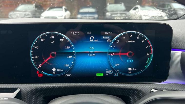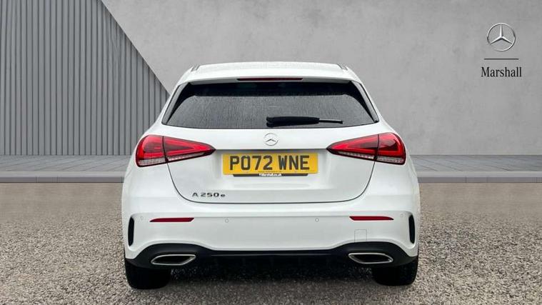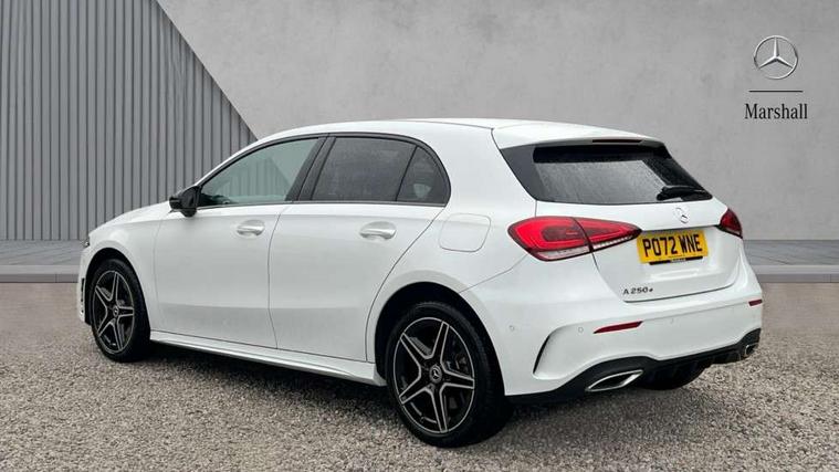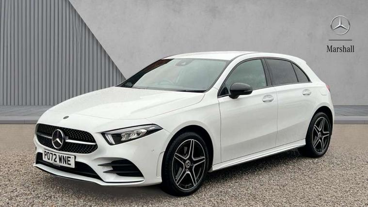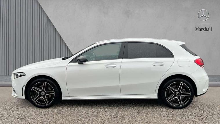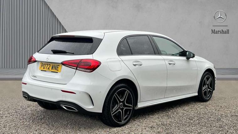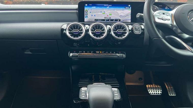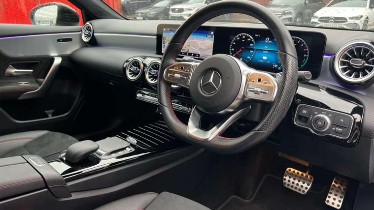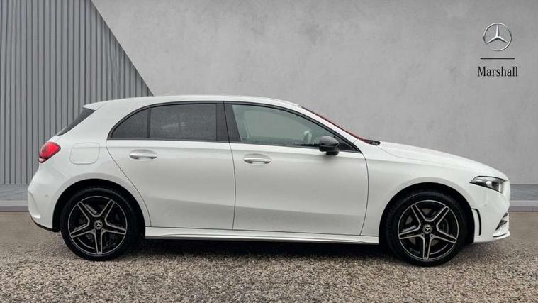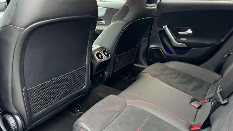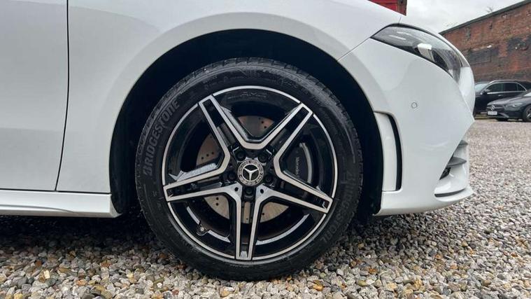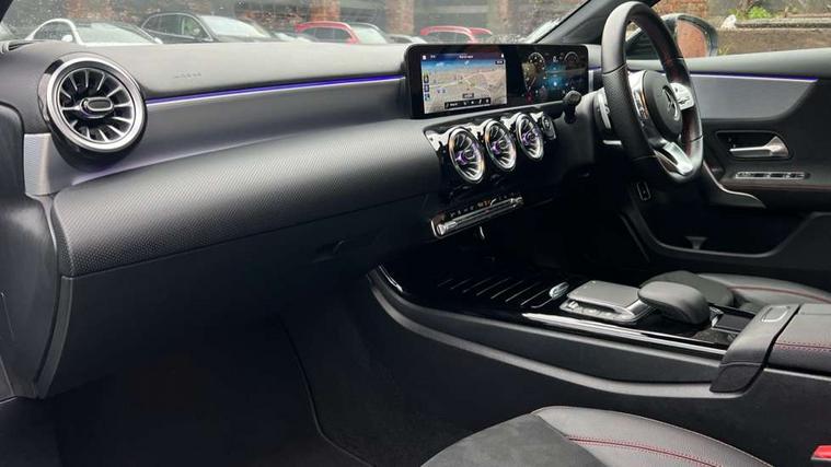10.25" Digital instrument cluster display screen, 10.25" media display, 180 degree rear view camera with parking guidelines, Acoustic ambient protection, Active parking assist with visual and audible warning of detected obstacles, Attention assist, Brake pad wear indicator warning light, Car wash mode, Cruise control + speed limiter, Direct steering, Dual bluetooth interfaces, DYNAMIC SELECT with a choice of driving modes (ECO, Comfort, Sport and Individual), ECO start/stop function, Fluid level warning indicator for fuel, oil, coolant and washer fluid, Hard-disk navigation, Hey Mercedes Voice activation, Lamp failure indicator, Lane keeping system, Mercedes me connect including emergency call system, accident recovery, breakdown and maintenance management, Mercedes me remote services, Outside temperature gauge, Owners manual in English, Pre-installation for private car sharing, Preinstallation for Mercedes Benz link, Remote and charging services plus, Service indicator (ASSYST), Smartphone integration with Apple CarPlay and Android auto, Speed limit assist, Speed sensitive power steering, Trip computer, Ultrasonic sensors positioned in the front and rear bumpers, 7.4 kW monophase on board charger, Comfort suspension, Mode 2 charging cable and 5m upto 2.3kW, Mode 3 charging cable 22 kW, Rear axle multi-link, 2 USB ports (type C) in rear stowage compartment and one in front of center console, 6 speakers, DAB Digital radio, MBUX multimedia system with DAB digital radio and touchpad including satellite navigation, Mercedes-Benz sound system - 100W, 4 Electric Front and Rear windows, Adaptive brake lights, AMG bodystyling - Front apron with splitter in chrome, rear apron with chrome trim and chrome visible trim elements in tailpipe, Automatic headlights, Black weather strip, Body colour bumpers, Body colour door handles with chrome inserts, Body colour side skirt, Electric adjustable and heated door mirrors with integrated LED side indicators, Exclusive diamond radiator grille, Exhaust system - Twin visible tailpipes in polished stainless steel, Headlamp assist automatic headlamp activation, Heated glass rear windscreen + timer control, LED High level third brake light, LED high performance headlamps with integrated LED daytime running lights, LED tail lamp, Privacy glass, Radio aerial, Rain sensing windscreen wipers with two sensitivity settings, Rear fog lights, Rear side wing doors, Rear wiper, 3 seat bench in 2nd row, 3 Spoke flat bottom leather multi function steering wheel with perforated leather in grip area, 40:20:40 split folding rear seats, Artico man-made leather/Microfibre Dinamica upholstery with red contrast stitching, Auto Mercedes-Benz child seat recognition sensor, Black air vents with surround in silver chrome, Black roof lining, Brushed stainless steel sports pedals with rubber studs, Charging socket, Controller on centre console with chrome surround, Floor mats with AMG lettering, Front centre armrest with storage compartment, Front seat backs luggage nets, Galvanished gear shift paddles on steering wheel, Heated front seats, Height/reach adjustable steering column, Illuminated Mercedes Benz lettering front door sills with changeable cover, Interior lighting - 64 colour Ambient lighting, Interior mirror with reading lamps in black and frameless, Manual height adjustable front seats, Pre-entry climate control, Rear armrest with 2 cupholders, Rear head restraints, Seat occupancy sensor for front passenger seat, Single front passenger seat, Sports seats with integrated headrests, Stowage compartment in centre console with retractable cover, Sunvisors with illuminated vanity mirrors, Touchpad on center console, Twin front cupholders, Two zone thermotronic luxury automatic climate control, Light and sight pack - A Class, Mirror package - A Class, Night pack - A Class Saloon/Hatchback, Seat comfort pack - A Class, 3 rear 3 point seatbelts, ABS with Brake Assist, Active bonnet, Active brake assist includes forward collision warning system with autonomous braking, Adaptive brake assist with hold function and hill start assist, Black seatbelts, Childproof locks manually operated for rear doors and electrically operated for rear power windows, Crash responsive emergency lighting, Driver and passenger head and side airbags, Drivers knee airbag, Dual stage driver/passenger airbags, Electronic parking brake, ESP curve dynamic assist, ESP with ASR, Front and rear seatbelt reminder, Front brake callipers with Mercedes Benz lettering, ISOFIX and top tether child seat fixing points in two outer rear seats, Perforated front brake discs, Radar based regeneration, Tyre pressure monitoring system, Warning triangle and first aid kit, Window airbags, Alarm system/interior protection/immobiliser, Keyless entry lock/unlock, Keyless Go, Remote central locking and crash sensor with emergency opening function, Urban guard vehicle protection system with immobiliser and interior protection, Matrix look light longitudinal grain aluminium trim element, 18" AMG 5 twin spoke light alloy wheels aerodynamically optimised painted in black with highsheen finish, Summer tyres, Tirefit sealant kit,