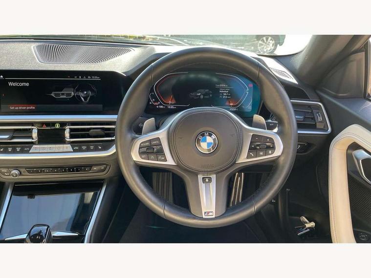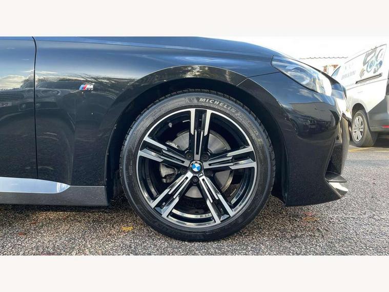 Attentiveness assist, Auto start-stop, Bluetooth, BMW ConnectedDrive online services, BMW Teleservices, Check Control warning system for monitoring of lights and door/luggage compartment open warning, Direct selection buttons, Drive off assistant, Eco pro mode, Electric power steering, Front/rear Parking distance control, iDrive controller with turn and press function, Integrated owners handbook, Intelligent functions, Live cockpit plus with nav function 12.3" instrument cluster and 14.9" centre display, Oil sensor for level and grade, Optimum shift indicator, Personal Profile, Touch operation on control display, Variable sport steering, Widescreen multi-media display, Aluminium lightweight construction, Balancer shaft, BMW TwinPower Turbo four-cylinder petrol engine, Double VANOS, Drive performance control with ECO PRO comfort + sport mode, Electronic differential lock, High precision injection, M sport suspension, Petrol Particulate Filter, Sport automatic steptronic transmission with gearshift paddles, manual gearshift time display, launch control, coasting idle ECO PRO/COMFORT modes, Twin scroll turbocharger with Valvetronic, DAB tuner, Acoustic windscreen wipers for reduced driving noise, Adaptive LED Headlights, Automatic windscreen wipers and automatic headlight, Automatically dimming rear view mirror, Body colour door handles flush with door surface, Body colour door mirrors, Body colour front and rear bumpers, Daytime running lights, Electric windows - front and rear, with open/close fingertip control and trap release, Exhaust tailpipes x2 - 90mm in left and right, Fading support, Front and rear bumper system with replaceable deformation elements, Front door sill finishers in black plastic with BMW designation, Front windscreen wipers with integrated washer jets, Green tinted heat protection glazing, High beam assistant, High gloss shadowline exterior trim in mirror triangle cover, mirror cover panel, mirror bezel and window border, High level third brake light, Indicators integrated int mirror housing, LED registration plate light, LED technology rear tail lights, brake lights and turn indicators, Lightweight engineering, Model designation on right side of tailgate, One piece kidney grille with hight gloss chrome surround, Rear boot, Rear fog lights, Reversing light in rear light cluster, Shark fin antenna, Single part LED rear lights with smoked glass components, Trailer stabilisation logic, Visible VIN plate, 12V power socket in front centre console with blanking plug, 2 cupholders in front centre console, 3 zone automatic air conditioning, Ambient lighting, Compartment in front of cupholder, Conditioned based service, Driver seat backrest width adjustment, Front and rear side armrests integrated into door trim, Front armrest, Front door pockets, Front head restraints, Front sport seats, Heated front seats, Illuminated glove compartment with separate small compartment, M headliner Anthracite, M sport leather steering wheel, Manually adjustment steering wheel column, Rear seat backrest with manual 40:20:40 split folding, Rear seat centre foldable armrest with integrated cup holder, Single front passenger seat, Storage compartment between rear seats, Storage tray and compartment with cover in centre console, Sun visors with vanity mirrors and insert tab, Through loading system with 40/20/40 split folding 2 rear seat in 2nd row, Two folding rear seat headrests, Velour floor mats, Additional storage compartment pack without USB - 2 Series Coupe, Connected pack professional - 2 Series Coupe, Interior and exterior mirror pack - 2 Series Coupe, M Sport exterior styling aerodynamics pack - 2 Series Coupe, 2 tone horn, Anti lock braking system (ABS) with cornering brake control, Automatic Stability Control (ASC), BMW emergency call, Brake drying, Child seat ISOFIX attachment for the two outer rear seats, Crash sensor activating of airbags, Unlocking doors, hazard warning lights, interior light, safety battery terminal, Deactivation of fuel pump in the event of a crash, Driver and front passenger airbags, Driver and front passenger side airbags, integrated in the door side seat backrest bolsters for all seat variants, Dynamic brake control, Dynamic stability control + (DSC+), Dynamic Traction Control - DTC, Electrically operated hand brake including automatic hold function and automatic release when driving off, Front and rear disc brakes, Front passenger airbag deactivation, Head airbags for all 4 outer seats, Manual deactivation of front passenger airbag, Seat belt security check for driver and front passenger, Seatbelt warning, Side impact protection, Three point seat belts on 4 seats including front belt stopper, pyrotechnic belt tensioners and belt force limiters, Tyre pressure sensor, Warning triangle and first aid kit, Alarm system (Thatcham 1) with remote control and electronic engine immobiliser, Central locking switch for all doors, fuel filler cap and luggage compartment, Deadlocking function system to all doors, Drive away locking system on all doors and luggage compartment, Locking wheel bolts, Start/Stop button (illuminated) in centre console with keyless engine start and Auto Start-Stop deactivation button, Two remote control key with integrated key - one button for open and close doors/fuel flap/tailgate and separate button for unlock luggage compartment, BMW mobility tyre sealing system, Electrically powered 12V compressor, Reduced rolling resistance tyres,