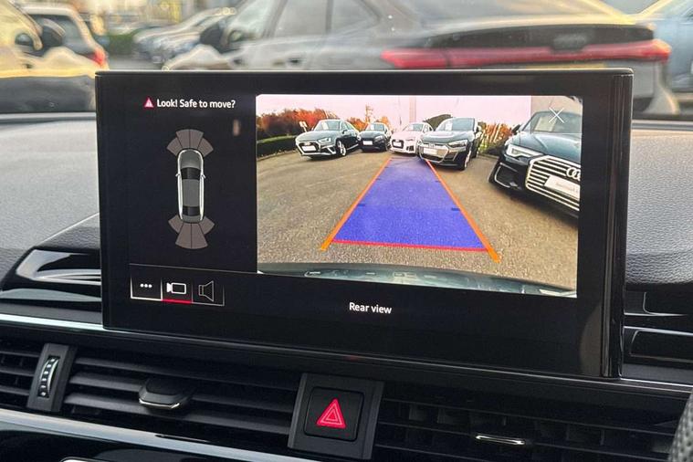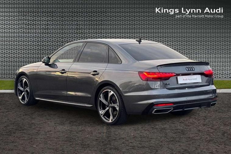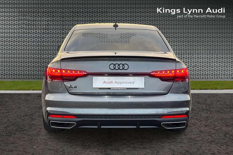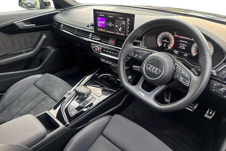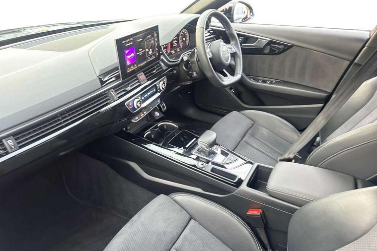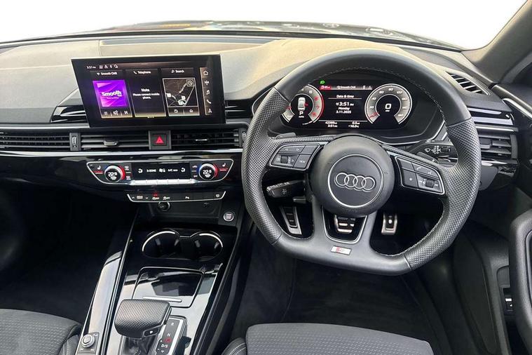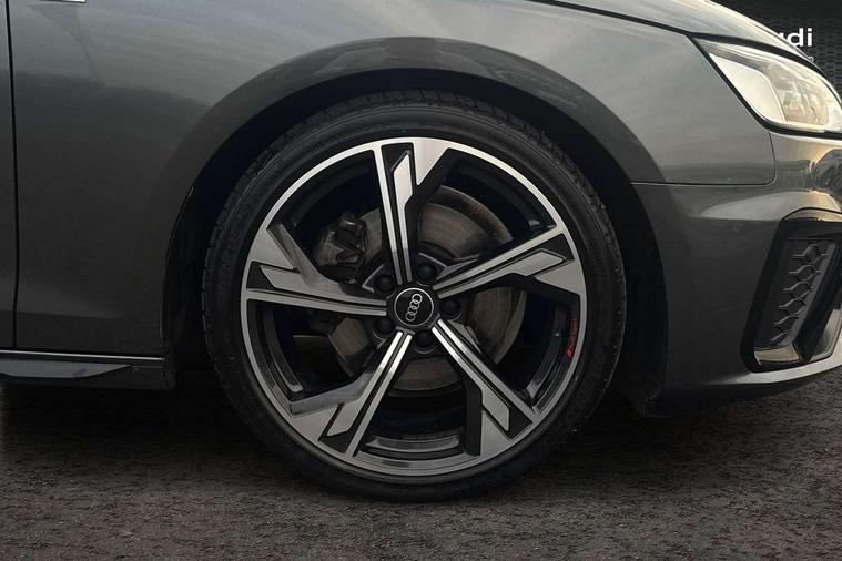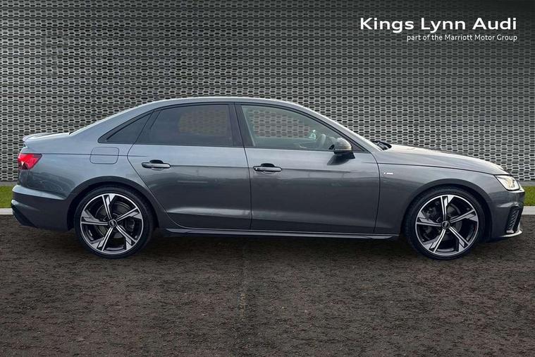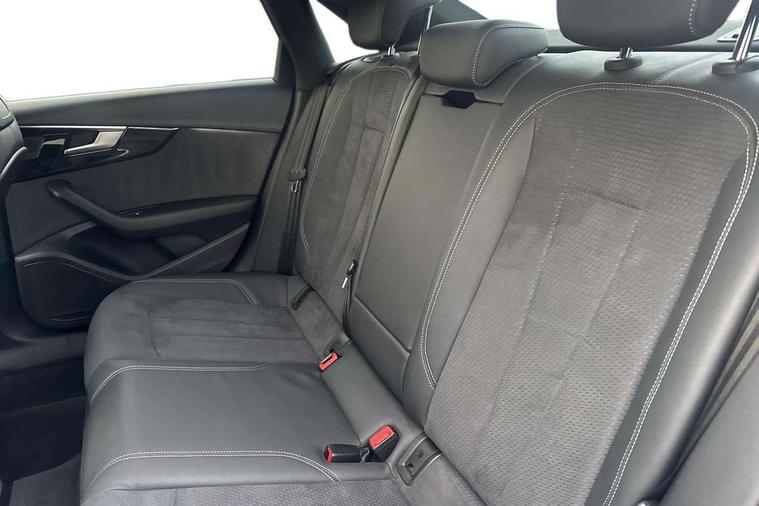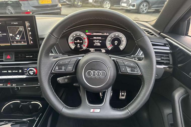 Piano black finish inlay, Black styling pack - A4 Saloon, LED Interior light pack - A4/S4, Tyre repair kit, Anti theft alarm, Anti theft wheel bolts, Central locking, Keyless Go, 2 USB charging ports, 8 passive loudspeakers, DAB digital radio reception, 3 rear seatbelts, 6 airbags - Driver, front passenger, curtain and side windows, Electronic Stabilisation Control (ESC) including ABS, ASR and EDL, Hill hold assist, Multi collision brake assist, Pop-up bonnet for pedestrian protection, Pre sense city, Seatbelt monitoring, Warning triangle and first aid kit, Auto dimming rear view mirror, Black Audi rings and black badging (model name in black badging, no engine badging), Black audi rings decal above rear sills, Body colour door handles, Body colour front spoiler lip, Body colour side sill trim, Electrically folding auto dimming/adjustable/heated door mirrors with LED side indicators and kerb view function for passenger side, Front and rear bumpers with side skirts, Front wing badges, Grained matt black side air inlets with matt aluminium silver inlay, High beam assistant, High gloss black B pillar trims and triangular rear door trim, LED headlights with LED rear lights + dynamic rear indicators + headlight adjustment and high beam, turning light + LED daytime running lights, LED third brake light, Matt aluminium silver tailpipe trim, Privacy glass, Rain and light sensors, Rear diffuser in matt titanium black with trim strip in matt aluminium silver, Rear side wing doors, Variable intermittent front wash/wipe, Windscreen with acoustic glazing, 4 way electric lumbar support for driver and front passenger, 40/20/40 split folding 3 rear seat bench in 3 parts with rear centre armrest, Black cloth headlining, Black perforated leather gearknob, Contrast stitching on seats, steering wheel and gear lever gaiter, Deluxe 3 zone electronic climate control, Door sill trims with aluminium inlay, Front and rear head restraints, Front centre armrest, Heated front seats, Illuminated door sill trims with S logo, ISOFIX child seat mounting and top tether, Manual seat adjustment, Single front passenger seat, Stainless steel pedals and foot rest, Tool kit, Audi connect safety and service (e-call), Audi connect with Amazon Alexa Integration, Audi drive select, Audi parking system plus with front and rear sensors, Audi smartphone interface, Audi virtual cockpit, Automatic start-stop system with coasting functionality and efficiency programme, Bluetooth interface, Electric boot lid release, Electromechanical power steering, Email, calendar and text messages displayed via MMI, MMI Navigation plus with MMI touch includes 10.1" high resolution colour MMI display, 3D map, Rear view camera, Voice control system, 54 litre fuel tank, Sports suspension lowered by 23mm,