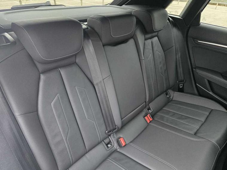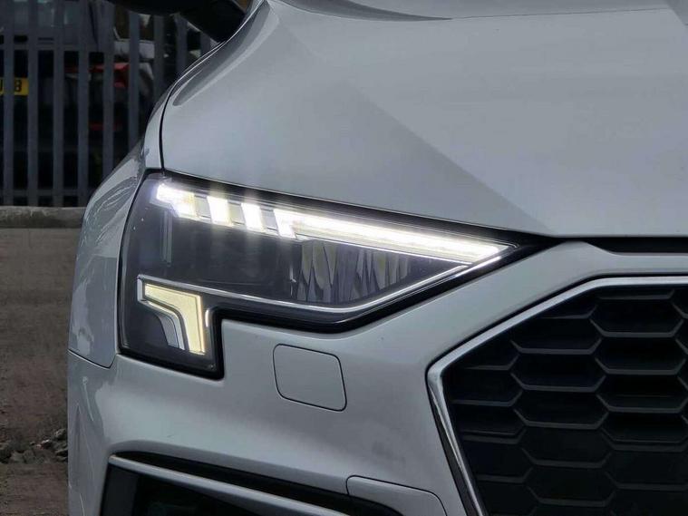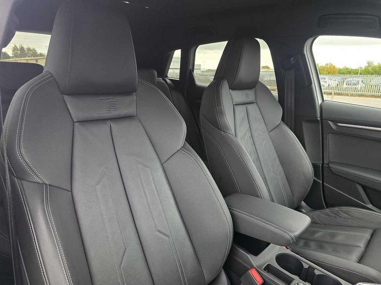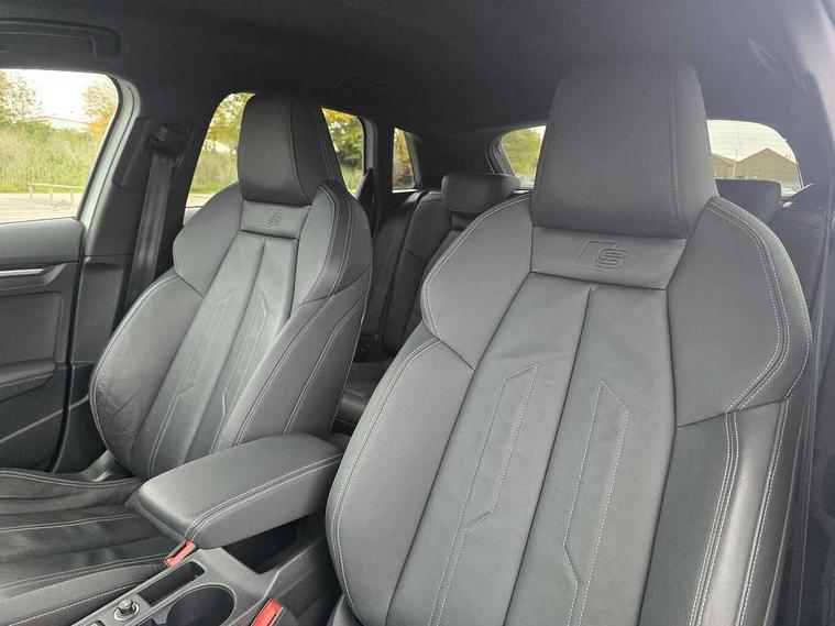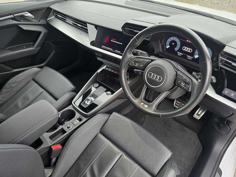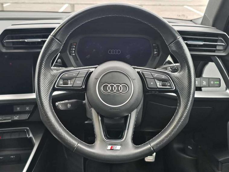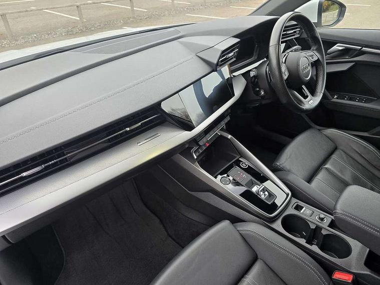 Audi connect emergency call and service, Audi drive select (Auto, Comfort, Dynamic and Individual), Audi smartphone interface, Audi Virtual Cockpit - 10.25" digital and colour instrument cluster, Automatic start/stop system with recuperation, Bluetooth interface, Collision avoidance assistant, Cruise control, Electromechanical power speed sensitive steering, Lane departure warning system, MMI Navigation Plus with high resolution 10.1" colour touch screen display, Rear parking sensors, Service indicator, Trip computer, Voice control system with natural language interaction, 2xUSB-C connection with data and charging functions, 6 passive loudspeakers, DAB Digital radio, Acoustic glass windscreen, Aluminium window trim, Auto dimming frameless rear view mirror, Electrically adjustable/heated/folding/dimming door mirrors with kerb view includes integrated LED indications + kerb view function for passenger side, Front electric windows, Illuminated aluminium inserts front door sills with S logo, LED daytime running lights, Light and rain sensors, Privacy glass - dark tinted rear window, rear door and side windows, Rear electric windows, Rear side air outlets in grained matt black, Rear wiper, S line bumpers, S roof spoiler, 12V socket and storage compartment in front centre console, 40/20/40 split folding rear seat bench with cupholder, Black cloth headlining, Dual zone electronic climate control, Front and rear centre armrest in leather, Front and rear headrests, Front/rear floor mats, Height and reach adjustable steering wheel, Interior lighting - glove compartment light and right hand side, Luggage compartment floor covering, Manual boot compartment lid, Manually adjustable front seats, Seat side bolsters, Stainless steel pedals and front footrest, Twin leather upholstery with front sports seats S embossed logo, Aluminium interior elements pack - A3 Sportback, S line styling pack - A3 Sportback, 3x3 point rear seat belts, Driver and front passenger airbag with passenger airbag deactivation, Electronic Stabilisation Control (ESC) including ABS, ASR and EDL, First aid kit with warning triangle and 2 safety vests, Front side airbags with head airbags and interaction airbag, Hill hold assist, Pre-sense front with pedestrian and cyclist detection, Seatbelt monitoring, Tyre pressure loss indicator, Anti theft alarm, Anti-theft wheel bolts, Electronically operated child lock, Immobiliser, Remote control central locking, Accent surfaces in the dashboard and centre console in platinum grey silk effect paint finish, Dark spectrum aluminium inlays,