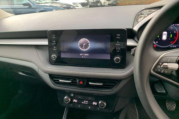 Advanced driver attention and drowsiness monitor, Bluetooth connection, Electromechanical power steering, Exterior temperature gauge, Service interval indicator, Traffic sign recognition, Virtual cockpit with 10.25" colour display, Wireless SmartLink for Apple CarPlay and Android Auto, 6 Speakers (4 in front and 2 in rear), Auxiliary socket for external MP3 player, DAB digital radio reception, Auto dimming rear view mirror, Body coloured bumpers, Door mirror integrated indicators, Front and rear electric windows, Front window wiper intermittent control, Headlight range control - Automatic, Ice scraper in fuel cap, LED 3rd brake light, LED daytime running lights with coming and leaving home feature, LED rear lights, Privacy glass, Rear LED fog light, Rear side wing doors, Rear window wiper with washing nozzles, Roof mounted spoiler, SKODA tailgate lettering in chrome, Unique dark chrome design logo on alloy wheels, 2 reading lights in front and 2 reading lights in rear, 3 rear headrests, Backrest split and folding, Central console with removable cup holder and storage box, Chrome handbrake release button, Dual zone air conditioning with climatronic electronic control, Fabric upholstery, Front centre armrest, Gearshift knob/handle in leather, Grain satin black interior door handles, Hand brake lever handle in leather, Height adjustable front headrests, Height adjustable front seats, Height adjustable steering wheel, ISOFIX and TopTether anchorage points to the outer rear seats, ISOFIX and TopTether on the front passenger seat, Luggage compartment lighting, Manually adjustable lumbar support in front seats, Pollen filter, Rear seat bench unsplit, Single front passenger seat, Skoda lettering on steering wheel, Storm grey headlining, Sun visors with mirror and airbag label on passenger side, Textile floor mats, Ticket holder, Umbrella in drivers door, 3-point height adjustable front seats belts with pretensioner and force limiter, Automatic warning lights in case of crash, Driver and passengers airbag with switch off function, e-Call+, ESC including ABS, MSR, ASR, EDS, HBA and XDS, Front and rear seat belt warning, FRONT ASSIST (AEB City and AEB Inter Urban), Front side airbags, Head airbags, One tone horn, Pedestrian protection, Three rear 3-points safety seat belts with pretensioner and force limiter including stop function for outer rear seat belts, Tyre pressure monitoring system, Anti-theft alarm system including immobiliser, interior monitoring, backup horn, and towing protection, Central locking with radio remote control, interior controls, SAFE function and 2 foldable keys, Black painted air vents, Grain satin black central console cover, Metallic grey upper decorative trim, Satin black door and side trim panel in front, Textile Kota grey lower decorative inserts, Anti-theft wheel bolts protection, Super-low rolling resistance tyres,