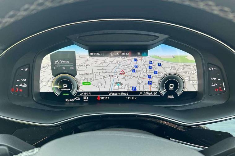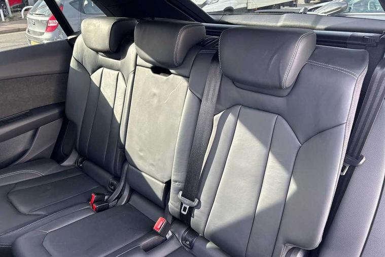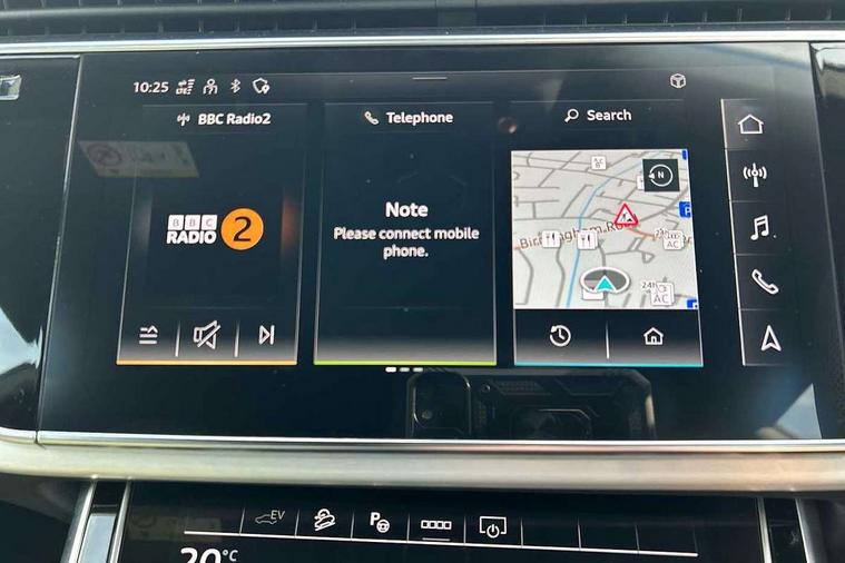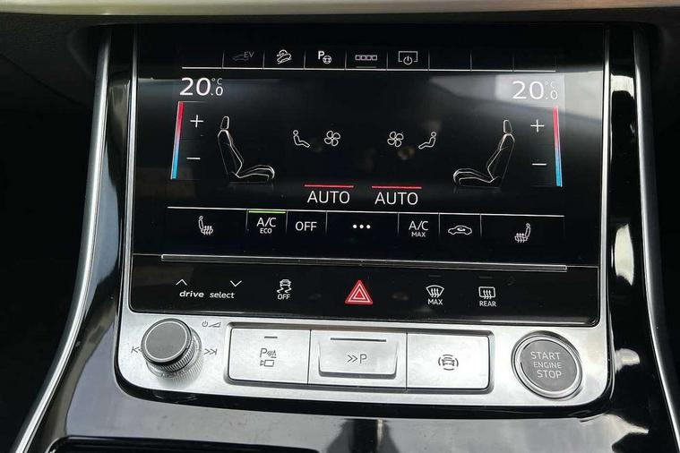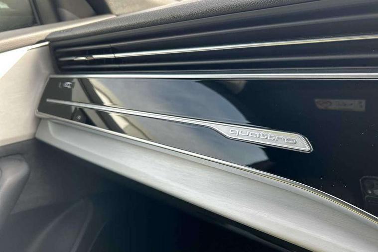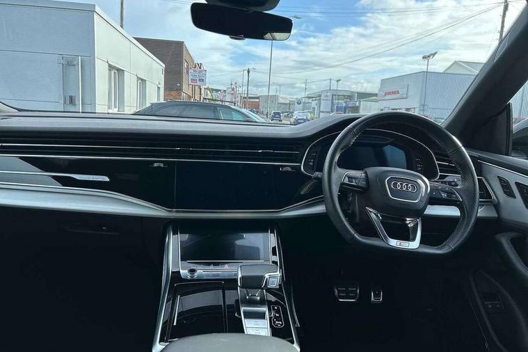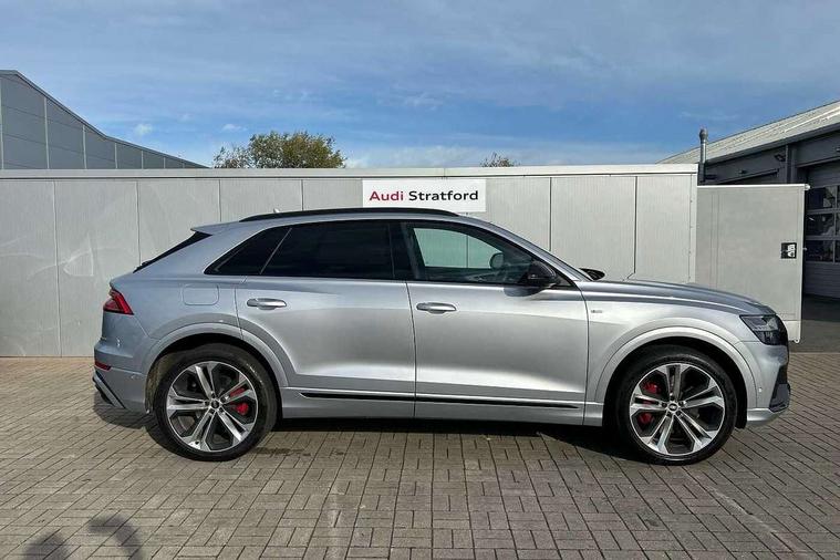 10.1" and 8.6" Dual colour touchscreens, Audi connect safety and service (e-call), Audi drive select, Audi parking system plus with front and rear sensors, Audi phone box with wireless charging, Audi smartphone interface with wireless Apple CarPlay, Audi virtual cockpit - 12.3" high resolution LCD display with fully customisable instrument cluster, Automatic start/stop system, Electro-mechanical PAS, Low washer fluid indicator, MMI - Multi Media Interface control system, MMI navigation plus with MMI touch, Natural voice recognition, On board computer, Operating buttons in black, glass look with haptic feedback, Power operated tailgate, Rear view camera, Service interval indicator, 3 pin 10 amp domestic charging cable, 48V Mild hybrid technology, Adaptive sport air suspension, Quattro all wheel drive with self locking centre differential, Type 2 mode 3 charging cable, Type 2 socket for AC charging, Audi music interface with 2 USB ports with charge and data functions, Audi sound system with 6 channel amplifier, 180 watt amplifying capacity and 10 loudspeakers including subwoofer, Aux-in socket, DAB Digital radio, Acoustic windscreen, Audi Beam uses LEDs to project the Audi logo, Audi HD Matrix LED headlights with dynamic front and rear indicators, Auto dimming frameless rear view mirror, Coming/leaving home lighting function, Electric front+rear windows, Electrically adjustable/heated/folding/dimming door mirrors with kerb view includes integrated LED indications + kerb view function for passenger side, Headlight washers, Heat insulating glass in windshield, LED signature daytime running lights, Platinum grey front spoiler lip and diffuser insert with honeycomb grille in black, Privacy glass - dark tinted rear and rear side windows from B-pillar backwards, Rain and light sensors, Rear wiper, 3 zone automatic air conditioning including remote pre-conditioning, 4-way lumbar support for front seats, 40:20:40 split folding rear bench seat, Black cloth headlining, Comfort front centre armrest, Driver seat memory function, Electrically adjustable front seats, Front head restraints, Front/rear floor mats, Heated front seats, ISOFIX child seat mounting for front passenger seat and 2 outer rear seats with top tether child seat mounting for all 3 rear seats, LED interior ambient lighting, Luggage compartment sill protection in stainless steel, Rear centre armrest with 2 cupholders, Rear headrests, Rear seat bench plus, Stainless steel pedals, Sunvisors with illuminated vanity mirrors, Tool kit, Titanium Black Styling Pack - Q8, 3 point seatbelts on all seats, Audi pre sense front, Driver and front passenger, front side and curtain airbags, Electromechanical parking brake, Electronic Stability Control (ESC) including ABS, ASR and EDL, Front passenger airbag deactivation, Hill descent control, Hill hold assist, Predictive pedestrian protection, Red painted brake callipers, Seatbelt monitoring, Traction control, Tyre pressure loss indicator, Warning triangle and first aid kit, Anti theft alarm with tow away protection, Anti-theft wheel bolts and wheel loosening detection, Immobiliser, Keyless go with remote central locking, Dark matt brushed aluminium inlay, 22" x 10J 5 twin spoke design audi sport alloy wheels partly polished with matt grey inserts, Tyre repair kit,