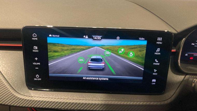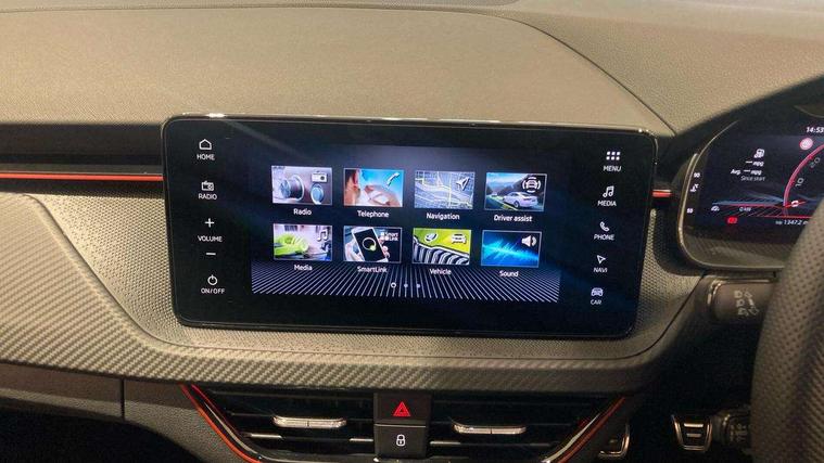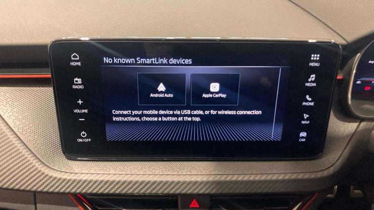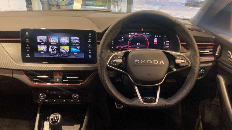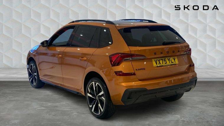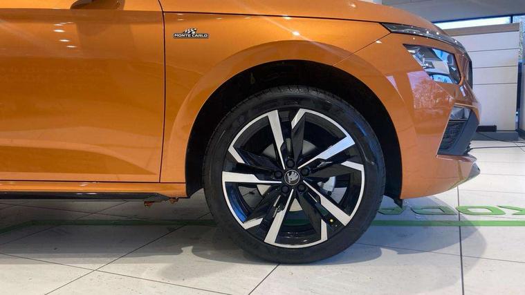 Advanced driver attention and drowsiness monitor, Bluetooth system, E-call, Front assist system, PAS, Rear parking sensors, Rear view camera, Service indicator, Speed limiter, Traffic sign recognition, Virtual cockpit with 10.25" display, Voice control system, Wireless smartlink, 4 USB C ports, 8 Speakers, 9.2" Skoda navigation display, DAB Digital radio, Auto dimming rear view mirror, Automatic headlight control with coming home and leaving home feature, Black door mirrors, Black radiator grille, Black rear diffuser, Black roof spoiler, Body colour bumpers, Body colour door handles, Boot lettering in black, Extended tailgate glass, Fixed panoramic sunroof with black roof rails, Front and rear electric windows, Heated rear window, LED daytime running lights, LED high beam, LED low beam, LED third brake light, Light sensors, Monte carlo plaque, Privacy glass, Rear side wing doors, Rear wiper, Ticket holder inside windscreen, 12V socket in luggage compartment, 3 seat bench in 2nd row, Aluminium pedals, Ambient lighting in white/red, Art leather carbon decor inserts, Art leather carbon door inserts, Black roof lining, Cargo elements, Chrome inner door handles, Driver and passenger sun visors with vanity mirror, Dual zone climate control, Front and rear roof lights, Front centre armrest, Front head restraints, Glove compartment with illumination, Height adjustable driver seat, Height adjustable front passenger seat, Ice scraper, Inner circulation control with pollen filter, ISOFIX on front passenger seat, Isofix preparation for back seats, Leather gearknob and handbrake lever, Manual lumbar support for front seats, Monte Carlo cloth upholstery, Net package and top tether hooks in boot space, Net under rear shelf, Pocket on the back of both front seats include mobile phone pockets, Rake/reach adjustable steering wheel, Reading lights, Rear centre armrests, Red hotstamping, Single front passenger seat, Sports seats, Textile floor mats, Third rear headrest, Top tether for front passenger seat, Umbrella in driver's door, Light and view plus package - Kamiq, 3x3 point rear seatbelts, Airbags - driver and front passenger, Disc brakes, ESP, Extended and predictive pedestrian/cyclist protection, Front passenger airbag deactivation switch, Front side airbags with curtain airbags, Hill hold control, Manual leather parking brake, Manual rear child locks, One tone horn, Seatbelt reminder for driver an co-driver, Traction control, Tyre pressure monitor, Anti-theft alarm system with interior monitoring, backup horn, towing protection and remote central locking with SAFE system, Anti-theft wheel bolts, Electronic engine immobilizer, 18" Ursa black diamond cut alloy wheels,