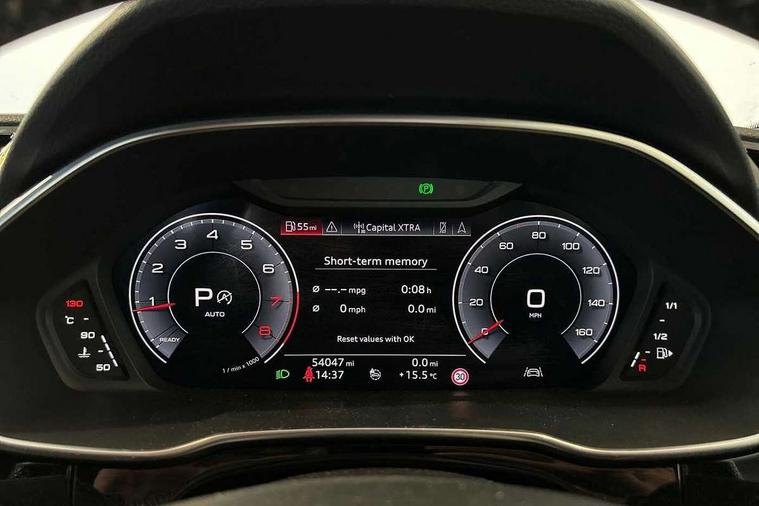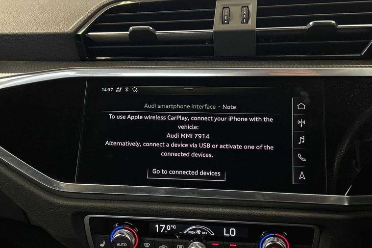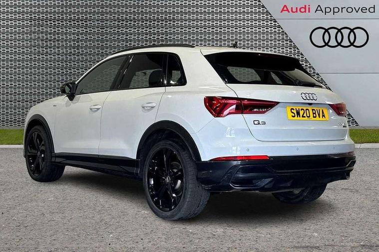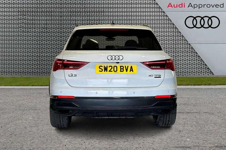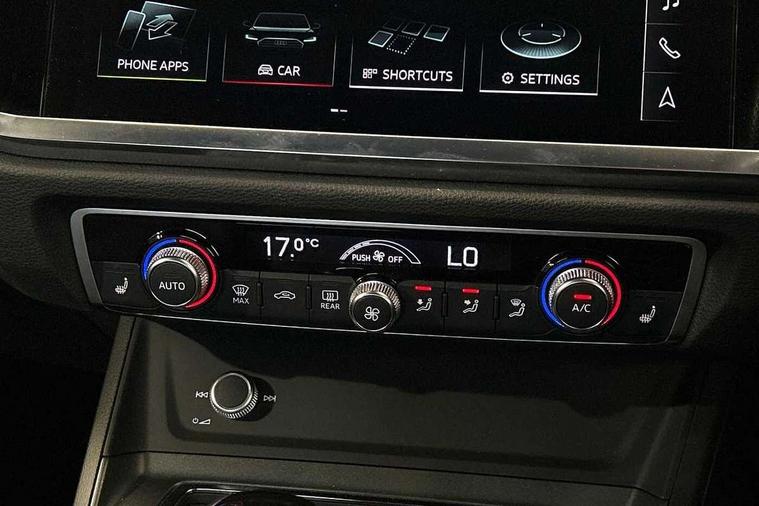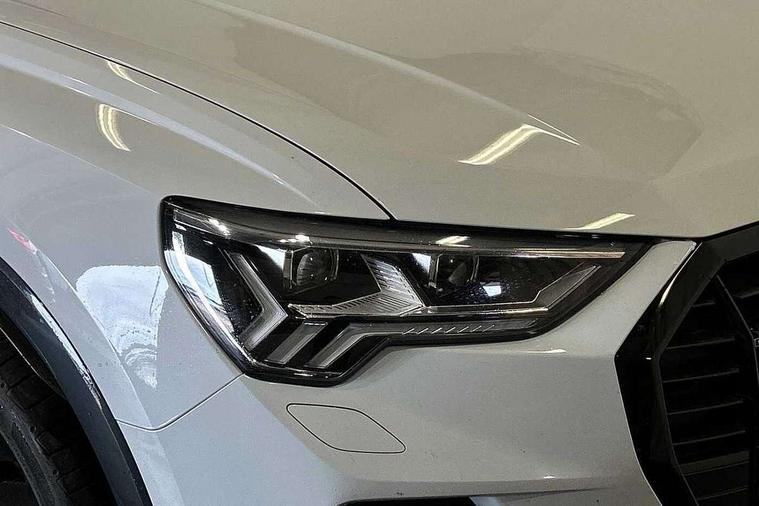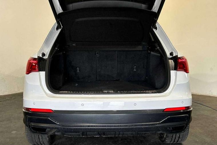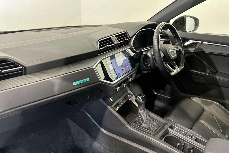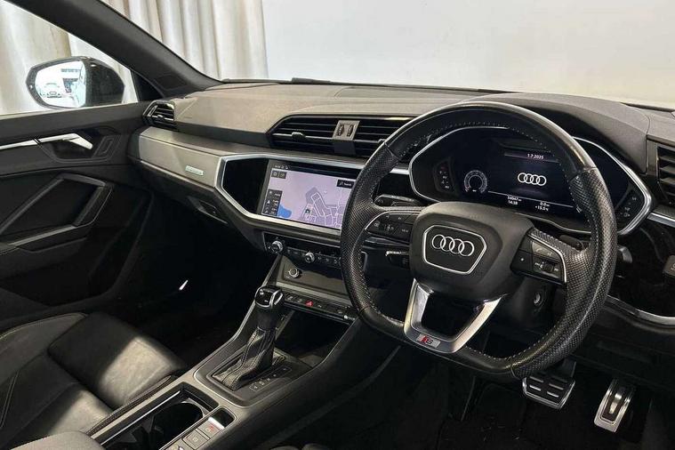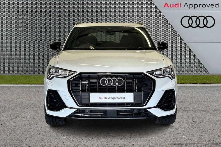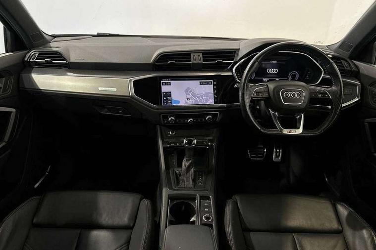 Audi connect safety and service (e-call), Audi drive select, Audi lane departure warning, Audi side assist, Audi smartphone interface includes wireless Apple carplay/Android Auto, Audi virtual cockpit plus, Bluetooth interface, Camera based traffic sign recognition, MMI Navigation Plus with high resolution 10.1 inch touchscreen colour display, Power operated tailgate, Progressive steering, Service interval indicator, Start stop system with recuperation, Voice control system with natural language interaction, Sports suspension, 1 x USB type C and 1 USB type A charging points, 6 passive loudspeakers, DAB digital radio module, Acoustic windscreen, Audi Beam uses LEDs to project the Audi Sport logo, Auto dimming frameless rear view mirror, Black roof rails, Electrically folding, adjustable and heated door mirrors with integrated LED side indicators and kerb view function for passenger side, Front and rear electric windows, Front fog lights, Front spoiler blade in matt platinum grey, Grille vertical bars in aluminium silver/Matt, Headlight washers, High gloss black finish B and C pillars, Matrix LED headlights with LED rear lights and dynamic front and rear indicator, Privacy glass dark tinted rear and rear-side windows (from B-pillar backwards), Rain and light sensors, Rear diffuser strip in matt titanium black, S line bumpers in contrasting Manhattan grey, Side skirt insert in matt Platinium grey, Silver chrome grille surround, 12V socket in rear centre console, 3 spoke flat bottomed high multi-function leather sport steering wheel with gearshift paddles, 4 way electric lumbar support for driver and front passenger, 40:20:40 folding with manual adjustment for 60:40 forwards/backwards position and backrest angle, Adjustable rear seat bench/backrest with centre armrest and cupholder, Black cloth headlining, Dual zone electronic climate control, Electrically adjustable front seats, Front and rear black floor mats with contrast stitching in rock grey, Front and rear headrests, Front and rear roof module including reading lights, Front centre armrest, Glove compartment lighting, Heated front seats, Height and reach adjustable steering wheel, Illuminated door sill trims with S logo, ISOFIX child seat mounting for front passenger with airbag deactivation and outer rear seat including top tether attachment point for outer rear seats, Luggage compartment light, Perforated leather gearknob, Stainless steel luggage compartment sill finisher, Stainless steel pedals, Black styling pack - Q3, Multi coloured extended ambient interior lighting pack - Q3, Non smoking pack - Q3, 3x3 point rear seatbelts, 6 airbags - Driver, front passenger, curtain and side windows, Audi pre-sense front with pedestrain and cyclist recognition, Electrically operated child locks on rear doors, Electromechanical parking brake, Electronic stabilisation control including ABS, ASR and EDL, Hill descent control, Hill hold assist, Pre sense basic, Seatbelt monitoring, Tyre pressure warning, Warning triangle and first aid kit, Anti theft alarm, Anti theft wheel bolts, Remote central locking, Dark matt brushed aluminium inlay, Detail dashboard around MMI touch colour display in glass look, black with surround in aluminium look, Leatherette door armrest,