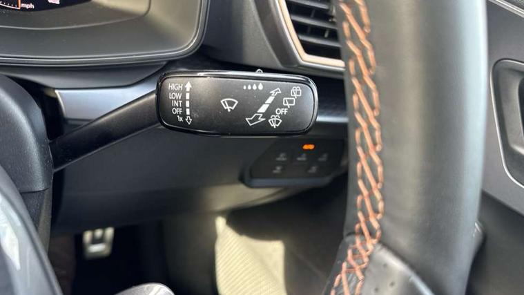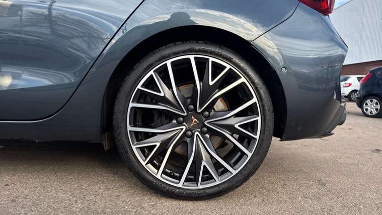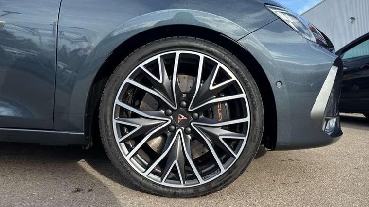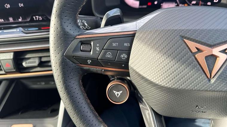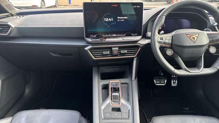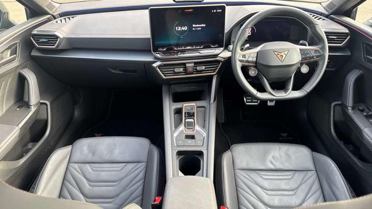 Adaptive cruise control with follow-to-stop and speed limiter, CUPRA drive profile selection with (Comfort/Sport/Individual), throttle response and gearshift mode, Digital cockpit, Dynamic road sign display, E-call, Four x USB Type C ports (2 in front and 2 in rear), Front and rear parking sensors, Front assist with forward collision warning braking reaction to vehicles, pedestrians and cyclists, Full link smartphone integration with Mirror Link, wireless Apple CarPlay and wired Google Android Auto, Intelligent park assist, Lane change assist with emergency assist, Lockable tailgate, Rear view camera, RPM, trip computer, outside temp gauge, instrument light brightness, low fuel warning light, lights on reminder, gearshift indicator, Service interval indicator, Side and exit assist, Start/stop system with regenerative braking, Wireless phone charger, Auxiliary input socket, Auto dimming rear view mirror, Body colour door handles, Body coloured bumpers, Cupra sports bumpers, Dark tinted rear windows, Electric front/rear windows, Electrically adjustable, heated and folding door mirrors, High beam assist, LED front fog lamps with cornering function, LED rear fog lamp, Matrix LED Headlights with variable light distribution, Matrix Beam and Dynamic headlight range control, Rain sensing wipers, Rear side wing doors, Rear wash/wipe, Separate daytime running light with automatic headlight control and coming home feature, Third brake light, Welcome light with logo projector in door mirrors, 12v power supply in centre console, 3 seat bench in 2nd row, 5 headrests, 60/40 split rear bench seat with armrest, Ambient lighting (glovebox, footwell, ambient lighting multicoloured), Black headlining, Cupra sports pedals, CUPRA Supersports, heated steering wheel with satellite buttons, Electrically adjustable driver seat and lumbar support with memory function + manually adjustable passenger seat, Folding boot cover, Front and rear reading lights X 4, Front centre armrest, Heated front seats, Height/reach adjust steering wheel, Illuminated interior front door sills, Interior wraparound lighting, ISOFIX points in outer rear seats with top tether anchorage points, Leather upholstery, Single front passenger seat, Storage pockets on rear of front seats, Sunvisors with illuminated mirror, Three zone climate control, Dynamic and comfort pack - Leon Cupra, Media system plus with 12.9" display + navigation pack - Leon Cupra, 3 point seatbelts on all rear seats, ABS, Brake control system - ESC and brake booster, Child proof door locks, Cupra black brake calipers, Driver and front passenger airbags with front passenger airbag de-activation, front side and curtain airbags, Electronic parking brake, Hill hold control, Pre-crash front and rear seat belt tensioner, window closure and hazard lights, Rear disc brakes, Seat belt reminder for front and rear seats, Tiredness recognition system, Tyre pressure monitoring system, Anti theft alarm system with interior monitoring in cab, backup horn and towing protection, KESSY Advanced - Keyless start, keyless entry, Locking wheel bolts, Chrome and copper interior detailing, 19" Mistral machined R black and silver alloy wheel with 91Y tyres, Breakdown kit, Tool kit,