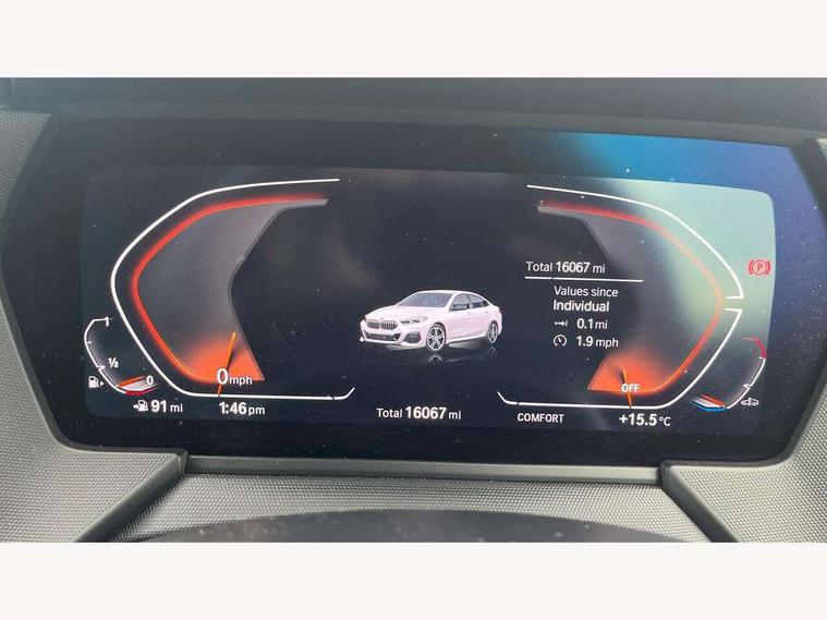 Active guard plus, Attentiveness assist, Auto start-stop, BMW ConnectedDrive online services, BMW Intelligent Personal Assistant, BMW Live Cockpit Professional with 10.25" high resolution instrument and control display, BMW Online services, BMW operating system with 7.0 mid interface, BMW Teleservices, Check Control warning system for monitoring of lights and door/luggage compartment open warning, Cruise control with braking function, iDrive controller with 7 short cut favourite buttons on centre console, Integrated navigation data with map data via USB +features such as 3D landmarks and micro city models, Integrated owners handbook, Intelligent voice assistant, Lane departure warning system, M Sports steering, On board computer - average speed+fuel consumption, service interval, clock/date, odometer/trip meter, outside temperature display and ice warning, Optimum shift indicator, Personal Profile, Pull away assistant, Speed limiting function, Aluminium lightweight construction, Balancer shaft, Double VANOS, Drive performance control with ECO PRO comfort + sport mode, Dual clutch automatic transmission, Electronic differential lock, High precision injection, M Sport suspension with stiffer spring/damper set-up and vehicle lowered by 10mm + twin tube gasfilled shock absorbers and Anti roll bars, Performance Control, Petrol Particulate Filter, VALVETRONIC engine management, 2x USB Type C ports (for charging and data transfer), 4G LTE Connectivity with hard wied 4G network sim card, DAB digital radio, MP3 players and RDS double tuner, Auto wipers, Automatically dimming rear view mirror, Body colour door handles, Body colour mirror caps, Chrome 'M' logo side designation, Chrome exhaust single tailpipe, round, Direction indicator side lights integrated exterior mirrors, Electric windows - front and rear, with open/close fingertip control and trap release, Exterior mirrors - electrically folding with anti-dazzle, Fading support, Follow me home headlights, Front and rear bumper system with replaceable deformation elements, Front door sill finishers in black plastic with M designation in metallic look, Heated, electrically adjustable exterior mirror aspheric on driver side, convex on passenger side, High gloss black B pillar finish, High gloss shadow line exterior trim, High level third brake light, LED daytime running lights, LED front fog lights, Lightweight engineering, Model designation on right side of tailgate, Preparation for high beam assistant, Rain sensor with automatic headlight activation, Rear boot, Rear fog lights, Rear side wing doors, Reversing light in rear light cluster, Welcome lighting, 12V power socket in centre console, 2 cupholders in front centre console, 3 rear seat head restraints, 3 rear seats, 3 spoke M sports design leather steering wheel finished in nappa leather with specific M badge, Anthracite finished floor mats with contrasting surround, Anthracite headlining, Automatic two zone climate control air conditioning, Child seat ISOFIX attachment for two outer rear seats and front passenger seat with anchorage points, Conditioned based service, Driver and front passenger seat heating, Front and rear door pockets including bottle trays, Front and rear side armrests integrated into door trim, Front armrest foldable with integrated storage compartment, Front centre interior light over interior mirror and rear centre automatic interior light when door is opened/ignition switched off or via remote key, Front head restraints, Front passenger seat, Front sports seats with electric side bolster adjustment, Glove compartment, Luggage compartment lighting, Manually adjustment steering wheel column, Multi-function controls for steering wheel, Sun visors with vanity mirrors and insert tab, Through loading system with 40/20/40 split folding rear seat, Two lashing eyes, Additional interior lighting pack - 2 Series Gran Coupe, Connected pack professional - 2 Series Gran Coupe, Extended storage pack - 2 Series Gran Coupe, M Sport exterior styling aerodynamics pack - 2 Series Gran Coupe, 2 tone horn, Airbag - Front driver and passenger, front and rear head, front side, curtain head protection, manual deactivation of front passenger airbag possible, Anti lock braking system (ABS) with cornering brake control, BMW emergency call, Brake drying, Braking readiness, City braking function, Crash sensor activating of airbags, Unlocking doors, hazard warning lights, interior light, safety battery terminal, Dynamic stability control + (DSC+), Dynamic Traction Control - DTC, Electrically operated hand brake, Rear brake discs, Rear child proof door locks, Seat belt security check for driver and front passenger, Seatbelt warning, Side impact protection, Three point seat belts on all seats including front belt stopper, pyrotechnic belt tensioners and belt force limiters, Trailer stability control, Tyre pressure monitoring system, Ventilated front disc brakes, Warning triangle and first aid kit, Central locking switch for all doors, fuel filler cap and luggage compartment, Deadlocking function system to all doors, Drive away locking system on all doors and luggage compartment, Locking wheel bolts, Start/Stop button (illuminated) in centre console with keyless engine start and Auto Start-Stop deactivation button, Thatcham Cat.1 alarm and immobiliser, Two remote control key with integrated key - open/close doors/fuel flap/tailgate +1 button for unlock compartment with M design high gloss black inlay, Contrast stitching on instrument panel, 18" Burnished M double spoke bi-colour alloy wheels finished in orbit grey - style 819M, Reduced rolling resistance tyres,
