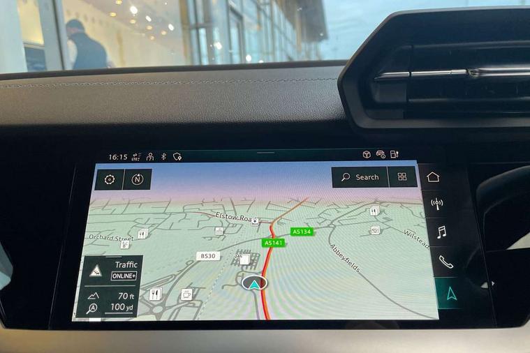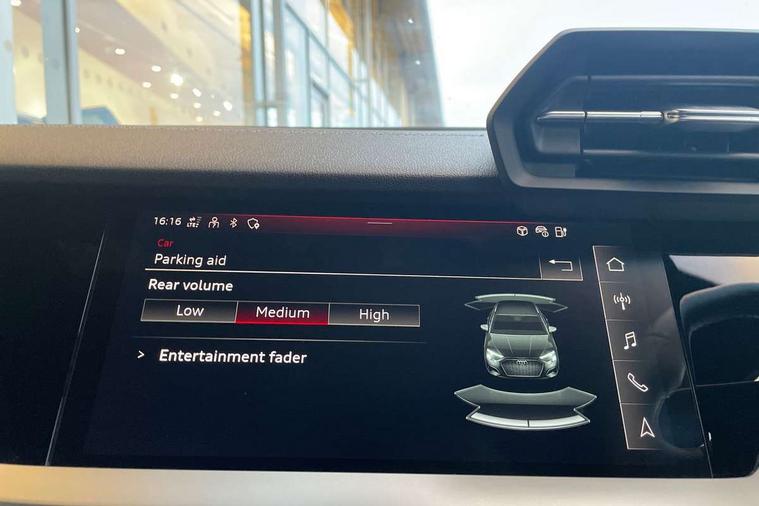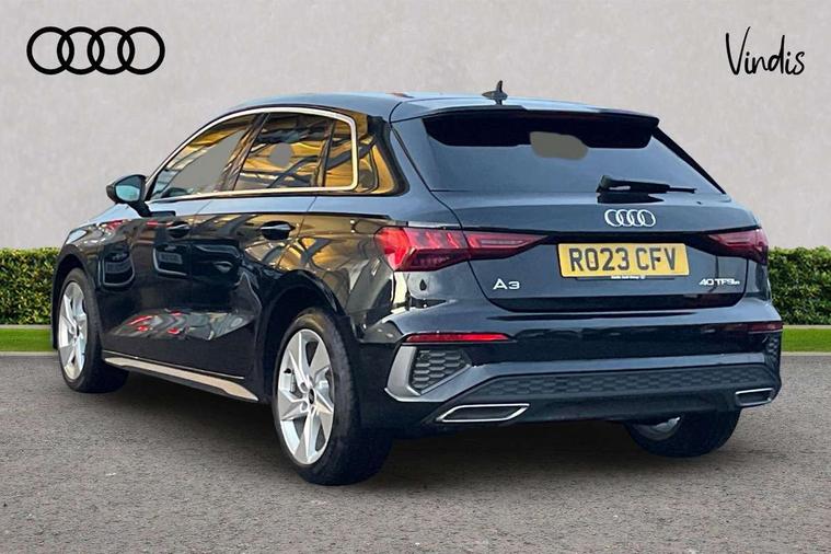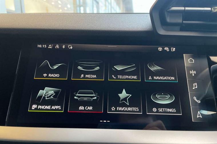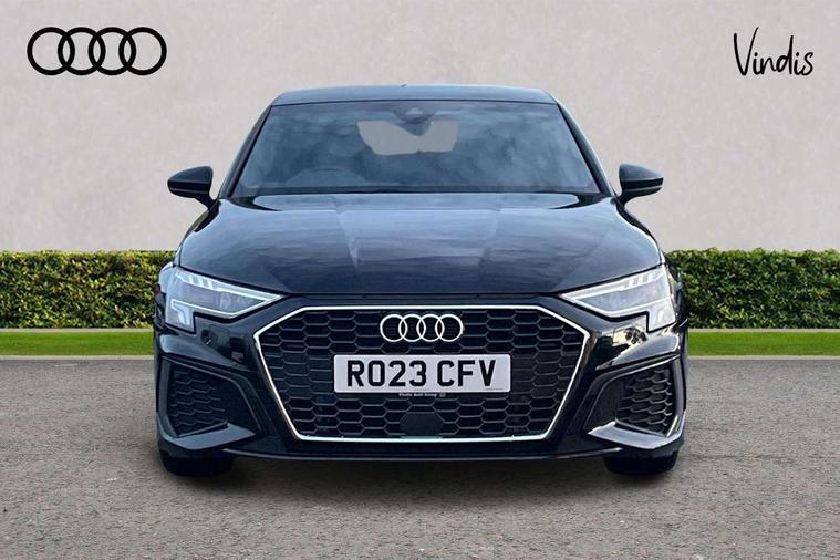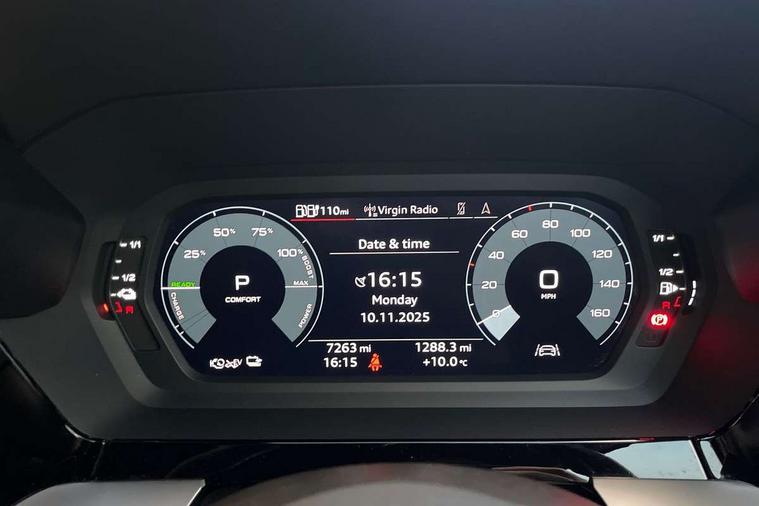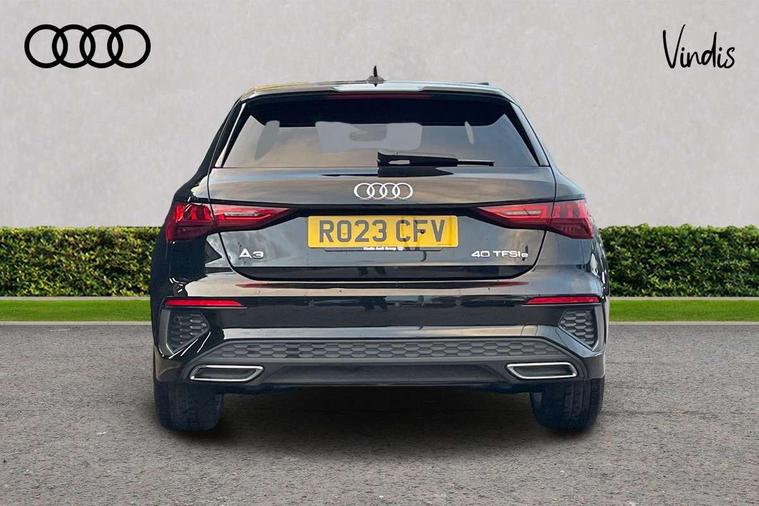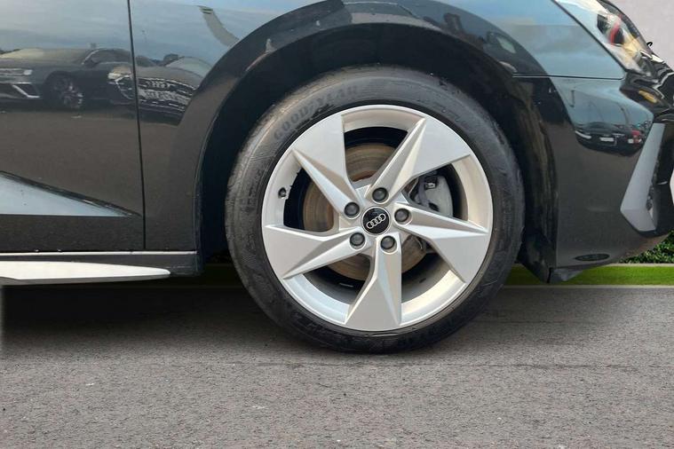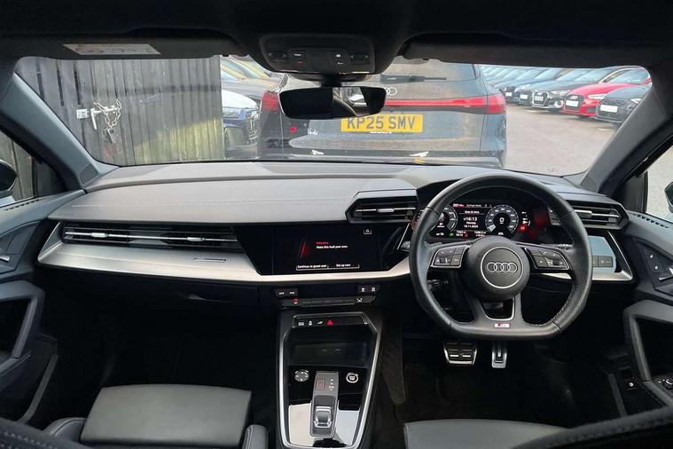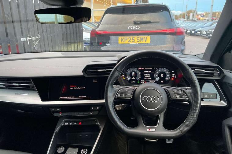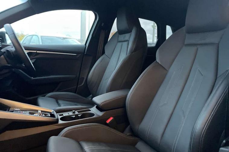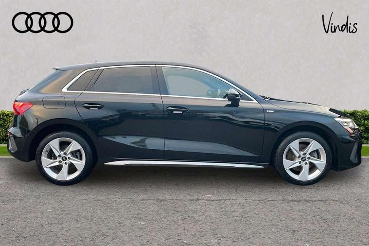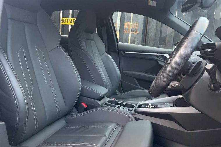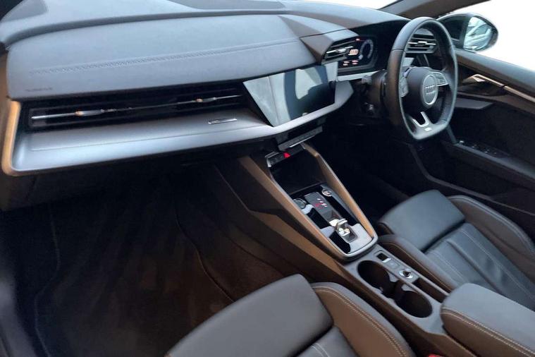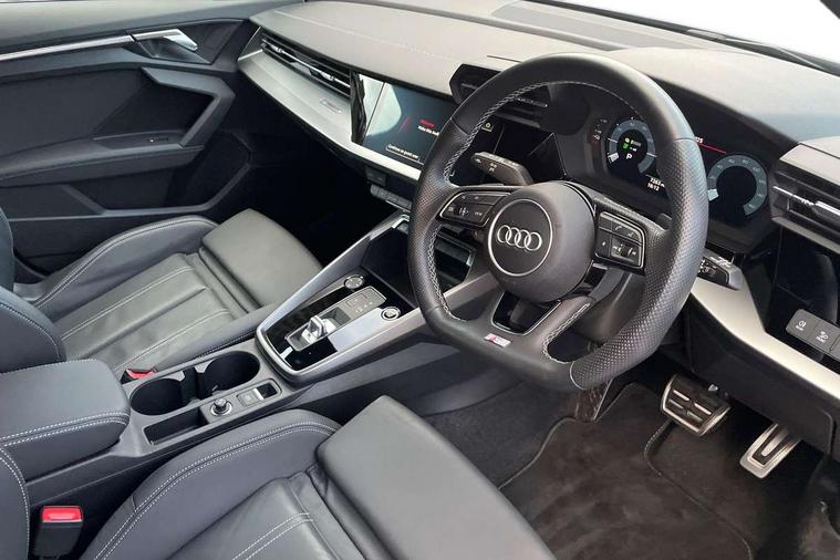 Audi drive select (Auto, Comfort, Dynamic, Efficiency and Individual), Audi smartphone interface, Audi Virtual Cockpit - 10.25" digital and colour instrument cluster, Automatic start/stop system with recuperation, Bluetooth interface, Collision avoidance assistant, e-Call (emergency call), Electromechanical power speed sensitive steering, Lane departure warning system, MMI Navigation Plus with high resolution 10.1" colour touch screen display, Service indicator, Trip computer, Voice control system with natural language interaction, 3 pin 10 amp domestic charging cable, 3.6 kw On-board charger, Standard suspension, Type 2 mode 3 32 amp charging cable, Type 2 socket for AC charging, 2xUSB-C connection with data and charging functions, 6 passive loudspeakers, DAB Digital radio, 3rd brake light, Acoustic glass windscreen, Aluminium window trim, Auto dimming frameless rear view mirror, Body colour exterior mirrors, Electrically adjustable/heated/folding/auto dimming door mirrors with integrated LED indications + kerb view function for passenger side, Front electric windows, Illuminated aluminium inserts front door sills with S logo, LED daytime running lights, LED headlights with LED rear lights and dynamic rear indicators, Light and rain sensors, Privacy glass - dark tinted rear window, rear door and side windows, Rear electric windows, Rear side air outlets in grained matt black, Rear side wing doors, Rear wiper, S line bumpers, S roof spoiler, 12V socket and storage compartment in front centre console, 3 seat bench in 2nd row, 3 spoke leather multifunction steering wheel with paddle shift, 40/20/40 split folding rear seat bench with cupholder, Black cloth headlining, Dual zone electronic climate control, Front and rear centre armrest in leather, Front and rear headrests, Front/rear floor mats, Height and reach adjustable steering wheel, Illuminated vanity mirror, Interior lighting - glove compartment light and right hand side, Luggage compartment floor covering, Manual boot compartment lid, Manually adjustable front seats, Seat side bolsters, Single front passenger seat, Stainless steel pedals and front footrest in black, Twin leather upholstery with front sports seats S embossed logo, Aluminium interior elements pack - A3 Sportback, LED interior lighting pack - A3 Sportback, S line styling pack - A3 Sportback, 3x3 point rear seat belts, Audi pre sense front, Driver and front passenger airbag with passenger airbag deactivation, Electronic Stabilisation Control (ESC) including ABS, ASR and EDL, First aid kit with warning triangle and 2 safety vests, Front side airbags with head airbags and interaction airbag, Pre-sense front with pedestrian and cyclist detection, Seatbelt monitoring, Tyre pressure loss indicator, Anti theft alarm, Anti-theft wheel bolts, Electronically operated child lock, Immobiliser, Remote control central locking, Accent surfaces in the dashboard and centre console in platinum grey silk effect paint finish, Dark spectrum aluminium inlays, Tool kit, Tyre repair kit,