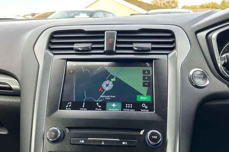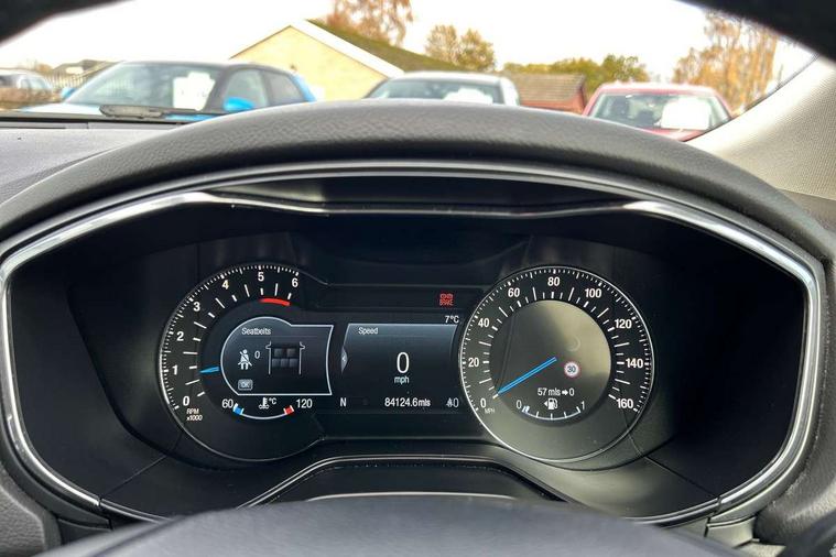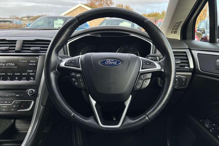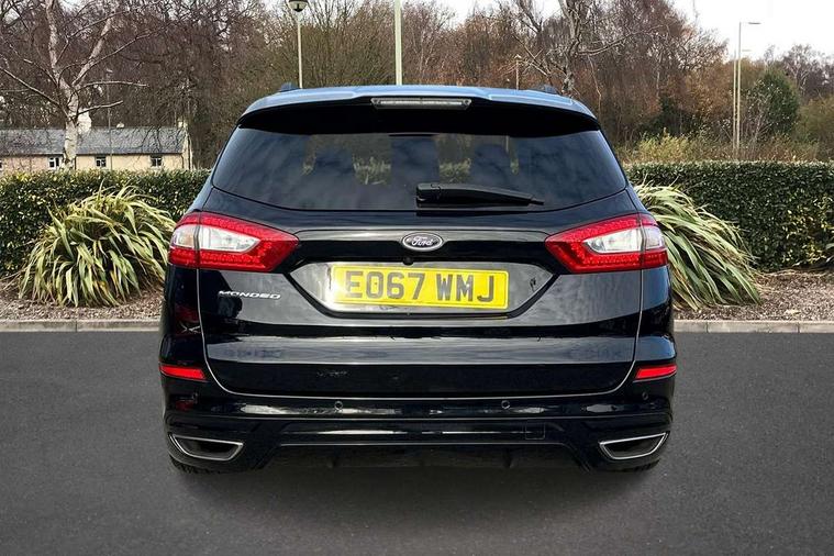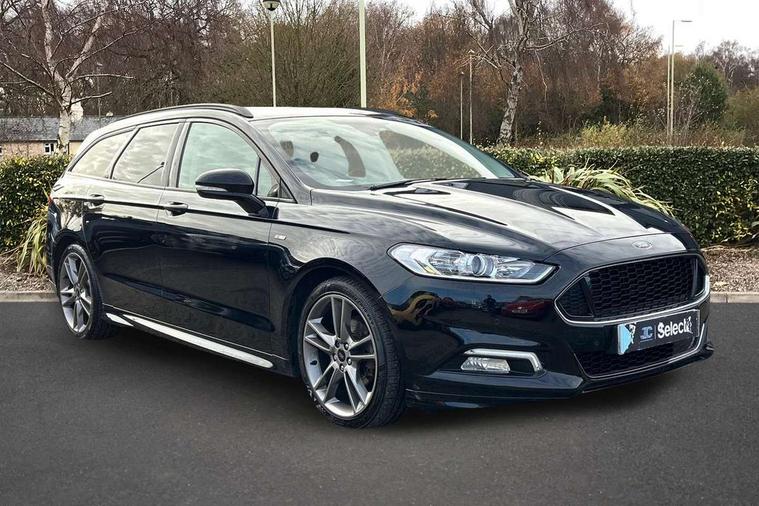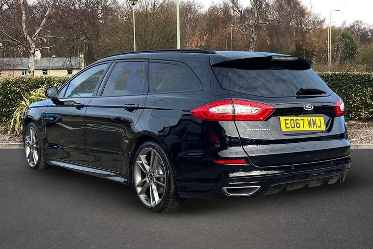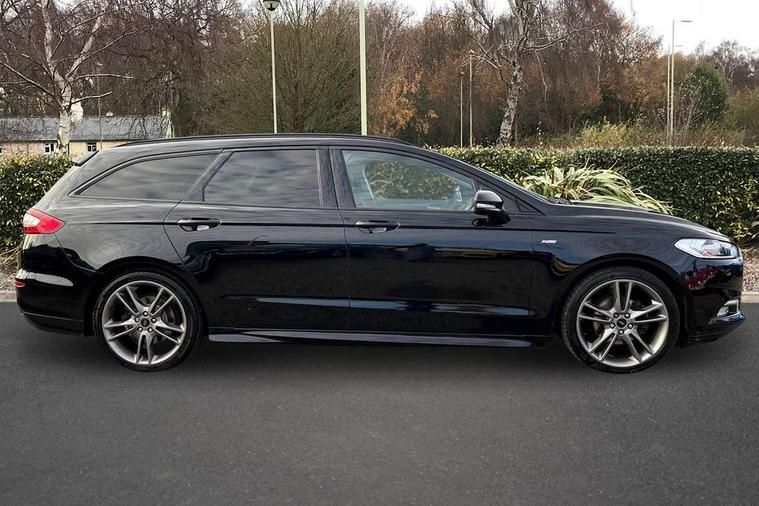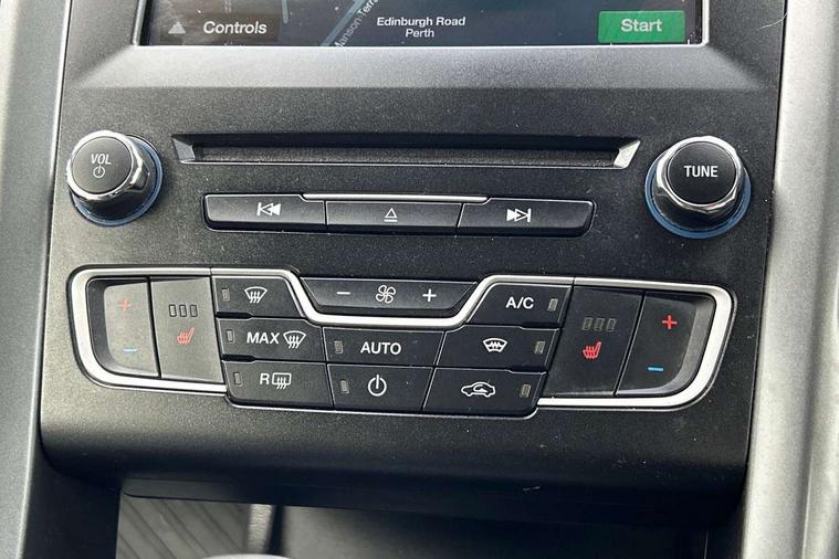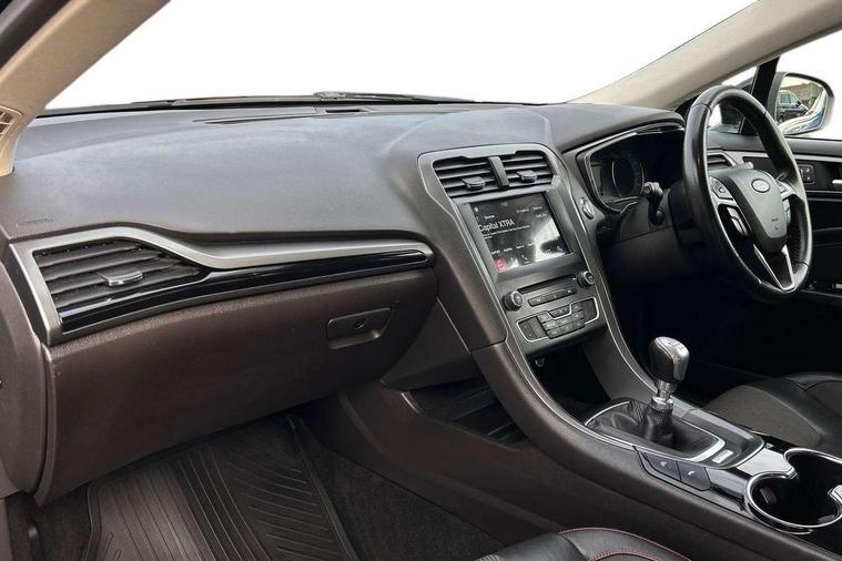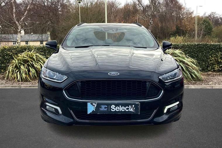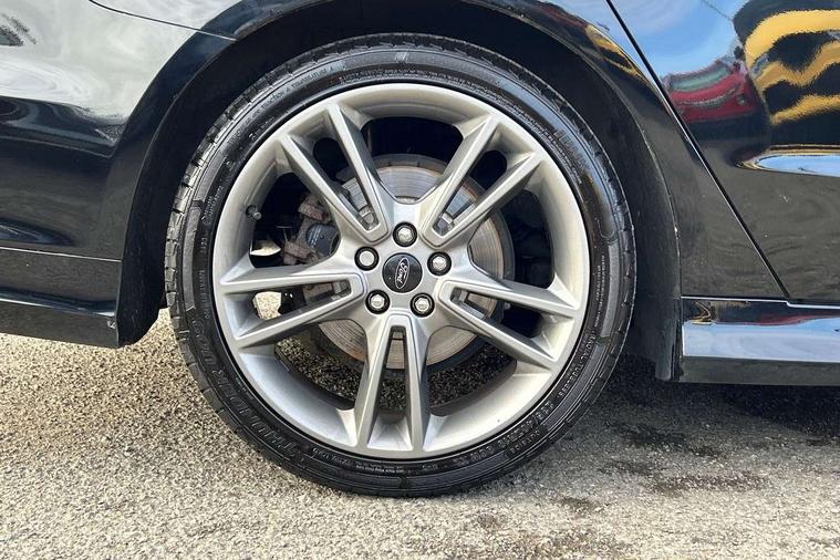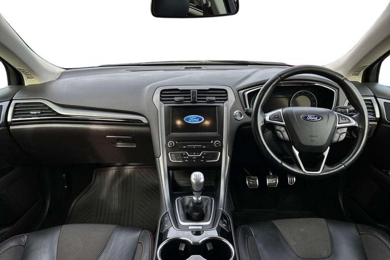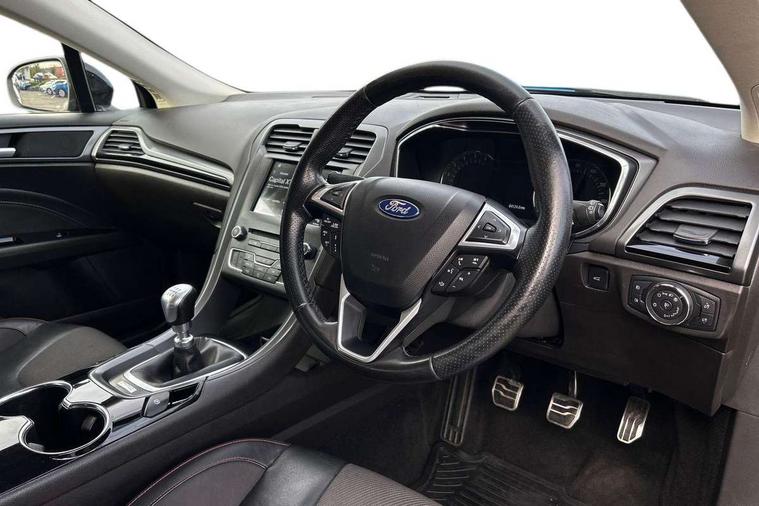 'Ford Power' starter button, Bluetooth connectivity with voice control, Easy fuel capless refuelling system, Ford SYNC 3 with 8" colour touch screen, Front and rear parking sensors, Lane keep assist with traffic sign recognition, auto dimming interior mirror, automatic headlights and wipers, PAS, Service indicator, SYNC Emergency Assistance, Trip computer, Diesel particulate filter, Sports suspension, Radio/CD, USB socket, 'Quickclear' heated windscreen/heated washer jets, Body colour rocker mouldings, Body coloured bumpers, Bright front scuff plates with ST logo script, Chrome roof rails, Chrome window surround, Electric adjustable door mirrors, Electric folding door mirrors, Electric front windows, Electric rear windows with global closing, Front fog lights with chrome surrounds, LED daytime running lights, LED tail lights, Rear spoiler, Rear wiper, 10 way electric power adjustable drivers seat, Aluminium foot pedals, Centre console with armrest, Cloth/Partial leather trim, Driver's lumbar support, Dual zone automatic climate control, Folding rear seats, Front headrests, Heated front seats, Height adjustable passenger seat with lumbar support, Isofix on 2nd row rear seats, Perforated leather steering wheel, Rear armrest, Rear headrests, Ski hatch, Sports seats, ST sport leather gear knob, Tonneau cover, Bodystyling pack - Mondeo, 3x3 point rear seatbelts, ABS+EBA, Curtain airbags, Driver/front passenger airbag, Drivers knee airbag, Electronic parking brake, ESP + traction control, Hill start assist, Intelligent Protection System (IPS), Tyre pressure monitoring system, Immobiliser, Keyless entry and start, Remote central double locking, Thatcham Cat.1 alarm,