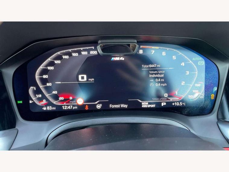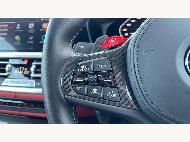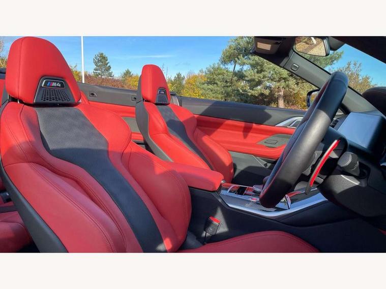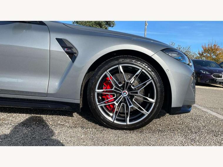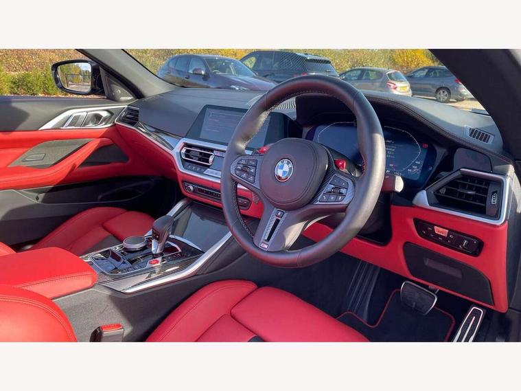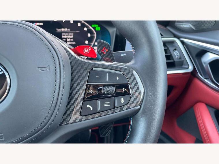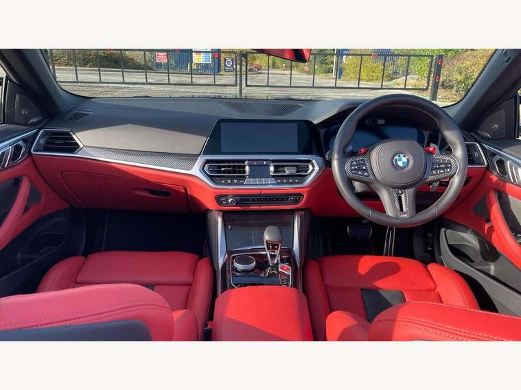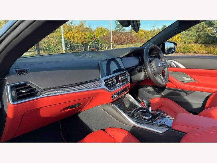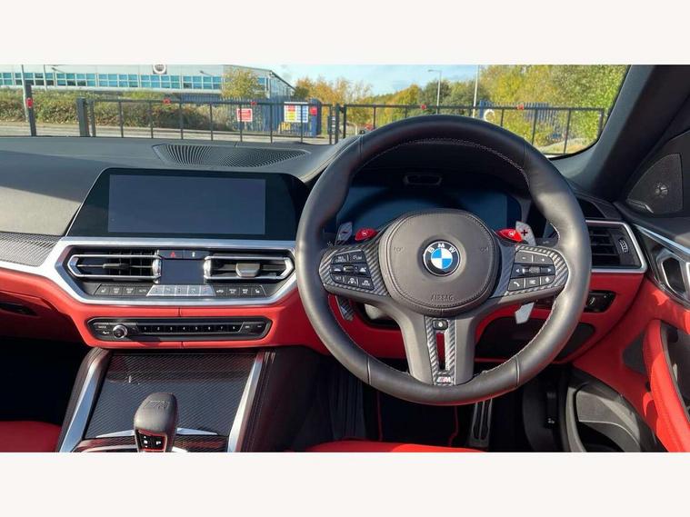 Active guard plus, Automatic start/stop system, BMW iDrive controller on centre console, BMW legal emergency call, BMW Live Cockpit Professional sat nav system with 12.3" instrument display and high resolution control display, BMW Online services, BMW Teleservices, Brake pad wear indicator warning light, Condition based service, Connected drive services, Door/boot open warning light, Driving experience switch, Electric Power Steering (EPS) with Servotronic, Enhanced bluetooth with wireless charging, Head up Display, Instrument cluster with extended contents, Lights on warning, M drive buttons, Oil sensor for level and grade, warning by check control system, Oil temperature gauge, On board computer, On board diagnostics, Optimum shift indicator, Outside temperature display, Pull away assistant, Run flat indicator, Service interval indicator, Speed limiter, Adaptive M Sport suspension, Double joint spring strut front axle, M Drive Professional including track mode, laptimer, traction control & Drift analyser, M Sport differential, M steptronic sport transmission with drivelogic, Safety battery terminal clamp, 8 programmable favourite buttons, Auxiliary point for auxiliary devices, BMW professional radio/CD/MP3, DAB Digital radio, Harman/Kardon loudspeaker system, Acoustic laminated side glass, Auto dimming driver's door mirror, Auto dimming rear view mirror, Automatic headlights + automatic windscreen wipers, Black chrome exhaust tailpipes, Black model designation badges, BMW high gloss shadow line with extended contents, BMW Individual shadowline lights, Body colour bumpers, Body colour door handles, Carbon fibre reinforced plastic (CFRP) roof, Day time running light, Door mirror integrated indicators, Door sill finishers with aluminium inserts, Dynamic brake lights, Electric adjustable heated door mirrors, Electric folding door mirrors, Follow me home headlights, Front and rear bumper system, Front electric windows with open and close fingertip control, anti trap facility and comfort closing, Headlight beam throw control, High beam assistant, High gloss black frameless kidney grille with M badge, LED number plate light, LED tail lights with 3D L-shaped LED light design, M designation, Mirror glass aspheric on driver's side, convex on passenger side, Rain sensor, Rear boot, Rear fog lights, Rear reflectors, Reversing light, Shark fin roof aerial, Third brake light, Visible VIN plate, Welcome lighting, Windscreen wipers with integrated washing jets, 2 cupholders in front centre console, 2 rear head restraints, 2 x 12 V Power sockets (luggage compartment and front centre console), 2 x USB Type C ports for charging and data transmission in front centre console, 2 x USB Type C ports for charging in rear centre console, 40:20:40 split folding rear 2 seat bench with loading system, Ambient lighting, Anthracite headlining, Battery in luggage compartment, Carbon fibre centre console incl. cover for cupholders, Carbon fibre decorative steering wheel finishers, Carbon fibre shift paddles, Carbon fibre strip in instrument panel on front passenger side, Centre console armrest with storage compartment, Compartment in front of cupholder, Driver/passenger sunvisors with illuminated vanity mirrors + covers, Electric front seats + driver memory, English handbook, Floor mats in velour, Footwell lighting, Front and rear door exit lights, Front door storage bins with bottle holder, Front interior light, Front isofix attachment + airbag deactivation, Front seat backrest width adjustment, Front seats lumbar support, Front/rear door armrests, Gearshift lever with embossed M badge, Heated front seats, Height adjustable front headrests, Interior mirror lighting, Isofix on 2nd row seats, Lockable/illuminated glovebox, Luggage compartment lighting, Rake/reach adjustable steering wheel, Single front passenger seat, Storage compartment in rear doors, Storage tray and compartment with cover in centre console, Three zone automatic air conditioning, Toolkit located in luggage compartment, Warm air collar, Additional storage compartment pack - M4, Connected package professional - M4, High gloss shadowline exterior trim pack - M4, 4 x 3 point seatbelts, ABS/EBD, Automatic Stability Control (ASC), Brake energy regeneration, Brake fade compensation, Compound structure brake discs, Cornering brake control (CBC), Crash sensor, Driver/Front Passenger airbags, Dry braking, Dynamic brake control, Dynamic Stability Control with M Dynamic mode, Dynamic Traction Control - DTC, Electromechanical parking brake, Electronic differential lock control (EDLC), Front and rear head airbags, Front seat side impact airbags, Front seatbelt pretensioners + load limiters, Hill start assist, M Sport seat belts, Seatbelt warning, Side impact protection, Two tone horn, Tyre pressure sensor, Warning triangle and first aid kit, Digital key, Electronic immobiliser, Remote central locking, Thatcham cat 1 remote alarm, Vehicle Key with 4 buttons including the integrated key, Galvanic finish to control surrounds, High gloss black interior trim, Tyre repair kit,