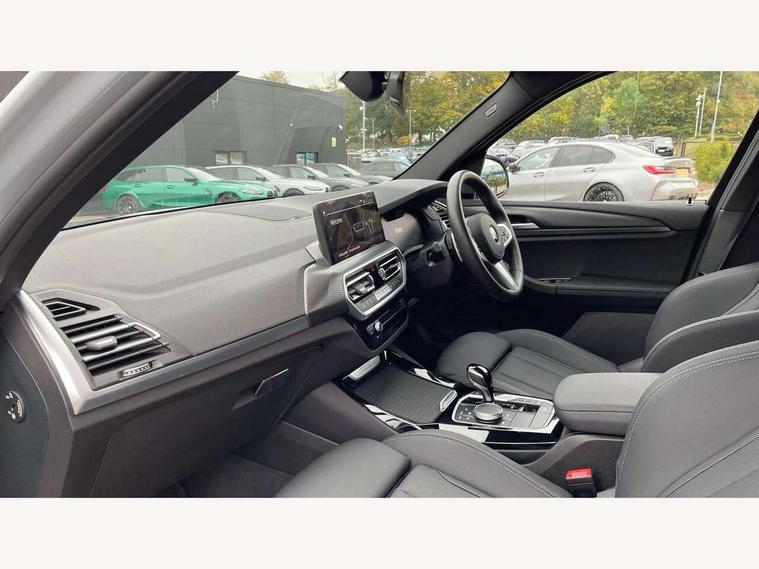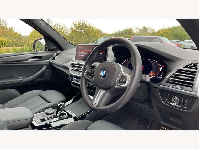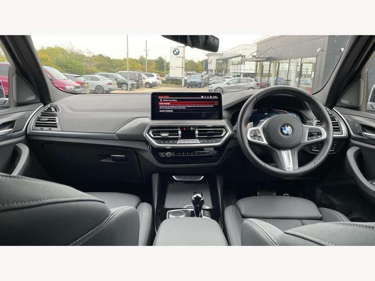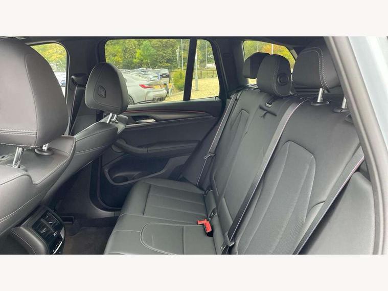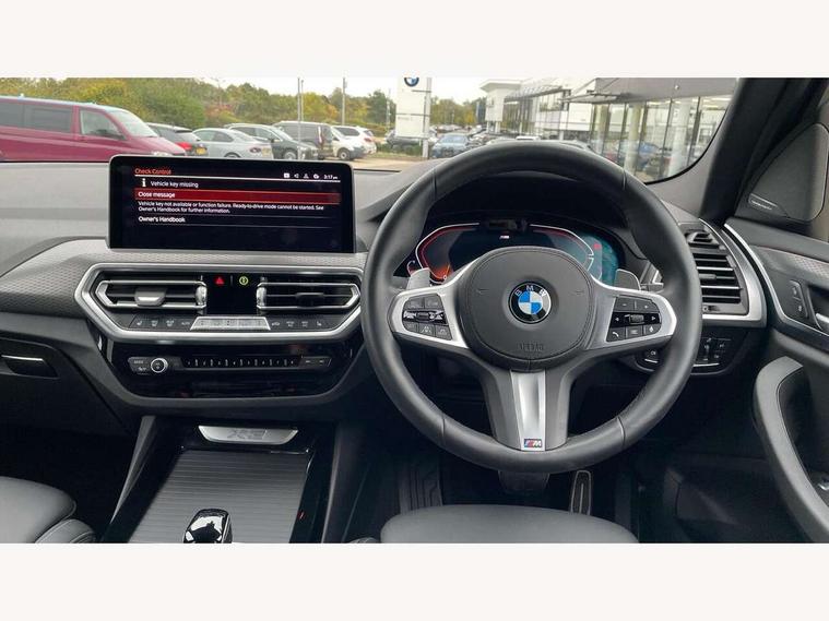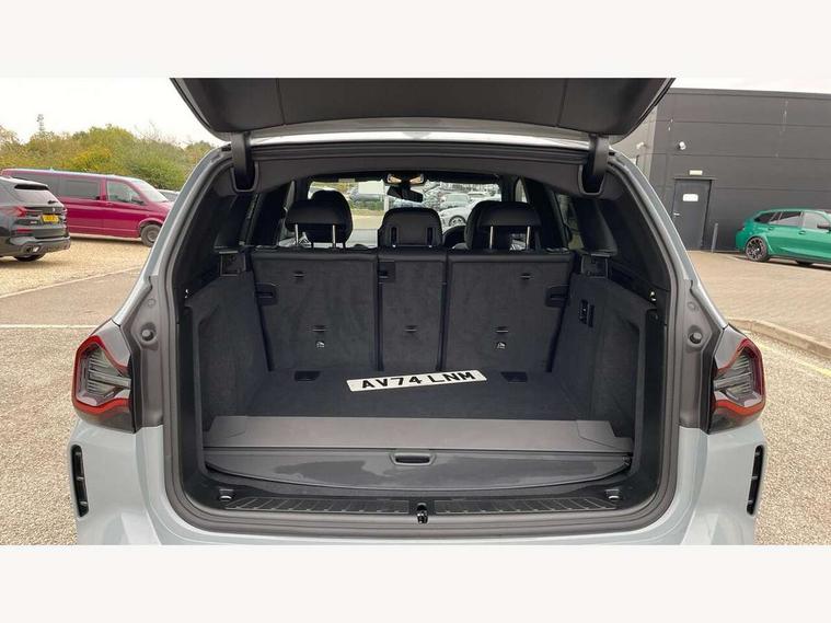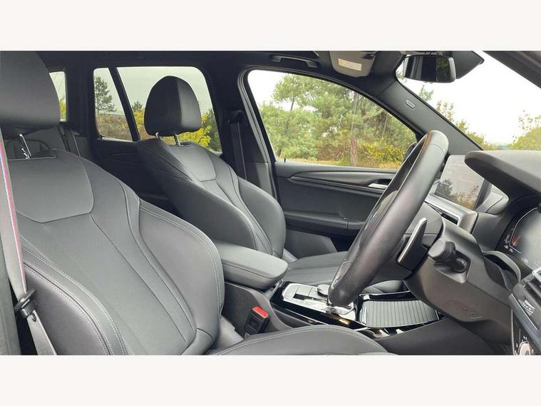 Active Guard, Attentiveness assist, BMW Live Cockpit Professional nav system including 12.3" instrument display + 12.3 high resolution control display, BMW Online services, BMW Teleservices, Brake pad wear indicator in front and rear, Check Control warning system for monitoring of lights and door/luggage compartment open warning, Condition based service - BMW service history, electronic service booklet, integrated owner's handbook, Connected drive services, Electric boot lid, Front/rear Parking distance control, iDrive touch controller with 8 favourite buttons, Instrument cluster with speedometer with mph readout, tachometer, fuel gauge and oil temperature gauge, Lights on warning by audio warning signal when ignition is switched off, Oil sensor for level and grade, warning by check control system, On board computer - average speed+fuel consumption, service interval, clock/date, odometer/trip meter, outside temperature display and ice warning, Optimum shift indicator, Personal Profile - automatic lock when driving away selectable, Run flat indicator, Stop/start system, Variable sports power steering with drive performance control Sport+ mode, Automatic transmission with gearshift paddles, Incorrect fuelling protection, M sport suspension, Multi-link rear suspension, BMW professional radio/CD/MP3, DAB tuner, Acoustic glazing, Automatic windscreen wipers and automatic headlight, Black finish on B pillars, Body colour door handles, Body colour electric adjust heated aspherical door mirrors, Body colour roof mouldings, Body coloured bumpers, Direction indicator, side repeaters, integrated in exterior mirrors, Dynamic brake lights, Exhaust tailpipes - dual, round, split left and right with chrome finisher, Fingertip control / anti-trap function on electric window, Folding wing mirrors with auto dimming, Follow me home headlights, Front and rear bumper system with replaceable deformation elements, Front and rear electric windows, Gloss chrome tailpipes finishers, Green tinted heat insulating glass, Heated windscreen washer jets, High beam assistant, High gloss black shadow line roof rails, High gloss shadowline exterior trim in decorative moulding side frame/recess cover/guide rail/B, C pillars/mirror frame and triangle with mirror base, High level 3rd brake light incorporating LED Technology, Interior rear view electrochromatic mirror with automatic anti dazzle function, LED tail lights, Lightweight engineering, M aerodynamic bodystyling, M Sport entry door sill strips, Model designation, Rain sensor, Rear side wing doors, Rear wing door, Rear wiper, Shark fin antenna, Side exterior M designation badges, Visible VIN plate, Welcome lighting, Windscreen wipers with adjustable interval, 12V power point in luggage area, 12V power socket in front centre console, 2 x USB Type C ports for charging and data transmission (front centre console) and 2 x USB Type C ports for charging (rear centre console), 3 rear headrests, 3 seat bench in 2nd row, 3 zone automatic air conditioning, 4 lashing points to secure luggage, 40:20:40 split folding rear seat with loading system, Ambient lighting, Anthracite headlining, Automatic interior light when door is opened/ignition switched off or via remote key, Floor mats in velour, Foldable storage floor with compartment, Four grab handles integrated in roof lining, Front and rear bottle holders integrated into door trim storage compartments, Front and rear side armrests integrated into door trim, Front centre armrest with storage compartment, Front footwell lights, Front head restraints, Front passenger seat, Front sports seats, Front/rear courtesy lights with soft on/off dimming, Front/rear reading lights, Heated front seats, Isofix rear child seat preparation, Leather gear knob, Lockable glove compartment, Luggage area underfloor compartment, Luggage compartment lighting, M sport leather steering wheel, Multifunction steering wheel, Parcel shelf removeable and storable under boot floor, Reach and rake adjustable steering column, Rear centre armrest with 2 cupholders, Removable / retractable luggage cover, Slope adjustable rear seats, Storage compartment in rear centre console and front/rear door trims, Sun visors with vanity mirrors and ticket pocket, Toolkit located in luggage compartment, Two front cupholders with removable oddments tray/lid, Connected pro pack - X3, ADB - Automatic Differential Brake, Anti-lock braking system (ABS) with brake assist, Automatic Stability Control (ASC), Battery safety cut-off, BMW emergency call, Brake drying, Brake energy regeneration, Braking pre-tensioning, Child locks on rear doors, Cornering brake control (CBC), Crash Sensor - activation of central locking release, hazard warning light and interior lighting, Deactivation of fuel pump in the event of a crash, Driver and front passenger front and side airbags with passenger deactivation and ITS front and rear head airbags, Driver and front passenger knee airbag, DSC+, Dynamic brake control, Dynamic Traction Control - DTC, Electromechanical parking brake, Hill descent control, Hill start assist, Seatbelt security check for front seats, Side impact protection, Three point seatbelts to all seats with front and outer rear pyrotechnic belt tensioners and seat belt force limiters, Two tone horn, Tyre pressure sensor, Ventilated front and rear disc brakes, Warning triangle and first aid kit, Central locking switch for all doors, fuel filler cap and luggage compartment, Electronic engine immobiliser, Locking wheel nuts, Remote control including two integrated key - one button for open/close all lockable content, windows and separate button for open luggage compartment, Remote control Thatcham category 1 alarm, Start/stop button with Comfort Go keyless engine start and auto Start/stop deactivation button, Low rolling resistance tyres,