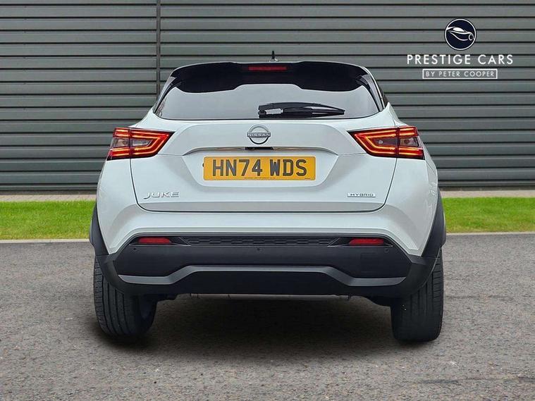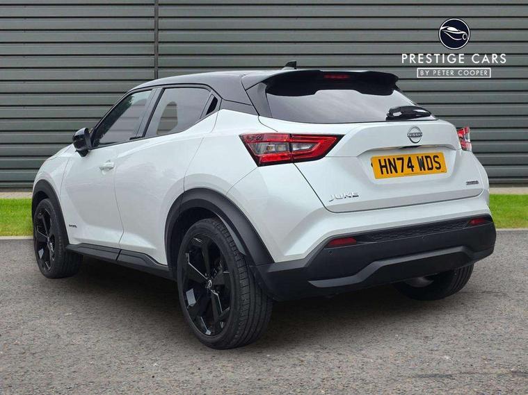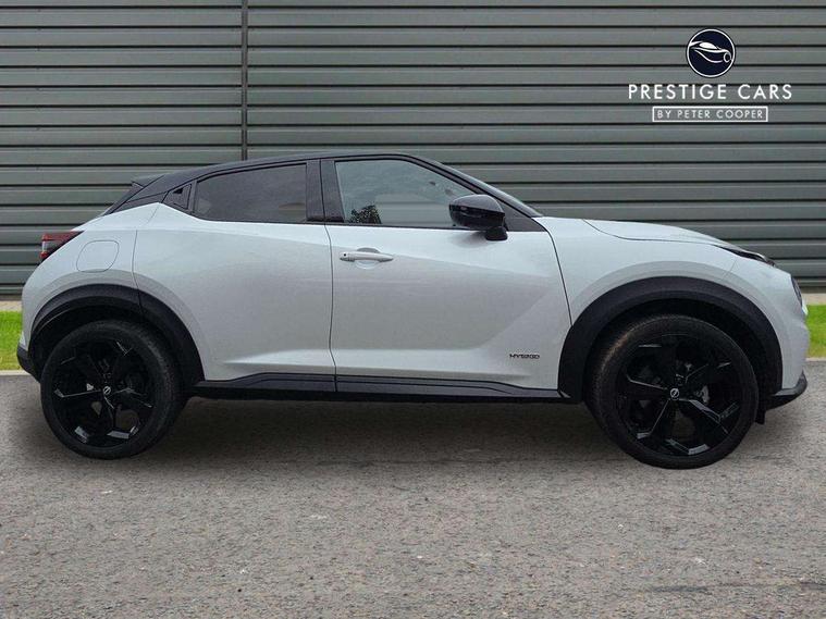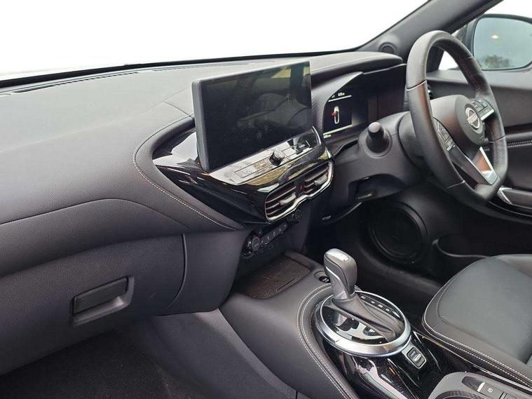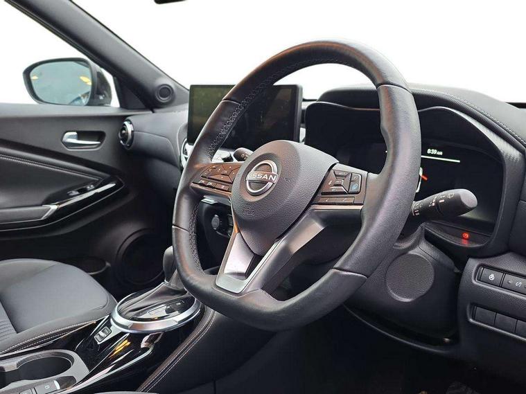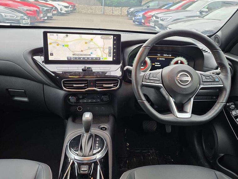 12.3" full colour TFT screen combimeter, Drive modes select (Eco, normal and sport), e-Pedal step, Emergency and breakdown call, EV mode switch, Front parking sensor, Intelligent driver alert system, Intelligent lane intervention, Lane departure warning system, Nissan connect 12.3" touch screen entertainment system, Nissan connect nav with TomTom traffic, Nissan connect services, Outside temperature sensor, Power Steering, Rear parking sensor, Stop/start button, Traffic sign recognition, Trip computer, Voice recognition, WiFi connectivity, Wireless Apple CarPlay and Google Android auto, Wireless Smartphone charger, 10 Bose speakers 6 speakers and 2 headrest speakers for driver/passenger seats, 2 X Rear console USB port, Bluetooth system, USB, Aux-in and 12V socket, Bose personal sound stage control, DAB Digital radio, Auto dimming frameless rear view mirror, Automatic hazard signal with emergency stop signal, Body colour door handles, Electrically adjustable door mirrors with integrated indicators, Follow me home headlights, Front and rear electric window with one touch driver window, Heated and auto folding door mirrors, High beam assist, LED 3rd brake light, LED daytime running lights, LED front fog lights, LED headlamps, LED rear fog lamp, LED rear lamps, One touch passenger window, Rain sensor windscreen wipers, Rear privacy glass, Rear side wing doors, Rear wiper, Roof spoiler, Shark fin roof antenna in solid Black, Three blink turn signal, 3 height adjustable rear headrests, 3 seat bench in 2nd row, 60/40 split folding rear seat, Automatic climate control, Card holder on driver sunvisor, Door ambient lighting, Driver seat back pocket, Driver side rear coat hanger, Driver/passenger sunvisors and vanity mirrors, Front and rear cabin lights, Front armrest, Front door pockets with bottle holders, Front head restraints, Front/rear passenger grab handles, Gear console ambient circle lighting, Height adjustable driver's seat, Internal chrome door handles, Leather gearshift knob, Luggage board, Luggage space lighting, Monoform sporty seats, Multifunction steering wheel, Passenger seat back pocket, Rear door bottle holders, Single front passenger seat, Smooth synthetic leather steering wheel, Synthetic leather kneepad, Synthetic leather upholstery, Telescopic steering wheel adjustment, Two cupholders in front centre console, Two rear isofix child seat anchorage points with top tether, Welcome light and console tray ambient lighting, Heat pack with height adjustable passenger seats - Juke, ProPilot pack - Juke Auto, ABS with EBD and brake assist, Active ride control, Active Trace Control, Driver and passenger airbags, Driver and passenger side airbags, Electric handbrake with auto hold function, Electronic Stability Programme (ESP), Front and rear curtain airbags, Height adjustable seatbelts, Hill start assist, Intelligent emergency braking with pedestrian and cyclist recognition, Rear door child safety locks, Seatbelt reminder for driver/front passenger and rear seats, Three 3 point rear seatbelts, Traction control, Tyre pressure monitoring system, VDC Dynamic Vehicle Control, Alarm, Immobiliser, Intelligent key and start push button with walk away lock and approach unlock functions, Remote central locking, 19" Alloy wheels, Tyre puncture repair kit,