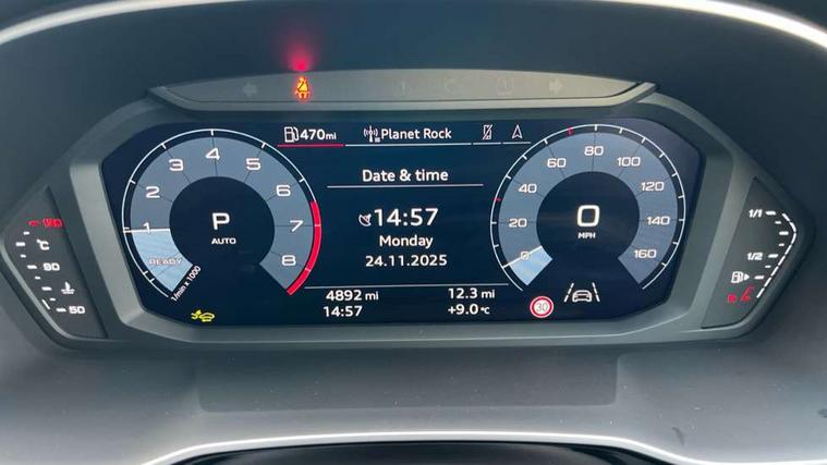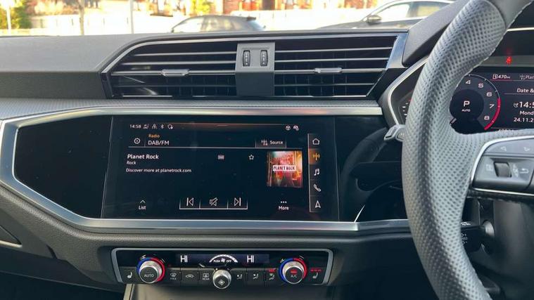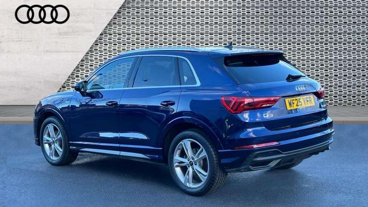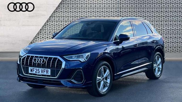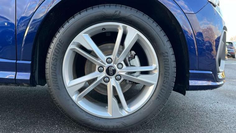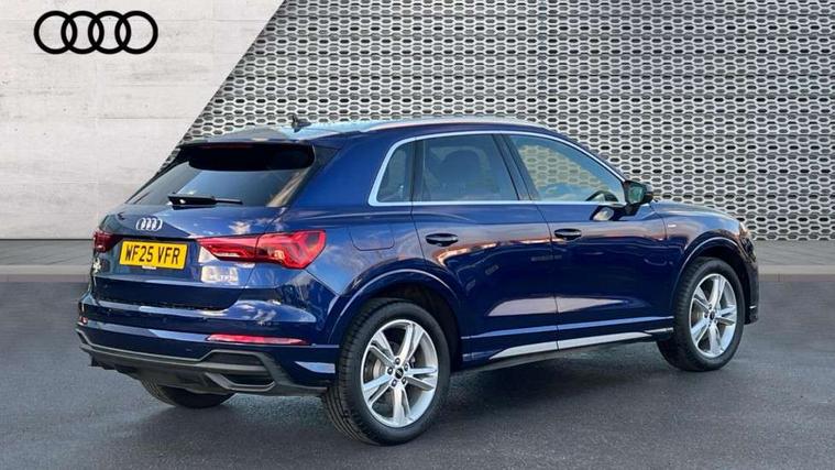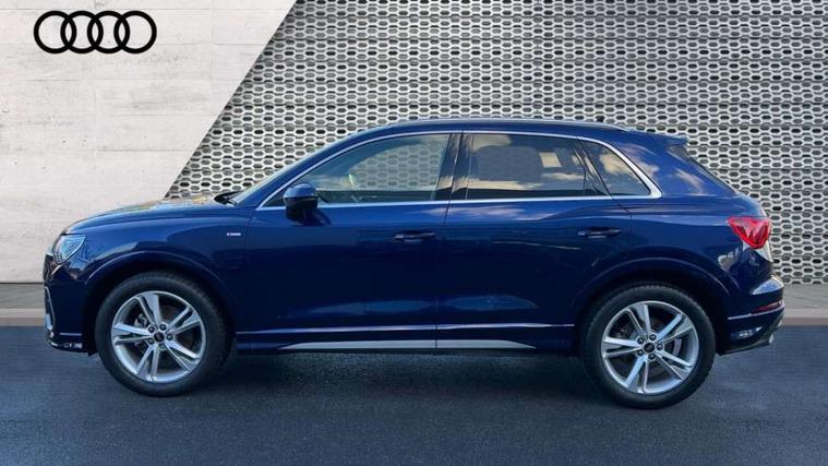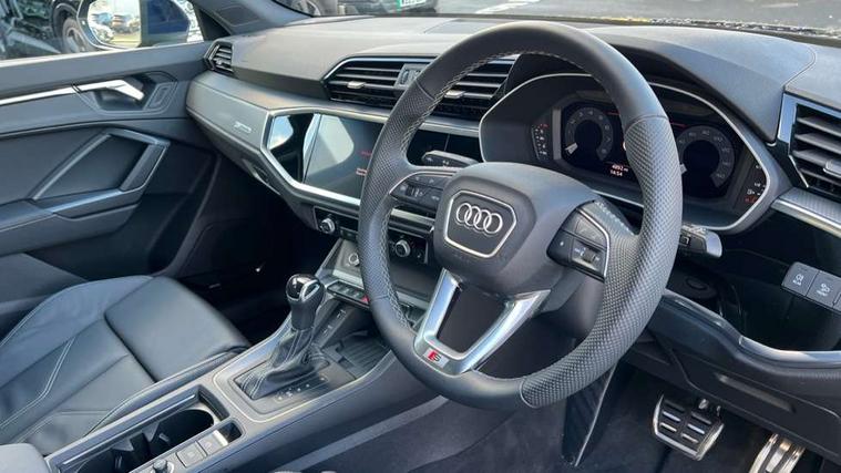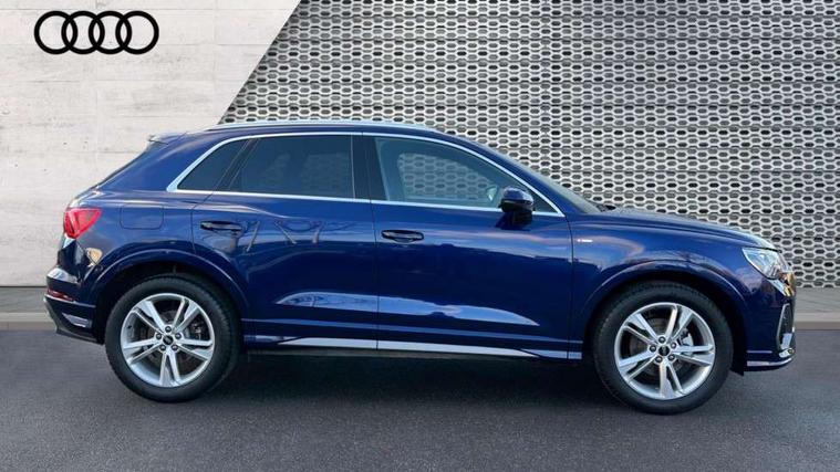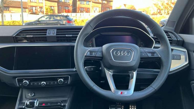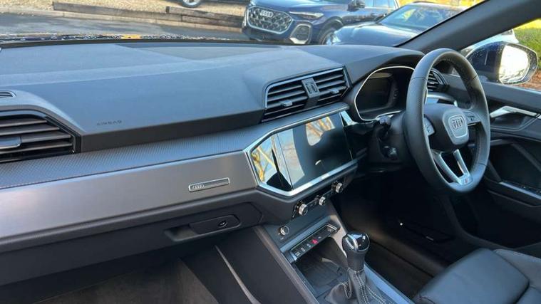 Amazon alexa Integration, Audi connect safety and service, Audi drive select, Audi lane departure warning, Audi Virtual Cockpit - 10.25" display, Bluetooth interface, Camera based traffic sign recognition, Distraction and Fatigue warning, Legal emergency call, MMI Navigation Plus with high resolution 10.1 inch touchscreen colour display, Power operated tailgate, Progressive steering, Service interval indicator, Smartphone interface includes wireless Apple carplay/Android Auto, Start stop system with recuperation, Voice control system with natural language interaction, Sports suspension, 2 USB-C ports with charge and data functions, 6 passive loudspeakers, DAB digital radio module, Acoustic windscreen, Aluminium roof rails, Aluminium window trim, Anthracite black radiator grille, Auto dimming door mirrors, Auto dimming frameless rear view mirror, Body colour front spoiler blade, Electrically folding, adjustable and heated door mirrors with integrated LED side indicators and kerb view function for passenger side, Front and rear electric windows, Front fog lights, Front side air inlets in matt platinum grey, Grille vertical bars in aluminium silver/Matt, High gloss black finish B and C pillars, LED Dynamic rear indicators, LED headlights with LED daytime running lights, LED rear lights, LED third brake light, Privacy glass dark tinted rear and rear-side windows (from B-pillar backwards), Rain and light sensors, Rear diffuser grille in grained matt black, Rear diffuser strip in matt anthracite black, Rear side wing doors, Rear wiper, S line badges on front wings, S line front and rear bumpers and side skirts in contrasting Manhattan grey paint finish, Side skirt insert in matt Platinium grey, Variable front intermittent wipers, 12V socket in rear centre console, 3 seat bench in 2nd row, 3 spoke leather multifunction steering wheel features S badging and grips in perforated leather with contrast stitching, 40:20:40 folding with manual adjustment for 60:40 forwards/backwards position and backrest angle, Adjustable rear seat bench/backrest with centre armrest and cupholder, Black cloth headlining, Dual zone electronic climate control, Electric lumbar support, Front and rear black floor mats with contrast stitching in rock grey, Front and rear headrests, Front centre armrest, Height and reach adjustable steering wheel, Illuminated door sill trims with S logo, ISOFIX child seat mounting for front passenger with airbag deactivation and outer rear seat including top tether attachment point for outer rear seats, Manual front seats with height adjustment, Perforated leather gearknob, Single front passenger seat, Stainless steel luggage compartment sill finisher, Stainless steel pedals, Twin leather upholstery with front sport seats + S embossing, Non smoking pack - Q3, 3x3 point rear seatbelts, 6 airbags - Driver, front passenger, curtain and side windows, Audi pre-sense front with pedestrain and cyclist recognition, Electrically operated child locks on rear doors, Electromechanical parking brake, Electronic stabilisation control including ABS, ASR and EDL, Front seatbelt reminder, Hill descent control, Hill hold assist, Pre sense basic, Seatbelt monitoring, Tyre pressure warning, Warning triangle and first aid kit, Anti theft wheel bolts, Immobiliser, Remote central locking, Thatcham approved category 1 anti theft alarm, Aluminium look interior elements, Dark matt brushed aluminium inlay, Detail dashboard around MMI touch colour display in glass look, black with surround in aluminium look, Leatherette door armrest,