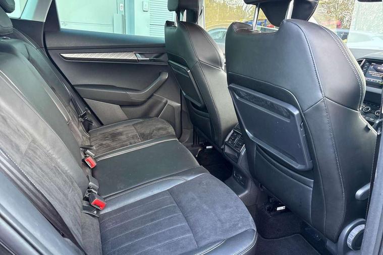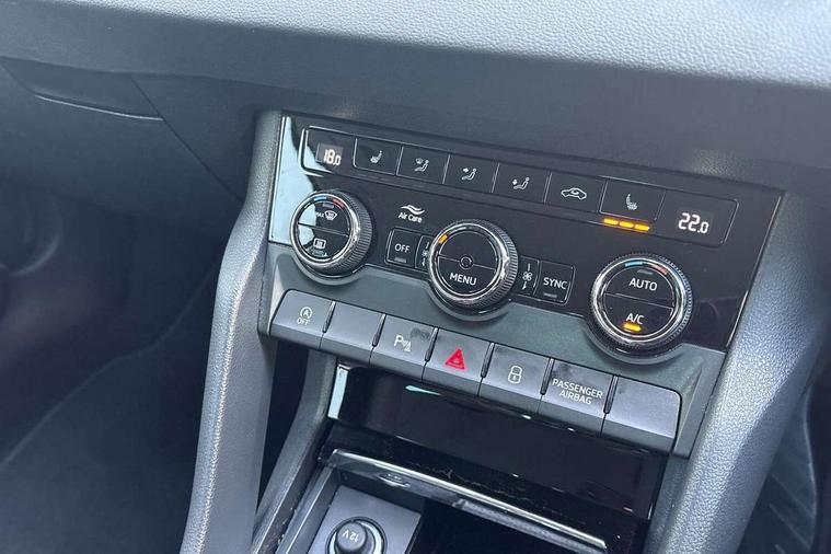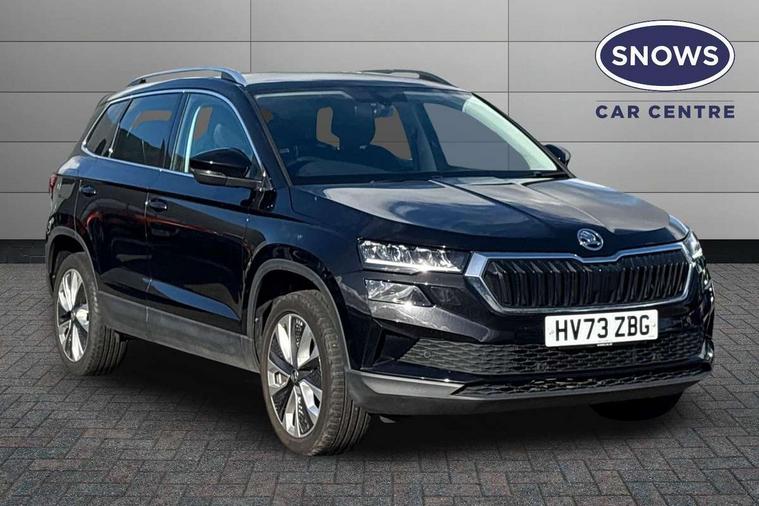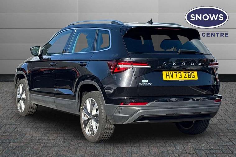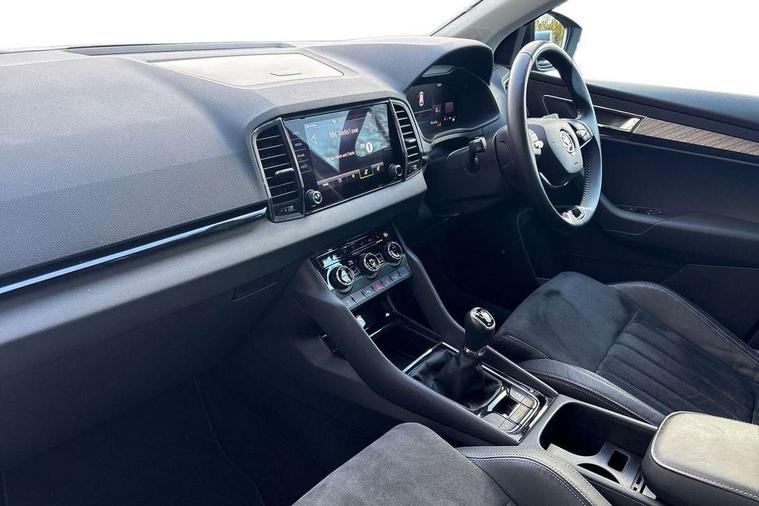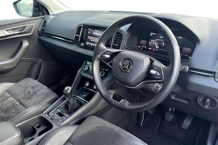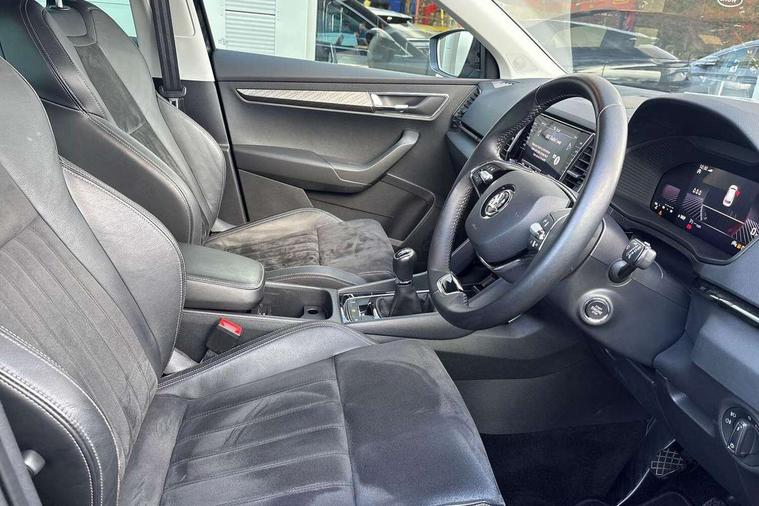 8" Digital display, Care connect, Driver fatigue sensor, Emergency services call system, Outside temperature gauge, Service interval indicator, SmartLink wireless for Apple and wired for Android, Start/stop system with regenerative braking, USB C Port x 2 in front centre console, 8 Speakers, DAB radio with Bluetooth, USB connection, Acoustic glass, Aero front windscreen wipers with intermittent function, Auto dimming rear view mirror with light and rain sensors, Black electric window control buttons, Body colour door mirrors and handles, Dynamic headlight range control with cornering light function, Electric front and rear windows with child proof lock, Heated rear windscreen, LED daytime running lights, LED rear lights with high functionality welcome effect and dynamic indicators, Light assistant (coming/leaving home/tunnel light), Plastic scuff plates, Privacy glass, Rear side wing doors, Rear spoiler, Rear window wiper with washer system and intermittent control, Safety reflectors on front doors, 1.5 litre bottle holders in driver and front passenger door panels, 12V socket in boot, 12v socket in front centre armrest with storage compartment and rear air vents, 2 spoke leather heated multifunction steering wheel, 2 x Tablet holder, 3 rear height adjustable headrests, 3 seat bench in 2nd row, 4 foldable roof handles with rear coat hooks, Black floor carpet, Chrome inner door handles, Double sided boot floor, Foldable hooks in the boot, Front head restraints, Height adjustable front three point seats belts with tensioners, Height/reach adjust steering wheel, Ice scraper, Illuminated glovebox, Illuminated luggage compartment, Isofix child seat preparation for front passenger seat, Isofix child seat preparation outer rear, Manual lumbar support for front seats, Pen holder, Pollen filter, Rear boot cover, Rear reading lights, Rubbish bin door, Safety vest holder, Single front passenger seat, Storage box in upper central dashboard closed, Sunvisors with illuminated vanity mirrors, Textile floor mats, Ticket holder, VarioFlex seats with standard rear seat release, Boot pack - Karoq, Design Pack - Karoq, Parking pack - Karoq, Automatic door unlocking in case of crash, Automatic fuel cut off in case of crash, Child locks on rear doors, Driver airbag, Electronic parking brake with auto hold function, Emergency rear braking signal, ESC including ABS, MSR, ASR, EDS, HBA, DSR, RBS, MKB and traction control, Front side airbags, Hill hold control, Knee airbags, Passenger airbag with switch-off function, Pedestrian monitor, Seatbelt reminder signalisation and pretensioner for all seats, Three point seatbelts rear, Two tone horn, Tyre pressure display, Tyre pressure monitor, Alarm with interior monitoring, back up horn and tilt sensor with safe function, Electronic engine immobiliser, Keyless entry and start/stop, Remote central locking with 2 remote folding keys, Chrome framed air vents, 18" Miran alloy wheels in black, Anti-theft wheel bolts protection, Tool kit,
