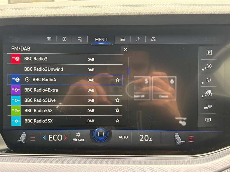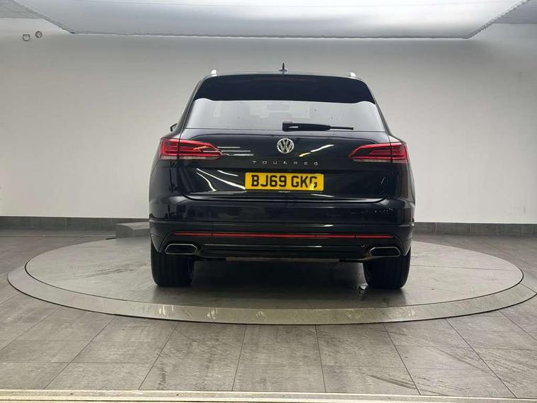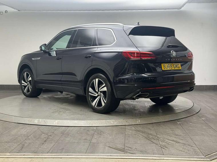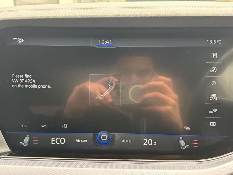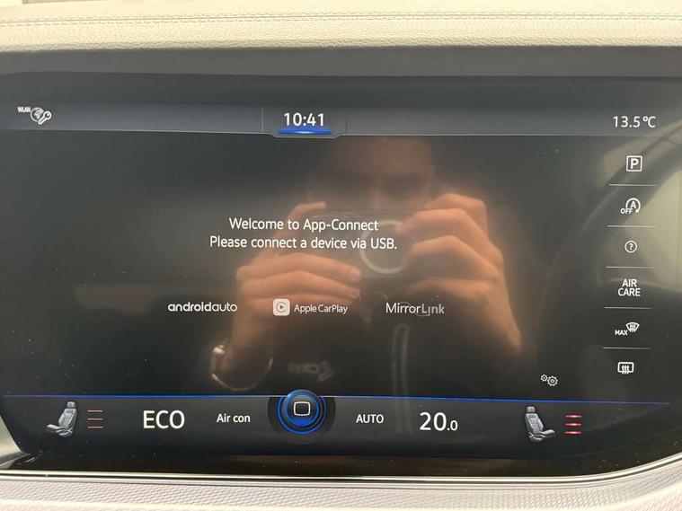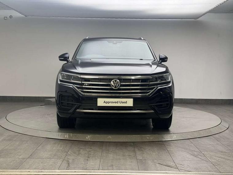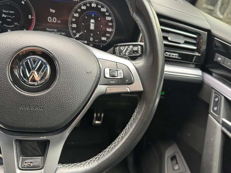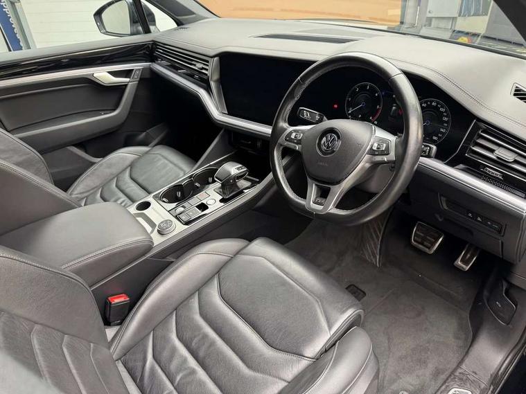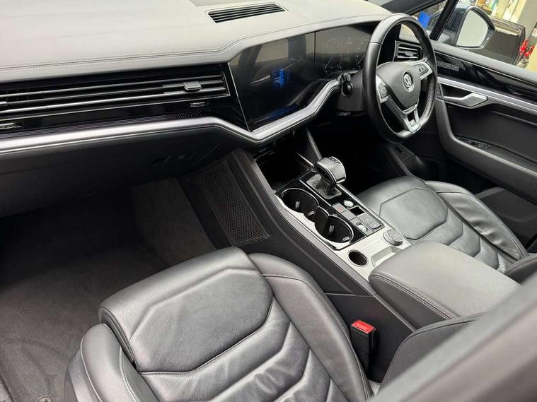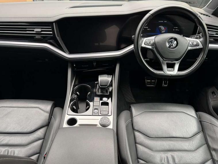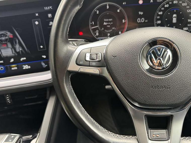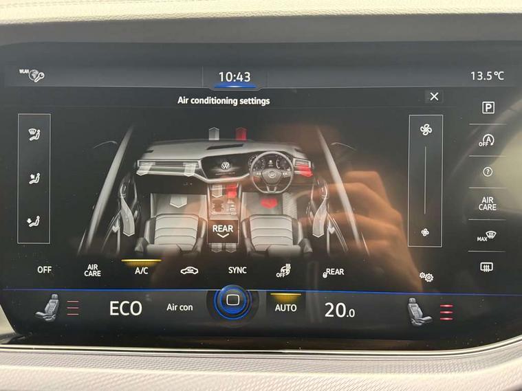 ACC - Adaptive cruise control with front assist, forward collision warning, distance monitoring, city emergency brake and speed limiter, Apple car play/Android Auto, Bluetooth hands free telephone connection, Drive select with Damper control, Driver alert system, Dynamic road sign display camera controlled system with visual warning for traffic and road signs, Instrument cluster, MirrorLink, Multifunction camera with lane assist, Multifunction computer, Park assist with rear view camera, Service interval indicator, Speed sensitive power steering, Start/stop system with regenerative braking, Tailgate power latch, Traffic sign recognition, Voice control system, Wireless Smartphone charger, Torsen limited slip differential, 2x SD card slot, DAB Digital radio, Gesture control for infotainment system, Auto dimming rear view mirror, Automatic coming/leaving home lighting function, Automatic headlights, Black rear diffuser, Body colour bumpers, Body colour door handles, Body colour door mirrors with integral indicators, Body coloured side skirts, Chrome exhaust tailpipes, Chrome protective strip on door sill, Chrome trimmed radiator grille and air intake, Chrome trimmed side windows, Front and rear electric windows, Headlight range control, Heated windscreen washer jets, LED cornering headlights, LED daytime running lights, LED Indicators, Puddle lights, Rear fog lights, Rear wiper, 12V Accessory socket in centre console, 3 rear head restraints, 4 load lashing points, 4 way adjustable front head restraints, 4 way electric lumbar support for driver and front passenger, 4 zone climate control, 60/40 split folding slide/recline rear seat, Driver/front passenger seat height adjustment, Electric luggage compartment cover, Folding rear centre armrest with 2 cupholders, Front + rear carpet mats, Front centre armrest with storage box, Gear shift indicator, Height/reach adjust steering wheel, Isofix preparation for 2 rear child seats, Jack and tool kit, Leather heated multifunction steering wheel with paddle shift, Leatherette door trim, Load through provision, Soul black headlining, Stainless steel load sill protection, Stainless steel pedals, Sunvisors with illuminated vanity mirrors, Innovision cockpit pack with Digital cockpit - Touareg, 3 point front seatbelts with pre-tensioners, ABS, Active bonnet, Automatic post collision braking system, Curtain airbags, Driver/Front Passenger airbags, EBD + Brake Assist, EDL, Electronic parking brake with auto hold, ESC with ASR, Front seat side impact airbags, Hill descent control, Passenger airbag deactivate switch, Seatbelt warning lamp and buzzer, Three 3 point rear seatbelts, Two tone horn, Warning triangle and first aid kit, Alarm with interior monitoring in cab, backup horn and towing protection, Anti-theft wheel bolts, Remote central locking, Aluminium dash and door panel inserts, High gloss black centre console, Temporary space saver steel spare wheel,