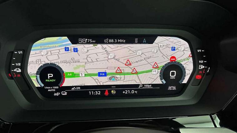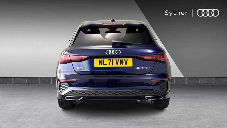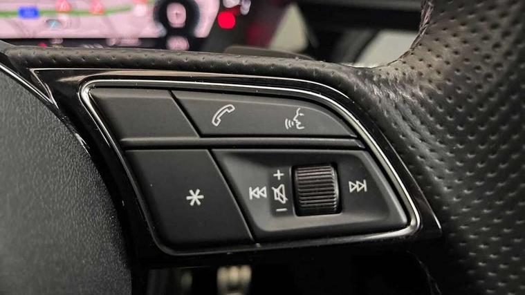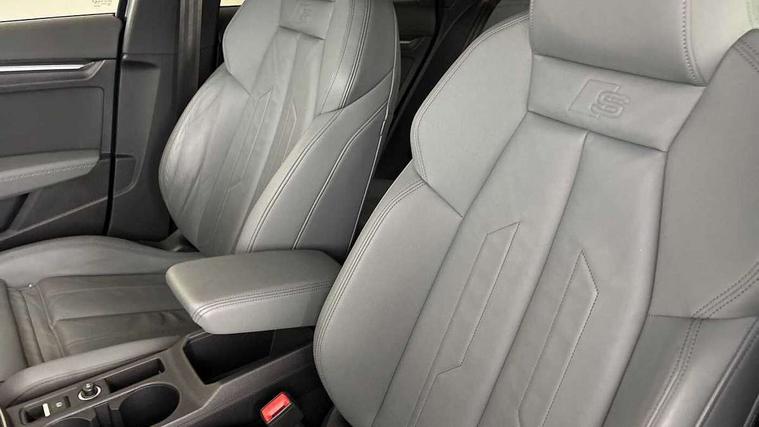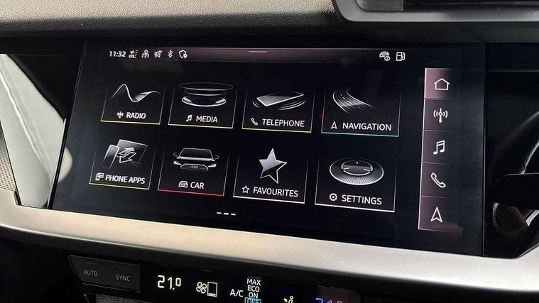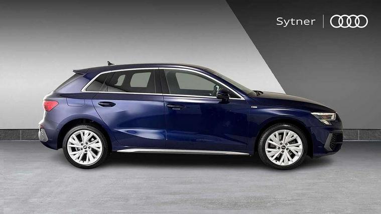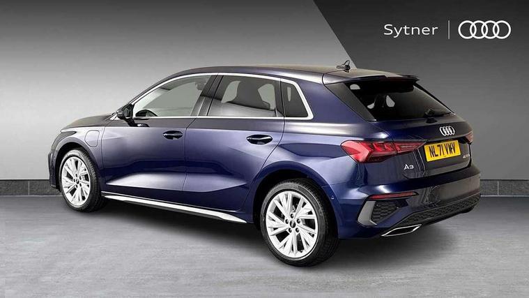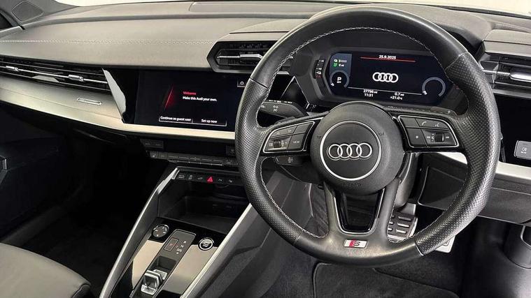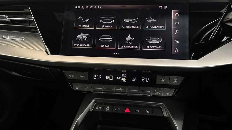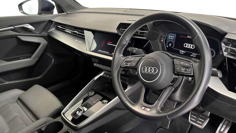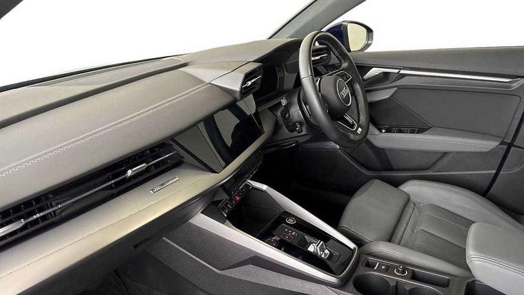 Audi connect emergency call and service, Audi drive select (Auto, Comfort, Dynamic, Efficiency and Individual), Audi smartphone interface, Audi Virtual Cockpit - 10.25" digital and colour instrument cluster, Automatic start/stop system with recuperation, Bluetooth interface, Collision avoidance assistant, Electromechanical power speed sensitive steering, Lane departure warning system, MMI Navigation Plus with high resolution 10.1" colour touch screen display, Service indicator, Trip computer, Voice control system with natural language interaction, 3 pin 10 amp domestic charging cable, Type 2 mode 3 32 amp charging cable, Type 2 socket for AC charging, 2xUSB-C connection with data and charging functions, 6 passive loudspeakers, DAB Digital radio, 3rd brake light, Acoustic glass windscreen, Aluminium window trim, Auto dimming frameless rear view mirror, Electrically adjustable/heated/folding/dimming door mirrors with kerb view includes integrated LED indications + kerb view function for passenger side, Front electric windows, Illuminated aluminium inserts front door sills with S logo, LED daytime running lights, LED headlights with LED rear lights and dynamic rear indicators, Light and rain sensors, Privacy glass - dark tinted rear window, rear door and side windows, Rear electric windows, Rear side air outlets in grained matt black, Rear wiper, S line bumpers, S roof spoiler, 12V socket and storage compartment in front centre console, 40/20/40 split folding rear seat bench with cupholder, Black cloth headlining, Dual zone electronic climate control, Front and rear centre armrest in leather, Front and rear headrests, Front/rear floor mats, Height and reach adjustable steering wheel, Interior lighting - glove compartment light and right hand side, Luggage compartment floor covering, Manual boot compartment lid, Manually adjustable front seats, Seat side bolsters, Stainless steel pedals and front footrest, Tool kit, Twin leather upholstery with front sports seats S embossed logo, Aluminium interior elements pack - A3 Sportback, S line styling pack - A3 Sportback, 3x3 point rear seat belts, Driver and front passenger airbag with passenger airbag deactivation, Electronic Stabilisation Control (ESC) including ABS, ASR and EDL, First aid kit with warning triangle and 2 safety vests, Front side airbags with head airbags and interaction airbag, Hill hold assist, Pre-sense front with pedestrian and cyclist detection, Seatbelt monitoring, Tyre pressure loss indicator, Anti theft alarm, Anti-theft wheel bolts, Electronically operated child lock, Immobiliser, Remote control central locking, Accent surfaces in the dashboard and centre console in platinum grey silk effect paint finish, Dark spectrum aluminium inlays, Tyre repair kit,