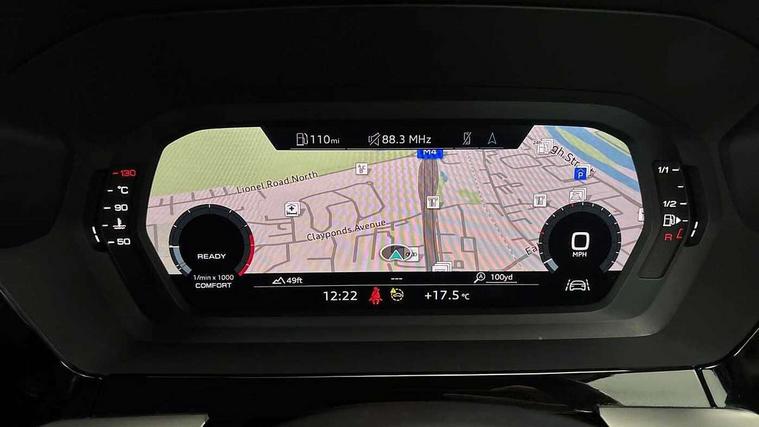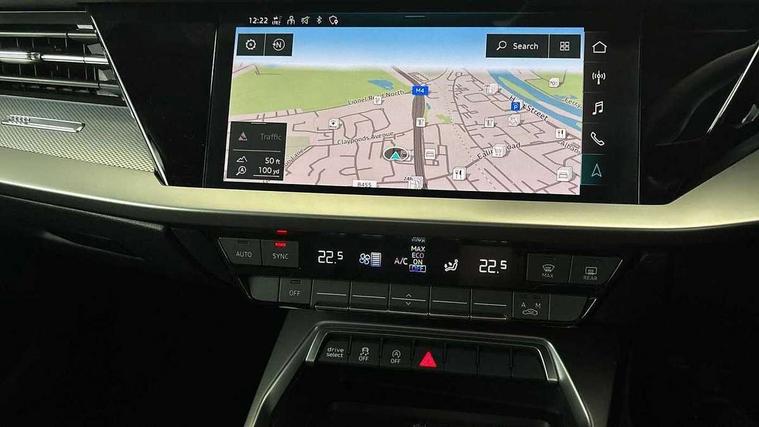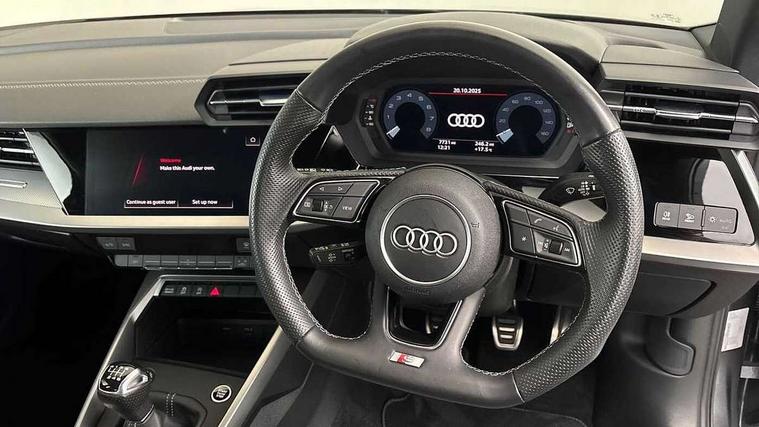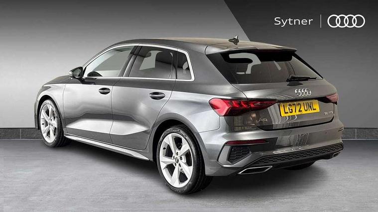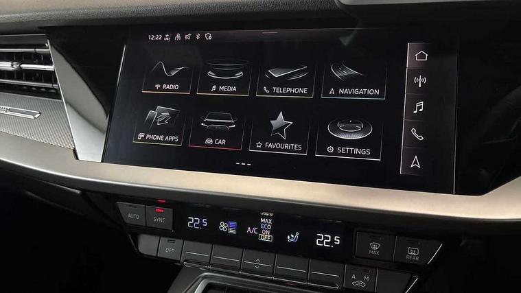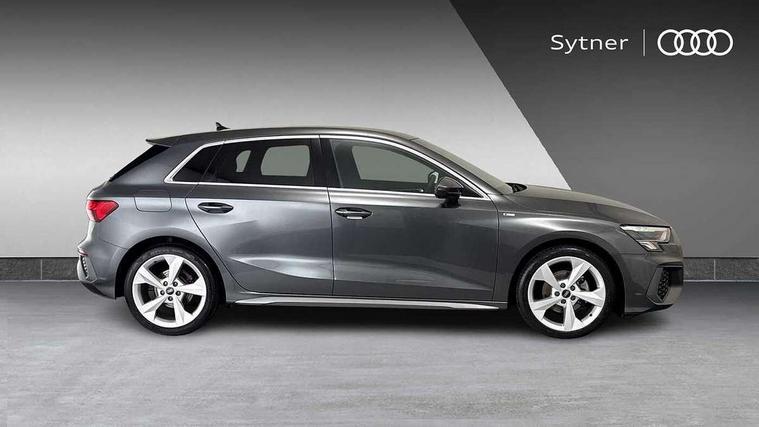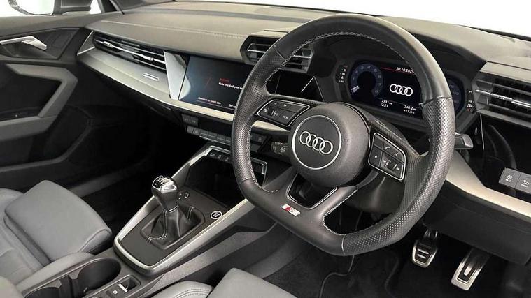 Audi drive select (Auto, Comfort, Dynamic and Individual), Audi smartphone interface, Audi Virtual Cockpit - 10.25" digital and colour instrument cluster, Automatic start/stop system with recuperation, Bluetooth interface, Collision avoidance assistant, Cruise control, e-Call (emergency call), Electromechanical power speed sensitive steering, Lane departure warning system, MMI Navigation Plus with high resolution 10.1" colour touch screen display, Rear parking sensors, Service indicator, Trip computer, Voice control system with natural language interaction, 2xUSB-C connection with data and charging functions, 6 passive loudspeakers, DAB Digital radio, 3rd brake light, Acoustic glass windscreen, Aluminium window trim, Auto dimming frameless rear view mirror, Electrically adjustable/heated/folding/auto dimming door mirrors with integrated LED indications + kerb view function for passenger side, Front electric windows, Illuminated aluminium inserts front door sills with S logo, LED daytime running lights, LED headlights with LED rear lights and dynamic rear indicators, Light and rain sensors, Privacy glass - dark tinted rear window, rear door and side windows, Rear electric windows, Rear side air outlets in grained matt black, Rear side wing doors, Rear wiper, S line bumpers, S roof spoiler, 12V socket and storage compartment in front centre console, 3 seat bench in 2nd row, 40/20/40 split folding rear seat bench with cupholder, Black cloth headlining, Dual zone electronic climate control, Front and rear centre armrest in leather, Front and rear headrests, Front/rear floor mats, Height and reach adjustable steering wheel, Illuminated vanity mirror, Interior lighting - glove compartment light and right hand side, Luggage compartment floor covering, Manual boot compartment lid, Manually adjustable front seats, Seat side bolsters, Single front passenger seat, Stainless steel pedals and front footrest in black, Twin leather upholstery with front sports seats S embossed logo, Aluminium interior elements pack - A3 Sportback, S line styling pack - A3 Sportback, 3x3 point rear seat belts, Audi pre sense front, Driver and front passenger airbag with passenger airbag deactivation, Electronic Stabilisation Control (ESC) including ABS, ASR and EDL, First aid kit with warning triangle and 2 safety vests, Front side airbags with head airbags and interaction airbag, Pre-sense front with pedestrian and cyclist detection, Seatbelt monitoring, Tyre pressure loss indicator, Anti theft alarm, Anti-theft wheel bolts, Immobiliser, Manual child locks, Remote control central locking, Accent surfaces in the dashboard and centre console in platinum grey silk effect paint finish, Dark spectrum aluminium inlays,