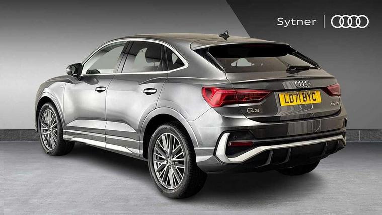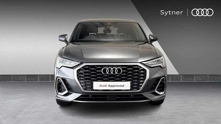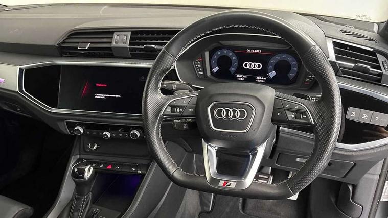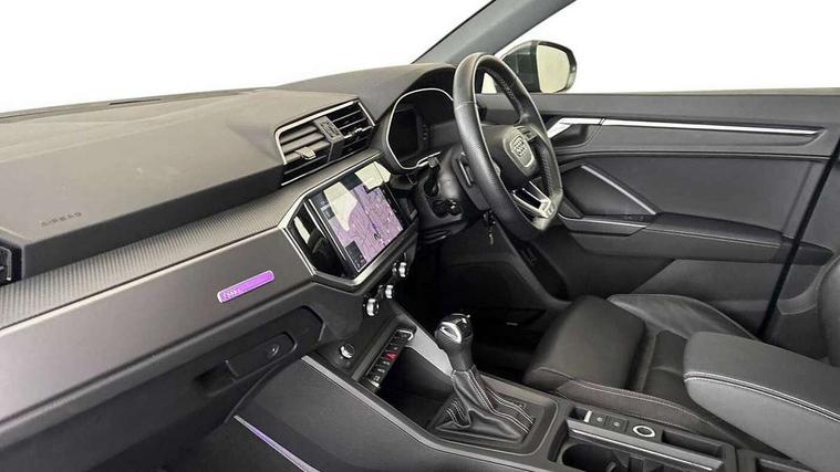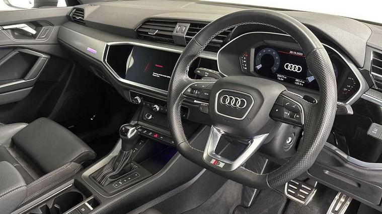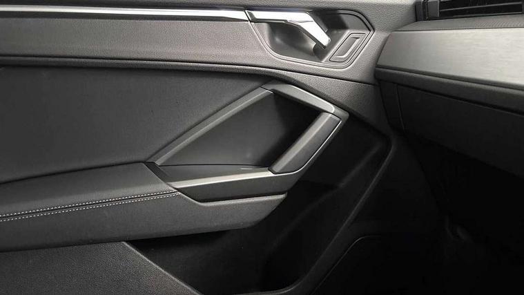 Audi connect safety and service (e-call), Audi drive select, Audi lane departure warning, Audi Virtual Cockpit - 10.25" display, Bluetooth interface, Camera based traffic sign recognition, MMI Navigation Plus with high resolution 10.1 inch touchscreen colour display, Power operated tailgate, Progressive steering, Service interval indicator, Smartphone interface includes wireless Apple carplay/Android Auto, Start stop system with recuperation, Voice control system with natural language interaction, 48V Mild hybrid technology, Sports suspension, 2 USB-C ports with charge and data functions, 6 passive loudspeakers, DAB digital radio module, Acoustic windscreen, Aluminium window trim, Auto dimming frameless rear view mirror, Diffuser grille in grained matt black, Diffuser trim in selenite silver, Electrically folding, adjustable and heated door mirrors with integrated LED side indicators and kerb view function for passenger side, Front and rear electric windows, Front fog lights, Front side air inlets in selenite silver, Front underbody protection in manhattan grey paint finish, Grille surround in aluminium silver matt, High gloss black finish B and C pillars, LED headlights with LED daytime running lights and dynamic rear indicator, LED rear lights, Privacy glass dark tinted rear and rear-side windows (from B-pillar backwards), Radiator grille in titanium black with inlay in matt aluminium silver, Rain and light sensors, Rear underbody protection in matt black, S line badges on front wings, Side skirt insert in matt Platinium grey, 12V socket in rear centre console, 40:20:40 folding with manual adjustment for 60:40 forwards/backwards position and backrest angle, Adjustable rear seat bench/backrest with centre armrest and cupholder, Black cloth headlining, Dual zone electronic climate control, Front and rear black floor mats with contrast stitching, Front and rear headrests, Front and rear roof module including reading lights, Front centre armrest, Glove compartment lighting, Height and reach adjustable steering wheel, Illuminated door sill trims with S logo, ISOFIX child seat mounting for front passenger with airbag deactivation and outer rear seat including top tether attachment point for outer rear seats, Luggage compartment light, Manual front seats with height adjustment, Perforated leather gearknob, Stainless steel luggage compartment sill finisher, Stainless steel pedals, Non smoking pack - Q3, 3x3 point rear seatbelts, 6 airbags - Driver, front passenger, curtain and side windows, Audi pre-sense front with pedestrain and cyclist recognition, Electrically operated child locks on rear doors, Electromechanical parking brake, Electronic stabilisation control including ABS, ASR and EDL, Hill descent control, Hill hold assist, Pre sense basic, Seatbelt monitoring, Tyre pressure warning, Warning triangle and first aid kit, Anti theft alarm, Anti theft wheel bolts, Remote central locking, Black dashboard, Dark matt brushed aluminium inlay, Detail dashboard around MMI touch colour display in glass look, black with surround in aluminium look, Leatherette door armrest, Tool kit, Tyre repair kit,