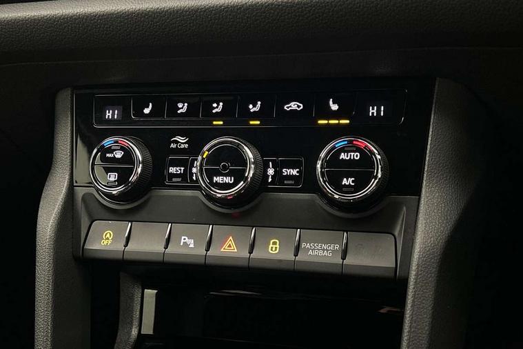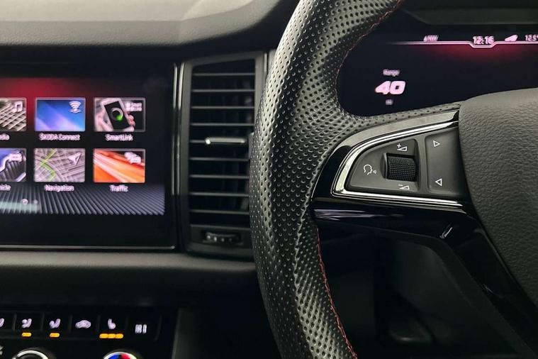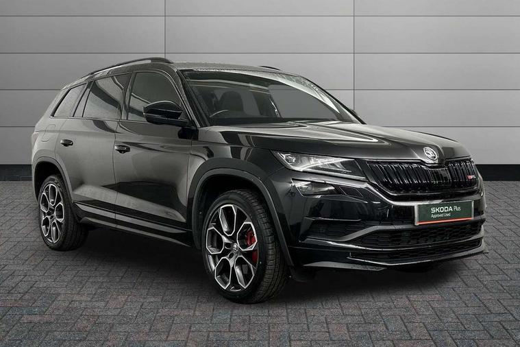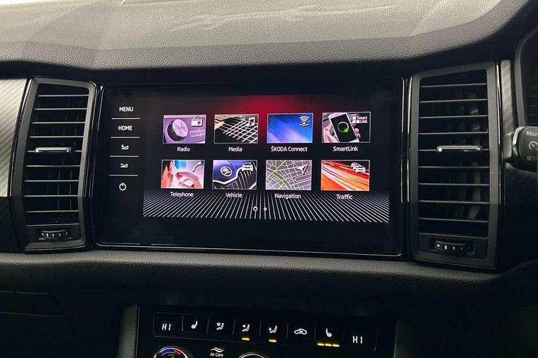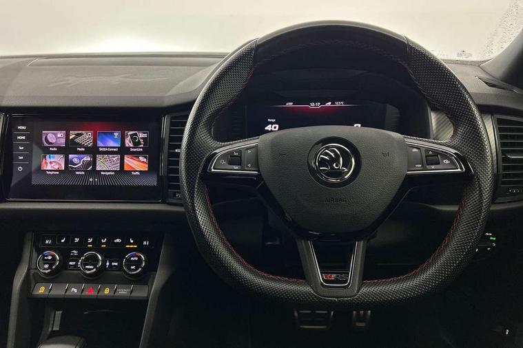 Bluetooth system, Columbus satellite navigation with 9.2" touch screen and integrated Wi-Fi + WLAN, Digital voice enhancement, Drive mode selector, ECO Stop/start function, Exterior temperature indicator, Progressive power assisted steering, SmartLink plus, Speed limiter, Sports dials, Virtual Cockpit - 10.25" digital display, Dynamic Chassis Control including off-road function, Bolero Radio, DAB Digital radio, DVD System, Dynamic sound booster, USB and SD card connectivity, Aero front windscreen wipers with intermittent function, Aero rear window wiper, Auto dimming rear view mirror, Automatic activation of hazard warning lights, Black door mirrors, Black roof rails, Black wheel arch surrounds, Black window surrounds, Body colour door handles, Dual chrome exhaust tailpipe, Electric front and rear windows, Electrically adjustable/heated/foldable and auto dimming door mirrors with memory function, Front and Rear door steps, Full LED Headlights with adaptive front light system and LED daytime running lights, Gloss black front grille, Headlight washers, Heated rear window, High beam assist, LED front fog lights with static cornering light function, LED rear fog light, LED third brake light in rear spoiler, Light assistant (coming home/tunnel light), Rain and light sensors, Rear diffuser, Safety reflectors on front and rear doors, Sunset privacy glass, Tinted windows, vRS badging on front grille and boot lid, vRS front and rear bumpers, 12V socket in boot, 2 rails with 2 hooks including 4 hooks for net programme, 4 foldable roof handles with rear coat hooks, 4 lashing points on luggage floor, 60:40 foldable rear seat with sliding adjustment and backrest angle adjustment, Alcantara door panels, Alcantara upholstery with Sports seats, Aluminium pedals, Black roof headlining, Bottle holders in door panel in the 1.5 litre front and 1 litre rear, Cargo storage compartments, Centre console with open storage box, cup holder and 12V socket, Chrome headlight control button, Chrome interior door handles, Coat hooks on B pillar, Covered storage compartment on driver side, Door sill panels with KODIAQ logo, Front centre armrest with storage compartment, Front/rear courtesy lights, Gear shift lever with chrome frame and black gloss insert, Height adjustable front headrests, Illuminated and cooled glovebox, Illuminated luggage compartment, Isofix system on outer rear seats, LED ambient lighting, Manually adjustable steering column, Net programme in boot (1x horizontal Net, 2x vertical Nets), Overhead glasses storage compartment, Passenger side net compartment on centre console, Pollen filter, Rear centre armrest with cupholders, Removable lamp in luggage compartment, Roll up luggage compartment cover with intermediate position, Small Bags on the inner sides of the front backrests, Small pockets on the inner side of the front backrests, Storage compartment in lower middle Instrument panel, illuminated with closing, Three rear height adjustable headrests, Ticket holder on A Pillar, Umbrella in door panel, Variable boot floor, vRS stitching in door panels, LED Interior Light pack - Kodiaq Scout/Sport Line/VRS/Laurin + Klement, Auto door release and activation of warning lights, Driver and passenger airbags, Electronic parking brake with hill hold control, Emergency rear braking signal, ESC (incl. ABS+MSR+ASR+EDS+HBA+DSR+RBS+MKB), Front and rear three point safety belt on all seats, Front assist includes AEB city/urban, Front side airbags, Fuel cut off safety device, Head and knee airbags, Passenger airbag deactivate switch, Rear disc brakes, Red brake calipers, Safety vest holder in door, Seat belt reminder for all seats, Tailgate unlocking from outside, Two tone horn, Tyre pressure monitor, Warning lights in front doors, Alarm with interior monitoring and tilt sensor with safe function, Immobiliser, Keyless entry and start system (KESSY), Remote central locking, Carbon finish dashboard and door inserts, 20" Xtreme alloy wheels with anti-theft wheel bolts, Tyre repair kit with compressor,