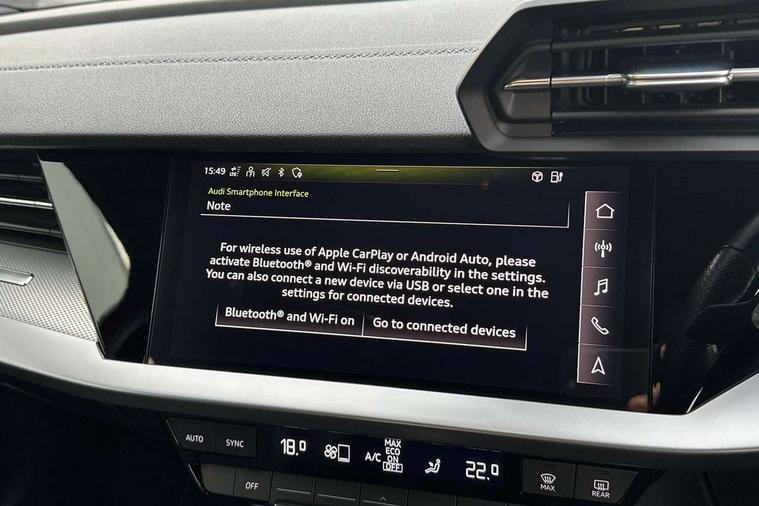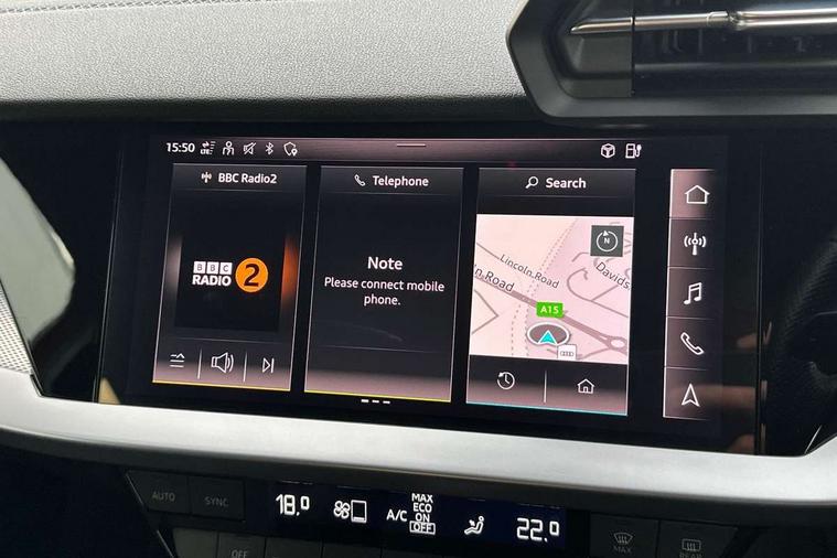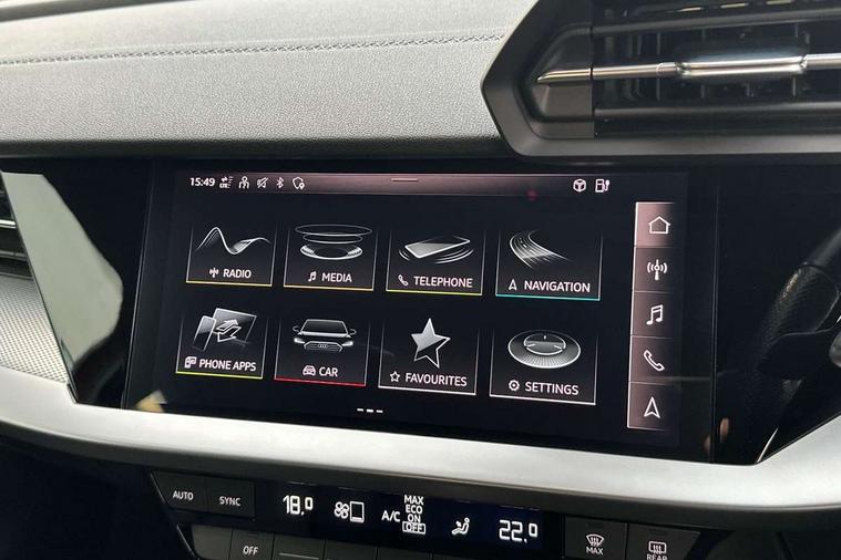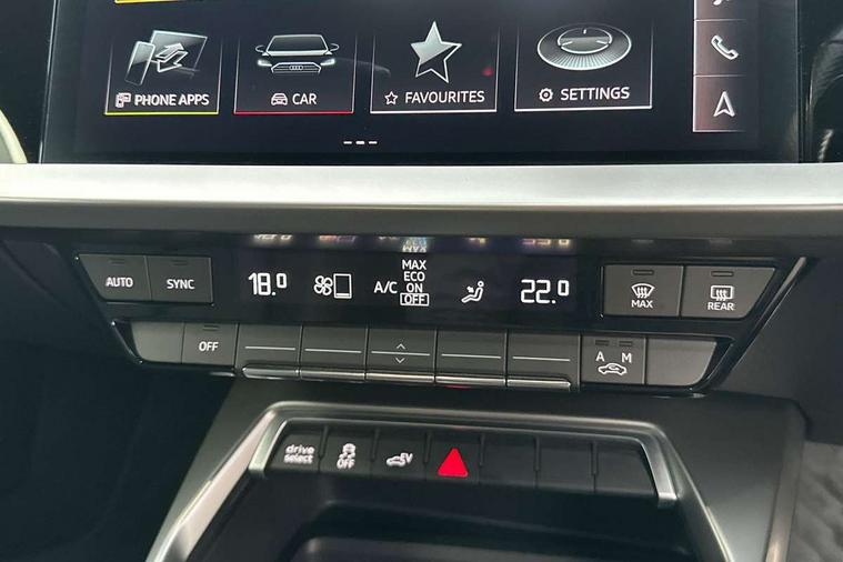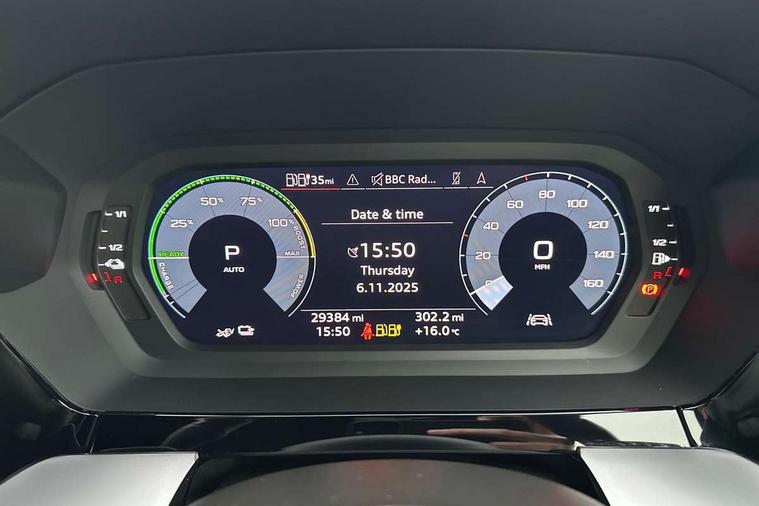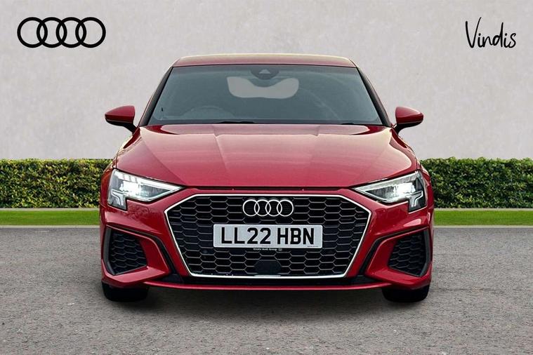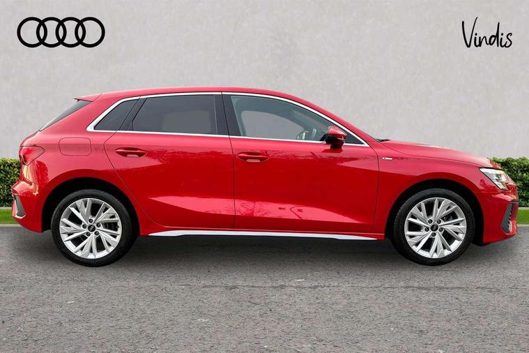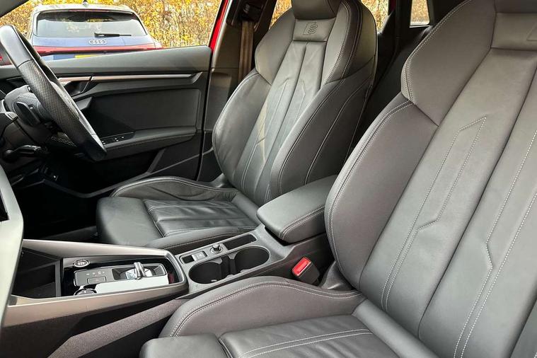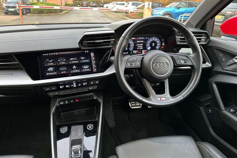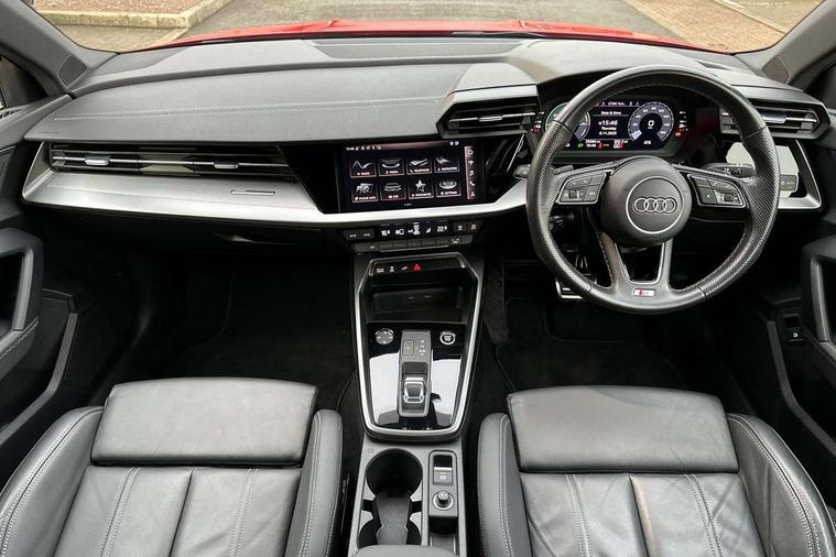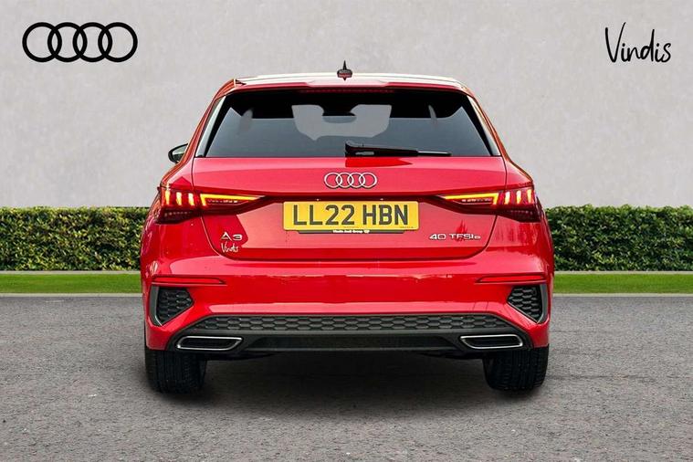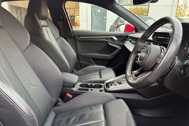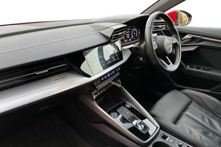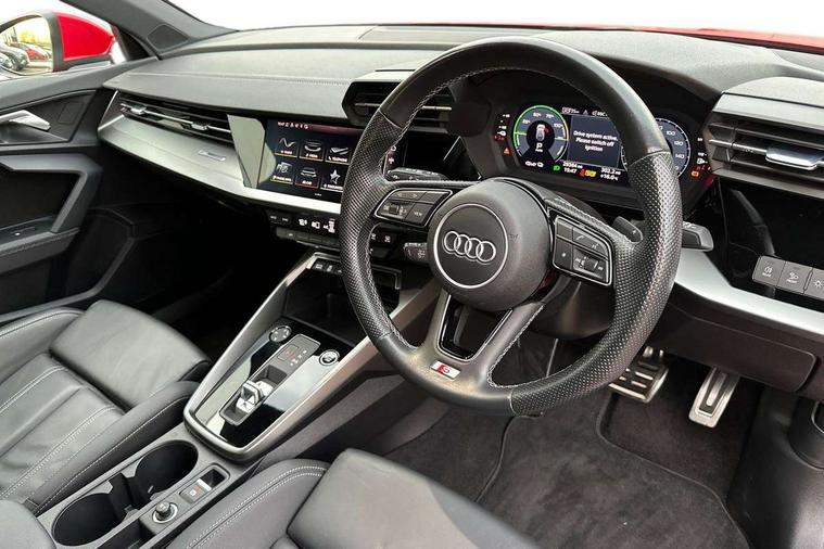 Audi drive select (Auto, Comfort, Dynamic, Efficiency and Individual), Audi smartphone interface, Audi Virtual Cockpit - 10.25" digital and colour instrument cluster, Automatic start/stop system with recuperation, Bluetooth interface, Collision avoidance assistant, e-Call (emergency call), Electromechanical power speed sensitive steering, Lane departure warning system, MMI Navigation Plus with high resolution 10.1" colour touch screen display, Service indicator, Trip computer, Voice control system with natural language interaction, 3 pin 10 amp domestic charging cable, 3.6 kw On-board charger, Standard suspension, Type 2 mode 3 32 amp charging cable, Type 2 socket for AC charging, 2xUSB-C connection with data and charging functions, 6 passive loudspeakers, DAB Digital radio, 3rd brake light, Acoustic glass windscreen, Aluminium window trim, Auto dimming frameless rear view mirror, Electrically adjustable/heated/folding/auto dimming door mirrors with integrated LED indications + kerb view function for passenger side, Front electric windows, Illuminated aluminium inserts front door sills with S logo, LED daytime running lights, LED headlights with LED rear lights and dynamic rear indicators, Light and rain sensors, Privacy glass - dark tinted rear window, rear door and side windows, Rear electric windows, Rear side air outlets in grained matt black, Rear side wing doors, Rear wiper, S line bumpers, S roof spoiler, 12V socket and storage compartment in front centre console, 3 seat bench in 2nd row, 40/20/40 split folding rear seat bench with cupholder, Black cloth headlining, Dual zone electronic climate control, Front and rear centre armrest in leather, Front and rear headrests, Front/rear floor mats, Height and reach adjustable steering wheel, Illuminated vanity mirror, Interior lighting - glove compartment light and right hand side, Luggage compartment floor covering, Manual boot compartment lid, Manually adjustable front seats, Seat side bolsters, Single front passenger seat, Stainless steel pedals and front footrest in black, Twin leather upholstery with front sports seats S embossed logo, Aluminium interior elements pack - A3 Sportback, S line styling pack - A3 Sportback, 3x3 point rear seat belts, Audi pre sense front, Driver and front passenger airbag with passenger airbag deactivation, Electronic Stabilisation Control (ESC) including ABS, ASR and EDL, First aid kit with warning triangle and 2 safety vests, Front side airbags with head airbags and interaction airbag, Pre-sense front with pedestrian and cyclist detection, Seatbelt monitoring, Tyre pressure loss indicator, Anti theft alarm, Anti-theft wheel bolts, Immobiliser, Manual child locks, Remote control central locking, Accent surfaces in the dashboard and centre console in platinum grey silk effect paint finish, Dark spectrum aluminium inlays, Tool kit, Tyre repair kit,