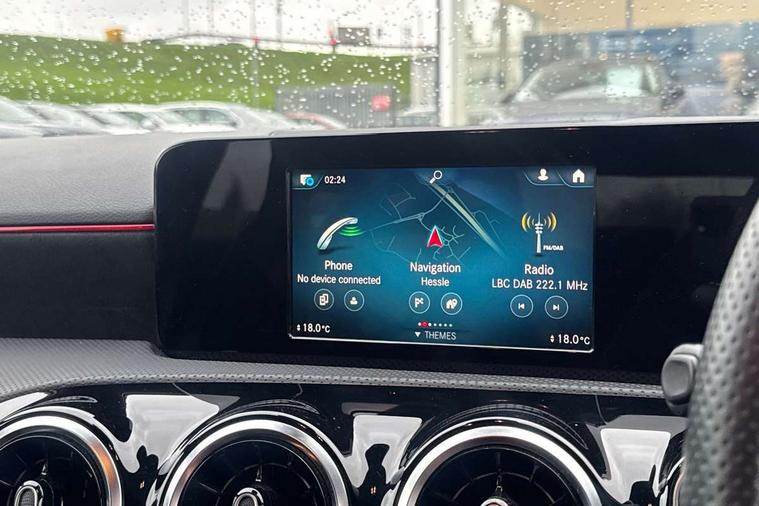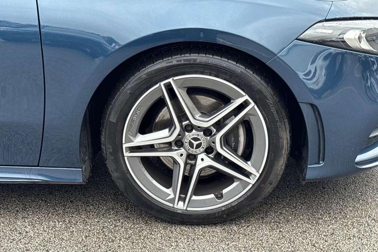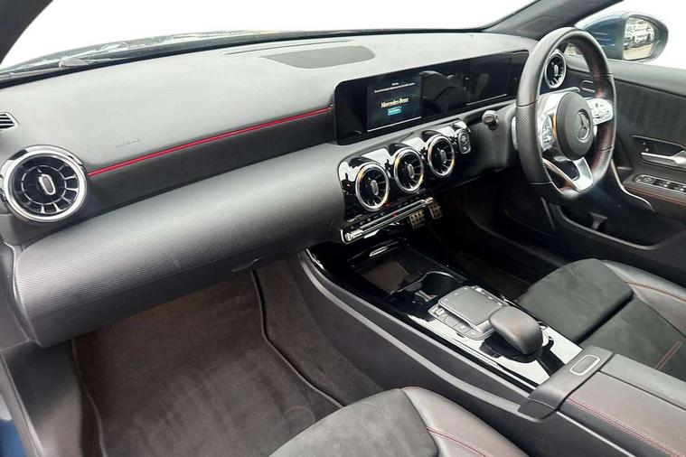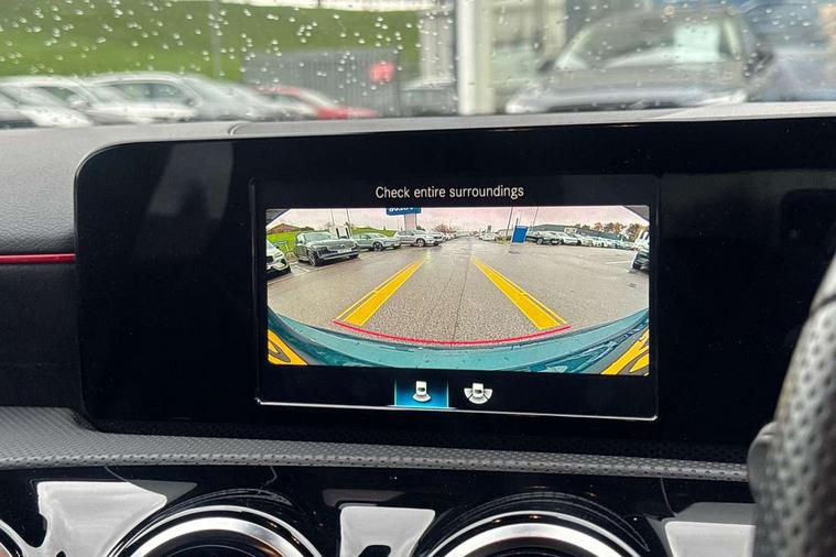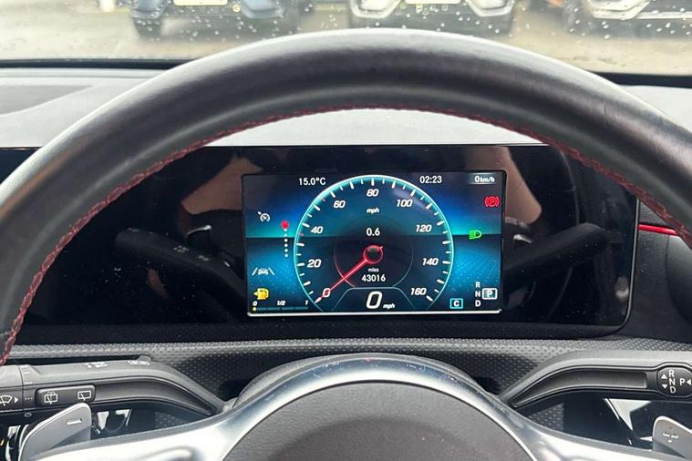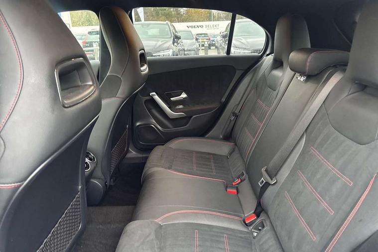 180 degree rear view camera with parking guidelines, 7" colour screen in instrument panel, 7" touchscreen media display, Attention assist, Brake pad wear indicator warning light, Car wash mode, Cruise control + speed limiter, Direct steering, Dual bluetooth interfaces, DYNAMIC SELECT with a choice of driving modes (ECO, Comfort, Sport and Individual), ECO start/stop function, Fluid level warning indicator for fuel, oil, coolant and washer fluid, Hard-disk navigation, Hey Mercedes Voice activation, Lamp failure indicator, Mercedes me connect including emergency call system, accident recovery, breakdown and maintenance management, Mercedes me remote services, Outside temperature gauge, Owners manual in English, Pre-installation for private car sharing, Preinstallation for Mercedes Benz link, Service indicator (ASSYST), Speed sensitive power steering, Trip computer, Lowered comfort suspension, Rear axle torsion beam, 2 USB ports (type C) in rear stowage compartment and one in front of center console, 6 speakers, DAB Digital radio, MBUX multimedia system with DAB digital radio and touchpad including satellite navigation, Mercedes-Benz sound system - 100W, 4 Electric Front and Rear windows, Adaptive brake lights, AMG bodystyling - Front apron with splitter in chrome, rear apron with chrome trim and chrome visible trim elements in tailpipe, Black weather strip, Body colour bumpers, Body colour door handles, Body colour side skirt, Body coloured door mirrors, Chrome beltline trim, Diamond radiator grille with chrome pins and silver louvre + chrome insert, Electric adjustable and heated door mirrors with integrated LED side indicators, Exhaust system - Twin visible tailpipes in polished stainless steel, Headlamp assist automatic headlamp activation, Heated glass rear windscreen + timer control, LED high performance headlamps with integrated LED daytime running lights, LED tail lamp, LED third brake light, Privacy glass, Radio aerial, Rain sensing windscreen wipers with two sensitivity settings, Rear fog lights, Rear wiper, Window line trim strip in chrome, 3 Spoke flat bottom leather multi function steering wheel with perforated leather in grip area, 40:20:40 split folding rear seats, Artico man-made leather/Microfibre Dinamica upholstery with red contrast stitching, Auto Mercedes-Benz child seat recognition sensor, Black air vents with surround in silver chrome, Black roof lining, Brushed stainless steel sports pedals with rubber studs, Controller on centre console with chrome surround, Floor mats with stitched edging and AMG lettering, Front centre armrest with storage compartment, Front door sills with Mercedes Benz lettering, Front seat backs luggage nets, Front seat cushion length adjustment, Galvanished gear shift paddles on steering wheel, Heated front seats, Height/reach adjustable steering column, Interior mirror with reading lamps in black and frameless, Manual height adjustable front seats, Rear head restraints, Seat occupancy sensor for front passenger seat, Sports seats with integrated headrests, Stowage compartment in centre console with retractable cover, Sunvisors with illuminated vanity mirrors, Touchpad on center console, Twin front cupholders, Two zone thermotronic luxury automatic climate control, Light and sight pack - A Class, Seat comfort pack - A Class, 3 rear 3 point seatbelts, ABS with Brake Assist, Active bonnet, Active brake assist includes forward collision warning system with autonomous braking, Adaptive brake assist with hold function and hill start assist, Black seatbelts, Childproof locks manually operated for rear doors and electrically operated for rear power windows, Crash responsive emergency lighting, Driver and passenger head and side airbags, Drivers knee airbag, Dual stage driver/passenger airbags, Electronic parking brake, ESP curve dynamic assist, ESP with ASR, Front and rear seatbelt reminder, Front brake callipers with Mercedes Benz lettering, ISOFIX and top tether child seat fixing points in two outer rear seats, Tyre pressure monitoring system, Warning triangle and first aid kit, Window airbags, Alarm system/interior protection/immobiliser, Keyless Go, Remote central locking and crash sensor with emergency opening function, Urban guard vehicle protection system with immobiliser and interior protection, Dinamica microfibre trim in black, 18" AMG 5 twin spoke light alloy wheels in titanium grey with highsheen finish, Summer tyres, Tirefit sealant kit,