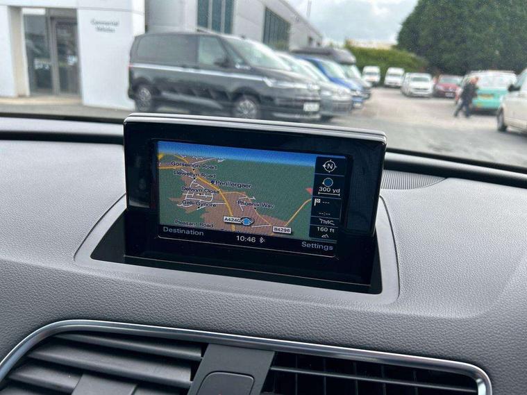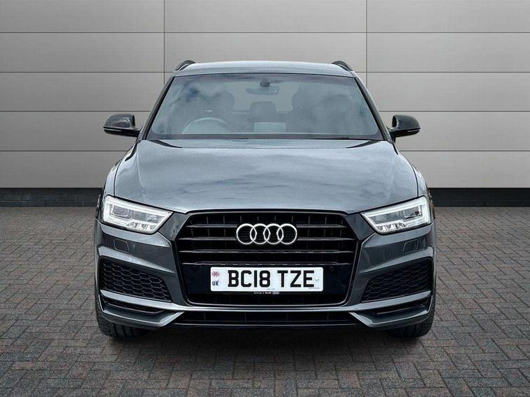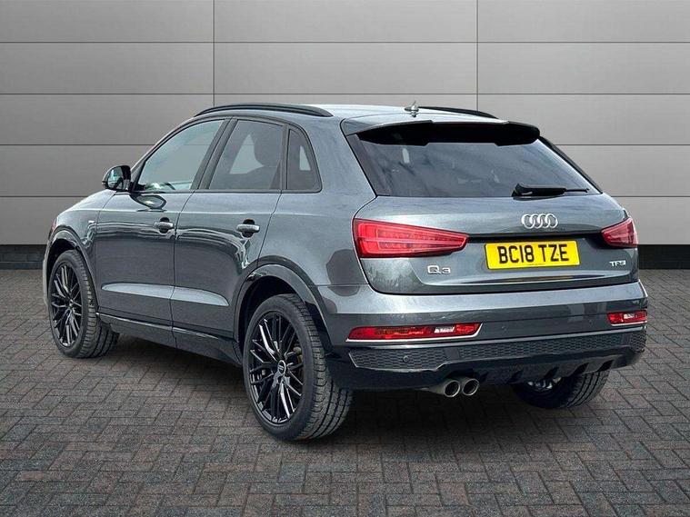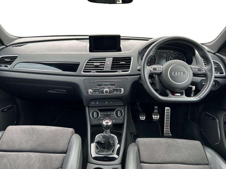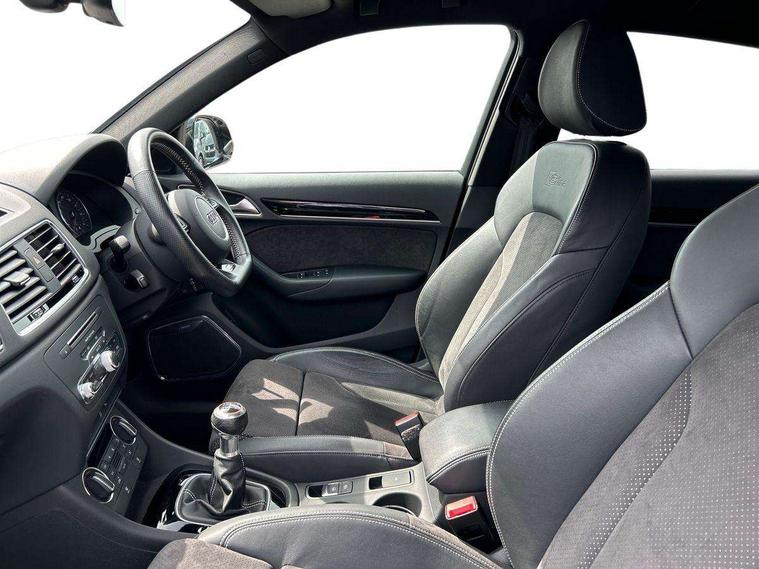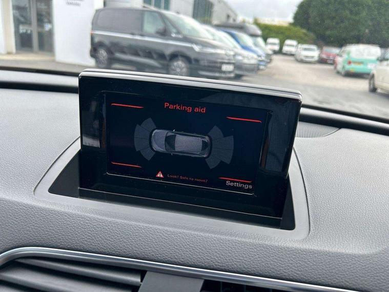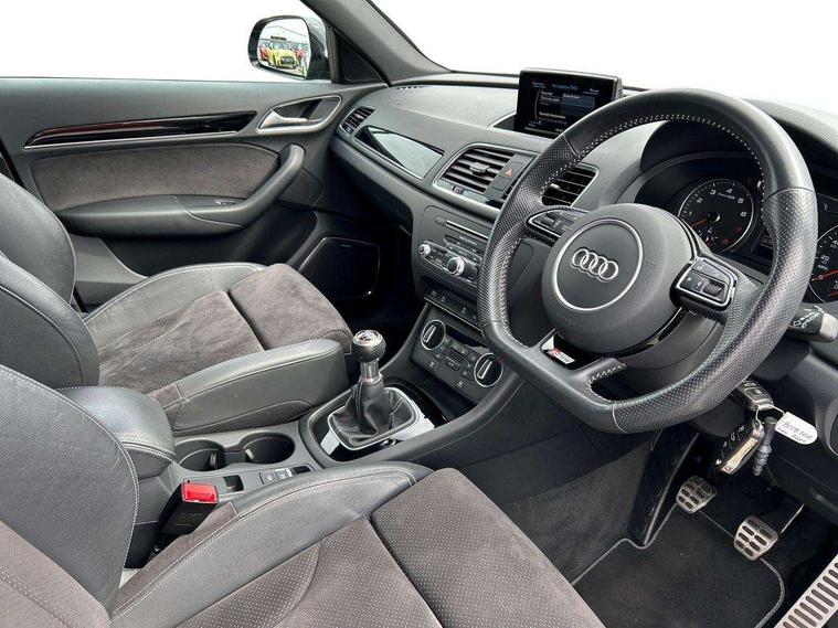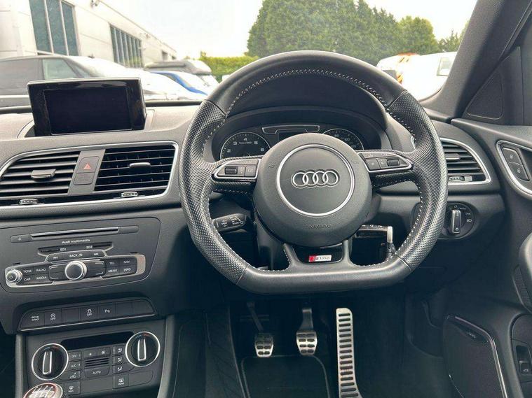 6.5" colour display screen, Audi drive select, Cruise control, Electro-mechanical PAS, Low washer fluid indicator, MMI - Multi Media Interface control system, On board computer, Remote electric boot opening/closing, Service interval indicator, Voice control system, Sports suspension, Audi music interface, BOSE sound system, DAB digital radio module, Acoustic windscreen, Aluminium window surround, Auto dimming rear view mirror, Black exhaust tailpipes, Black high gloss door mirrors, Black roof rails, Coming home function, Door mirror integrated indicators, Front and rear electric windows, Front fog lights, Front lip spoiler, Heated windscreen washer jets, High Gloss Black Contrast Bumpers, High Gloss Black rear spoiler, LED daytime running lights, LED headlights with headlight washers, LED rear lights, Light and rain sensor for auto activation of lights and windscreen wipers, Loading sill protector in stainless steel, Privacy glass, Rear diffuser with platinum insert, Rear wiper, S Line body styling, Sunband for windscreen, 12V socket in rear centre console, 3 spoke flat bottom multi-function perforated leather steering wheel with contrast stitching and aluminium gearshift paddles, Aluminium door sill trims, Aluminium gear knob, Black cloth headlining, Door sill trim strips, Dual zone climate control, Electric front lumbar adjustment, Front and rear headrests, Front and rear velour floor mats, Front centre armrest with storage compartment and angle adjustment, Front sports seats, Height/reach adjust steering wheel, ISOFIX on front passenger and rear outer seats, Jack and tool kit, Retractable luggage cover, Reversible boot floor, Split fold rear seat, Stainless steel pedals, Storage compartment and 12V socket, Under floor storage in luggage area, Audi Exclusive black styling pack - Q3, LED interior light pack - Q3, 3x3 point rear seatbelts, ABS+Electronic Brake force Distribution, Curtain airbags, Driver and passenger airbags, Driver and passenger side airbags, EDL + ASR, Electrically operated child locks on rear doors, Electromechanical parking brake, ESP, First aid kit, Front passenger airbag deactivation, Head airbags, Seatbelt warning light, Tyre pressure monitoring system, Warning triangle, Locking wheel bolts, Remote central locking, Thatcham category 1 alarm + immobiliser, Piano black finish inlay,