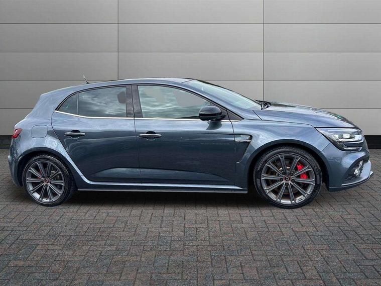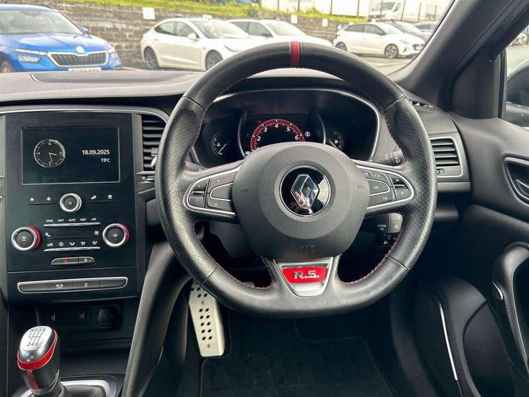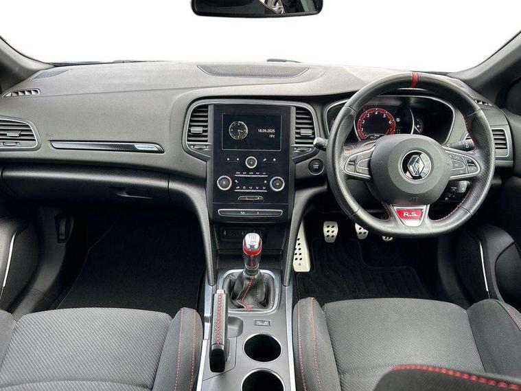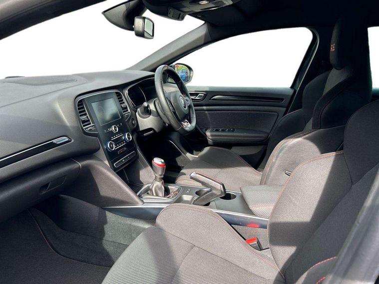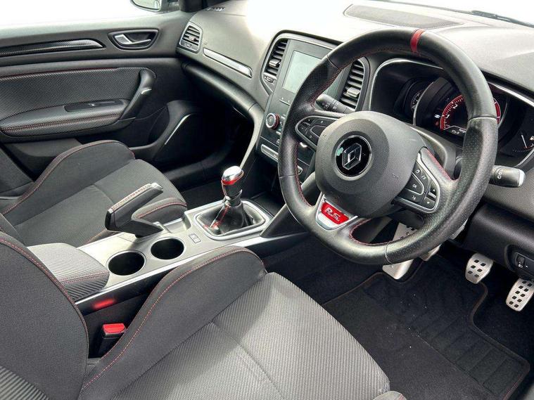 RS dashboard and door mouldings, Tyre repair system, Hands free Renault card with remote locking, Insurance approved Cat 1 alarm system, Automatic full central locking when in motion, Driver and passenger adaptive front airbags, Dust protection kit, ESC Electronic stability control and ABS with emergency brake assist, Front and rear curtain airbags, Front and rear outer seat belt pre-tensioners, Front lateral airbags, Front side airbags, Gravel protection kit, Height adjustable front seatbelts, Hill start assist, Lateral chest level side airbag for driver and front seat passenger, Manual parking brake, Passenger airbag deactivation system, Protective rear brake disc, Rain protection kit, RS custom braking system, Seatbelt warning, Three 3 point rear seatbelts, Tyre pressure monitor, 3D effect LED rear lights, Body colour bumpers, Body colour door handles, Chrome plated RS sport front door sills, Chrome strip on door handle, Chrome window surround, Chrome window weatherstrips, Custom front bumper widened with F1 gun metal grey blade, honeycomb front grille with R.S. badging, Custom rear bumper widened with functional diffuser and central exhaust, Daytime running lights with LED guide light and 3D effect, Electric adjustable heated door mirrors, Electrically folding door mirrors, Electrochromic interior rear view mirror, Extra tinted windows and rear windscreen, Front and rear door panel ambient lighting, Gunmetal lower front bumper insert, Impact protection, Indicators with side repetitions, Integrated fuel filler cap, LED door mirror integrated indicators, One touch electric front/rear windows, Pure vision full LED front headlights with integrated C Shape turn signal, R.S. extended rear wheel arches, R.S. rear spoiler, Rain and light sensors, Renault sport open sequence upon opening the vehicle with brand light, RS extended front wheel arches with air grilles and Renault Sport badging, RS sills/skirt with flat bottom effect, RS Vision - full LED 3 function headlights with fog, cornering, long range, Shiny black door mirrors, Welcome lighting, 1/3 to 2/3 folding rear bench seat, 12V socket in front and rear, 3 height adjustable rear headrests, Aluminium pedals and footrest, Ambient lighting in door trim, Black headlining, Custom R.S black harmony roof ceiling, Dual zone automatic heating and air conditioning climate control with toxicity sensor and air recycling, Front centre storage console with armrest, Height adjustable driver seat, Height/reach adjust steering wheel, High centre console with cup holder and closure flap, Interior courtesy light operated by all doors, Isofix attachment system on rear side seats, LED front and rear ceiling lighting, Lumbar adjustment for driver seat, Sunvisor mirrors with light, 4.2" display screen, 4Control - 4 wheel steering technology, 7" TFT meter with colour matrix with renault sport custom display, Cruise control + speed limiter, Multi function trip computer, R.S. Drive activation button, Renault multi sense - choice of 5 driving modes including race mode, Smartphone integration with Apple CarPlay and Android auto, Variable PAS, Sport chassis with 4 hydraulic compression stops,