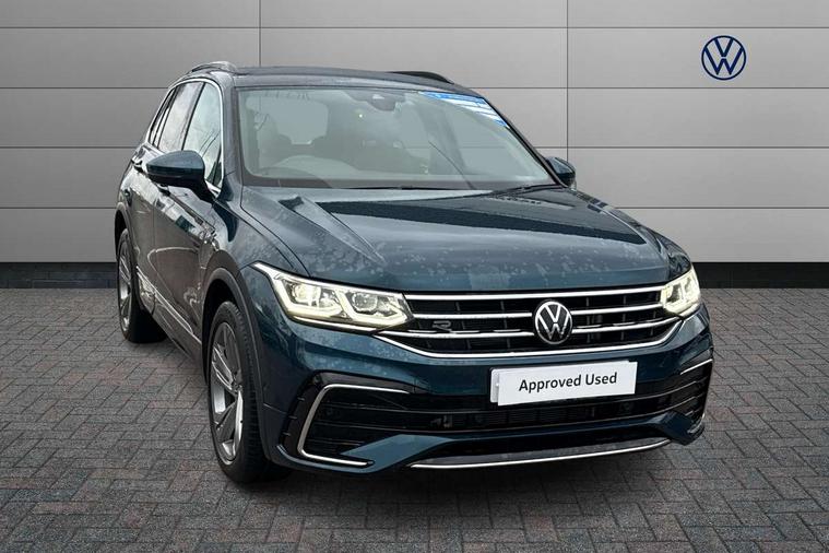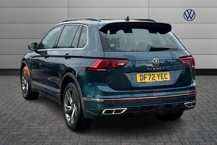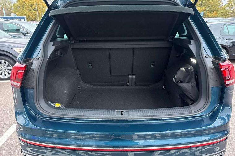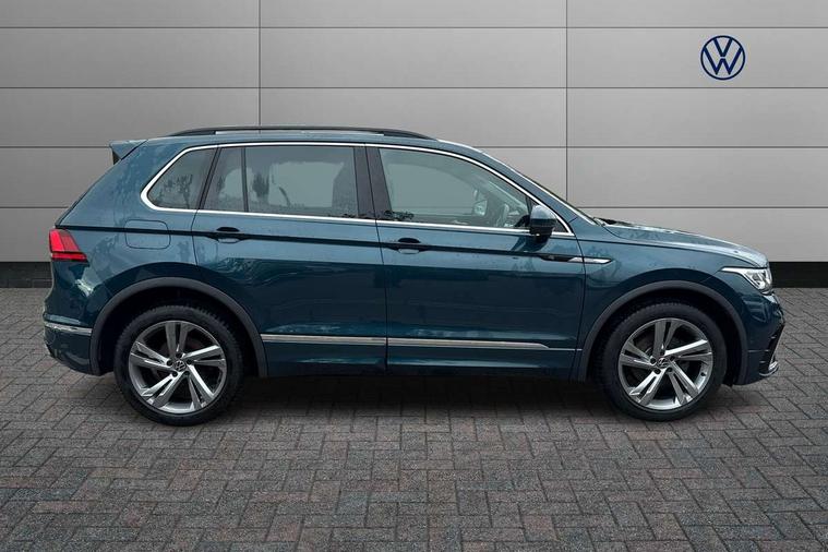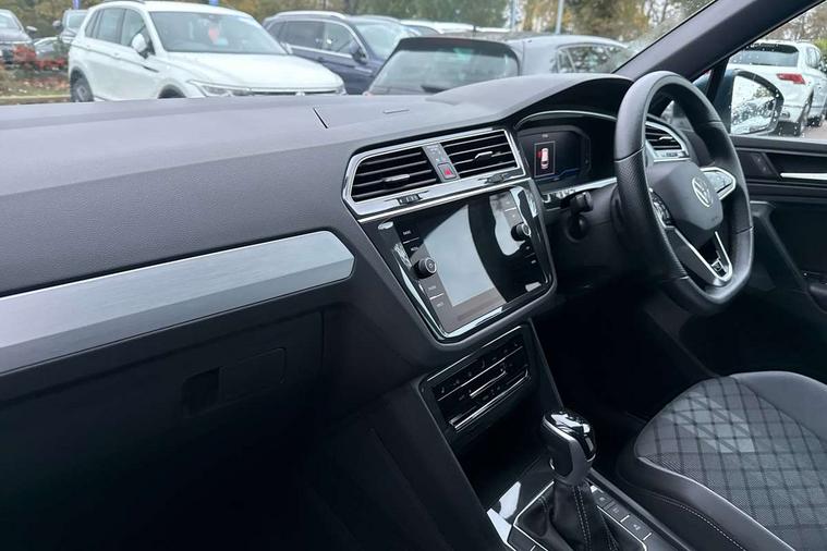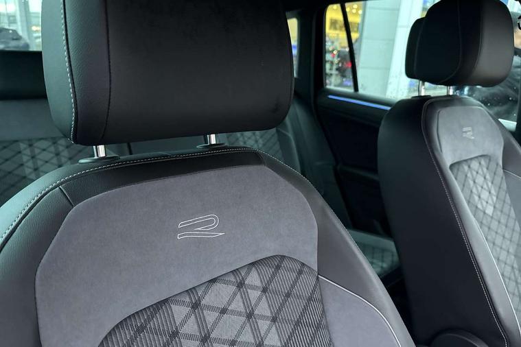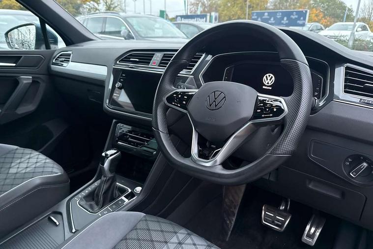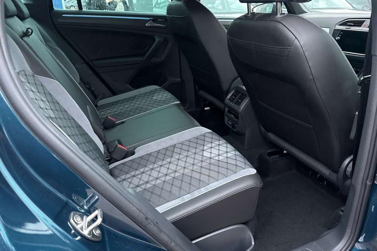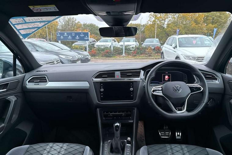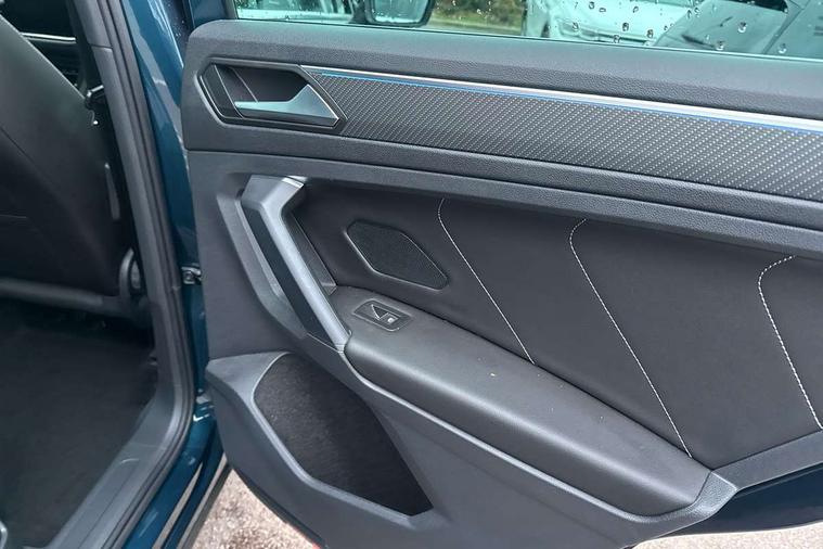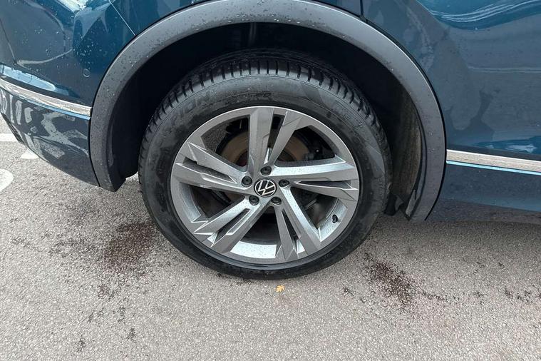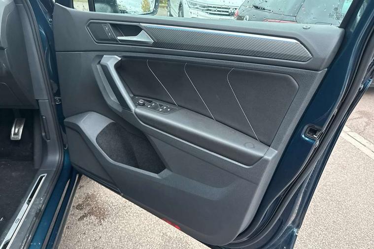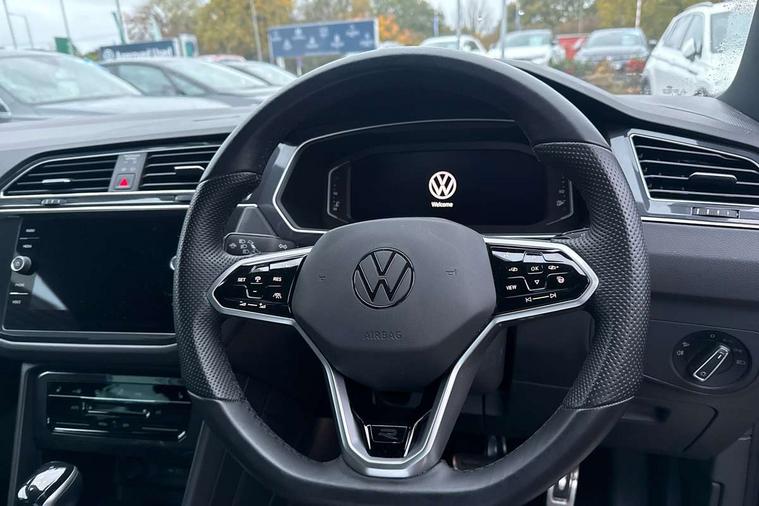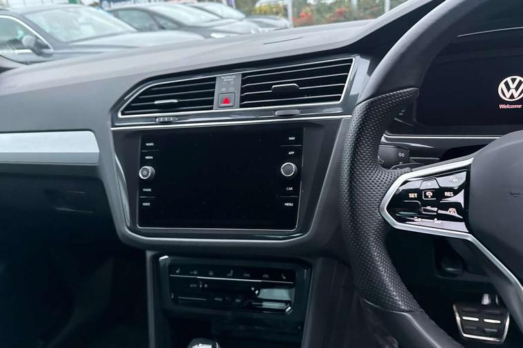 Adaptive cruise control ACC stop and go including speed limiter, App-Connect incl. App-Connect Wireless for Apple CarPlay and Android Auto, Bluetooth phone integration system, Comfort drive travel assist, Digital cockpit pro, Driver alert system, Driver profile selection, Dynamic road sign display, eCall emergency call system, Electromechanical speed sensitive power steering, Emergency assist, Front and rear parking distance sensors, Instrument cluster mph speedometer Great Britain, Lane keeping system Lane Assist, Lights on warning, Multifunction front facing camera, Outside temperature display, Premium multifunction display with multi colour display, Preparation for subsequent activation Navigation feature Discover Media includes Streaming and Internet, Remote control boot opening, Rev counter, Service interval indicator, Speed limit display, Start/stop system with regenerative braking, Tailgate/trunk lid unlocking from outside, Trip computer, Warning sound and light for doors and tailgate open, Battery regeneration during braking, Sports suspension, 8 Speakers, Digital radio reception DAB+, Diversity antenna for FM reception, Radio, Auto dimming interior rear view mirror, Automatic headlight control system, Body colored bumpers in R-Line style, Body colored exterior mirror housings, Body colour door handles, Chrome moldings on the side windows, Coming/leaving home lighting function, Dynamic headlight range control, Front and rear electric windows, Heated rear window, High level 3rd brake light, Laminated safety glass windshield, heat and sound insulating, LED headlamps with LED separate daytime running light and dynamic cornering light, LED rear combination lamps, LED rear number plate lights, License plate carrier in front and rear, Poor weather light and cornering light, Power adjustable, folding and heated door mirrors with surround lighting, front passenger exterior mirror lowering function, Privacy glass for rear side windows and rear window, R Line body kit, R Line side sills, Rain sensor, Rear exhaust tailpipe, Rear fog lamp, Rear side wing doors, Rear spoiler in R style, Rear windscreen washer and wiper with interval delay, Side and rear windows in heat insulating glass, Trailer Stability Programme, Unique R Line badging, Windscreen wipers/ intermittent wipe + 4 position delay, 12V outlet in center console rear and in luggage compartment, 12V outlet in front and tray, 2 LED front reading lights, 2 LED rear reading lights, 3 bench rear seats in 2nd row, 3 rear headrests, Air Care Climatronic 3 zone automatic climate control with enhanced air filter and controls in the rear, Art Velours greyson sports cloth upholstery, Backrest release for left front seat, Black headlining, Brushed stainless steel pedals and footrest, Carpet mats in front and rear with decorative stitching in Gray, Climate control unit rear with touch function, Door and side trim panel in foam film, insert in leatherette, Driver + front passenger lumbar support, Front footwell illumination, Front scuff plates in aluminum with R-Line logo, Front seats head restraints (x-adjustment), Height adjustable front seats, Height/reach adjust steering wheel, Isofix Preparation 2 Rear child seats, Leather gear knob, Rear bench seat asymetrically split folding, longitudinally movable and folding with load-through hatch and center armrest, Remote unlocking for rear seat backrest, Single front passenger seat, Sun visors with illuminated vanity mirrors, Top front comfort seats, Winter pack - Tiguan, 3 point seat belt for centre rear seats, 3 point seat belts with seat belt pretensioners for the outer rear seats, Curtain airbags for front and rear passengers, Driver/Front Passenger airbags, Drivers knee airbag, Electronic parking brake with auto hold, Electronic Stability Control with driver steering recommendation, ABS, ASR, EDL, EDTC and trailer stabilization, Front assist with autonomous emergency braking (for Adaptive Cruise Control ACC up to 130 mph), Front disc brakes, Front passenger airbag deactivation, Front side airbags, Height adjustable front 3 point seatbelts + pretensioners, Manual child proof rear door locks, Pedestrian monitoring system, Proactive passenger protection system in combination with front assist, Rear disc brakes, Two tone horn, Tyre pressure loss indicator, Warning sound and light for front seat belts if unfastened, Warning triangle, Anti theft alarm system with interior monitoring, backup horn and towing protection, Anti theft wheel bolts, Electronic engine immobiliser, Keyless locking and starting system keyless access with safelock, Chrome elements on the mirror switch power window switches and door pulls, Decorative inserts Carbon Gray for dashboard and front door trim panels, Interior door handle in matte chrome, 19" Valencia alloy wheels with AirStop tyres, Tool kit, Tyre mobility kit Includes 12V compressor and tyre sealant,