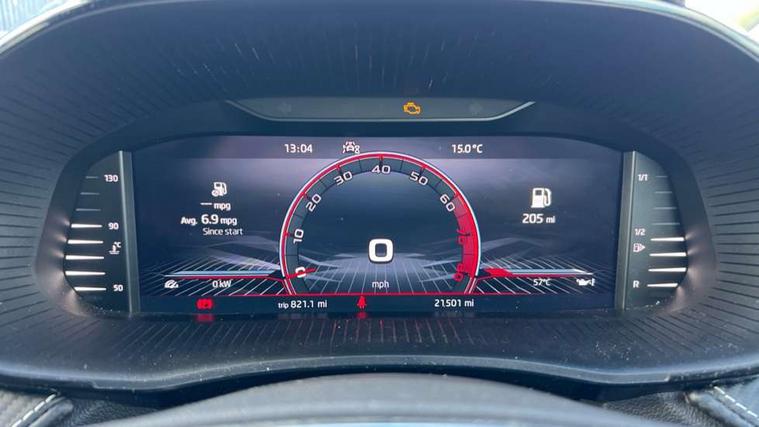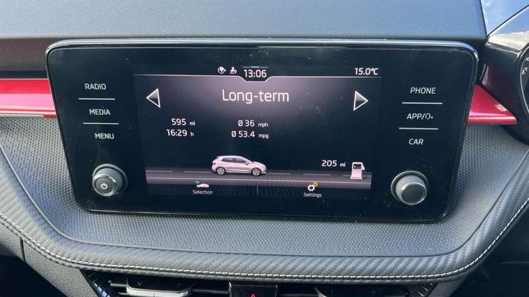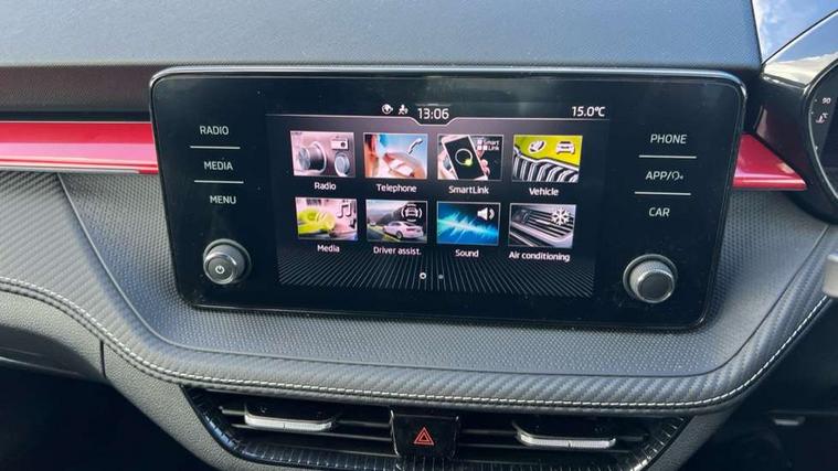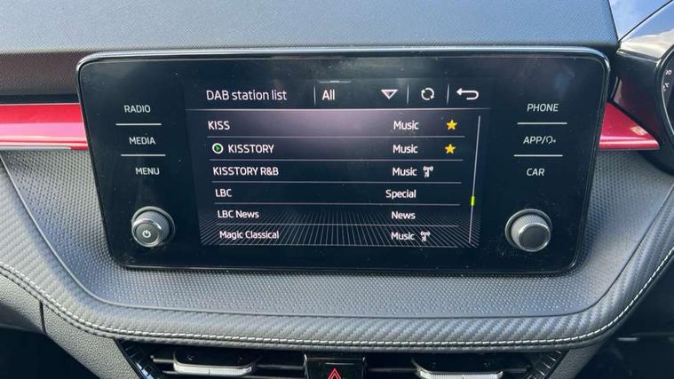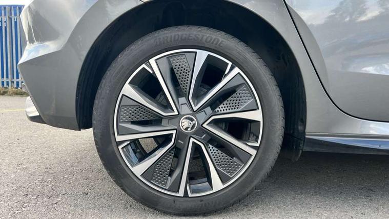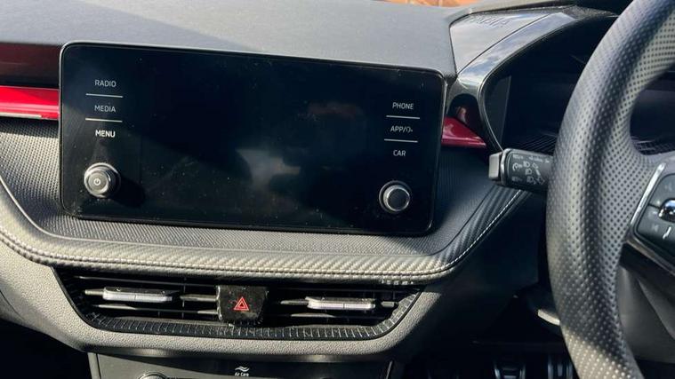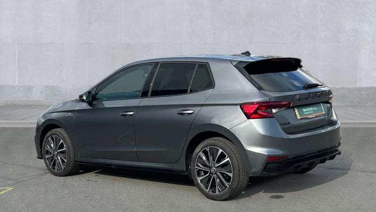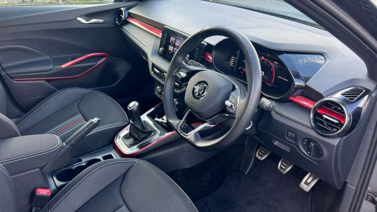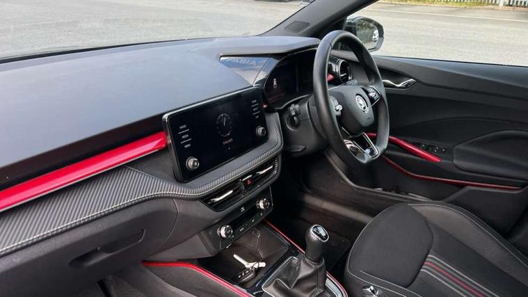 Bluetooth connection, Driver alert system - DAS, Electromechanical power steering, Exterior temperature gauge, Service interval indicator, 2x USB-C in the front (for data transmission and charging), 6 Speakers (4 in front and 2 in rear), Auxiliary socket for external MP3 player, Bolero radio with 8" colour display, DAB digital radio reception, Auto dimming rear view mirror, Basic rear light, Black radiator grille, Body coloured bumpers, Door mirror integrated indicators, Electrically adjustable and heated door mirrors, Front and rear electric windows, Front window wiper intermittent control, Headlight range control - Automatic, Ice scraper in fuel cap, LED daytime running lights with coming and leaving home feature, Monte Carlo badging, Privacy glass, Rear LED fog light, Rear side wing doors, Rear window wiper with washing nozzles, Roof mounted spoiler, SKODA tailgate lettering in black, Sports bumpers, Third brake light, 3 rear headrests, Aluminium pedals, Backrest split and folding, Black headlining, Central console with removable cup holder and storage box, Chrome handbrake release button, Fabric/artificial leather upholstery, Front sports seats, Gearshift knob/handle in leather, Hand brake lever handle in leather, Height adjustable front headrests, Height adjustable steering wheel, ISOFIX and TopTether anchorage points to the outer rear seats, ISOFIX and TopTether on the front passenger seat, Luggage compartment lighting, Metallic painted red central console cover, Metallic red interior door handles, Monte Carlo door sills, Pollen filter, Rear seat bench unsplit, Single front passenger seat, Sun visors with mirror and airbag label on passenger side, Textile floor mats, Ticket holder, Umbrella in drivers door, Ambient lighting pack 2 - Fabia Hatchback, 3-point height adjustable front seats belts with pretensioner and force limiter, Automatic warning lights in case of crash, Driver and passengers airbag with switch off function, e-Call+, ESC including ABS, MSR, ASR, EDS, HBA and XDS, Front and rear seat belt warning, FRONT ASSIST (AEB City and AEB Inter Urban), Front side airbags, Head airbags, One tone horn, Pedestrian protection, Three rear 3-points safety seat belts with pretensioner and force limiter including stop function for outer rear seat belts, Tyre pressure monitoring system, Anti-theft alarm system including immobiliser, interior monitoring, backup horn, and towing protection, Carbon effect door and side trim panels, Carbon effect lower decorative trim with white stitching, Red metallic upper decorative trim, Anti-theft wheel bolts protection, Super-low rolling resistance tyres,